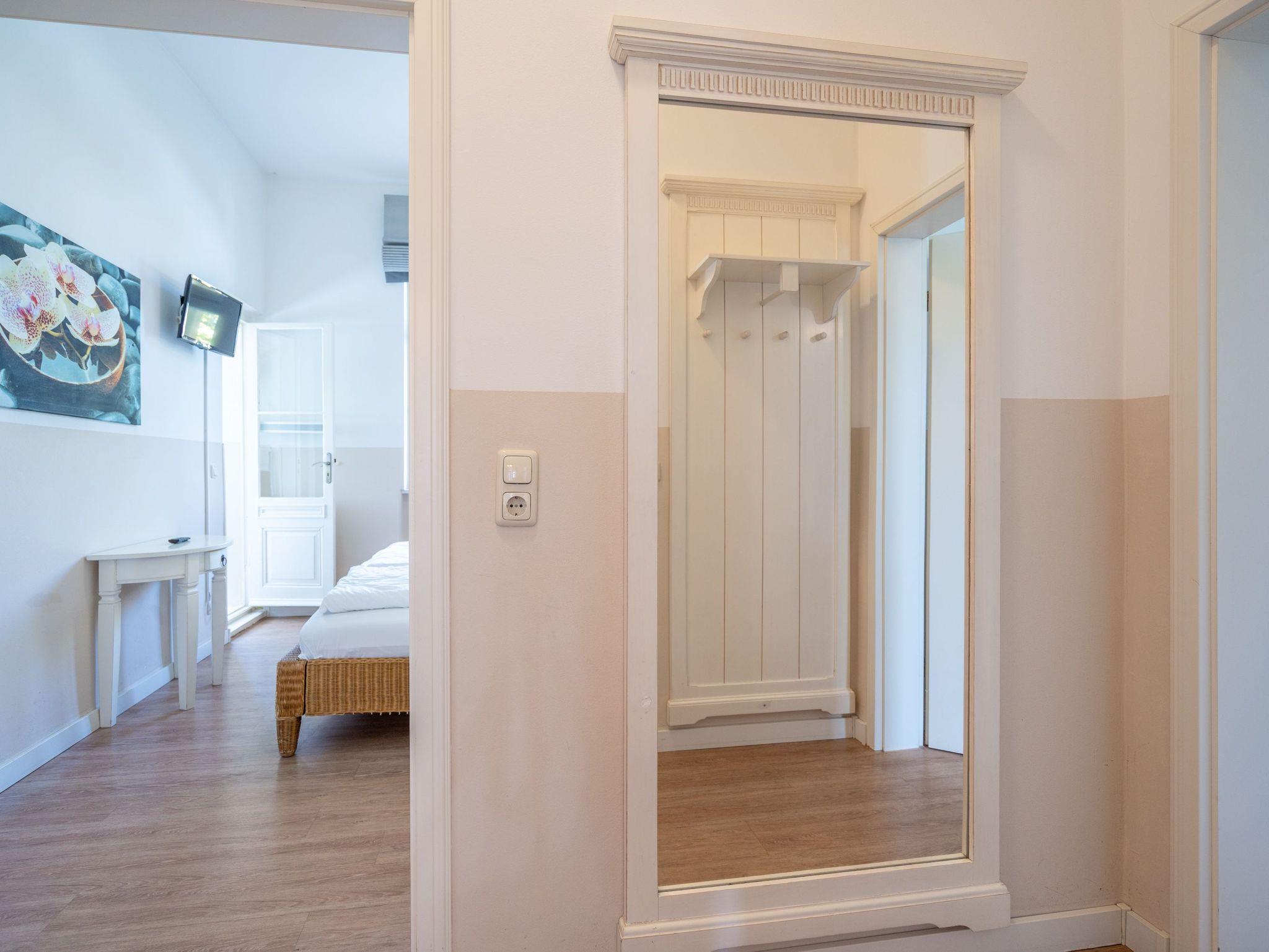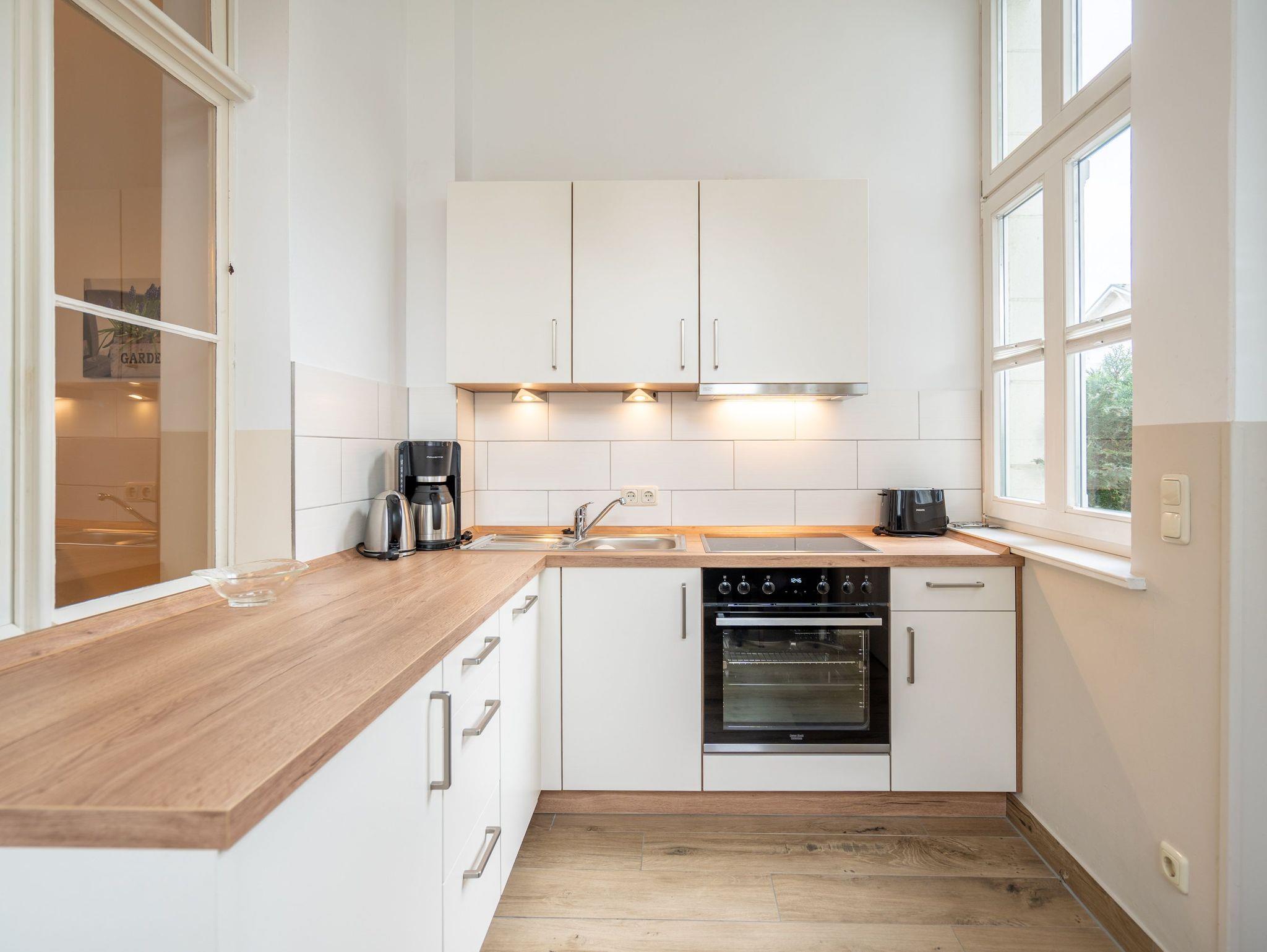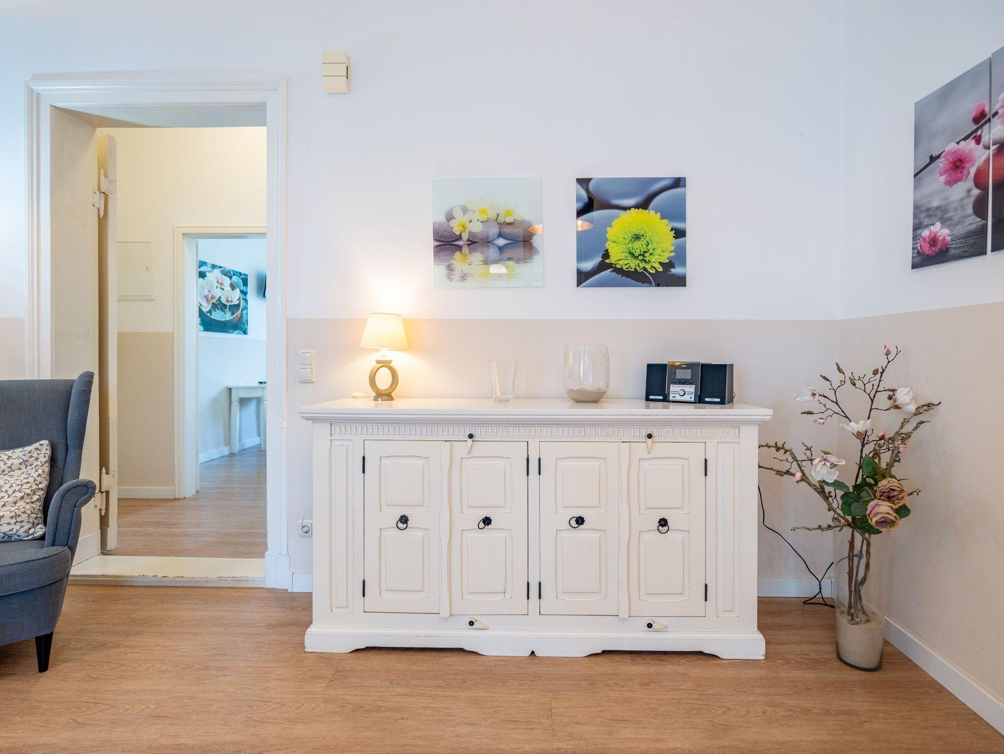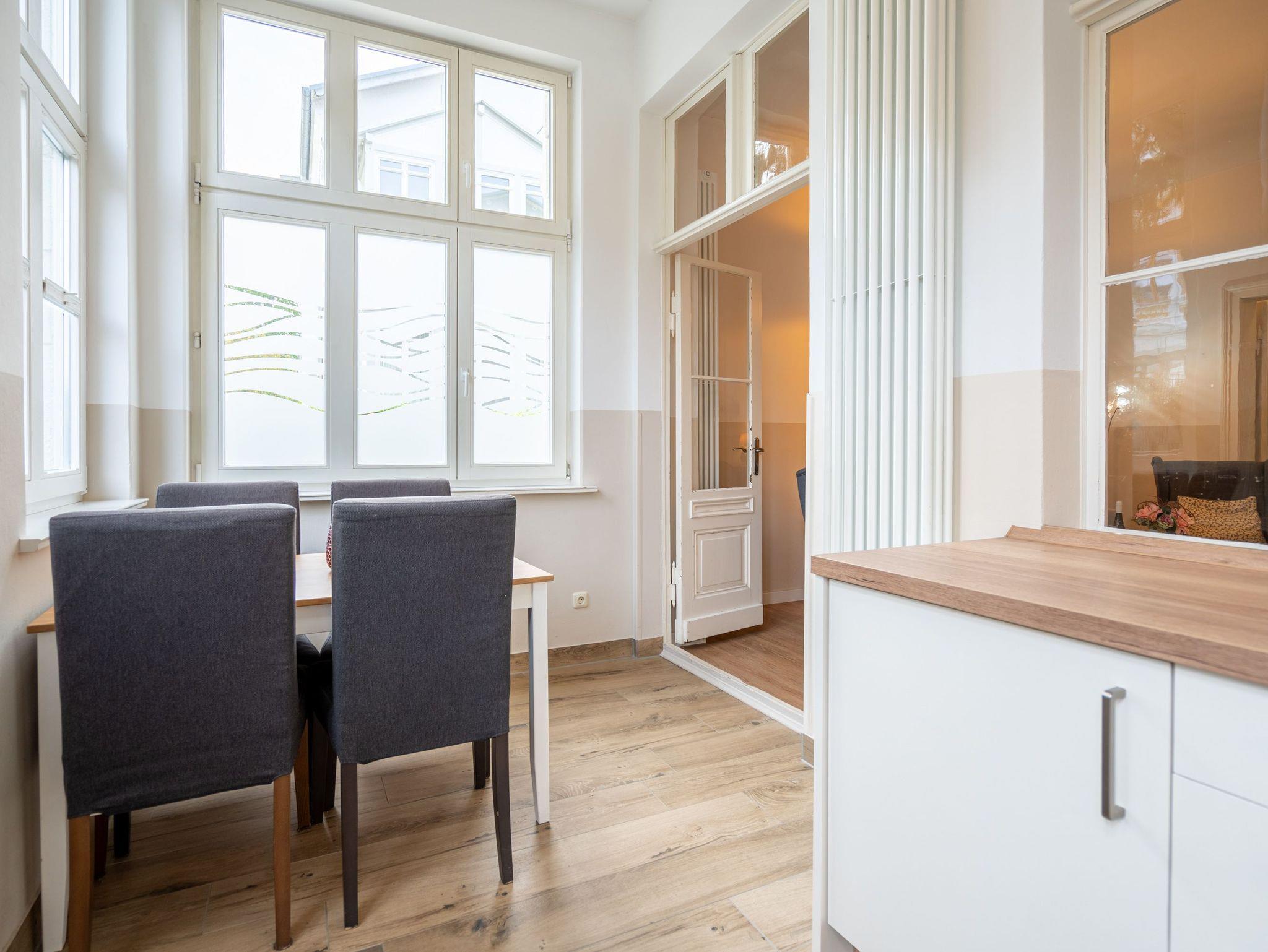 Willkommen in Ihrer 63 m² großen Ferienwohnung im Erdgeschoss der Villa Hartmann-Drewitz. Hier finden bis zu 4 Personen ein charmantes Zuhause auf Zeit. Das große Schlafzimmer mit Doppelbett und TV sowie ein zweites Schlafzimmer mit zwei Einzelbetten bieten komfortable Schlafmöglichkeiten. Im einladenden Wohnbereich können Sie entspannen, während die verglaste Veranda mit Küchenzeile und Essplatz viel Licht hereinlässt. Von hier aus treten Sie direkt auf die Terrasse, die gleichzeitig als Wohnungseingang dient. Das Bad mit Dusche und WC rundet den Komfort ab. Ein Pkw-Stellplatz steht Ihnen direkt am Haus zur Verfügung.