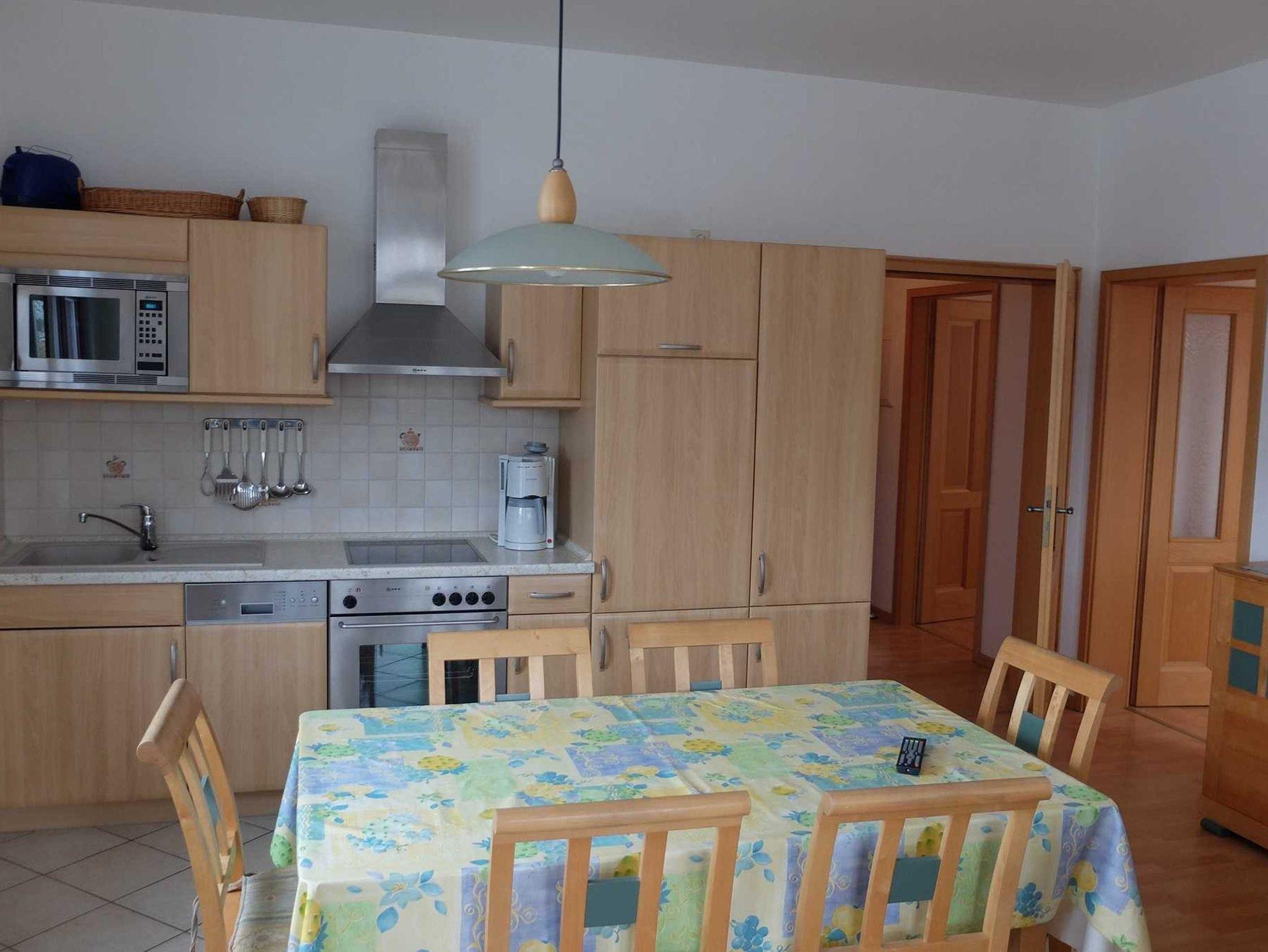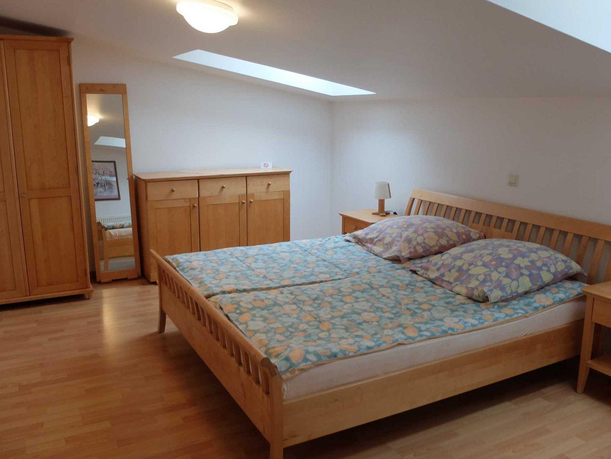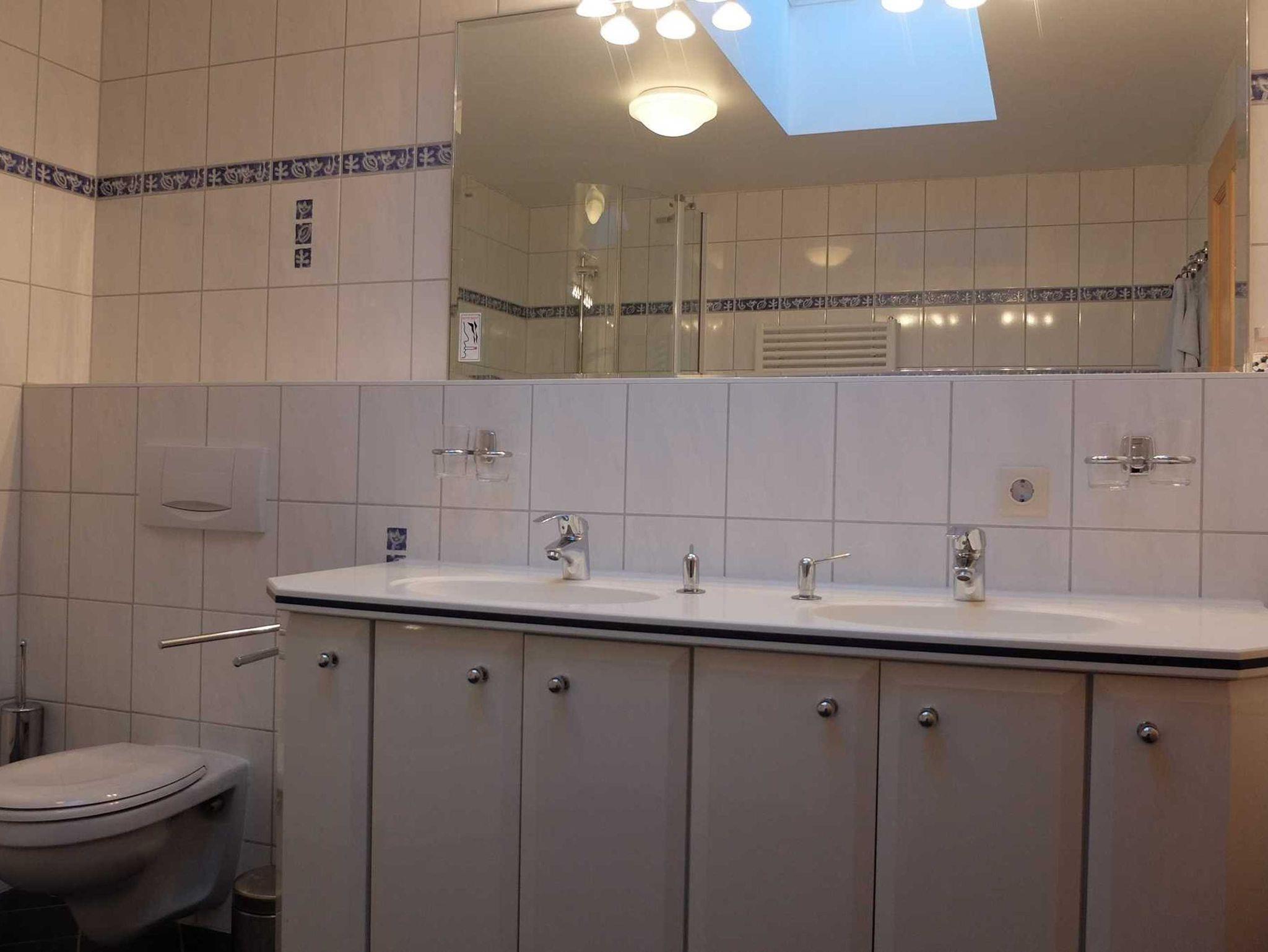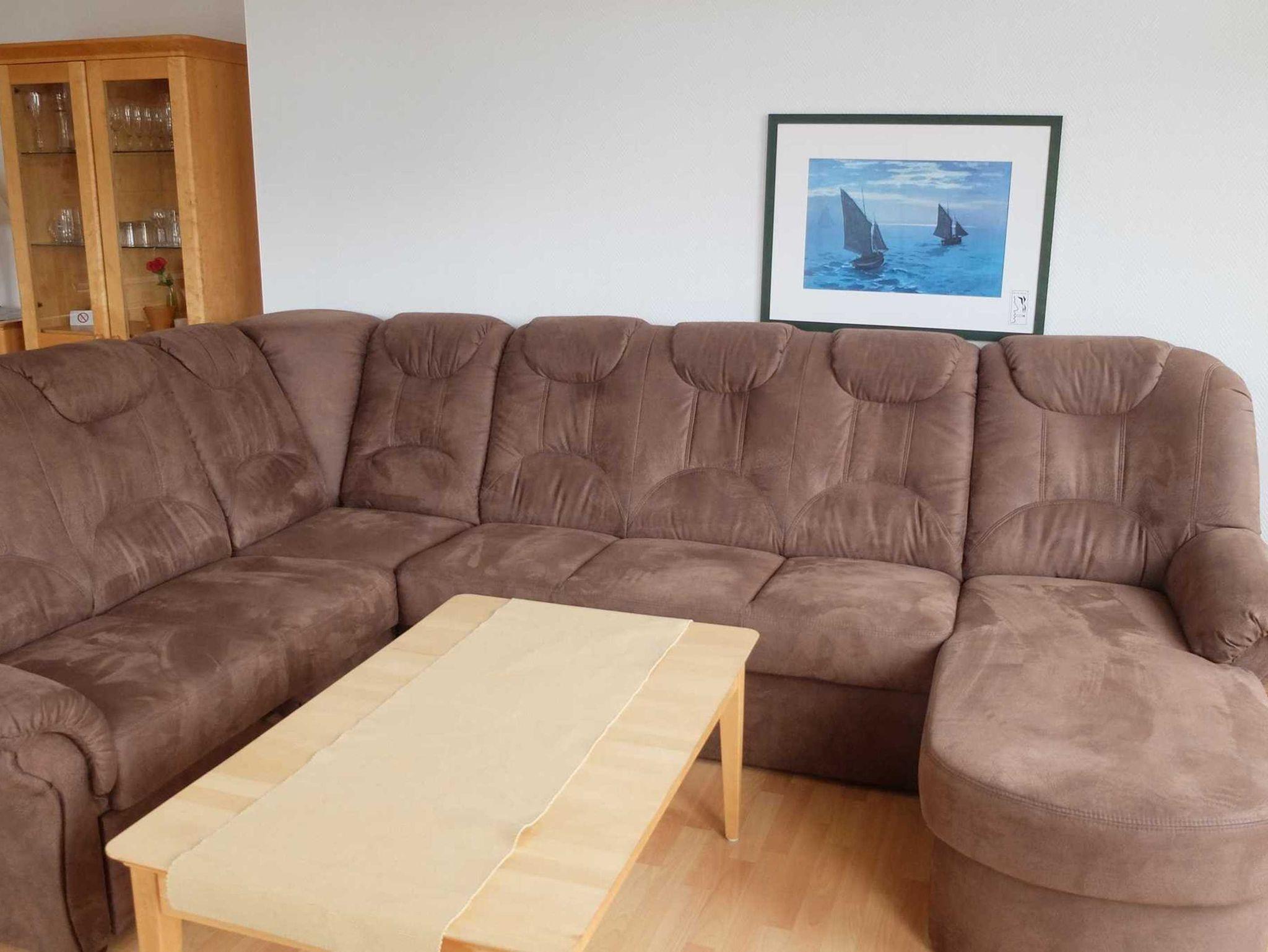 Die moderne großzügige 3 Raum Ferienwohnung befindet sich im 2. OG. (85 m²). Sie verfügt über zwei separate Schlafzimmer. Das 1. Schlafzimmer ist mit einem Doppelbett ausgestattet. Im 2. Schlafzimmer befinden sich zwei Einzelbetten. Im Wohnzimmer befindet sich eine Schlafcouch. Eine Aufbettung ist auf Anfrage möglich. Zur weiteren Ausstattung gehört eine komplette Küchenzeile (mit Geschirrspüler, Cerankochfeldherd, Backofen und Mikrowelle) und Sat-TV . Das Bad ist mit einer Dusche und WC ausgestattet. Erstausstattung Bettwäsche und Handtücher sind inklusive.