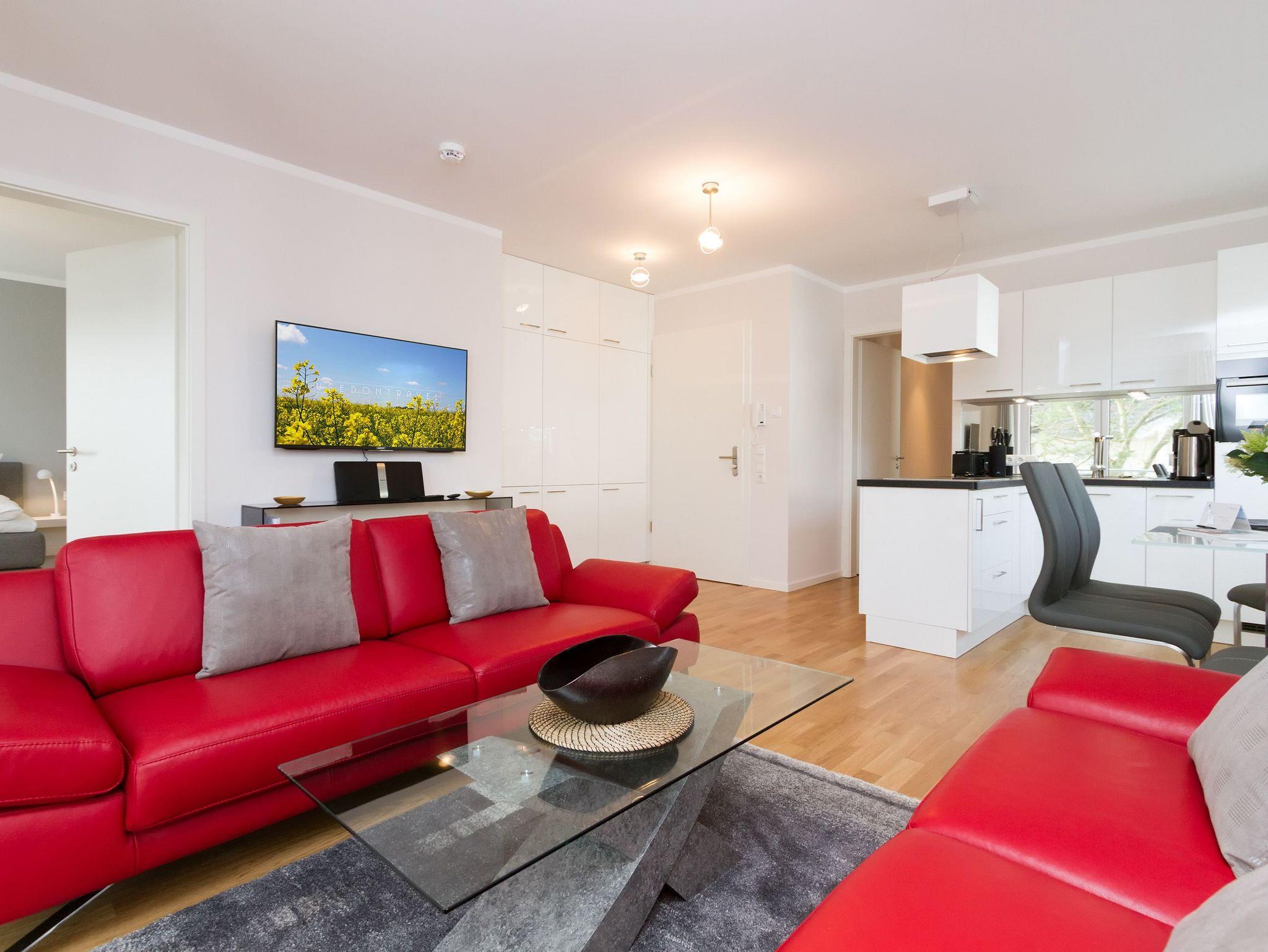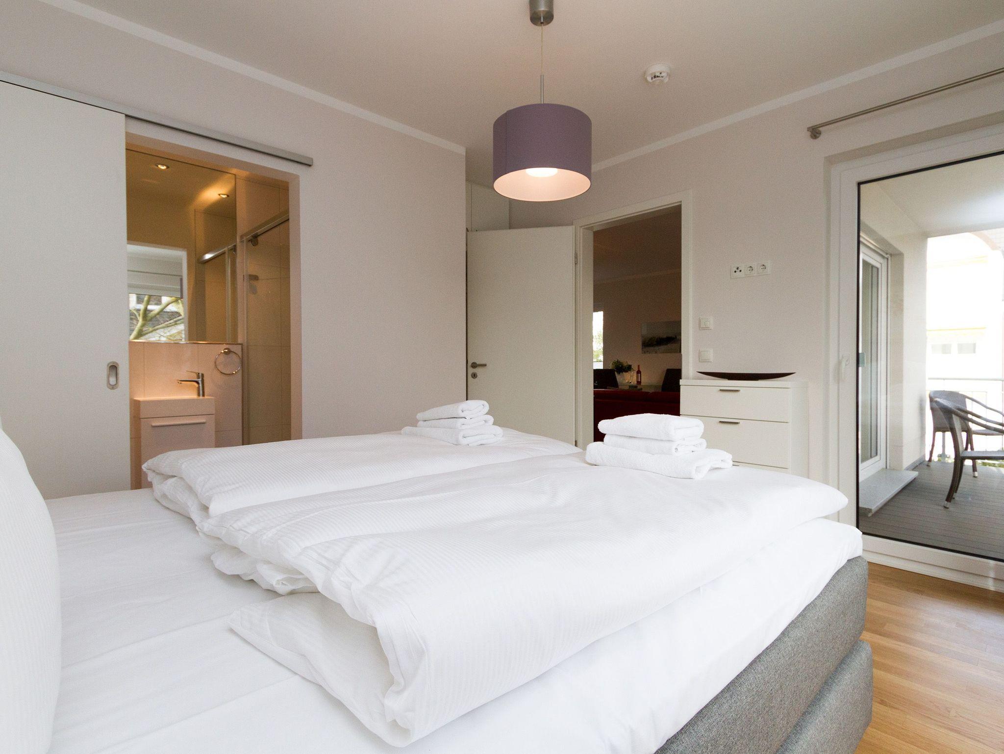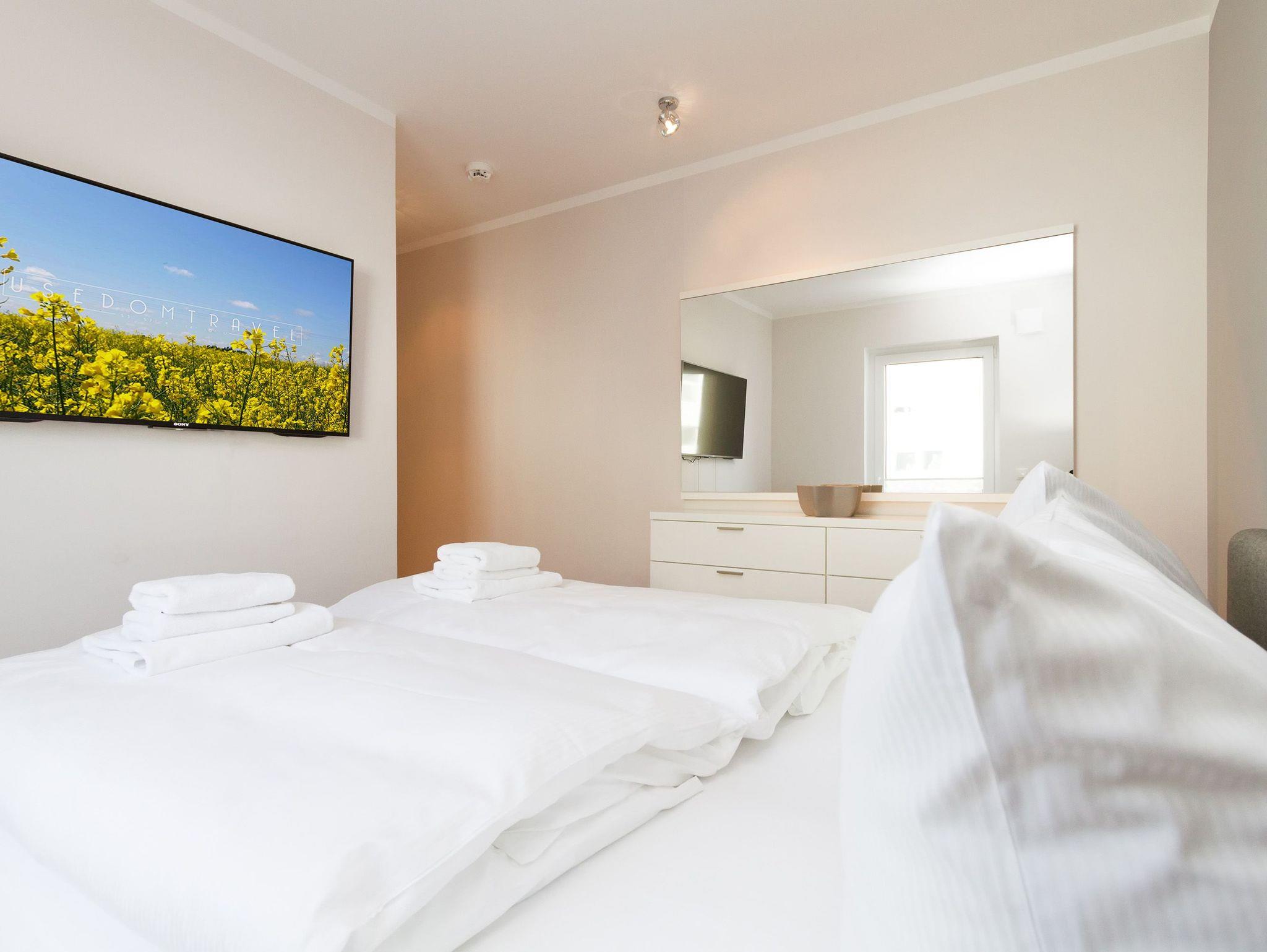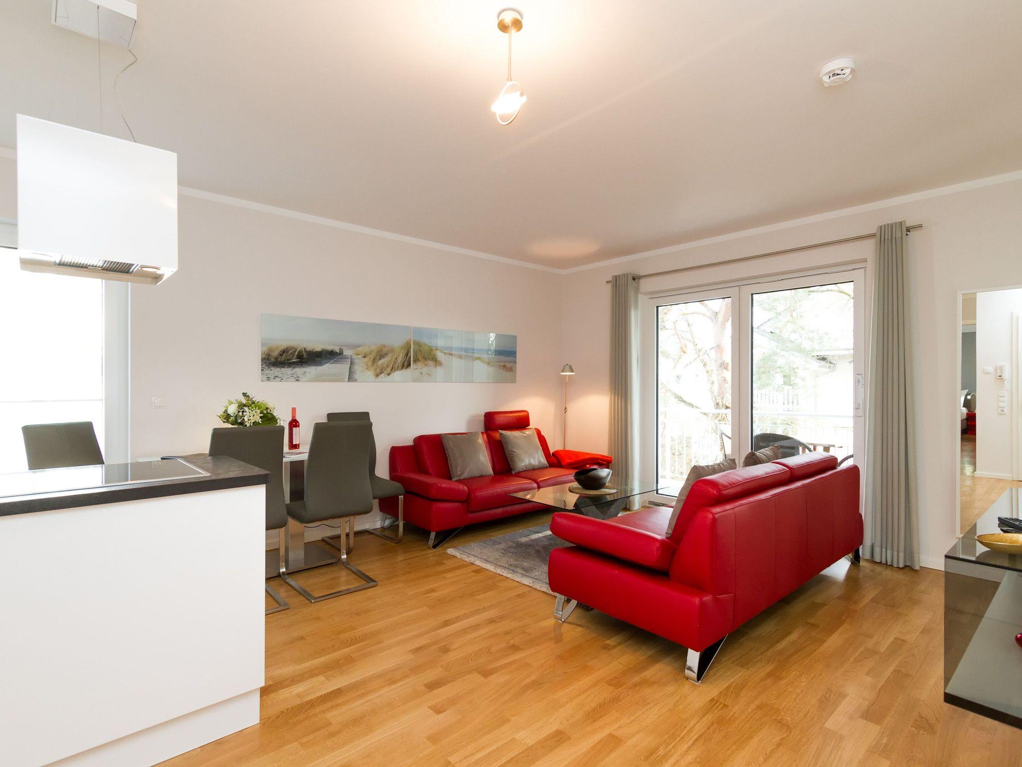 Klare Linie und kräftige Farben, ausgesuchte Materialien und ein modernes Design überzeugen im Appartement 18. Eintreten und Wohlfühlen ist hier die Devise, denn der Wohlfühlfaktor kommt hier nicht zu kurz! Die 3-Raum-Ferienwohnung (62 qm) für 4 Personen inklusive Kleinkind befindet sich im 2. Obergeschoss der Dünenresidenz. Schon beim Eintreten offeriert sich der helle Wohnbereich, ausgestattet mit zwei modernen Ledersofas und Flat-TV. Die angrenzende, offene Küche mit Essplatz fügt sich harmonisch ein und ist natürlich komplett ausgestattet. Zwei Schlafzimmer mit jeweils eigenem Bad bieten einen idealen Rückzugsort. Das erste Schlafzimmer verfügt über ein komfortables Doppelboxspringbett (1,80m x 2,00m), ein kleines Duschbad und Zugang zum Balkon. Das zweite Schlafzimmer wartet mit einem bequemen Doppelboxspringbett (1,60m x 2,00m) und Flat-TV auf, hier ist eine eigene Sauna im Duschbad integriert. Die Usedomer Sonne genießen Sie schon beim Frühstück auf dem Ostbalkon, ausgestattet mit Gartenmöbeln. Hier kann man bei ein bisschen Meerblick wunderbar Relaxen. Für Ihren Komfort sind die Betten bei der Anreise bezogen und Handtücher liegen bereit. Ein Pkw-Stellplatz steht in der Tiefgarage zur Verfügung (max. Einfahrtshöhe 1,93 m). Das Wlan-Netz kann kostenlos genutzt werden.