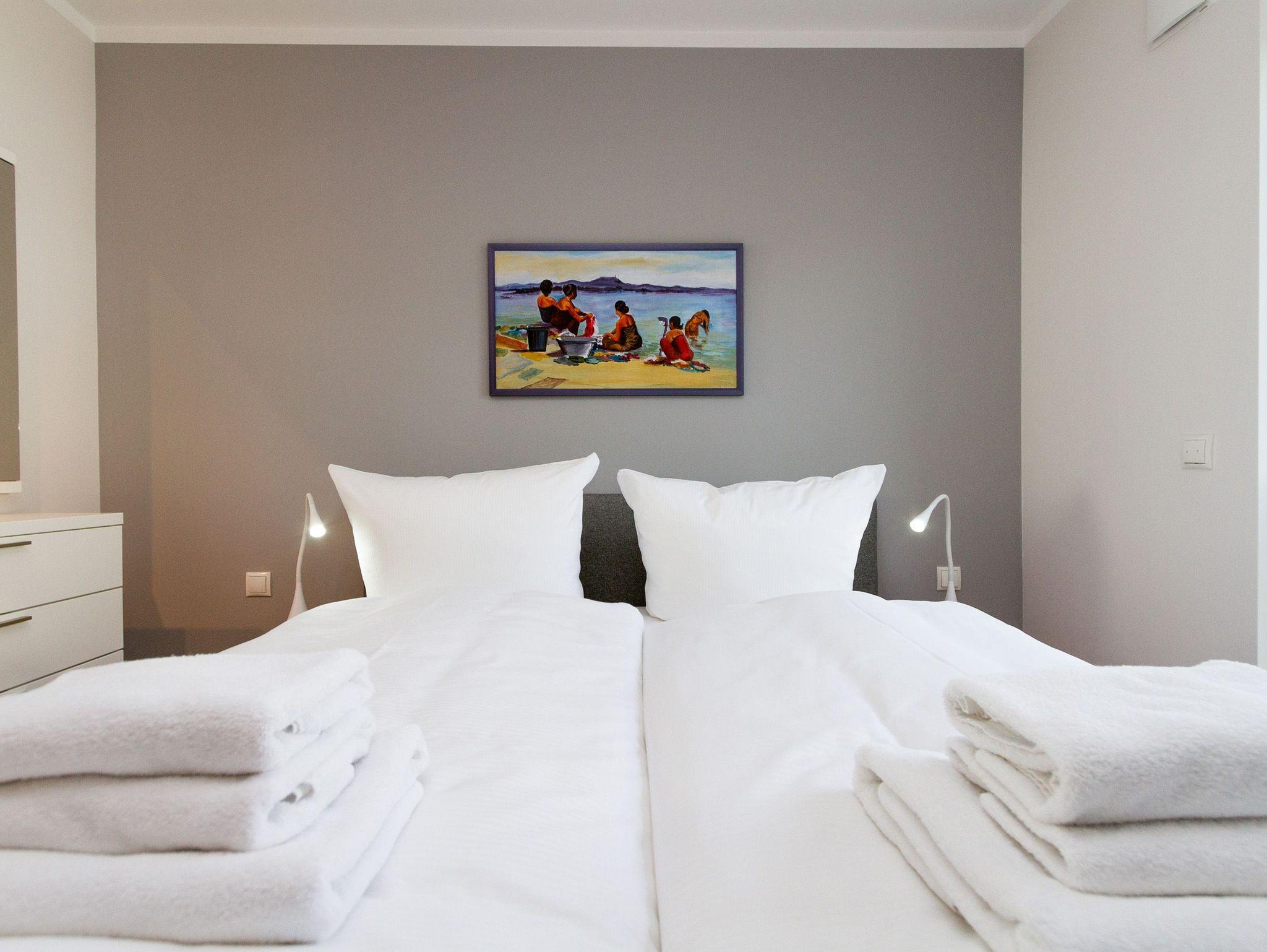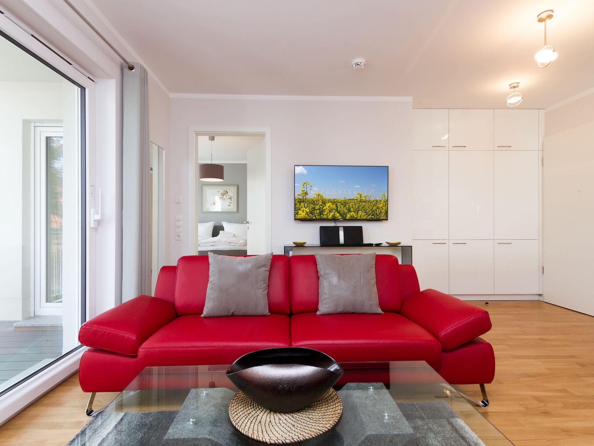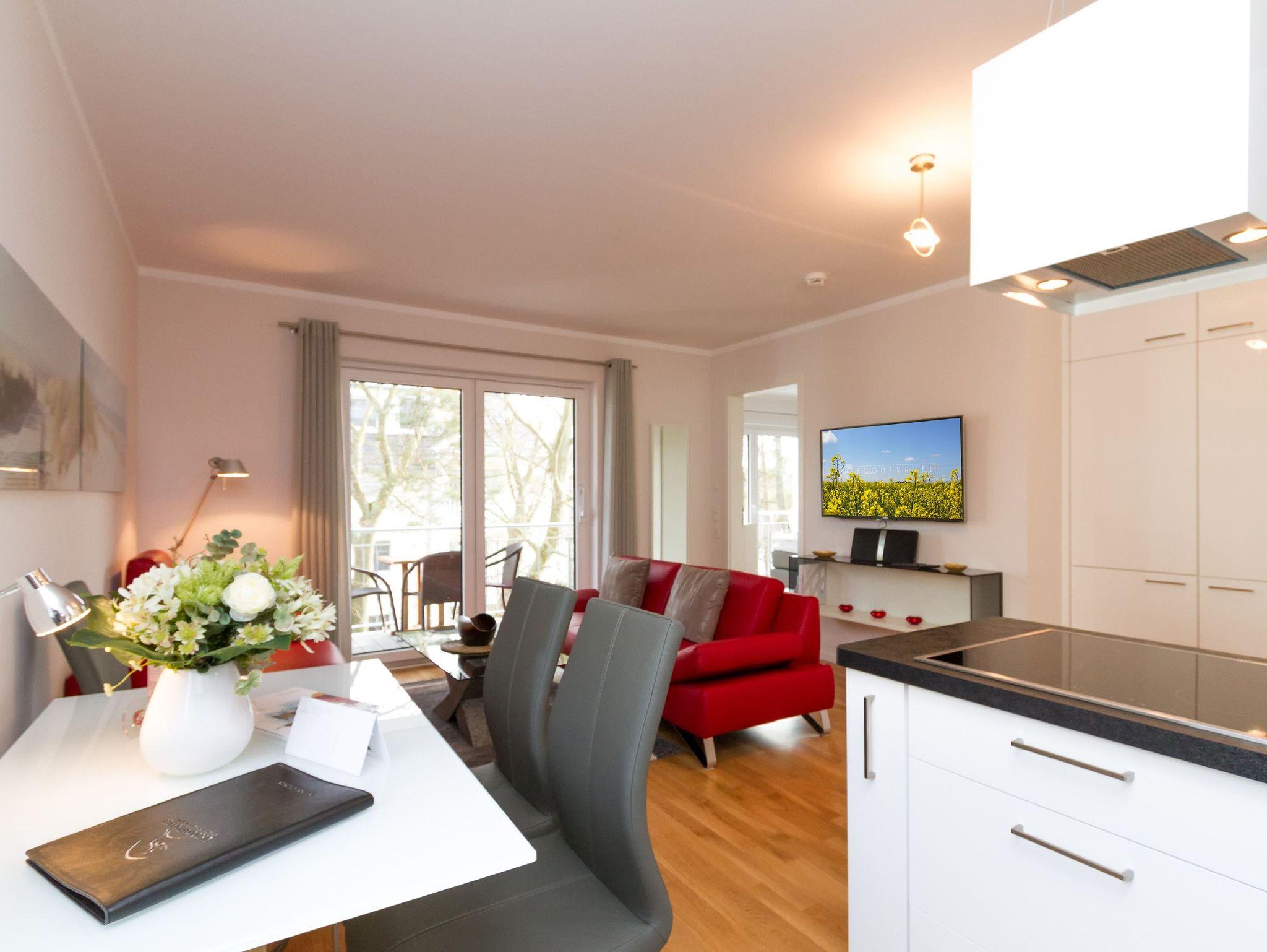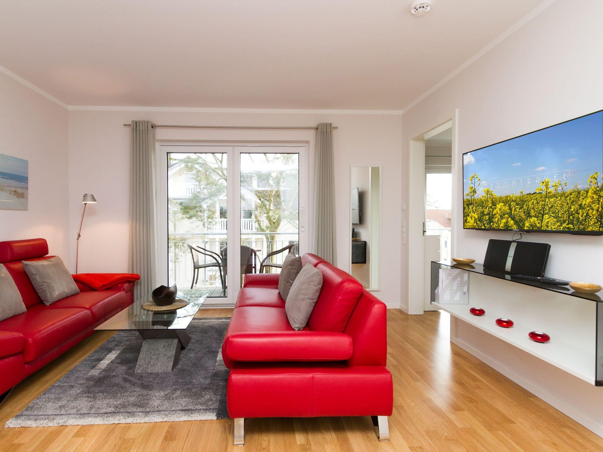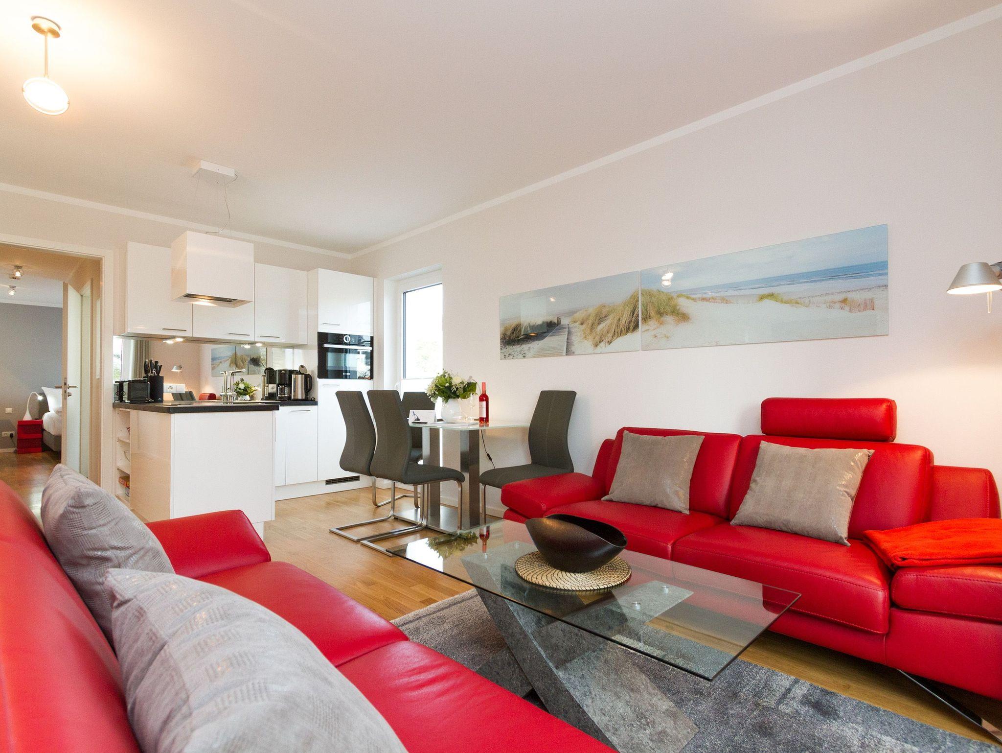 Klare Linie und kräftige Farben, ausgesuchte Materialien und ein modernes Design überzeugen im Appartement 18. Eintreten und Wohlfühlen ist hier die Devise, denn der Wohlfühlfaktor kommt hier nicht zu kurz! Die 3-Raum-Ferienwohnung (62 qm) für 4 Personen inklusive Kleinkind befindet sich im 2. Obergeschoss der Dünenresidenz. Schon beim Eintreten offeriert sich der helle Wohnbereich, ausgestattet mit zwei modernen Ledersofas und Flat-TV. Die angrenzende, offene Küche mit Essplatz fügt sich harmonisch ein und ist natürlich komplett ausgestattet. Zwei Schlafzimmer mit jeweils eigenem Bad bieten einen idealen Rückzugsort. Das erste Schlafzimmer verfügt über ein komfortables Doppelboxspringbett (1,80m x 2,00m), ein kleines Duschbad und Zugang zum Balkon. Das zweite Schlafzimmer wartet mit einem bequemen Doppelboxspringbett (1,60m x 2,00m) und Flat-TV auf, hier ist eine eigene Sauna im Duschbad integriert. Die Usedomer Sonne genießen Sie schon beim Frühstück auf dem Ostbalkon, ausgestattet mit Gartenmöbeln. Hier kann man bei ein bisschen Meerblick wunderbar Relaxen. Für Ihren Komfort sind die Betten bei der Anreise bezogen und Handtücher liegen bereit. Ein Pkw-Stellplatz steht in der Tiefgarage zur Verfügung (max. Einfahrtshöhe 1,93 m). Das Wlan-Netz kann kostenlos genutzt werden.