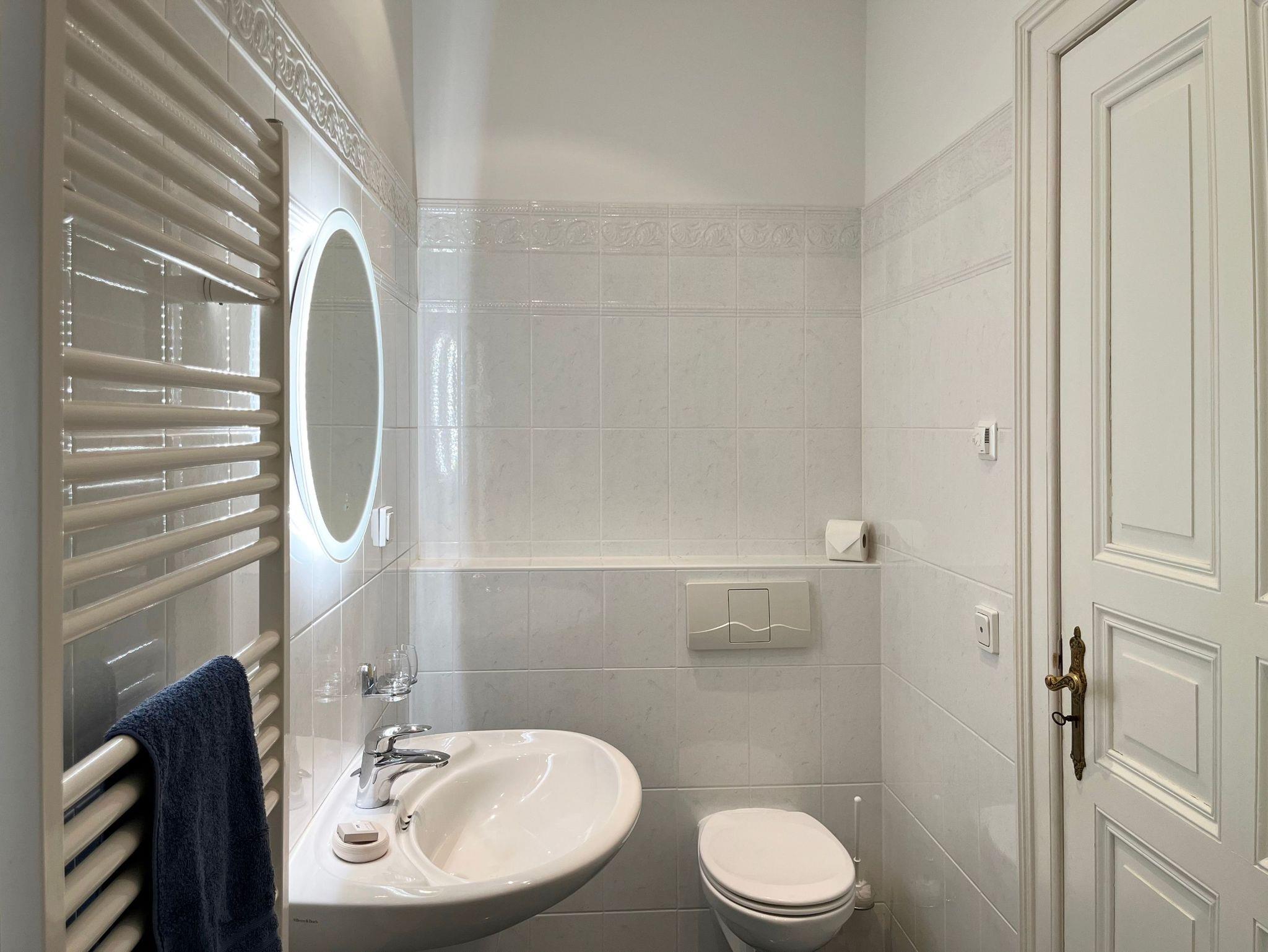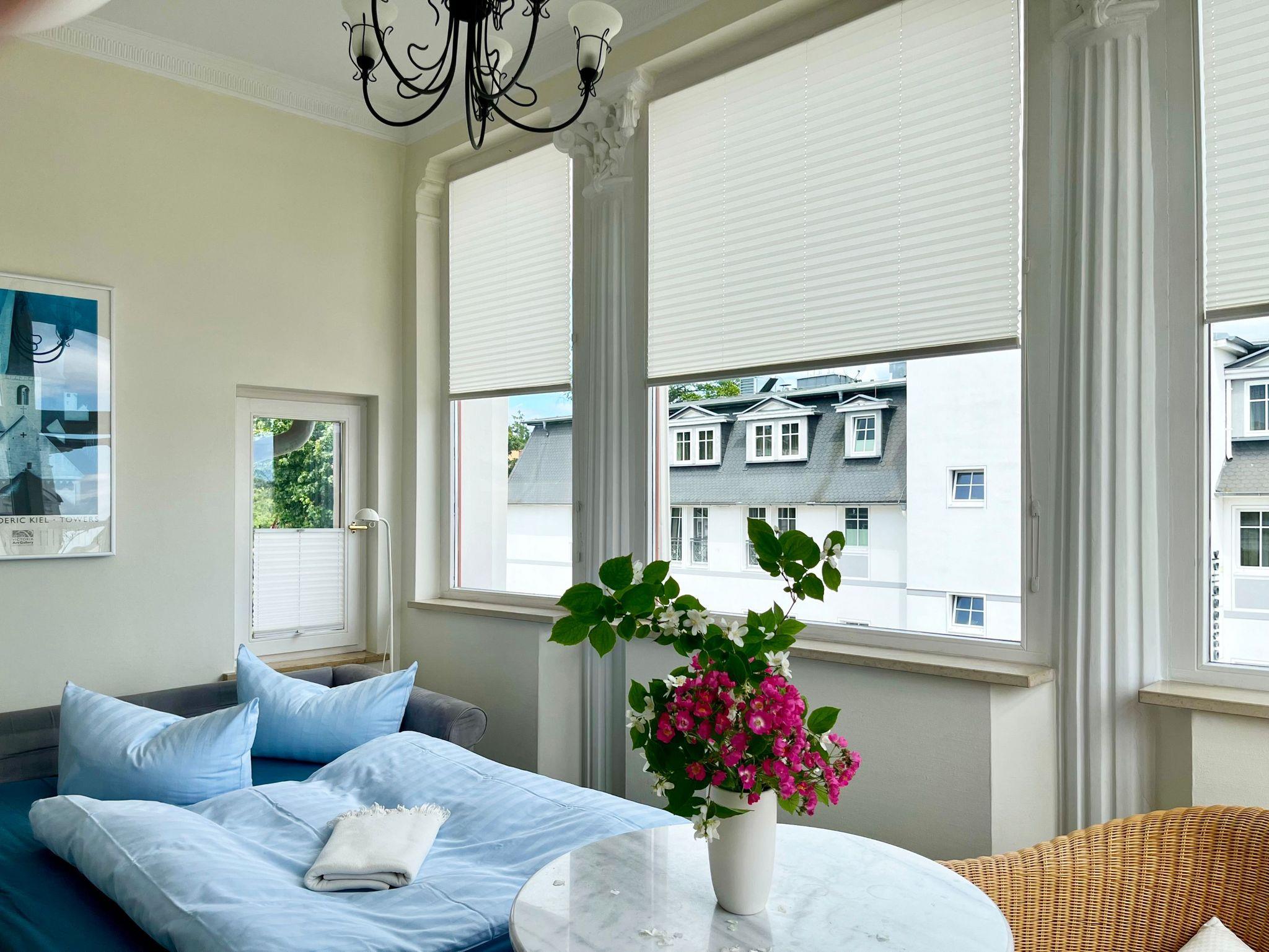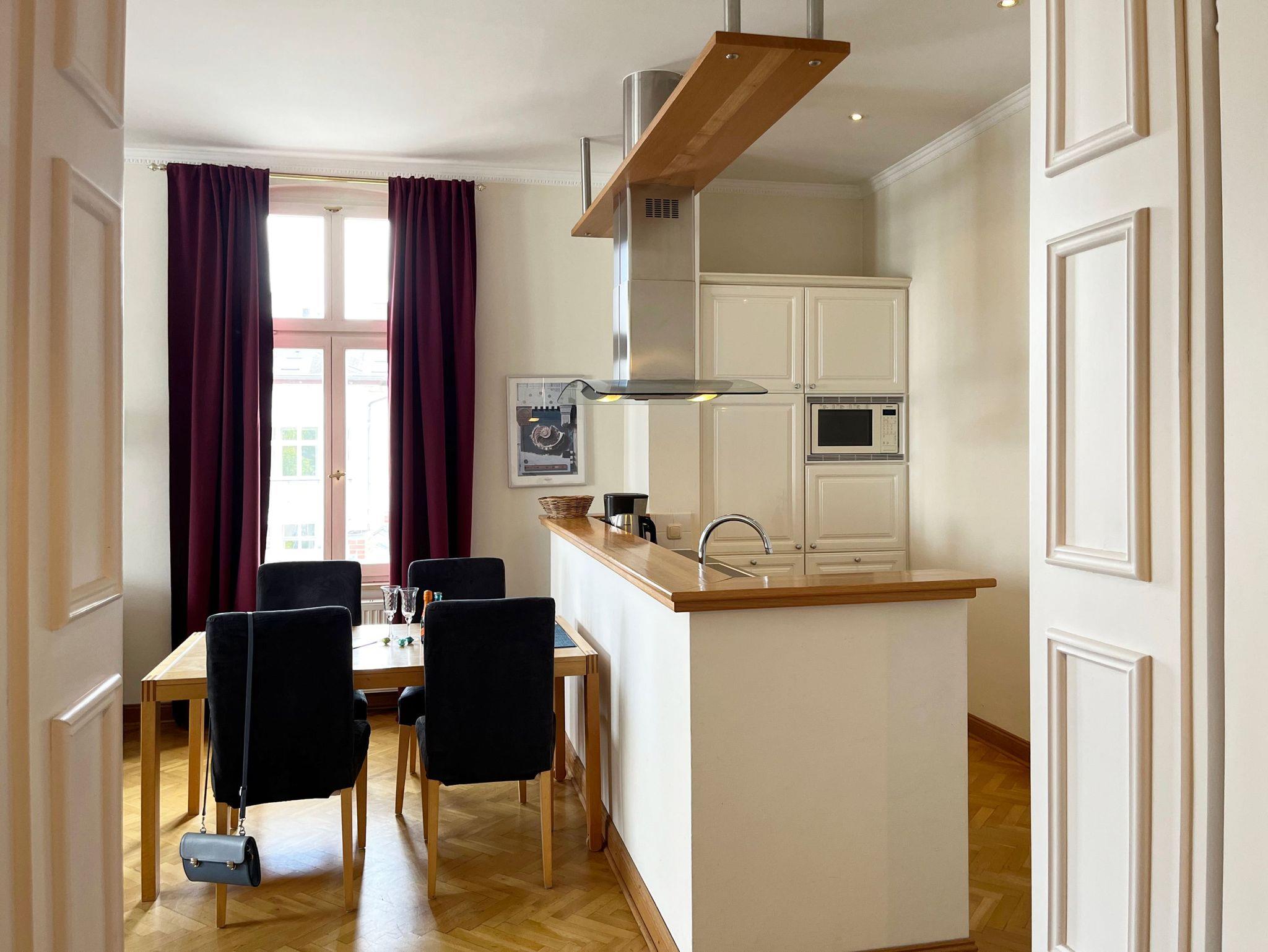 Die geschmackvoll eingerichtete Ferienwohnung der Achterkerke-Stiftung befindet sich im 2. Obergeschoss. Sie wohnen im historischen Ambiente mit Verandenvorbau, hohen Räumen, Kassettentüren und Parkettböden. Eine hochwertige Ledercouch im Wohnzimmer ist als komfortables Bettsofa (ca. 1,80x2,00m) nutzbar. In der Veranda gibt es ein weiteres Schlafsofa (ca. 1,35x2,00m). Es steht ein zuverlässiges W-LAN-Netz und Smart-TV zur Verfügung sowie ein DVD-Player und ein Bluetooth-Lautsprecher - zur einfachen Verbindung mit dem Smartphone, iPad oder einem anderen bluetoothfähigen Gerät. Direkt an das große Schlafzimmer schließt sich ein großes Badezimmer mit Badewanne an. Zusätzlich steht ein zweites, kleineres Bad mit Dusche zur Verfügung. Eine offene, voll ausgestattete Küche (Geschirrspülmaschine, Kühlschrank mit Gefrierfach, Mikrowelle, Backofen, Cerankochfeld, Filterkaffeemaschine, Toaster, Wasserkocher) ist in den Wohnraum integriert. Sie finden eine gepflegte Ferienwohnung vor - geeignet für Familienurlaub oder für Gäste, die eine großzügige Unterkunft suchen. Zur Wohnungsausstattung gehört ein Waschtrockner und Bügelzubehör.