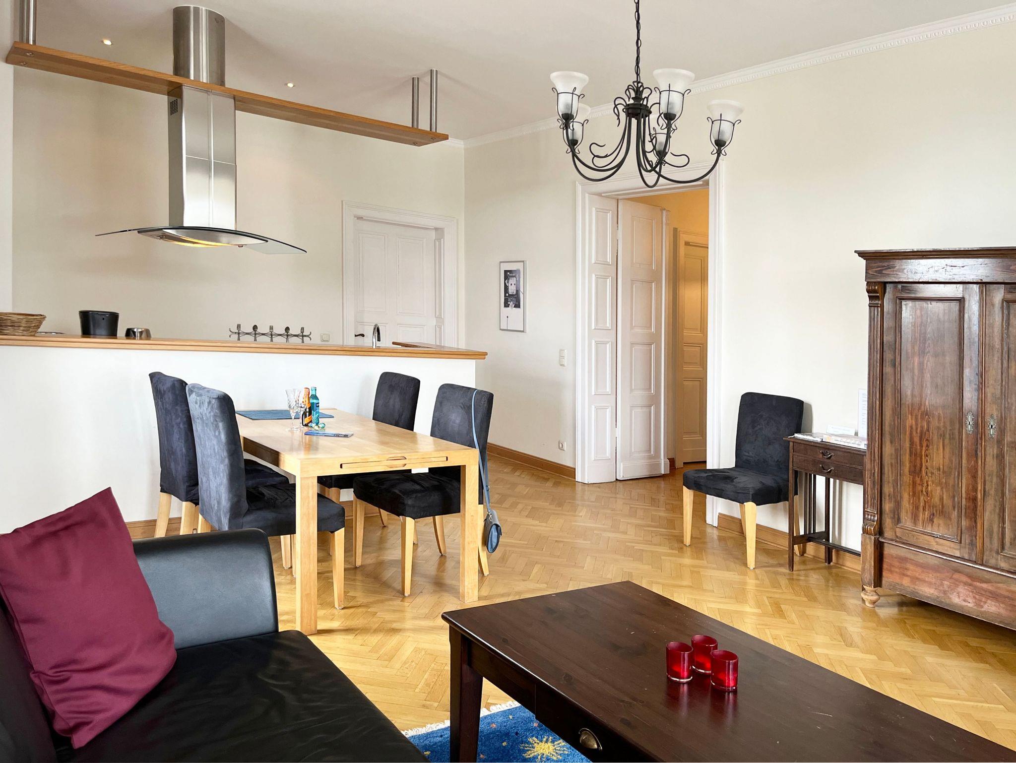 80 qm große Ferienwohnung mit historischem Verandenvorbau und zwei Badezimmern. W-LAN-Zugang und Erstausstattung mit Bettwäsche & Handtüchern inclusive. Gegen Gebühr können Kinderbett und Hochstuhl geliehen werden. Auf Wunsch bieten wir eine Zwischenreinigung der Wohnung gg. Gebühr an. Sollten während Ihres Aufenthaltes Fragen oder Probleme bestehen, so ist ein Ansprechpartner vor Ort. Ein Pkw-Stellplatz (7 Euro/Nacht) kann in der Nähe der Villa Kramme angemietet werden. Nach vorheriger Rücksprache mit dem Vermieter ist das Mitbringen eines Hundes möglich. Hierfür berechnen wir einen Aufpreis von 10 Euro/Nacht.