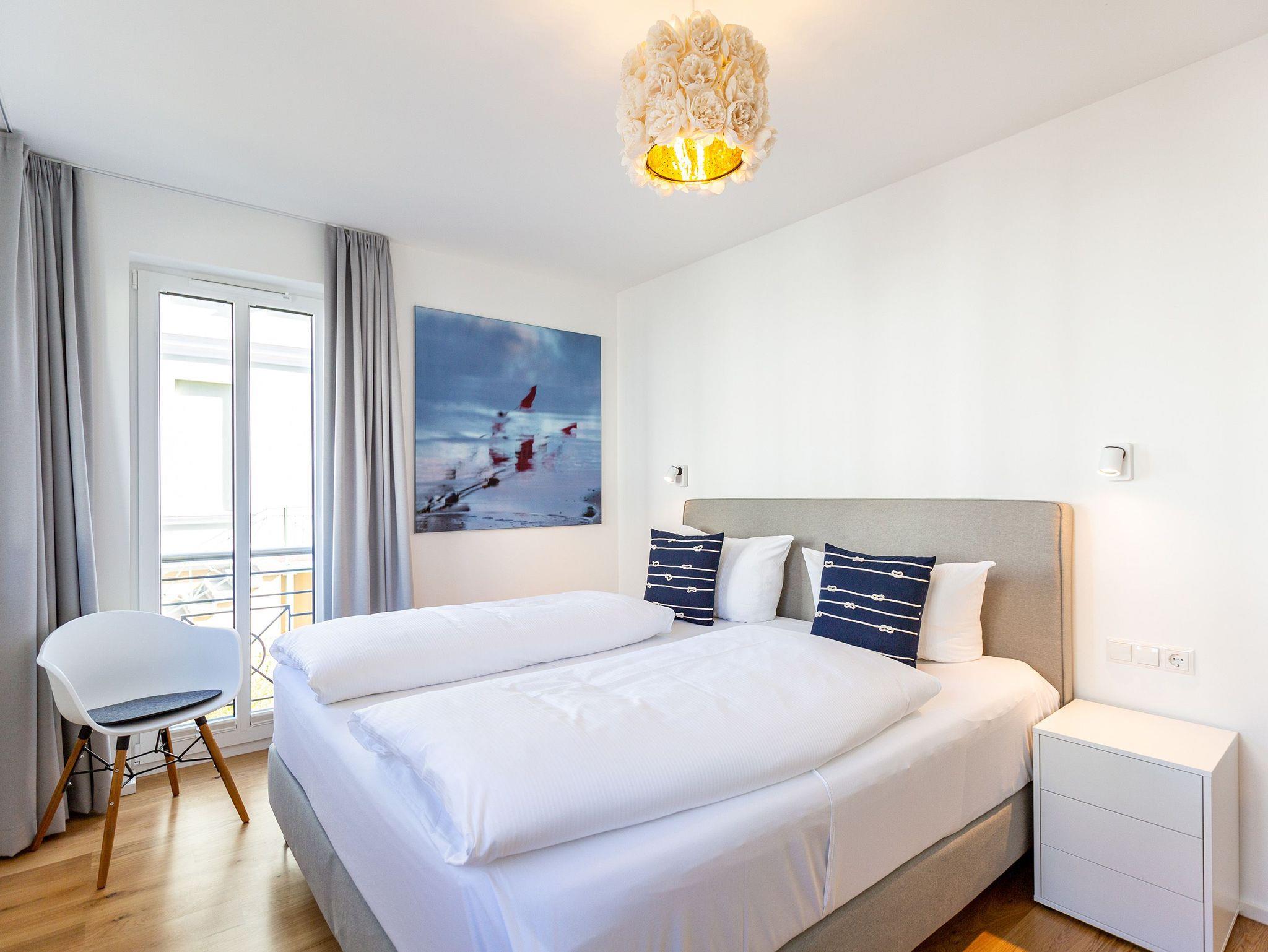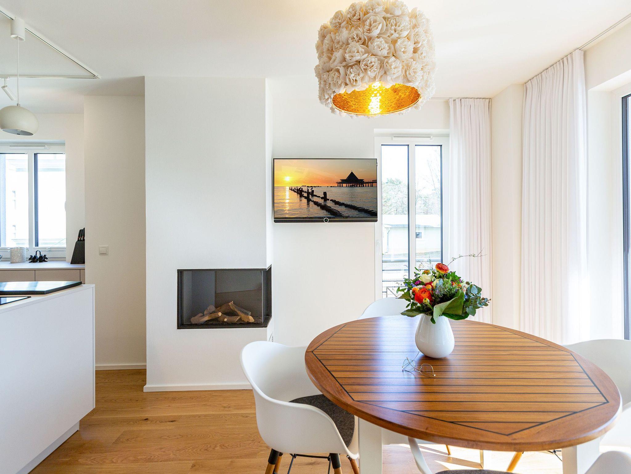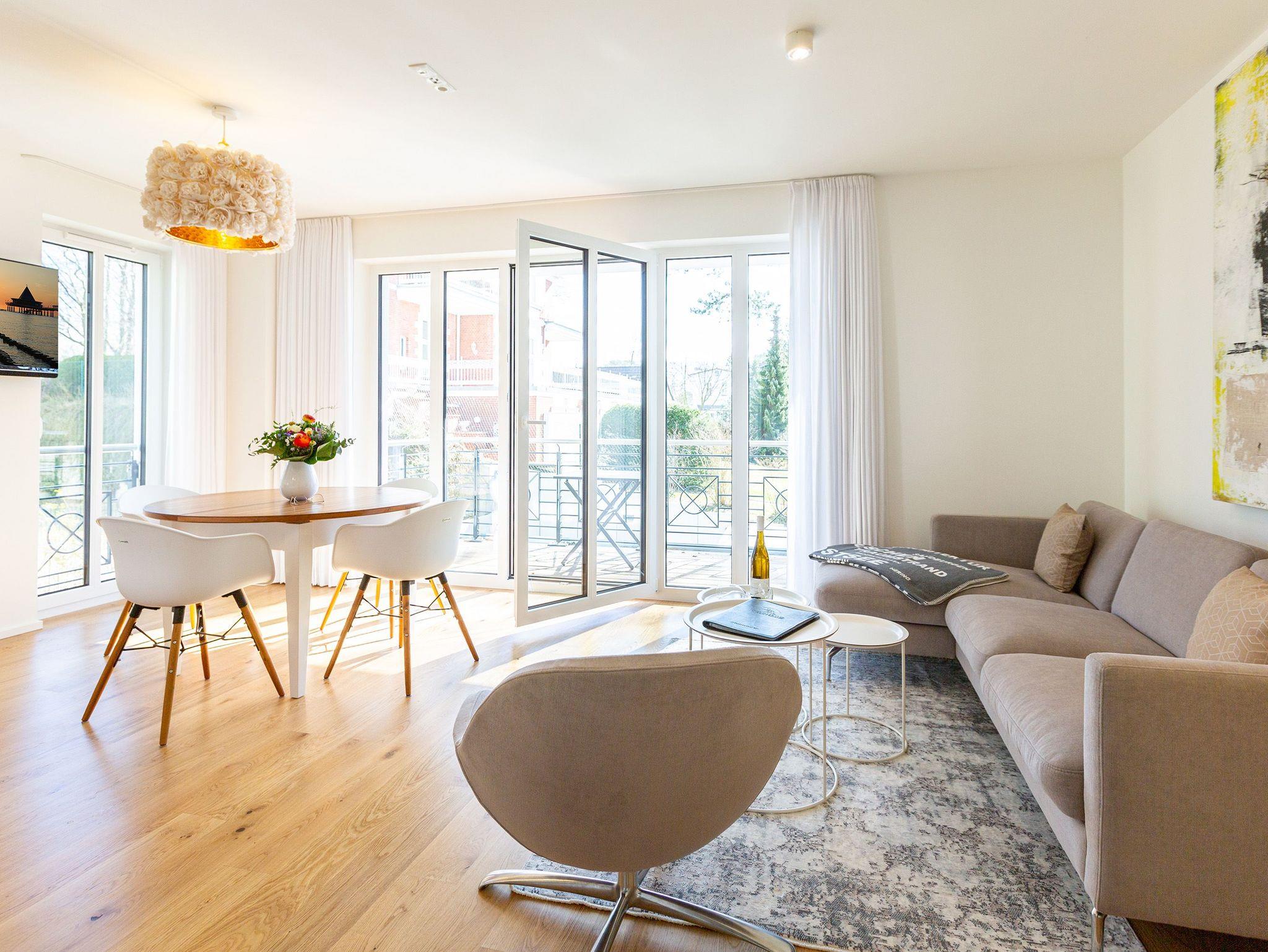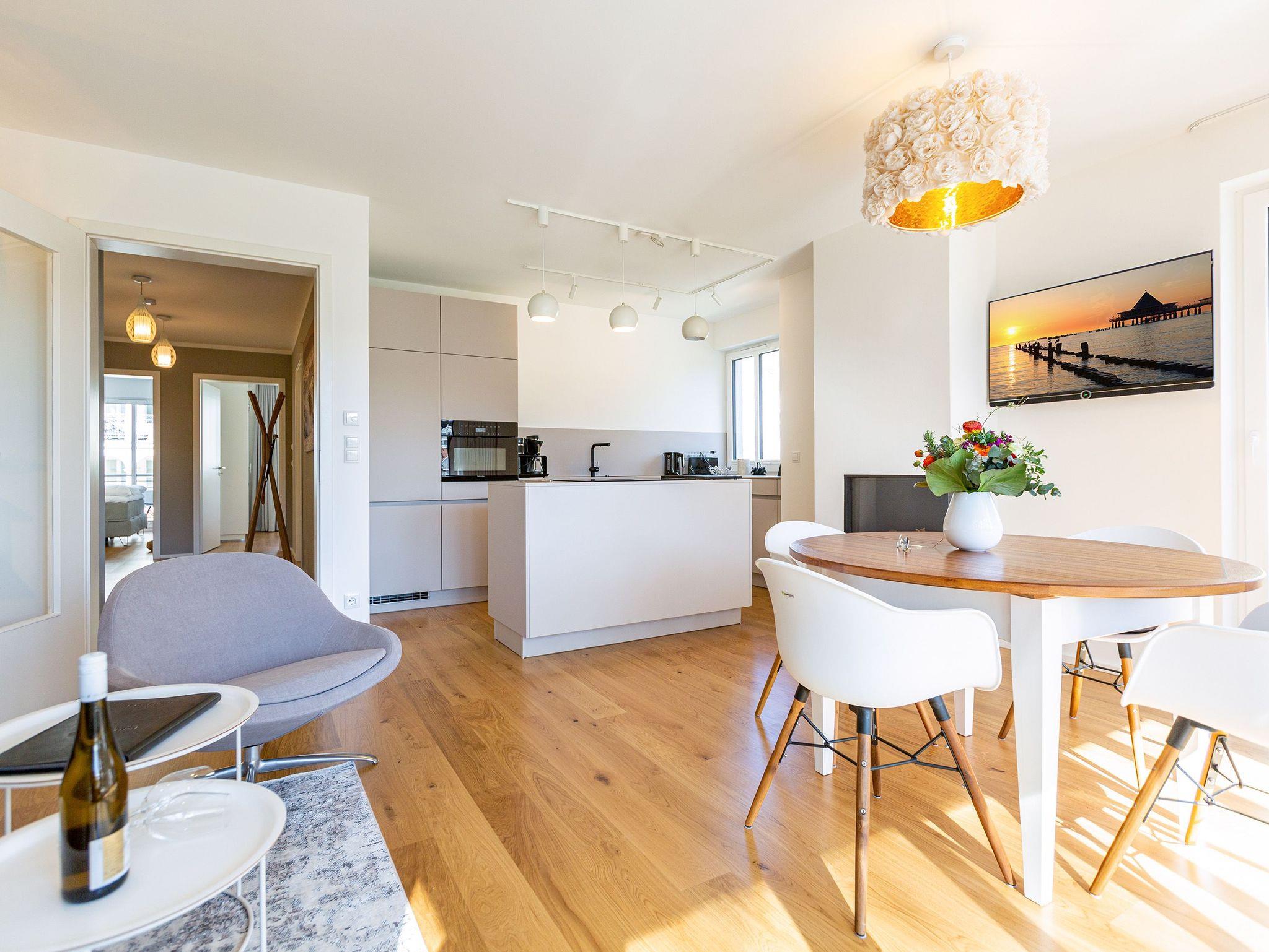 Nordisches Design meets Ostseerauschen ? Ein 82 Quadratmeter großes, stylisches Wohlfühlreich empfängt Sie im Appartement 3 in der ersten Etage des Quartier Eichenweg. Hier beginnt der Urlaub für bis zu vier Personen schon beim Eintreten. Wenn Sie es genau nehmen, schon beim Ankommen. Das Auto auf den reservierten Stellplatz Nummer 3 abgestellt, entspannt mit dem Fahrstuhl ins Urlaubsdomizil befördert, können Sie bei so viel sonniger Leichtigkeit gleich einmal richtig durchatmen. Ein besonderes Extra erwartet Sie bereits auf dem Flur: Ein Fitnessgerät steht Ihnen hier für Ihr tägliches Workout zur Verfügung ? für alle, die auch im Urlaub nicht ganz auf Bewegung verzichten möchten. Reißen Sie die bodentiefen Fenster weit auf und genießen Sie die frische Ostseebrise auf dem Nord-West-Balkon (ca. 6,8 Quadratmeter) mit Einsitzer/Cabrio-Strandkorb [&] Terrassenmöbel. Hier lässt es sich herrlich frühstücken. Das Innere Ihres Appartements ist bis ins Detail aufs Feinste eingerichtet. Lampen, Möbel und Bilder von einem Usedomer Fotografen sind nordisch nobel. Eine Sofalandschaft mit Sessel lädt zum Relaxen ein. Zur Ausstattung des geräumigen Wohn-Esszimmers gehören ein Gas-Kamin und ein großer Flat-TV. Das WLAN können Sie kostenfrei nutzen. Ein schöner Esstisch mit vier Schalenstühlen eignet sich bestens für die Mahlzeiten. Zubereiten können Sie sie in der offenen und modernen Küche. Eine Kochinsel mit Induktionsherd und einer Vertiefung für den Wok bringt Hobbyköche ins Schwärmen. Alle Geräte sind hochwertig. Ein komplettes Geschirr-Service befindet sich in den Schränken. Abwaschen muss hier zum Glück niemand. Es gibt einen Geschirrspüler. Weiter geht?s mit den beiden komfortablen Schlafzimmern. Bequeme Boxspringdoppelbetten (1,80 m x 2,00 m und 1,60 m x 2,00 m) versprechen erholsame Träume. Die Zimmer verfügen über je einen großen Kleiderschrank und ebenfalls einen Flat-TV. Zwei Bäder mit Dusche und WC sorgen für genügend Raum zum Frischmachen. Das Masterbad ist zudem mit einer Finnischen Sauna und einem Wasch-Trockner ausgestattet. Bei Anreise liegen Handtücher für Sie bereit und die Betten sind bezogen.