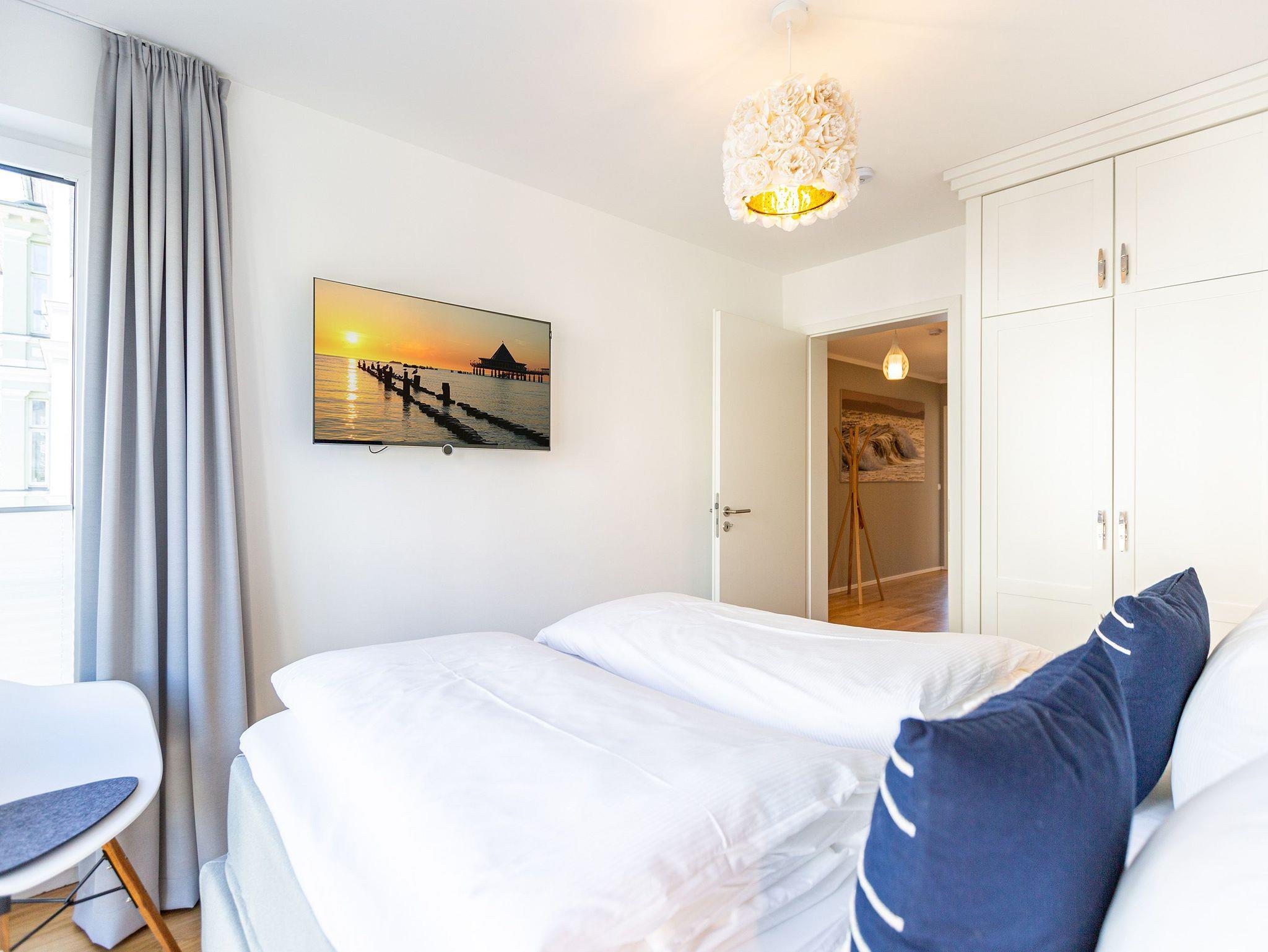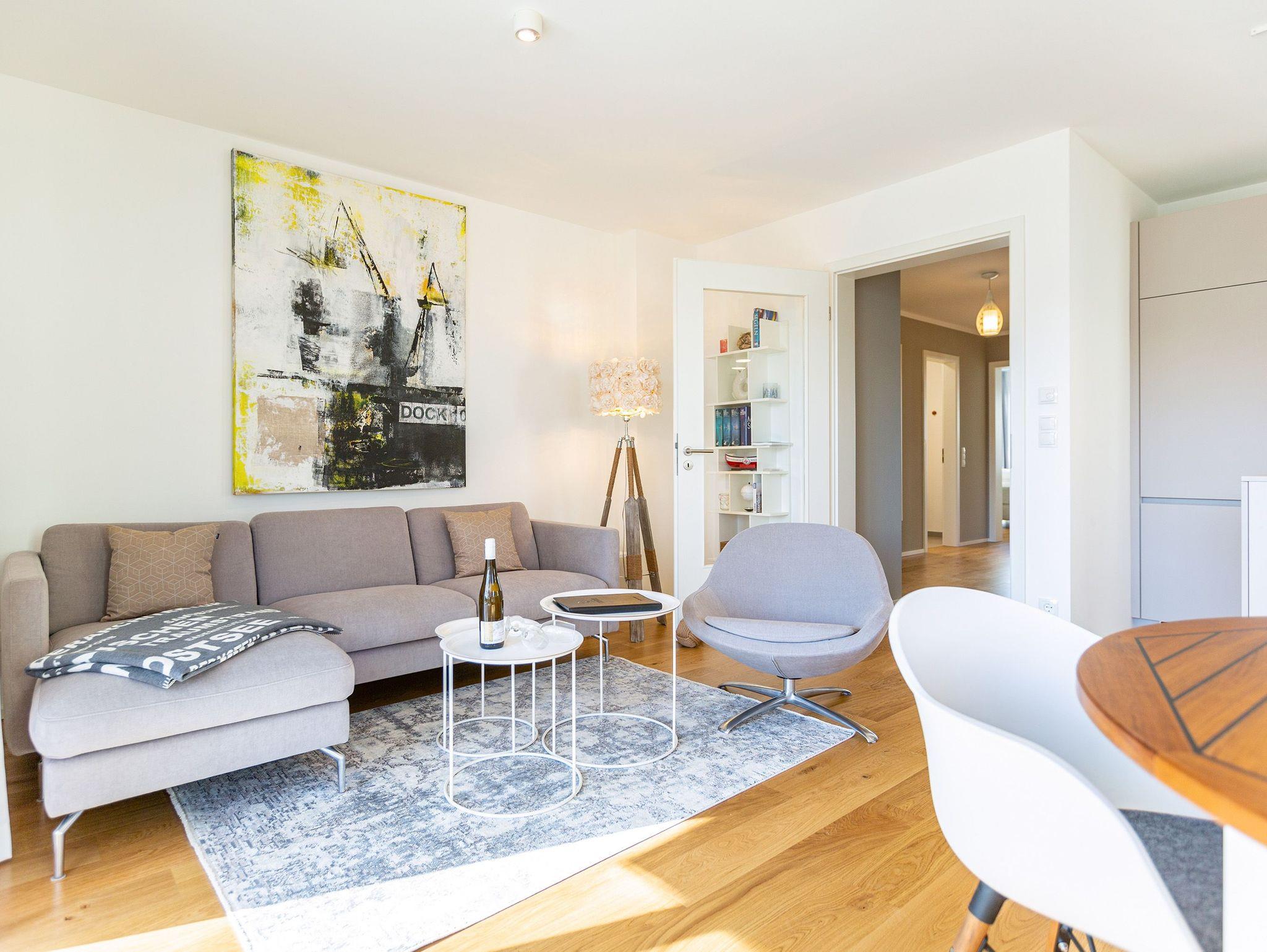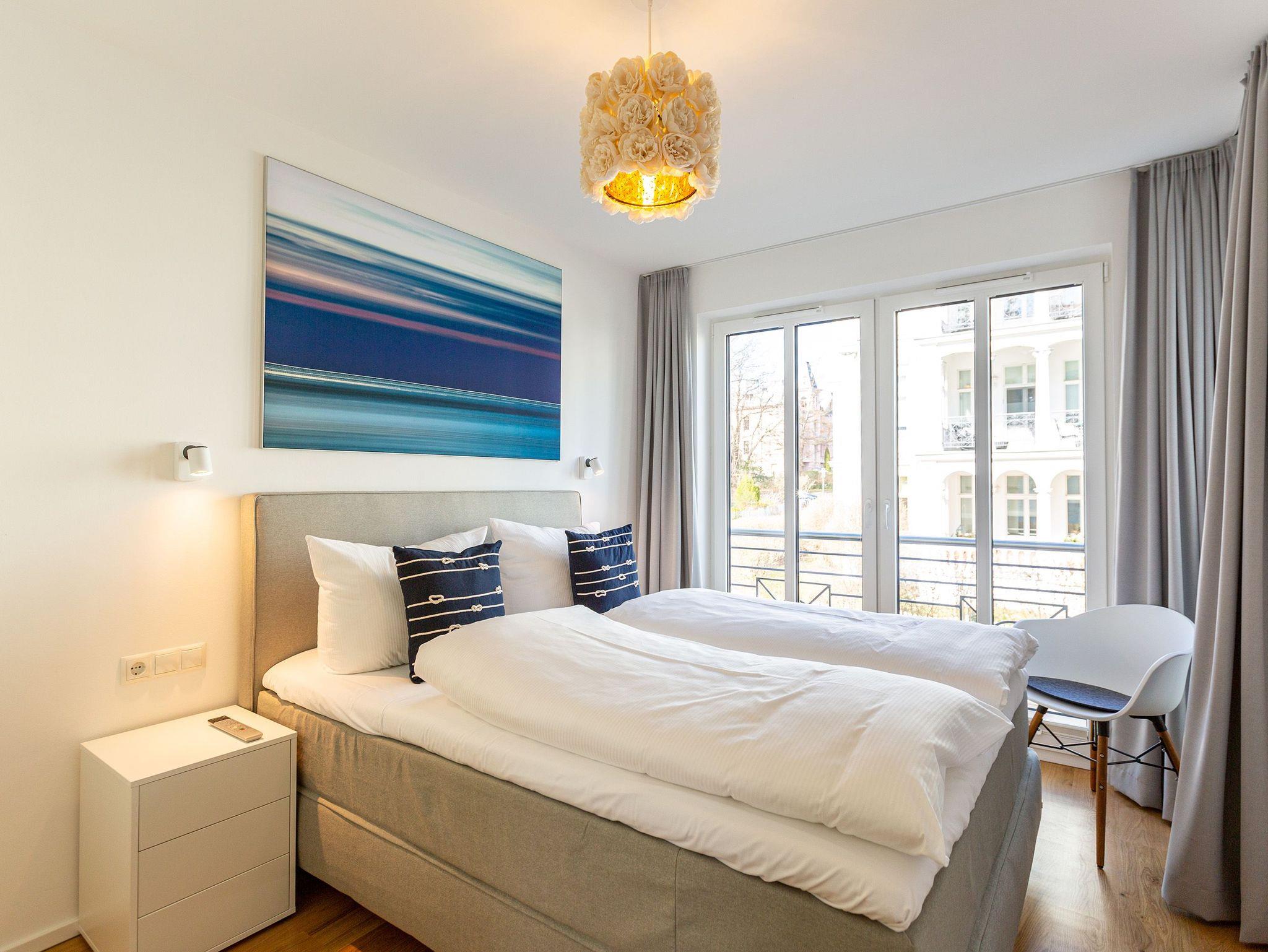 Nordisches Design meets Ostseerauschen ? Ein 82 Quadratmeter großes, stylisches Wohlfühlreich empfängt Sie im Appartement 3 in der ersten Etage des Quartier Eichenweg. Hier beginnt der Urlaub für bis zu vier Personen schon beim Eintreten. Wenn Sie es genau nehmen, schon beim Ankommen. Das Auto auf den reservierten Stellplatz Nummer 3 abgestellt, entspannt mit dem Fahrstuhl ins Urlaubsdomizil befördert, können Sie bei so viel sonniger Leichtigkeit gleich einmal richtig durchatmen. Ein besonderes Extra erwartet Sie bereits auf dem Flur: Ein Fitnessgerät steht Ihnen hier für Ihr tägliches Workout zur Verfügung ? für alle, die auch im Urlaub nicht ganz auf Bewegung verzichten möchten. Reißen Sie die bodentiefen Fenster weit auf und genießen Sie die frische Ostseebrise auf dem Nord-West-Balkon (ca. 6,8 Quadratmeter) mit Einsitzer/Cabrio-Strandkorb [&] Terrassenmöbel. Hier lässt es sich herrlich frühstücken. Das Innere Ihres Appartements ist bis ins Detail aufs Feinste eingerichtet. Lampen, Möbel und Bilder von einem Usedomer Fotografen sind nordisch nobel. Eine Sofalandschaft mit Sessel lädt zum Relaxen ein. Zur Ausstattung des geräumigen Wohn-Esszimmers gehören ein Gas-Kamin und ein großer Flat-TV. Das WLAN können Sie kostenfrei nutzen. Ein schöner Esstisch mit vier Schalenstühlen eignet sich bestens für die Mahlzeiten. Zubereiten können Sie sie in der offenen und modernen Küche. Eine Kochinsel mit Induktionsherd und einer Vertiefung für den Wok bringt Hobbyköche ins Schwärmen. Alle Geräte sind hochwertig. Ein komplettes Geschirr-Service befindet sich in den Schränken. Abwaschen muss hier zum Glück niemand. Es gibt einen Geschirrspüler. Weiter geht?s mit den beiden komfortablen Schlafzimmern. Bequeme Boxspringdoppelbetten (1,80 m x 2,00 m und 1,60 m x 2,00 m) versprechen erholsame Träume. Die Zimmer verfügen über je einen großen Kleiderschrank und ebenfalls einen Flat-TV. Zwei Bäder mit Dusche und WC sorgen für genügend Raum zum Frischmachen. Das Masterbad ist zudem mit einer Finnischen Sauna und einem Wasch-Trockner ausgestattet. Bei Anreise liegen Handtücher für Sie bereit und die Betten sind bezogen.