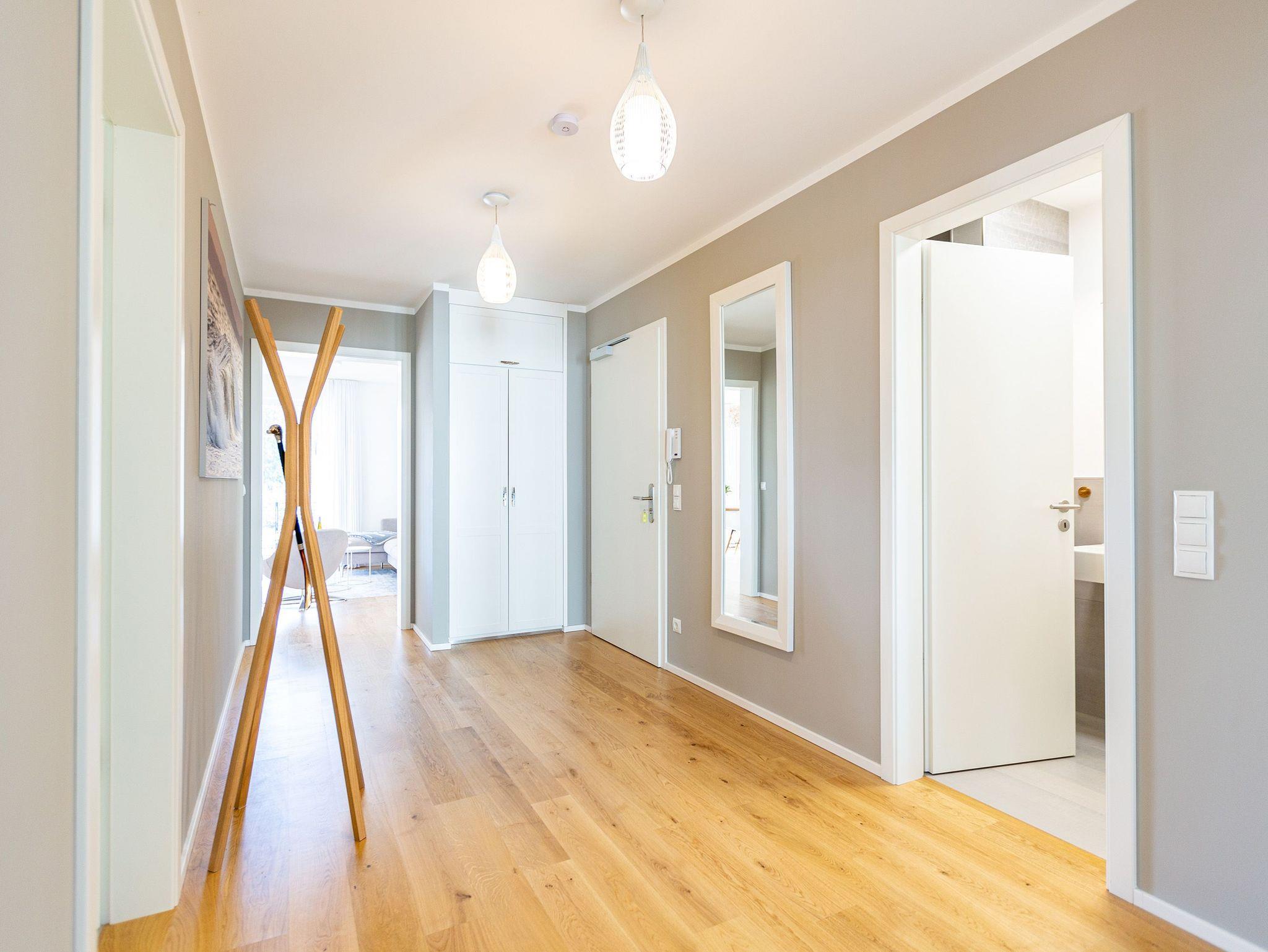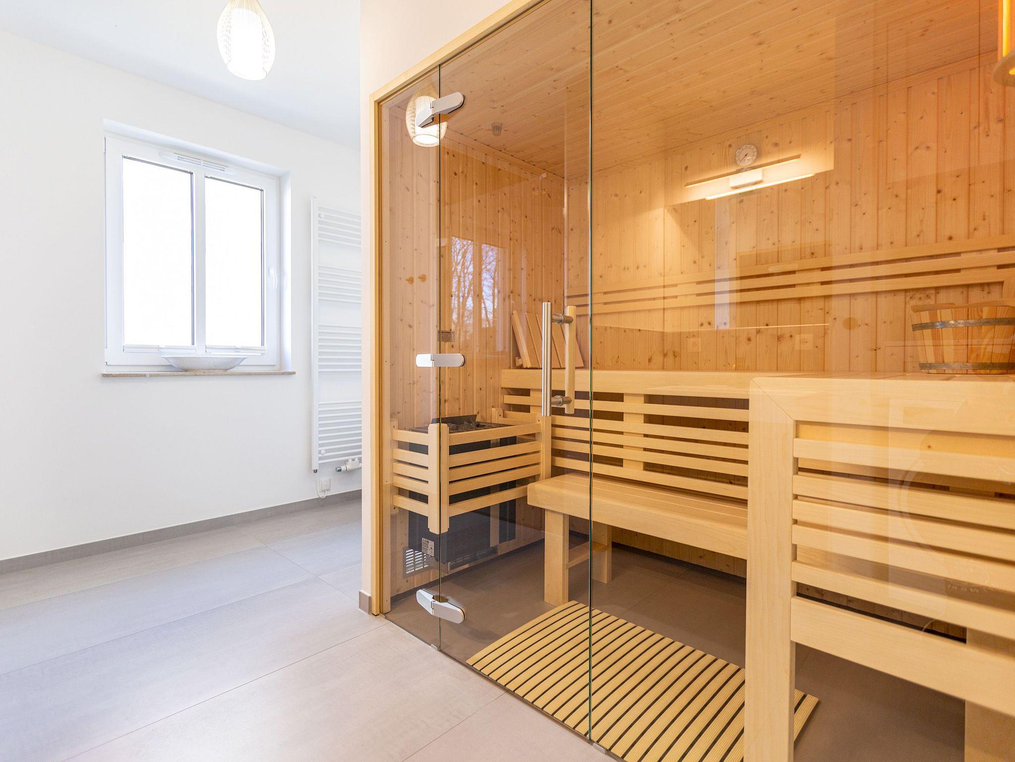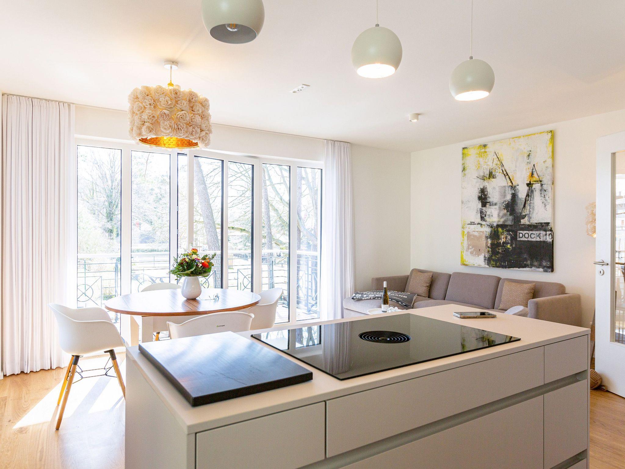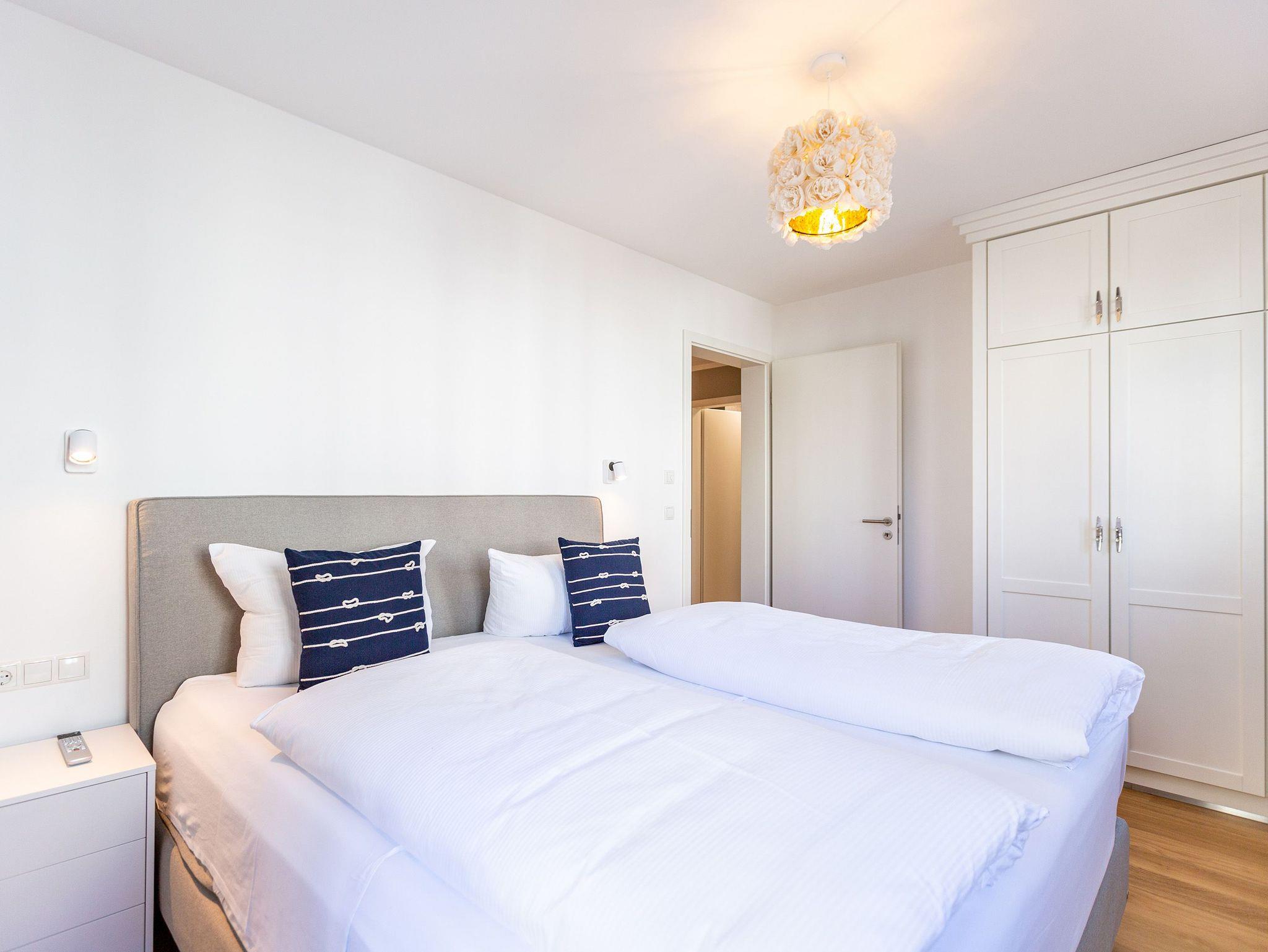 Nordisches Design meets Ostseerauschen ? Ein 82 Quadratmeter großes, stylisches Wohlfühlreich empfängt Sie im Appartement 3 in der ersten Etage des Quartier Eichenweg. Hier beginnt der Urlaub für bis zu vier Personen schon beim Eintreten. Wenn Sie es genau nehmen, schon beim Ankommen. Das Auto auf den reservierten Stellplatz Nummer 3 abgestellt, entspannt mit dem Fahrstuhl ins Urlaubsdomizil befördert, können Sie bei so viel sonniger Leichtigkeit gleich einmal richtig durchatmen. Ein besonderes Extra erwartet Sie bereits auf dem Flur: Ein Fitnessgerät steht Ihnen hier für Ihr tägliches Workout zur Verfügung ? für alle, die auch im Urlaub nicht ganz auf Bewegung verzichten möchten. Reißen Sie die bodentiefen Fenster weit auf und genießen Sie die frische Ostseebrise auf dem Nord-West-Balkon (ca. 6,8 Quadratmeter) mit Einsitzer/Cabrio-Strandkorb [&] Terrassenmöbel. Hier lässt es sich herrlich frühstücken. Das Innere Ihres Appartements ist bis ins Detail aufs Feinste eingerichtet. Lampen, Möbel und Bilder von einem Usedomer Fotografen sind nordisch nobel. Eine Sofalandschaft mit Sessel lädt zum Relaxen ein. Zur Ausstattung des geräumigen Wohn-Esszimmers gehören ein Gas-Kamin und ein großer Flat-TV. Das WLAN können Sie kostenfrei nutzen. Ein schöner Esstisch mit vier Schalenstühlen eignet sich bestens für die Mahlzeiten. Zubereiten können Sie sie in der offenen und modernen Küche. Eine Kochinsel mit Induktionsherd und einer Vertiefung für den Wok bringt Hobbyköche ins Schwärmen. Alle Geräte sind hochwertig. Ein komplettes Geschirr-Service befindet sich in den Schränken. Abwaschen muss hier zum Glück niemand. Es gibt einen Geschirrspüler. Weiter geht?s mit den beiden komfortablen Schlafzimmern. Bequeme Boxspringdoppelbetten (1,80 m x 2,00 m und 1,60 m x 2,00 m) versprechen erholsame Träume. Die Zimmer verfügen über je einen großen Kleiderschrank und ebenfalls einen Flat-TV. Zwei Bäder mit Dusche und WC sorgen für genügend Raum zum Frischmachen. Das Masterbad ist zudem mit einer Finnischen Sauna und einem Wasch-Trockner ausgestattet. Bei Anreise liegen Handtücher für Sie bereit und die Betten sind bezogen.