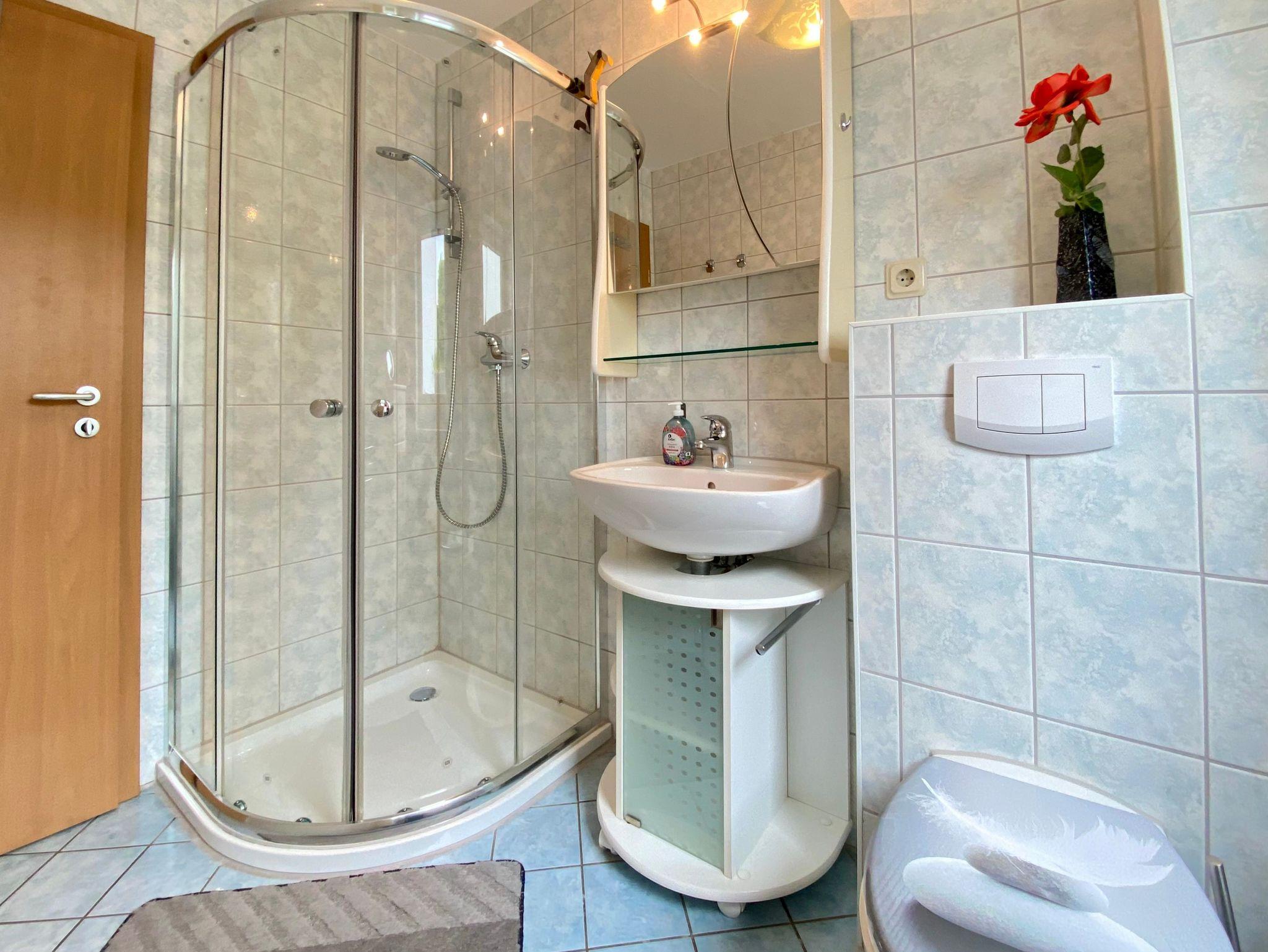 Das Schlafzimmer verfügt über ein Doppelbett mit 140er Breite und ist im Gegensatz zum übrigen Teil der Ferienwohnung nicht mit Laminat, sondern mit Echtholzparkett ausgelegt. Das Badezimmer mit Dusche hat ein Fenster. Zur Wohnung gehört ein kostenfreier Stellplatz und W-LAN
