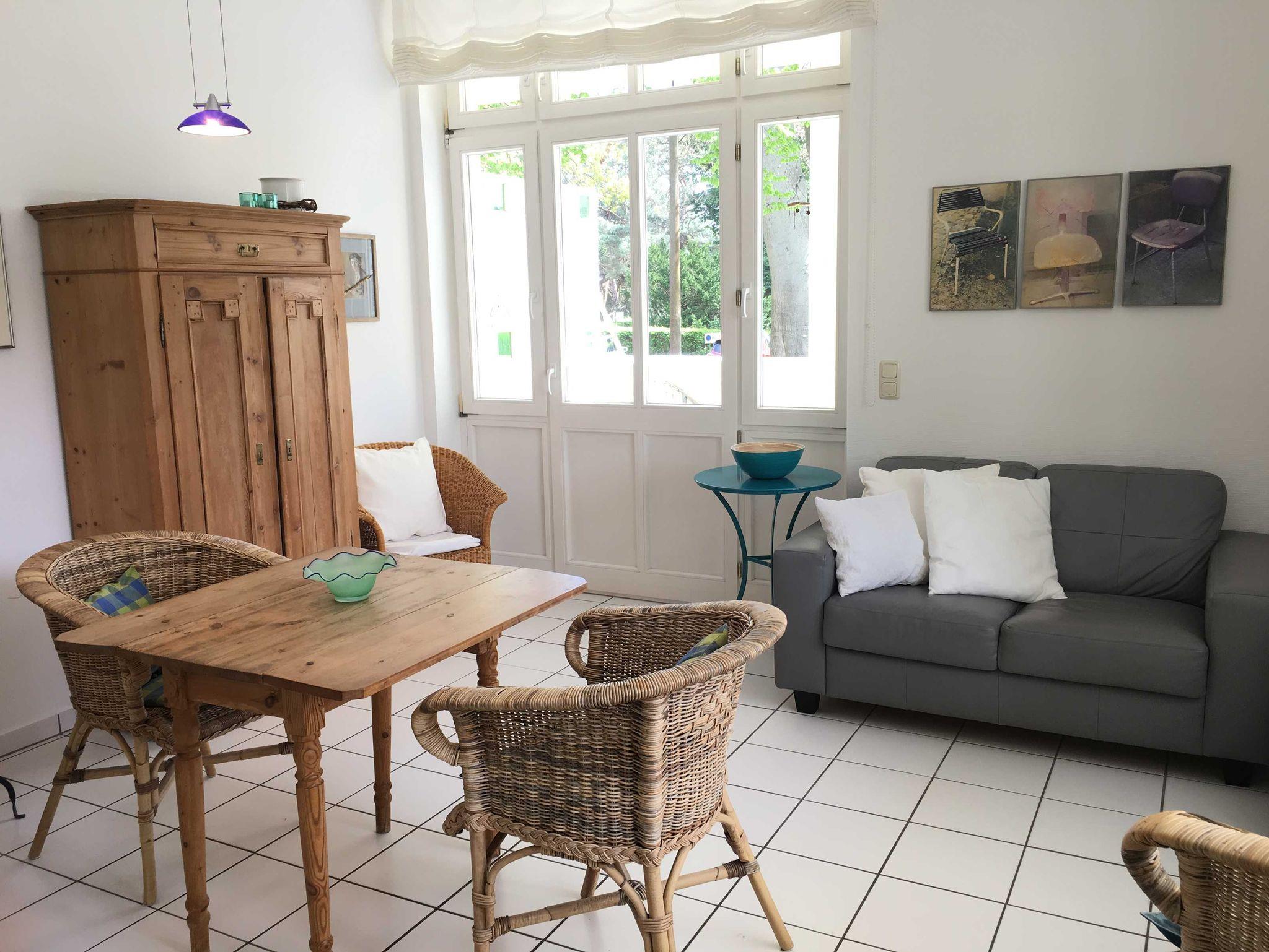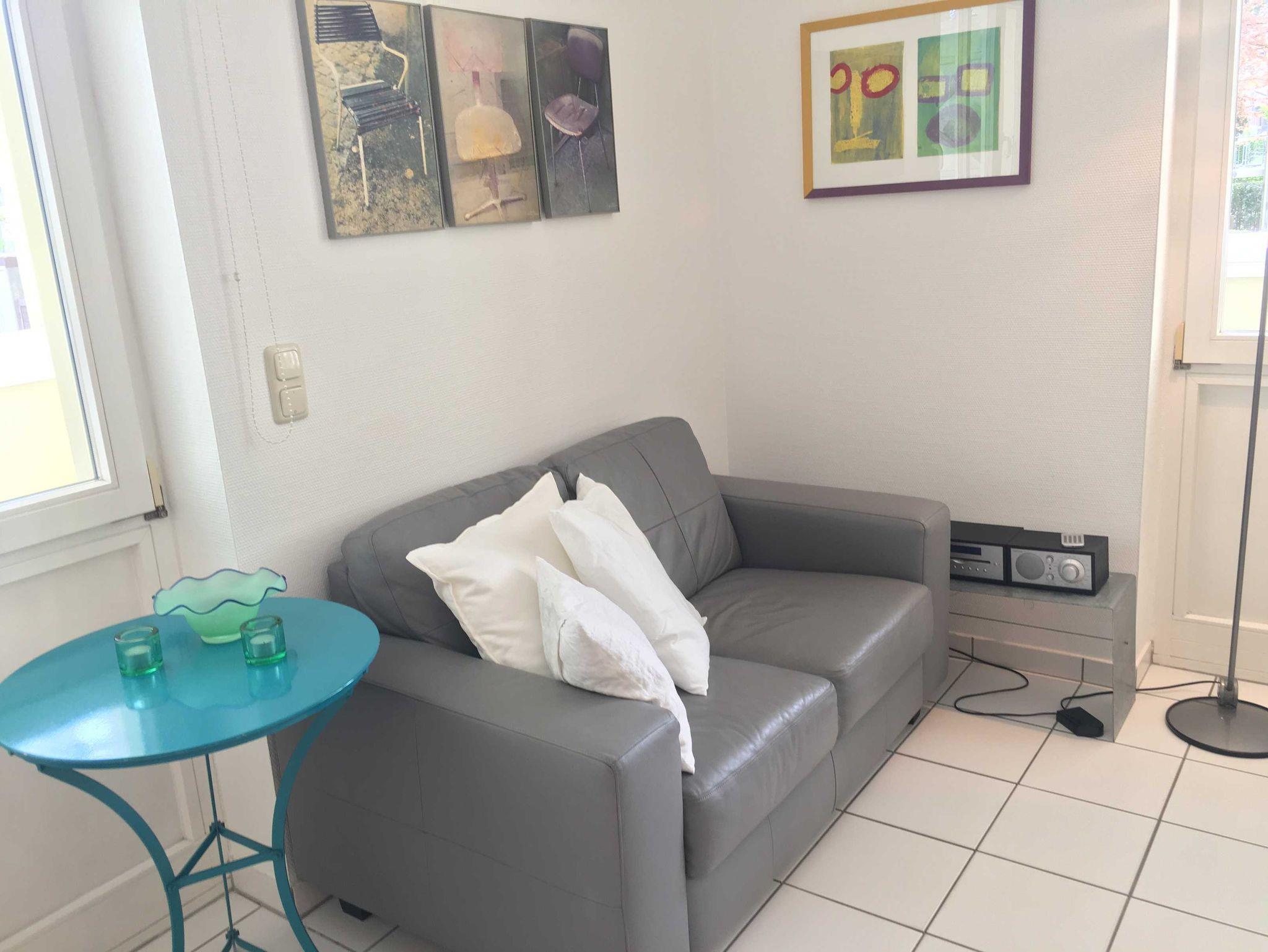 Die gemütliche 2-Raumwohnung besteht aus einem Wohn-Esszimmer mit einer 2er-Couch, TV, kleinem Esstisch und moderner Wohnküche. Das Schlafzimmer hat 2 Einzelbetten und einen kleinen Kleiderschrank.