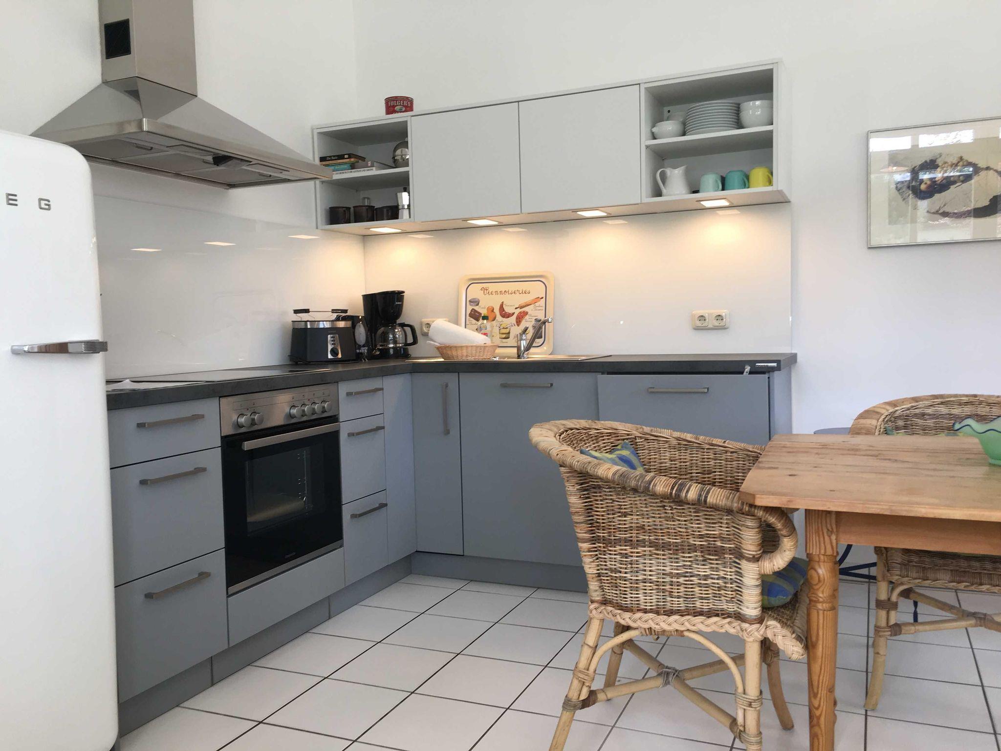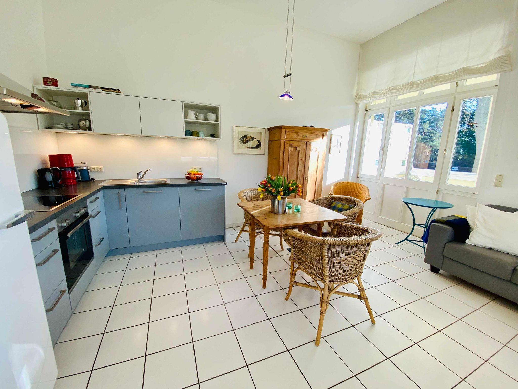 Zur Wohnung gehört ein kleines Bad mit Dusche. Die Wohnung ist mit mit 2 großen Balkonen, von denen 1 mit teilw. seitlichem Seeblick u. der Südbalkon mit eigenem Strandkorb ausgestattet.