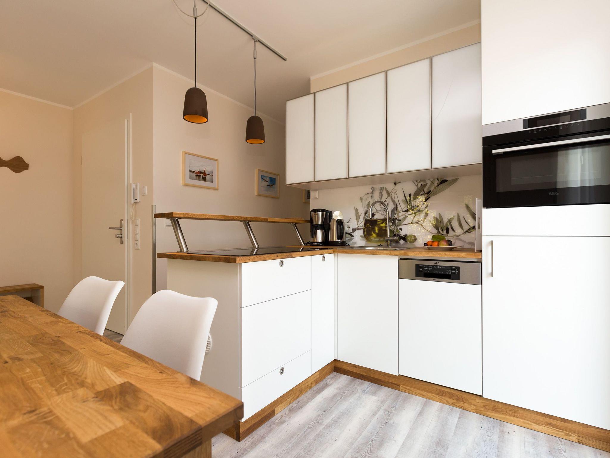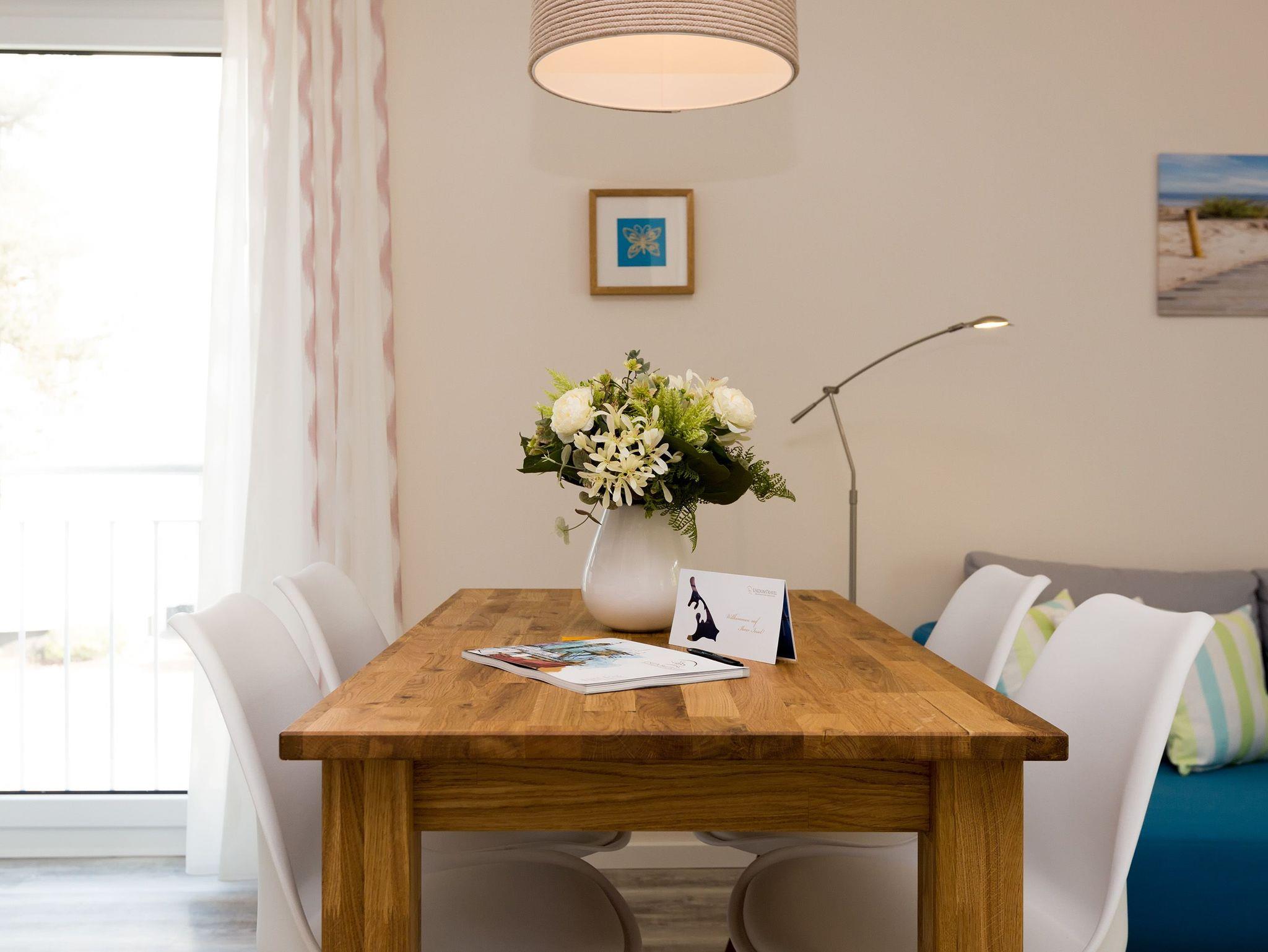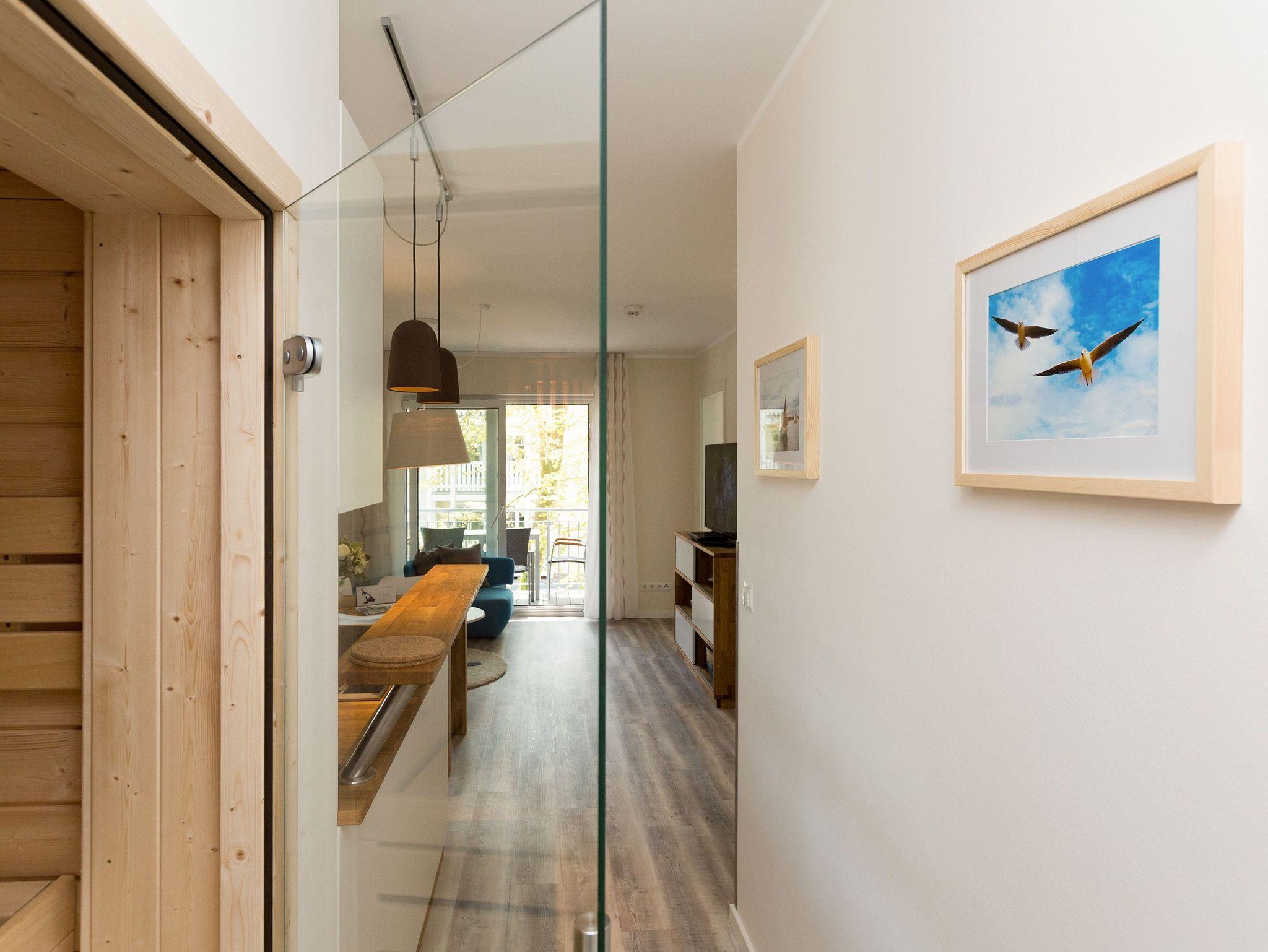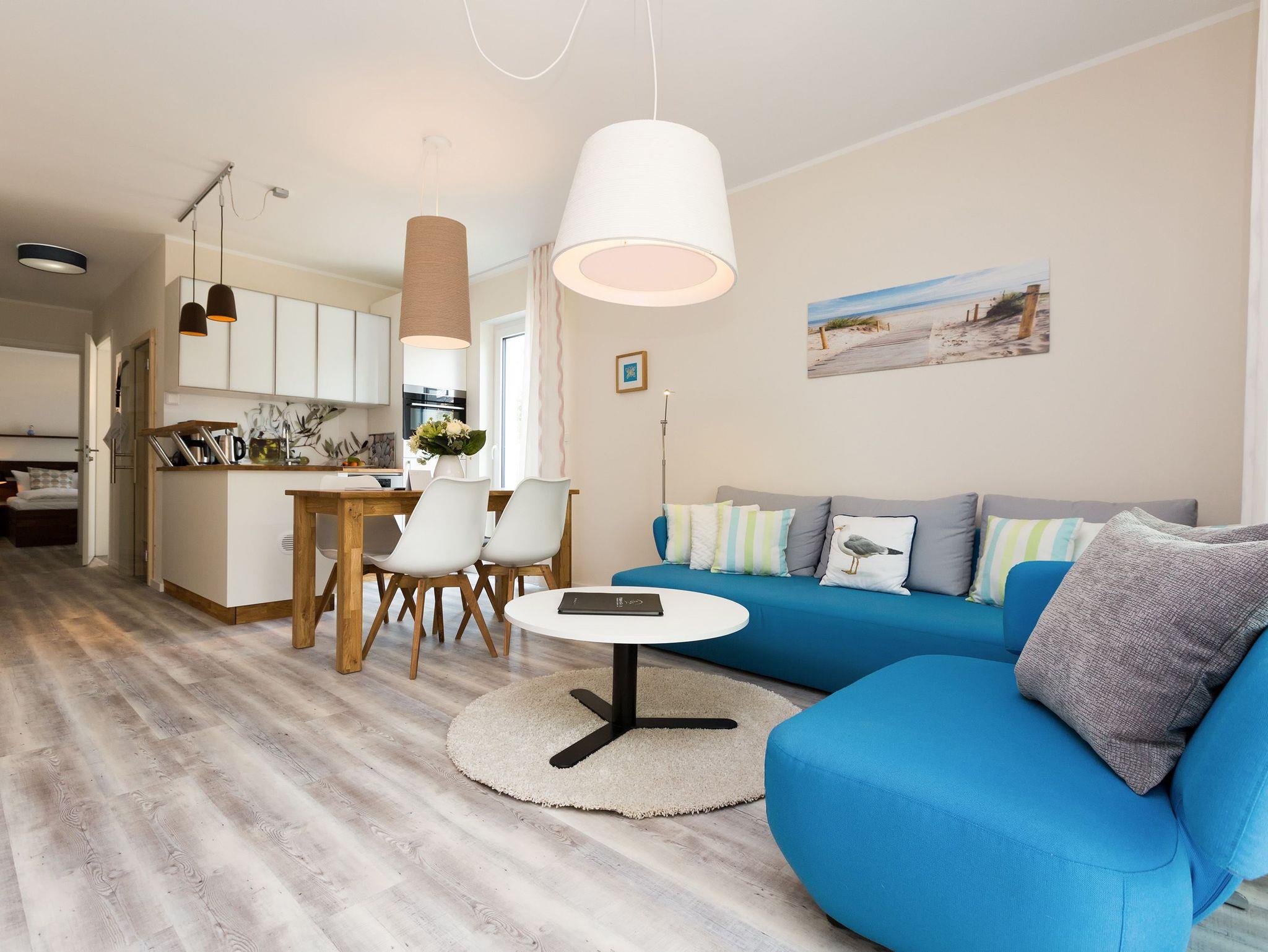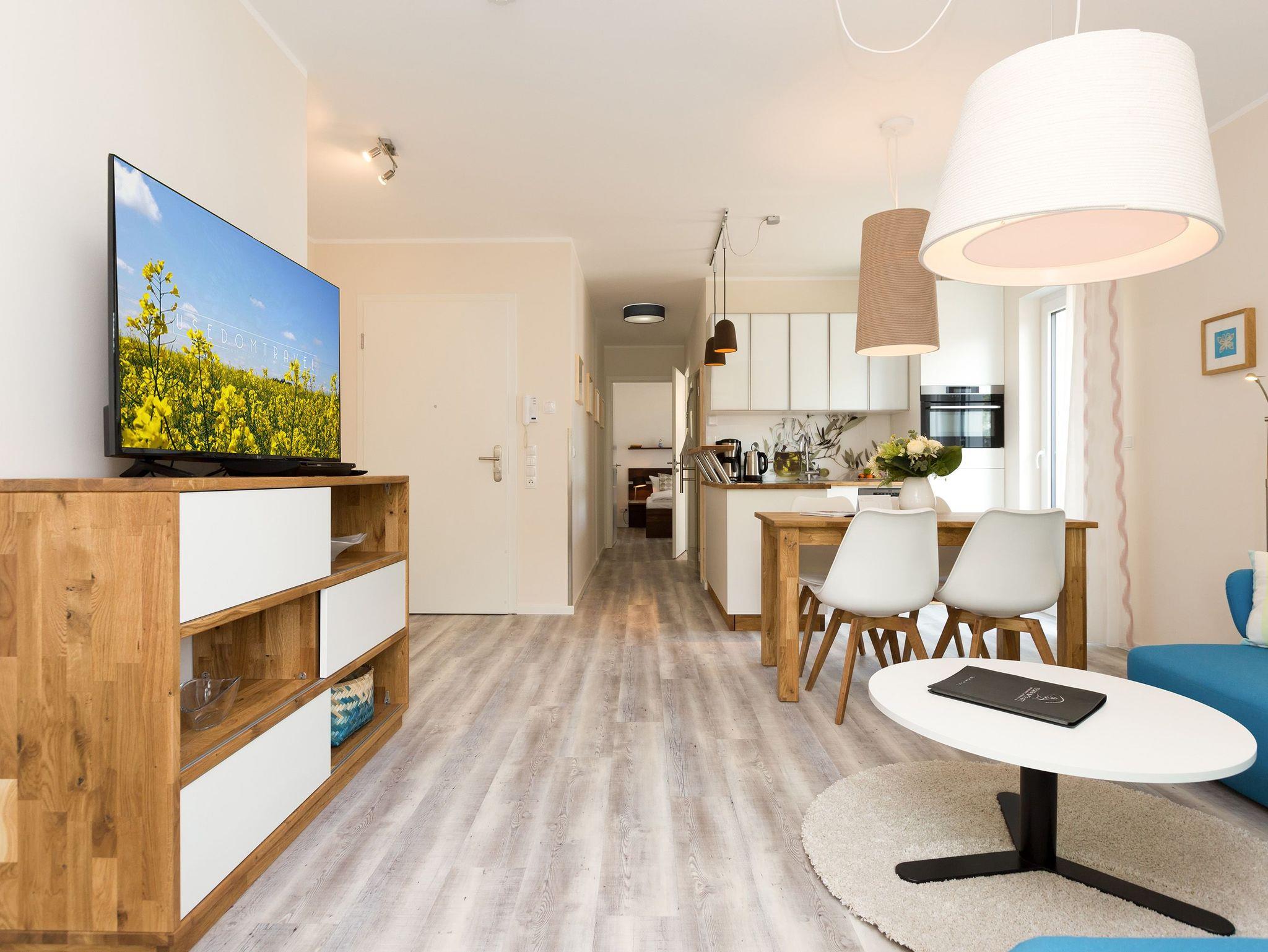 Urlaubsfeeling zum Wohlfühlen. Unsere neue 3-Raum-Ferienwohnung (62 qm) im 1.Obergeschoss der Dünenresidenz empfängt Sie mit hellen Farben und liebevollen Dekorationen. Wertige Einbauten aus Eiche [&] Akazie und eine gelungene Raumaufteilung schaffen hier ein schönes Urlaubziel für 4 Personen und ein Kleinkind bis 3 Jahre (als Aufbettung im Babyreisebett). Schon beim Eintreten offeriert sich der helle Wohnbereich, ausgestattet mit einer modernen Sitzgruppe und Flat-TV. Die angrenzende, offene Küche mit Essplatz fügt sich harmonisch ein und ist natürlich komplett ausgestattet. Zwei Schlafzimmer mit jeweils eigenem Bad bieten einen idealen Rückzugsort. Das erste Schlafzimmer verfügt über ein komfortables Doppelbett mit Bettkasten (1,80m x 2,00m) und Flat-TV, ein kleines Duschbad und Zugang zum Balkon. Das zweite Schlafzimmer wartet mit einem bequemen Doppelbett (1,60m x 2,00m) und Flat-TV auf, angrenzend gibt es hier ein Bad mit Dusche und WC. Klein aber fein, die wohnungseigene Sauna bietet nicht nur in der kalten Jahreszeit eine erholsame Abwechslung. Die Usedomer Sonne und das Meeresrauschen genießen Sie schon beim Frühstück auf dem Ostbalkon, ausgestattet mit Gartenmöbeln. Hier kann man bei ein bisschen Meerblick wunderbar Relaxen. Für Ihren Komfort sind die Betten bei der Anreise bezogen und Handtücher liegen bereit. Ein Pkw-Stellplatz steht in der Tiefgarage zur Verfügung (max. Einfahrtshöhe 1,93 m). Das Wlan-Netz kann kostenlos genutzt werden.