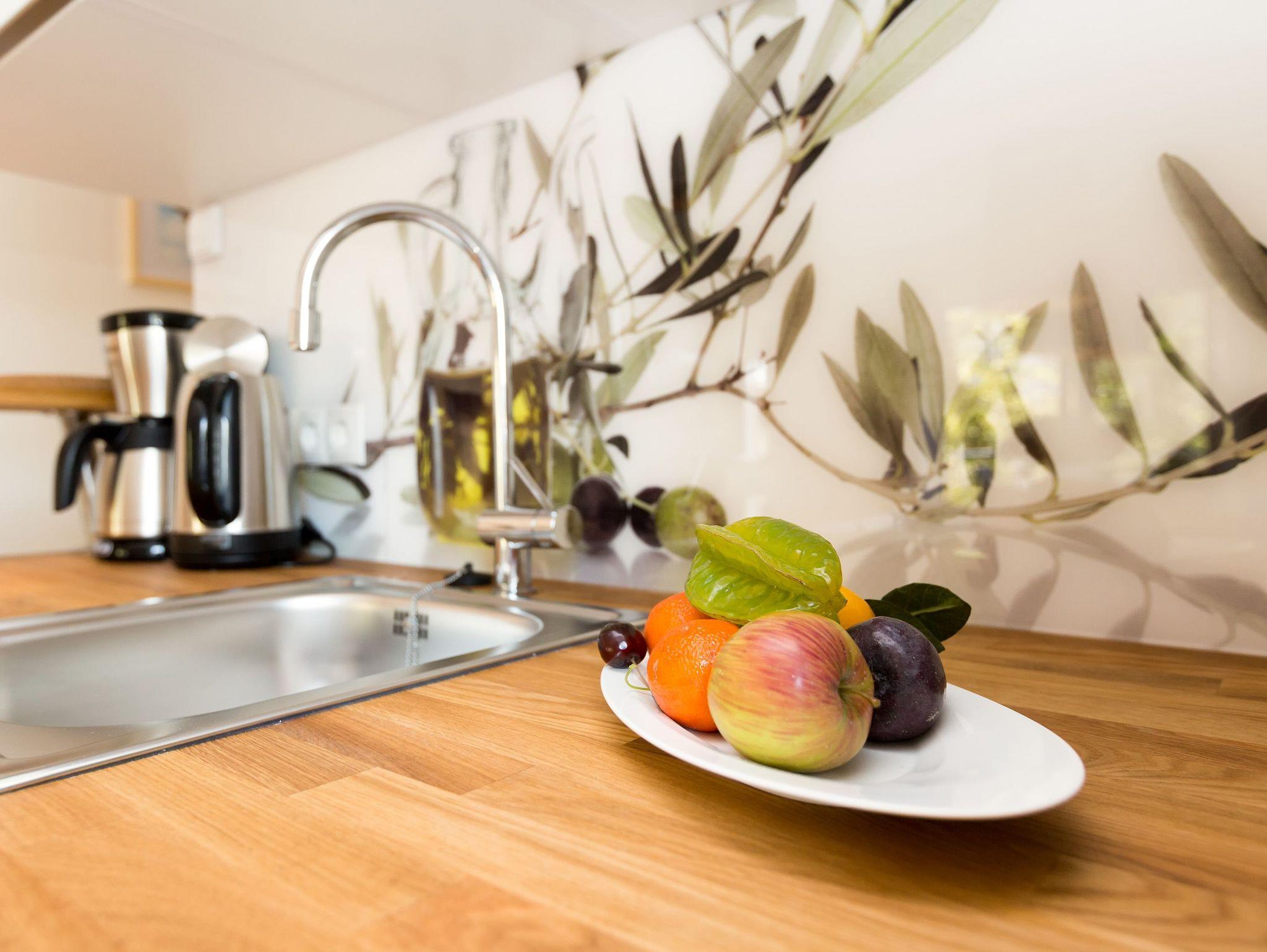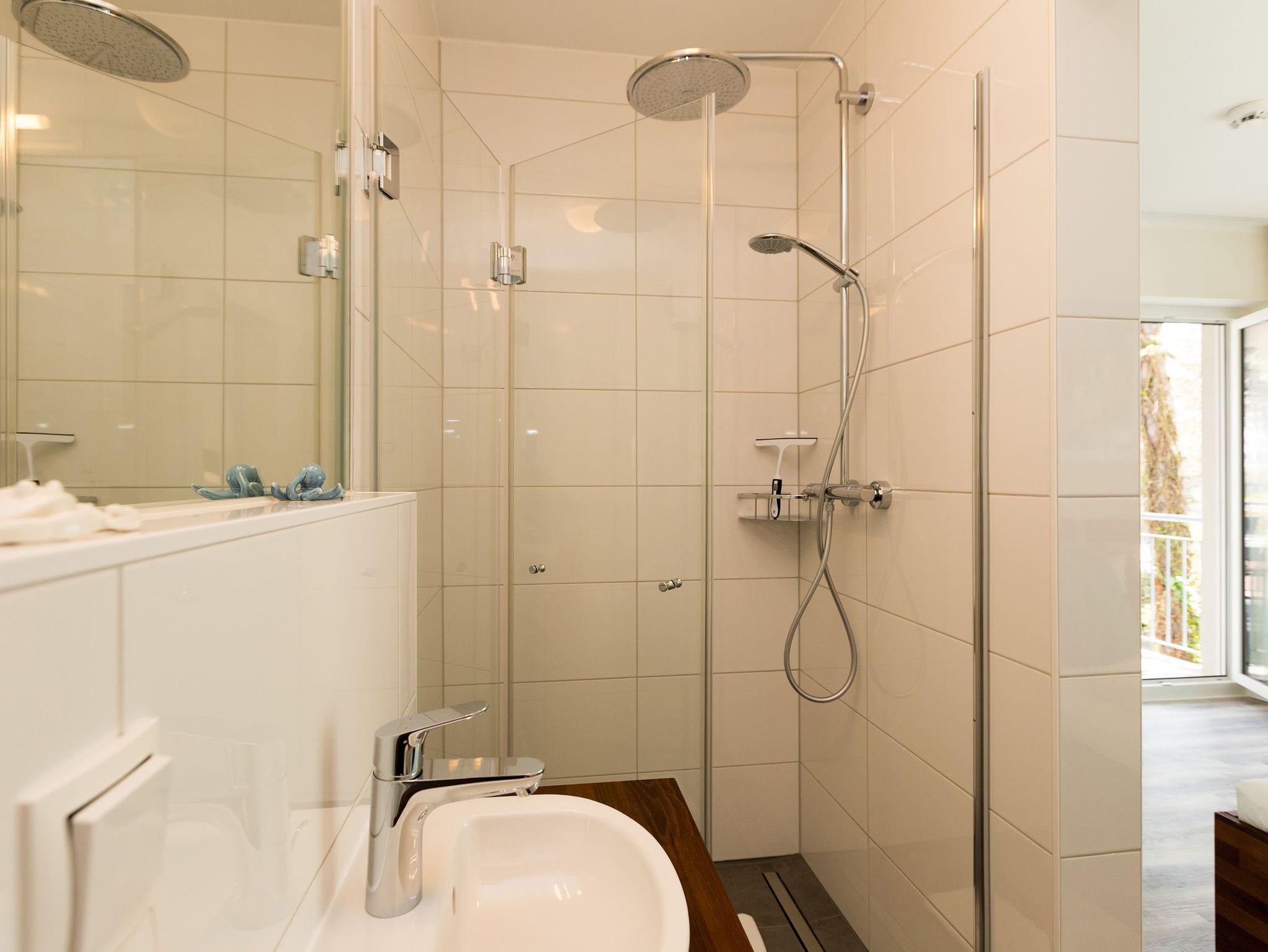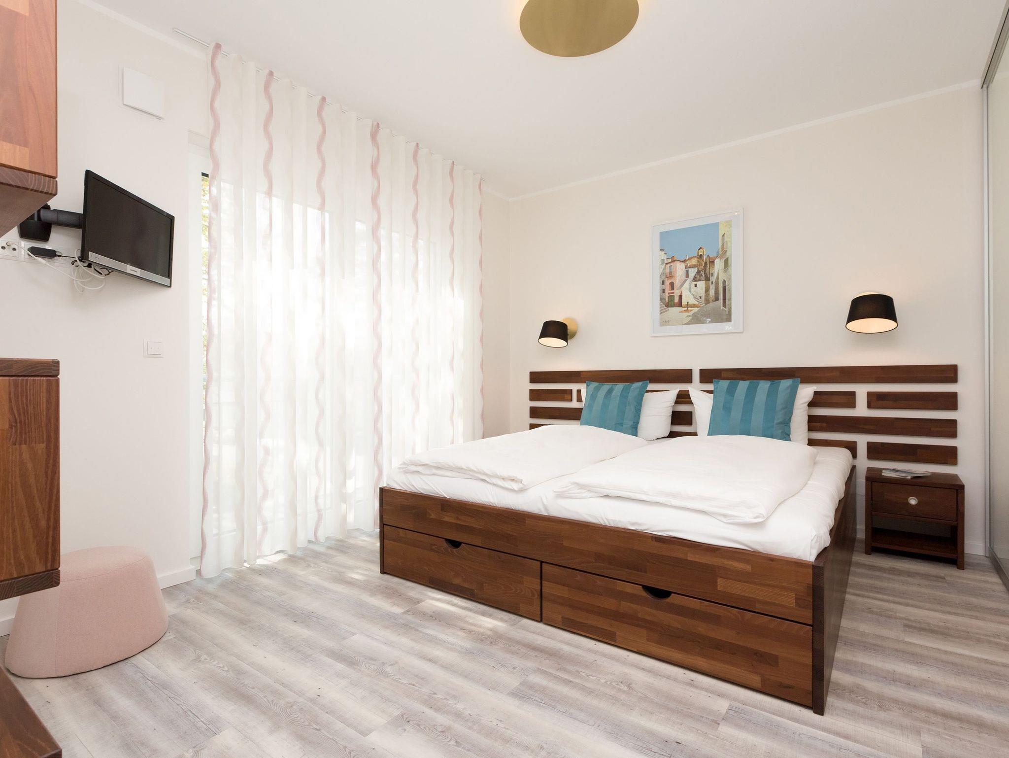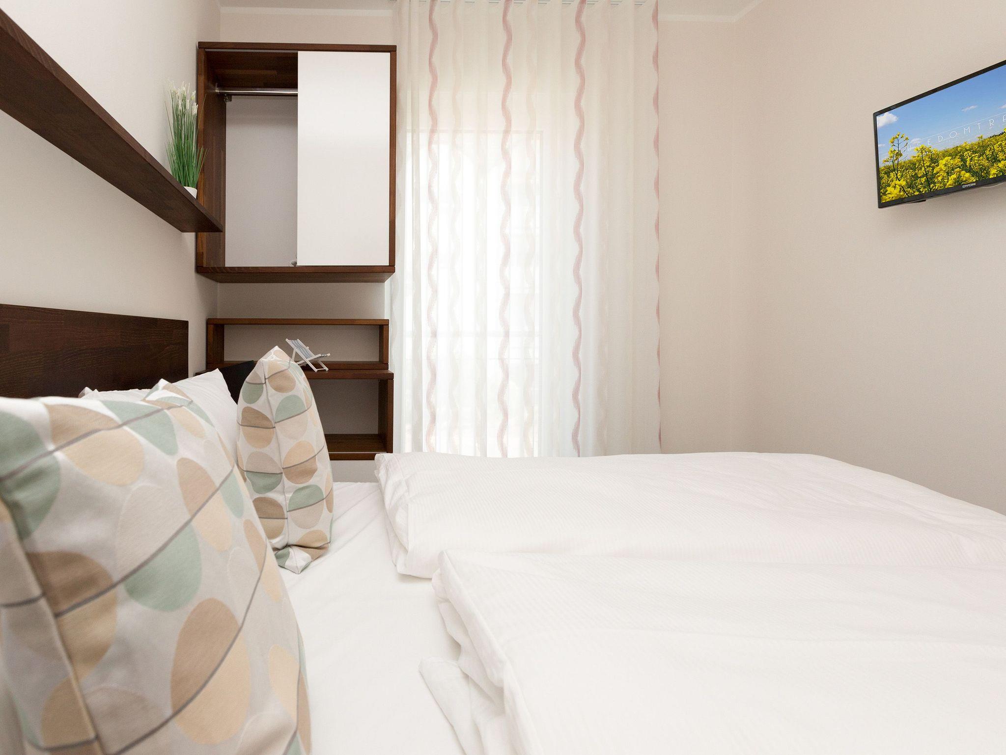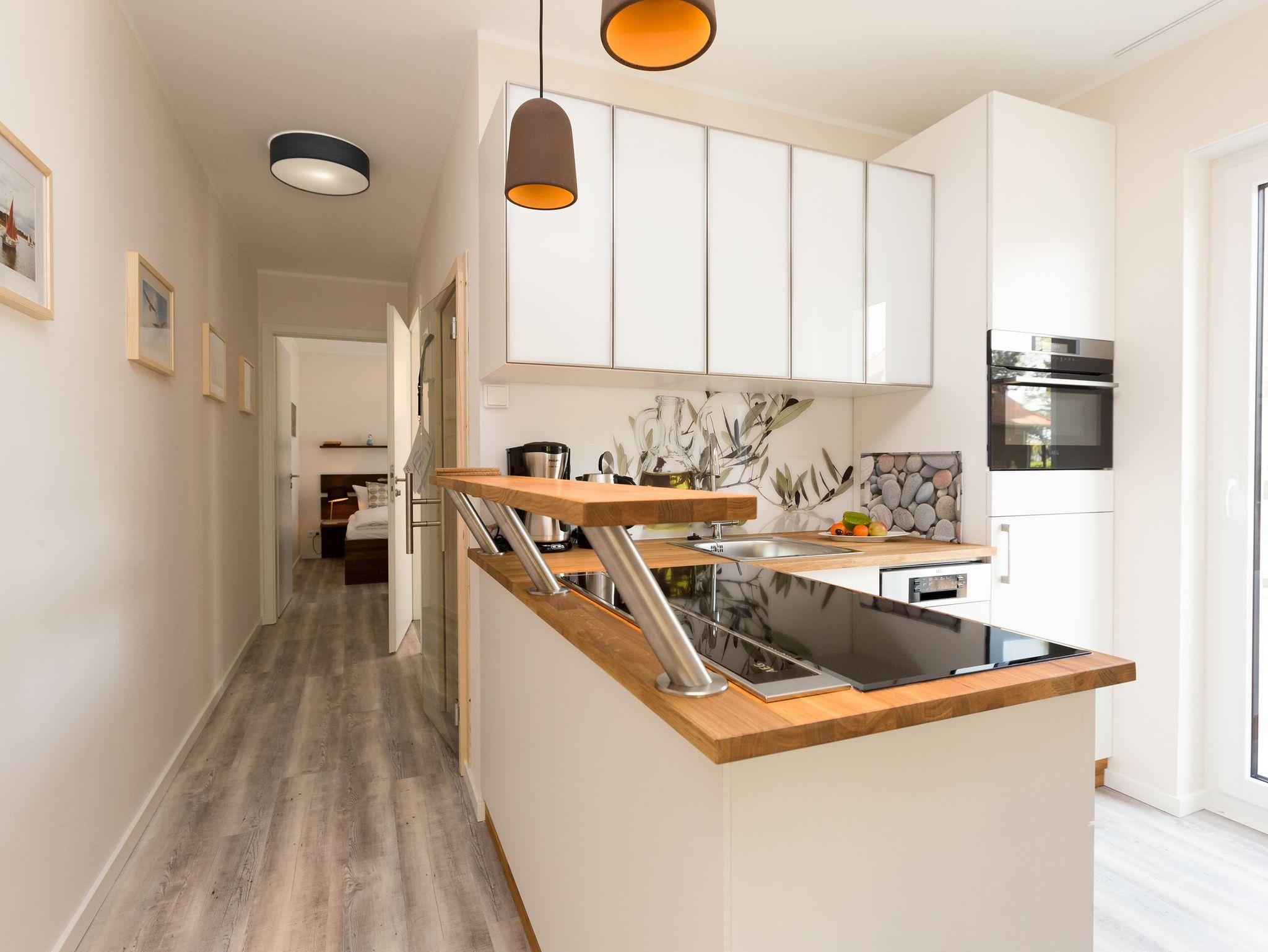 Urlaubsfeeling zum Wohlfühlen. Unsere neue 3-Raum-Ferienwohnung (62 qm) im 1.Obergeschoss der Dünenresidenz empfängt Sie mit hellen Farben und liebevollen Dekorationen. Wertige Einbauten aus Eiche [&] Akazie und eine gelungene Raumaufteilung schaffen hier ein schönes Urlaubziel für 4 Personen und ein Kleinkind bis 3 Jahre (als Aufbettung im Babyreisebett). Schon beim Eintreten offeriert sich der helle Wohnbereich, ausgestattet mit einer modernen Sitzgruppe und Flat-TV. Die angrenzende, offene Küche mit Essplatz fügt sich harmonisch ein und ist natürlich komplett ausgestattet. Zwei Schlafzimmer mit jeweils eigenem Bad bieten einen idealen Rückzugsort. Das erste Schlafzimmer verfügt über ein komfortables Doppelbett mit Bettkasten (1,80m x 2,00m) und Flat-TV, ein kleines Duschbad und Zugang zum Balkon. Das zweite Schlafzimmer wartet mit einem bequemen Doppelbett (1,60m x 2,00m) und Flat-TV auf, angrenzend gibt es hier ein Bad mit Dusche und WC. Klein aber fein, die wohnungseigene Sauna bietet nicht nur in der kalten Jahreszeit eine erholsame Abwechslung. Die Usedomer Sonne und das Meeresrauschen genießen Sie schon beim Frühstück auf dem Ostbalkon, ausgestattet mit Gartenmöbeln. Hier kann man bei ein bisschen Meerblick wunderbar Relaxen. Für Ihren Komfort sind die Betten bei der Anreise bezogen und Handtücher liegen bereit. Ein Pkw-Stellplatz steht in der Tiefgarage zur Verfügung (max. Einfahrtshöhe 1,93 m). Das Wlan-Netz kann kostenlos genutzt werden.