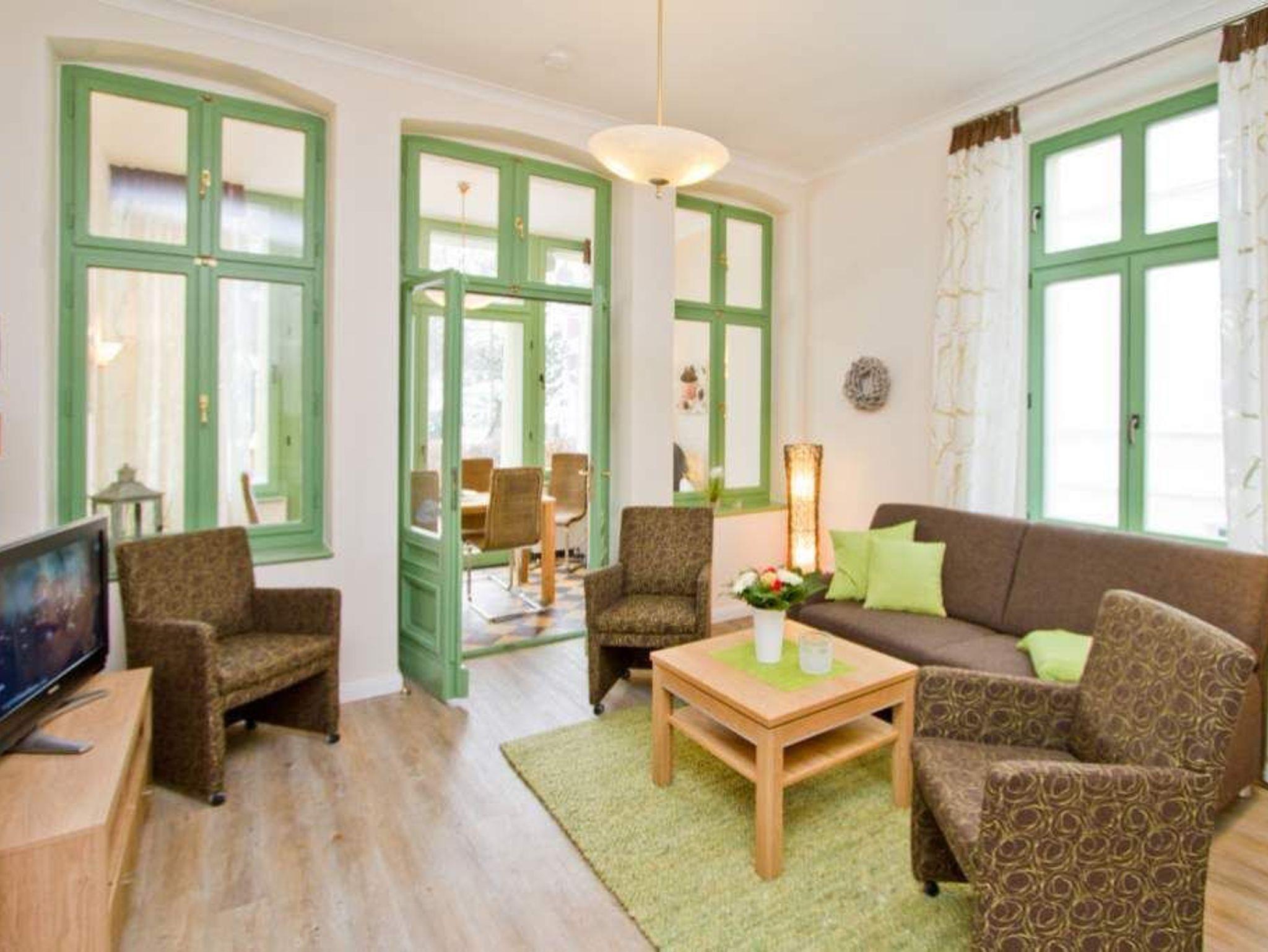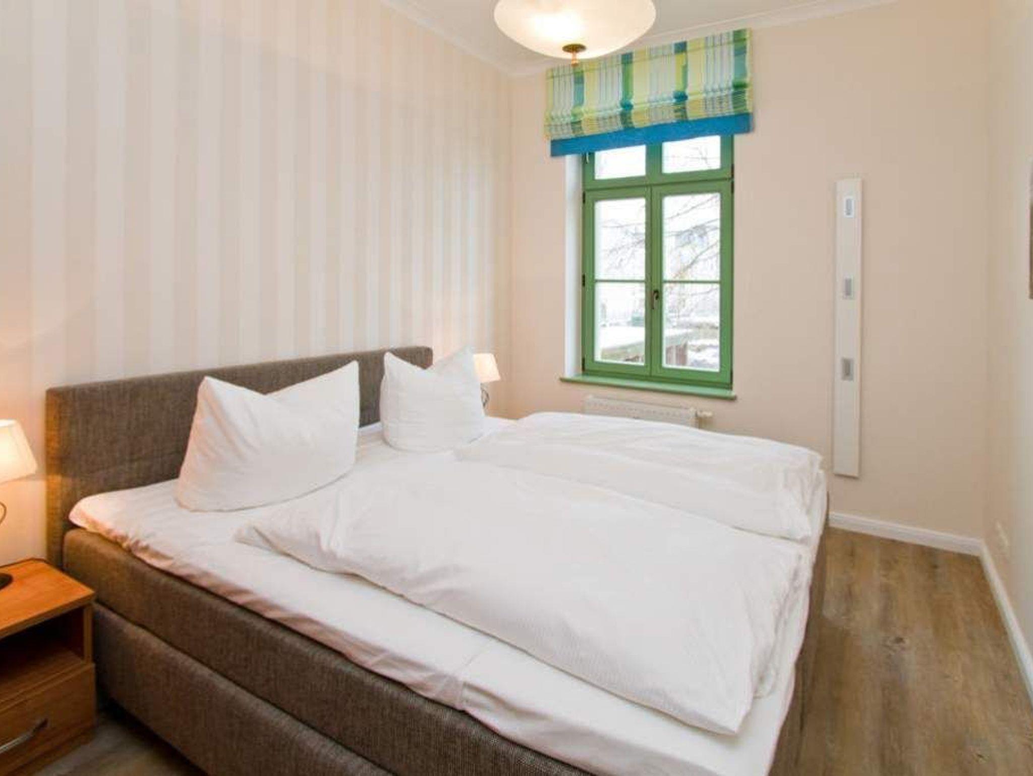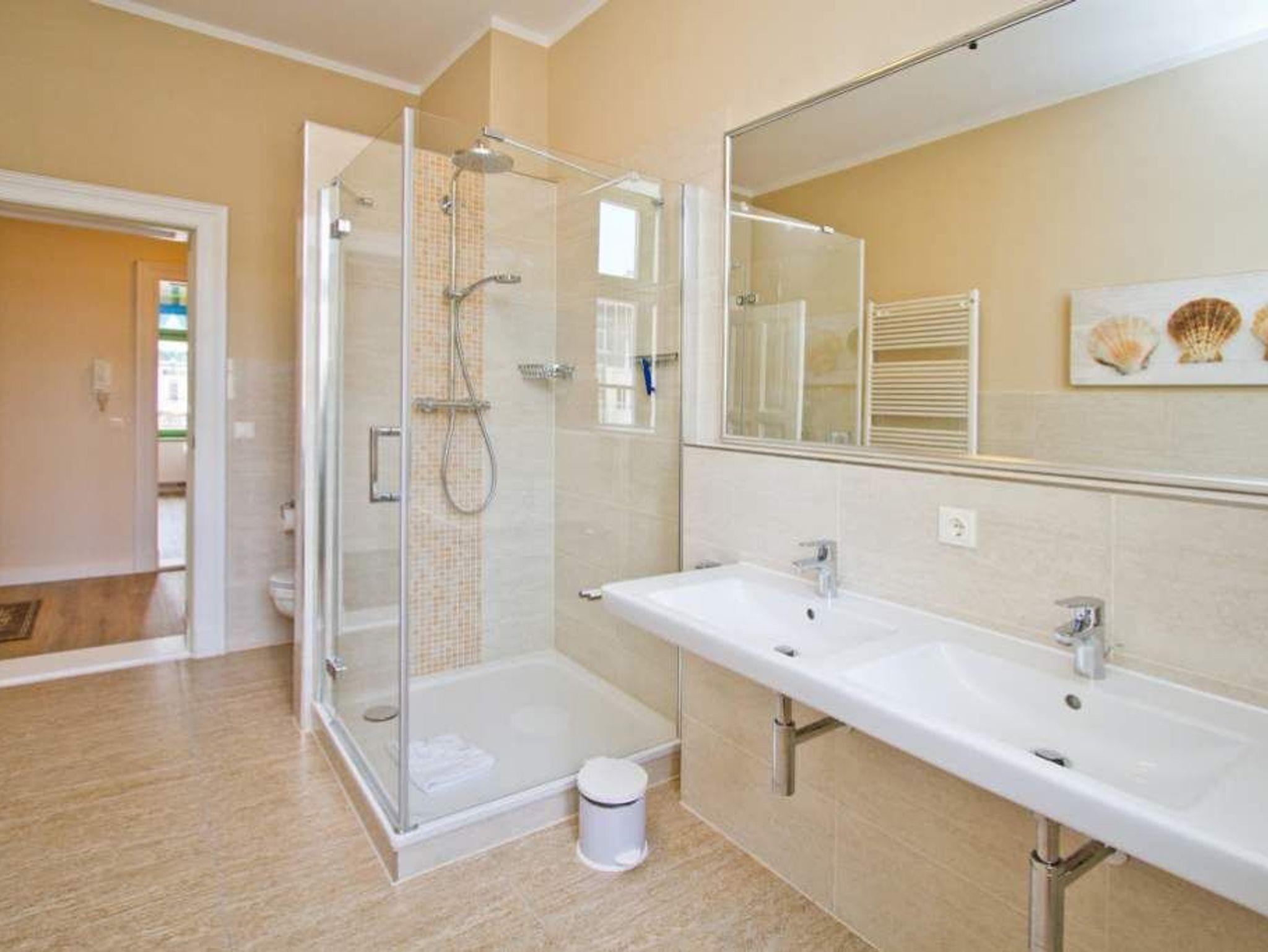 Viel Raum und zeitlos, moderne Eleganz sind hier der Garant für einen komfortablen Urlaub. Die großzügige, im klassischen Interieur eingerichtete 4-Raum-Ferienwohnung bietet bis zu 6 Personen und einem Kleinkind (bis 3 Jahre) Platz zum Relaxen. Dieses Domizil bietet Ihnen einen Wohnbereich mit einer komplett ausgestatteten Küchenzeile, eine Veranda mit Essbereich, von der Sie Zugang auf Ihre eigene Terrasse haben. Ein großes Badezimmer mit großer Dusche und Doppelwaschtisch sind hier genauso selbstverständlich wie ein zusätzliches Gäste-WC. Für einen geruhsamen Schlaf finden Sie hier 3 Schlafzimmer mit bequemen Boxspringbetten (zweimal Doppelbett und einmal Einzelbetten) von denen zwei ein zusätzliches TV-Gerät haben. Das WLAN-Netz kann kostenfrei genutzt werden. Für Ihren Komfort ist die Erstausstattung Wäsche für Sie bezogen. Auf Wunsch stellen wir für unsere kleinen Gäste ein Kinderreisebett (ohne zusätzliche Matratze [&] Bettzeug) und einen Kinderhochstuhl ( gegen einen Aufpreis) zur Verfügung.
