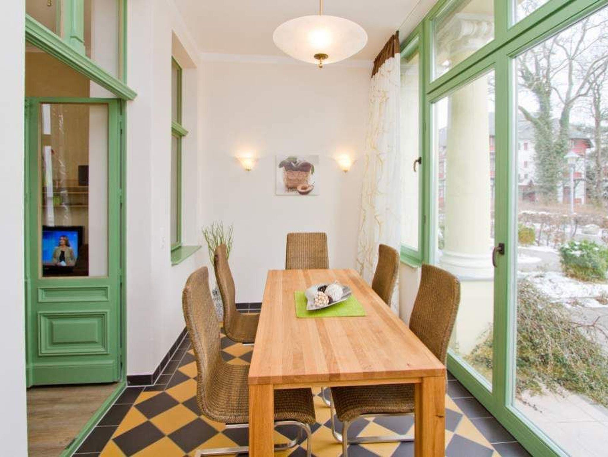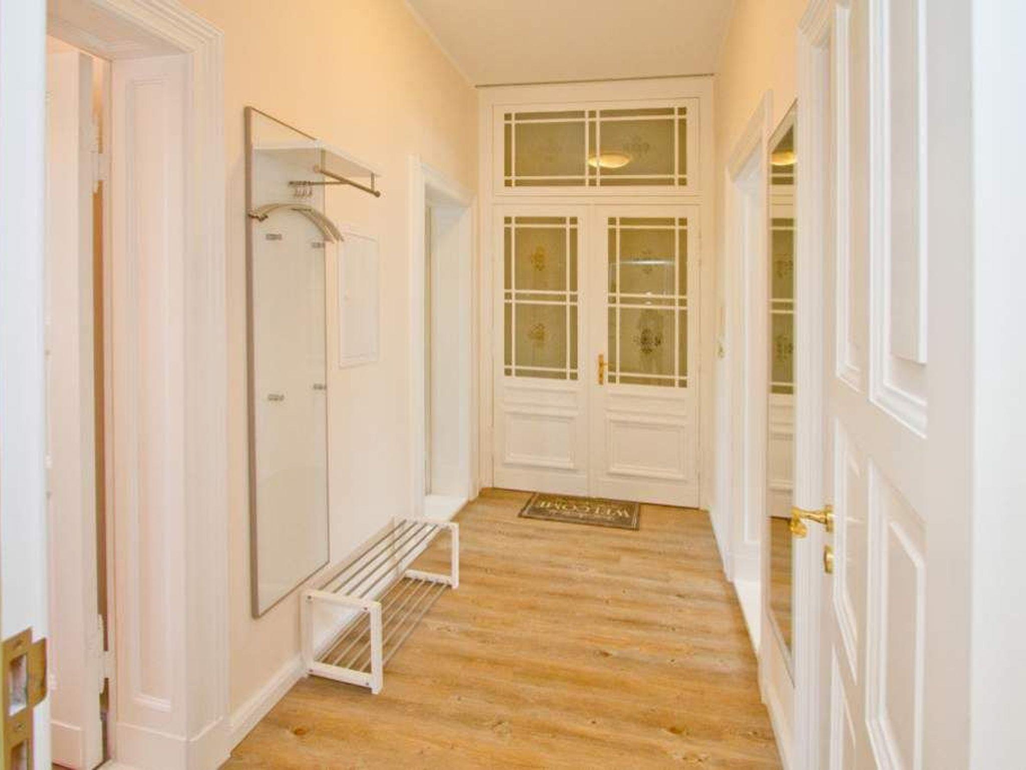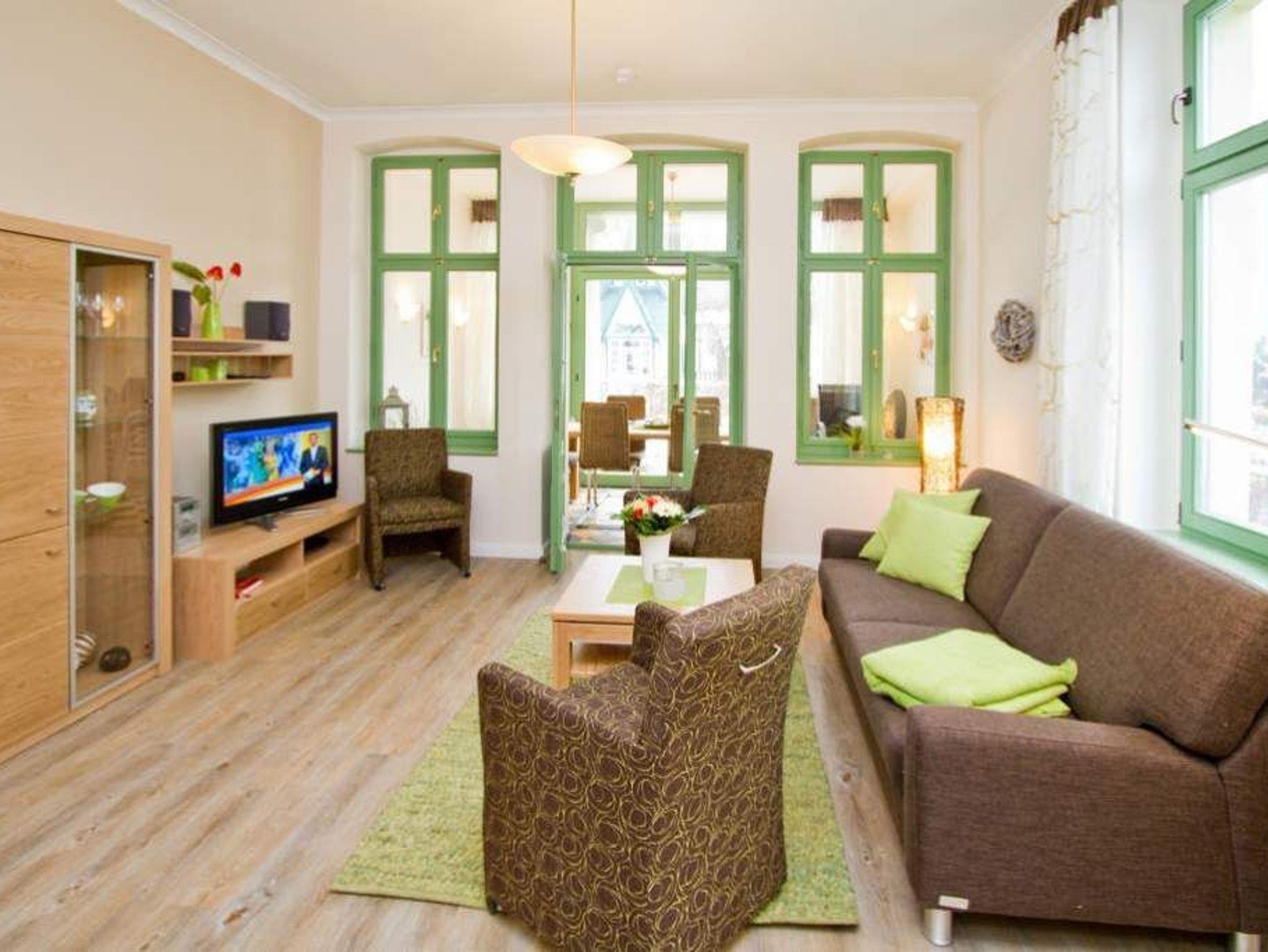 Viel Raum und zeitlos, moderne Eleganz sind hier der Garant für einen komfortablen Urlaub. Die großzügige, im klassischen Interieur eingerichtete 4-Raum-Ferienwohnung bietet bis zu 6 Personen und einem Kleinkind (bis 3 Jahre) Platz zum Relaxen. Dieses Domizil bietet Ihnen einen Wohnbereich mit einer komplett ausgestatteten Küchenzeile, eine Veranda mit Essbereich, von der Sie Zugang auf Ihre eigene Terrasse haben. Ein großes Badezimmer mit großer Dusche und Doppelwaschtisch sind hier genauso selbstverständlich wie ein zusätzliches Gäste-WC. Für einen geruhsamen Schlaf finden Sie hier 3 Schlafzimmer mit bequemen Boxspringbetten (zweimal Doppelbett und einmal Einzelbetten) von denen zwei ein zusätzliches TV-Gerät haben. Das WLAN-Netz kann kostenfrei genutzt werden. Für Ihren Komfort ist die Erstausstattung Wäsche für Sie bezogen. Auf Wunsch stellen wir für unsere kleinen Gäste ein Kinderreisebett (ohne zusätzliche Matratze [&] Bettzeug) und einen Kinderhochstuhl ( gegen einen Aufpreis) zur Verfügung.