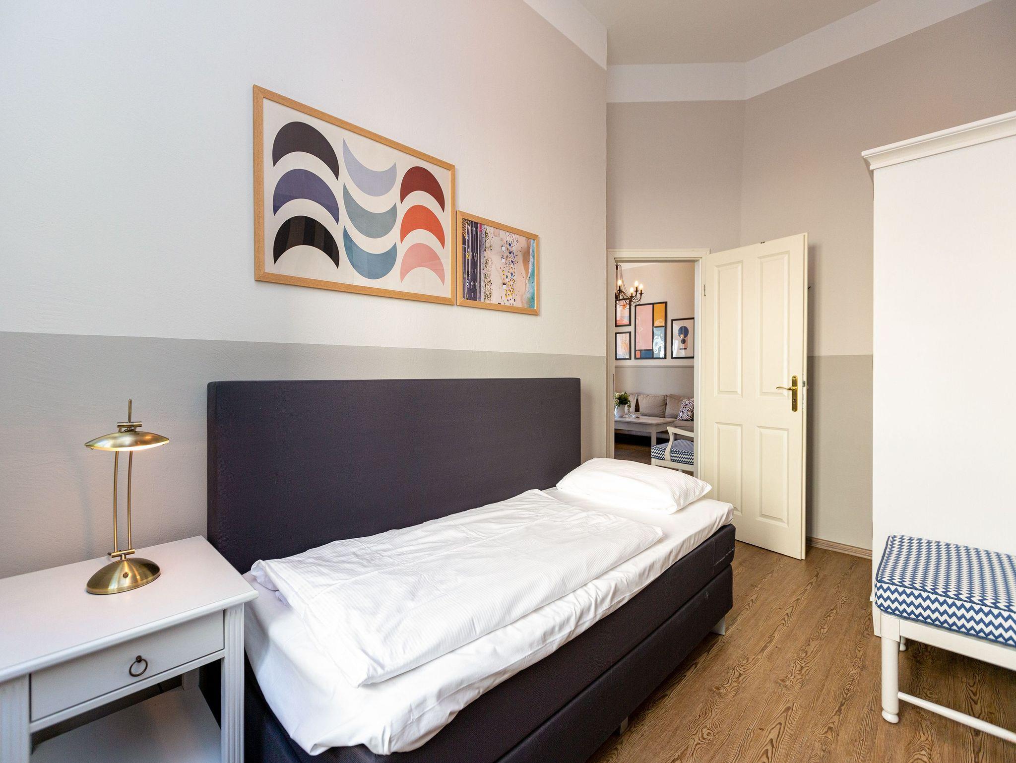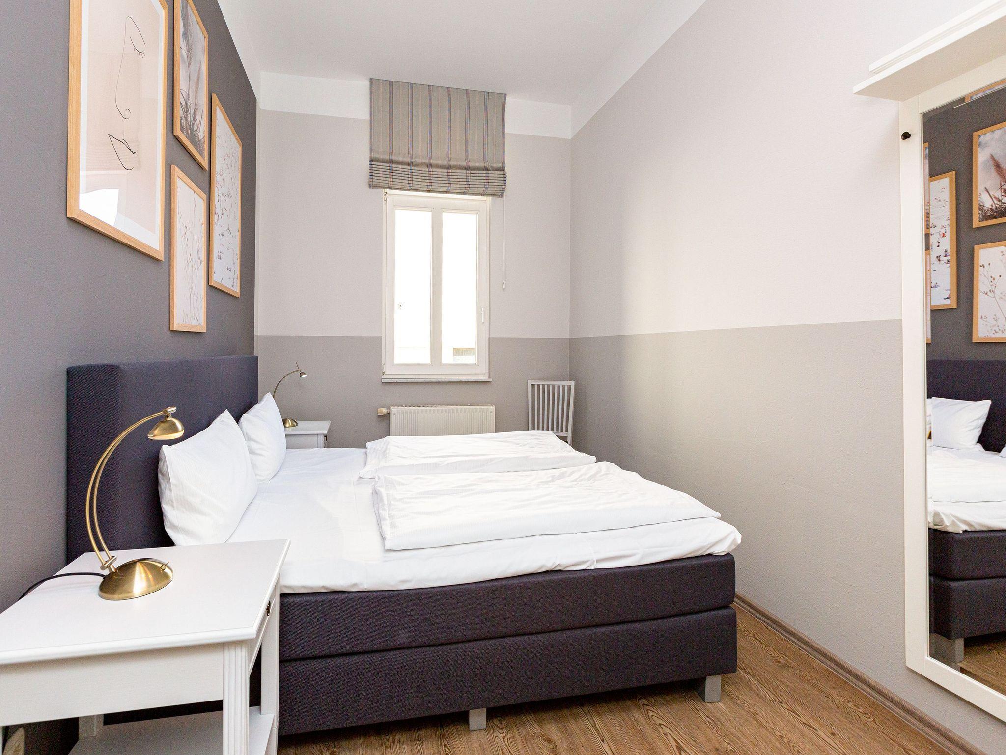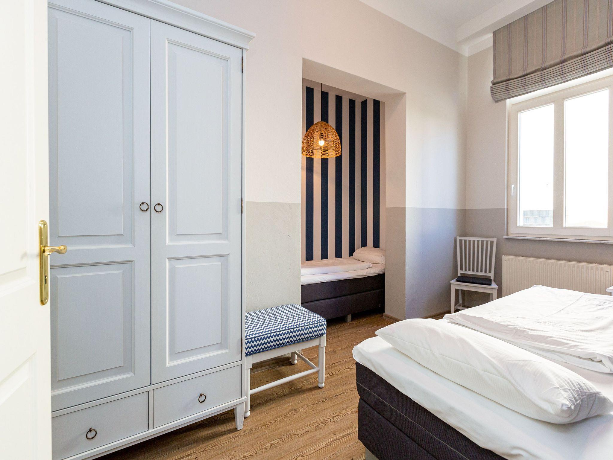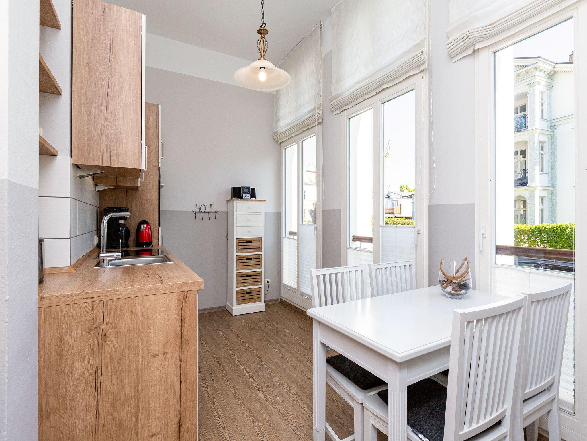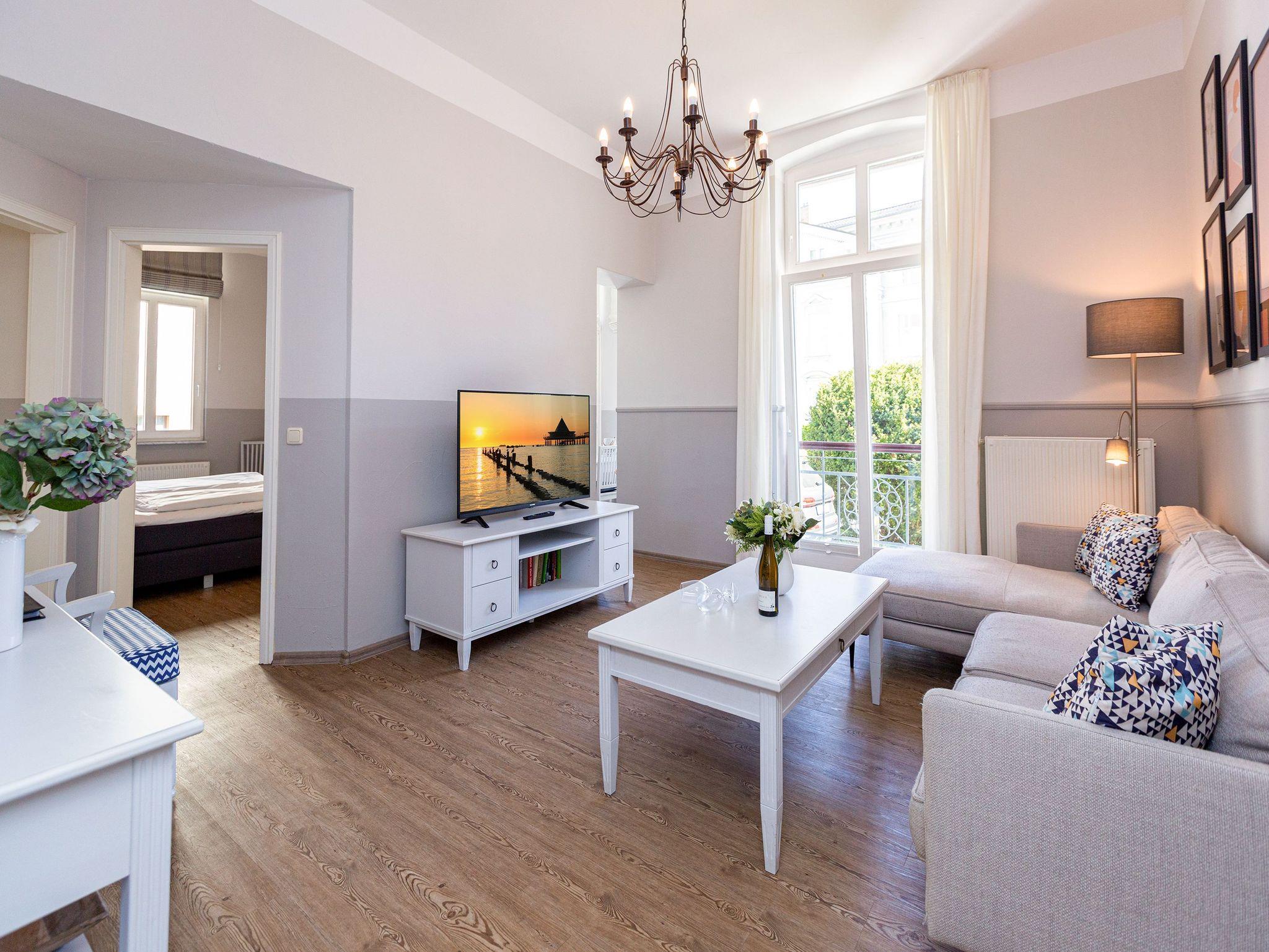 Luftige Leichtigkeit und viel Platz zum Durchatmen ? danach sehnt sich die urlaubsreife Seele. Und genau das bekommt sie in diesem schönen, lichtdurchfluteten Drei-Zimmer-Appartement im Hochparterre der sanierten Bädervilla Amelia. Ein Hauch kaiserzeitliche Noblesse durchweht die wunderbar hohen Räume des Altbaus. Bis zu vier Personen können in den 50 Quadratmetern gemeinsam Urlauben. Und ihr geliebtes Haustier dürfen Sie hier gerne mitbringen. Die Einrichtung ist sehr stilvoll. Im Wohnzimmer lädt eine stylische Vintage-Sitzgruppe zum Entspannen ein. Ein großer Flat-TV sorgt für Unterhaltung. Die in hellen Tönen gehaltene, offene Küche ist mit allen Geräten ausgestattet, die zum Kochen benötigt werden. Ein schöner, heller Essplatz ist der ideale Ort zum gemeinsamen Essen und Erzählen. Herrliche Ruhe finden Sie in den beiden Schlafzimmern. Denn die Wohnung befindet sich in einer ruhigen Seitenstraße unweit des Strandes. Eines der beiden Schlafzimmer verfügt über ein komfortables Boxspringdoppelbett, das andere über zwei Boxspringeinzelbetten. Viel Ablagefläche finden Sie in den jeweiligen Schränken. Das Badezimmer ist mit einer Dusche, Waschtisch und WC ausgestattet. Für Ihren Komfort liegen bei der Anreise Handtücher bereit und die Betten sind bezogen. Das WLAN Netz im Haus kann kostenfrei genutzt werden. Auf Wunsch stellen wir für unsere kleinen Gäste ein Kinderreisebett (ohne zusätzliche Matratze [&] Bettzeug) und einen Kinderhochstuhl (gegen einen Aufpreis) zur Verfügung. Ein Pkw-Stellplatz befindet sich auf dem Gelände neben dem Haus.