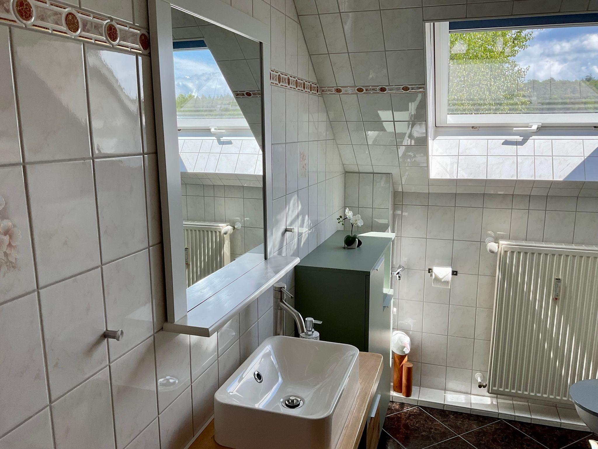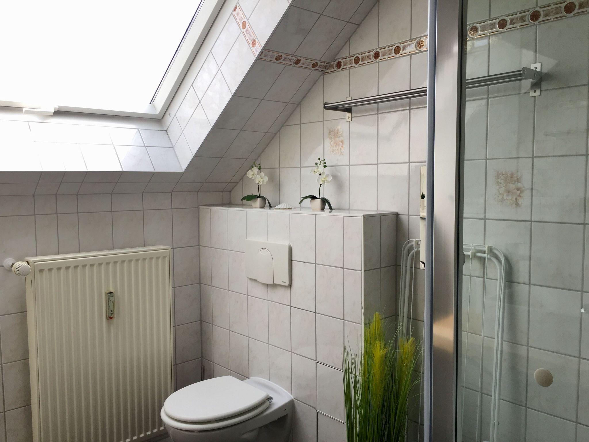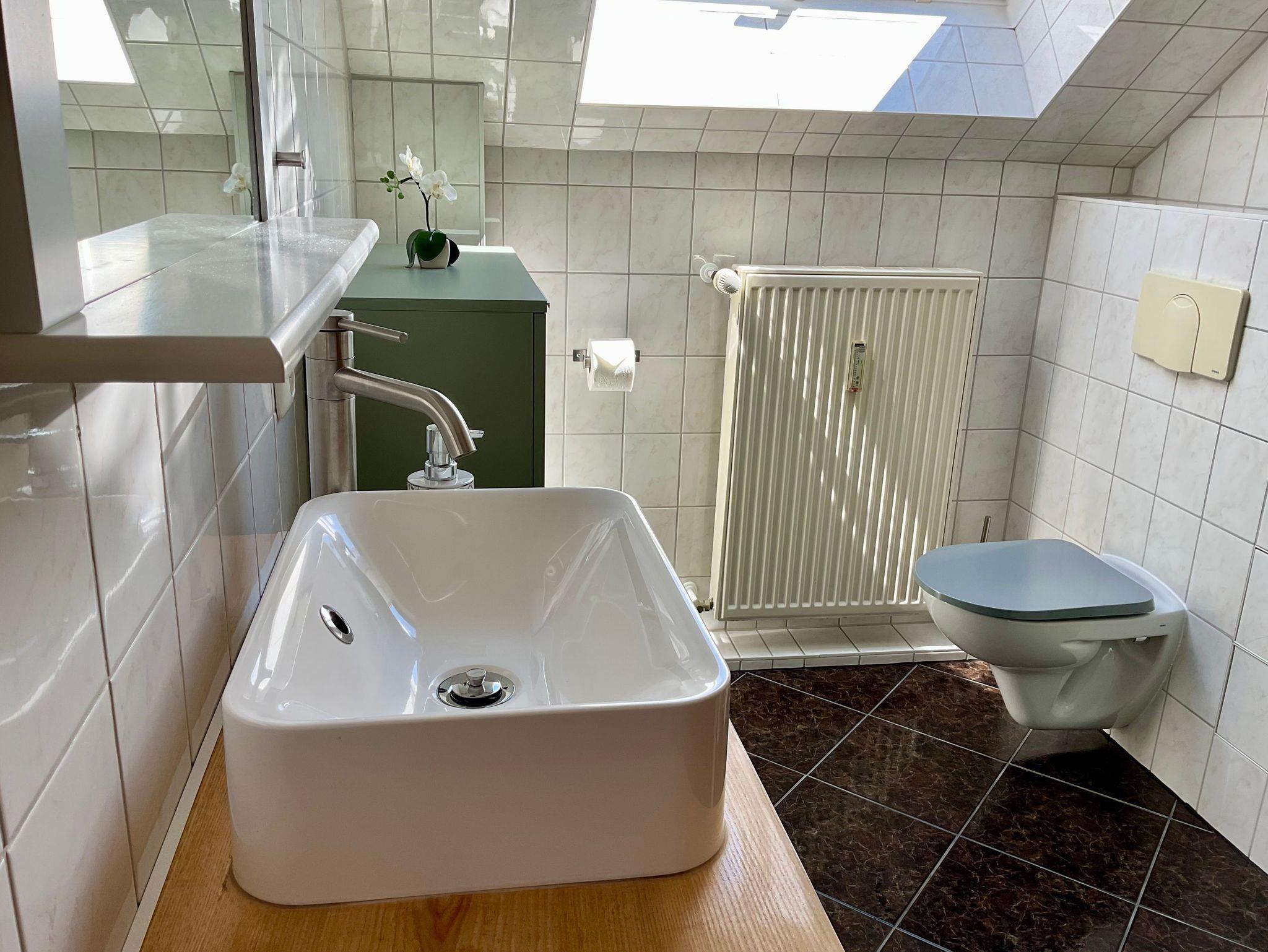 Das helle Tageslichtbad ist ausgestattet mit Dusche, Waschbecken, WC und Föhn - für einen angenehmen Start in den Urlaubstag.