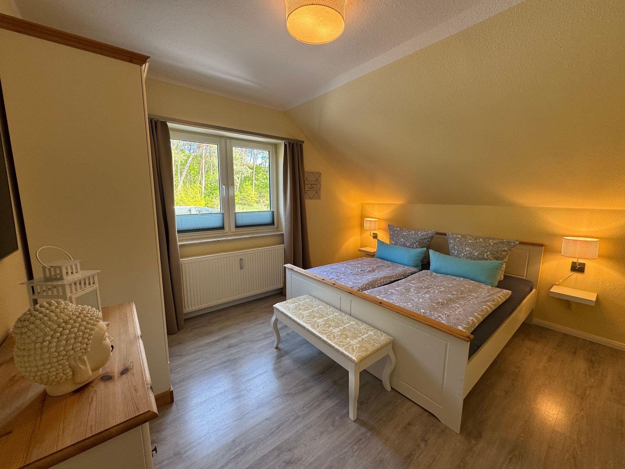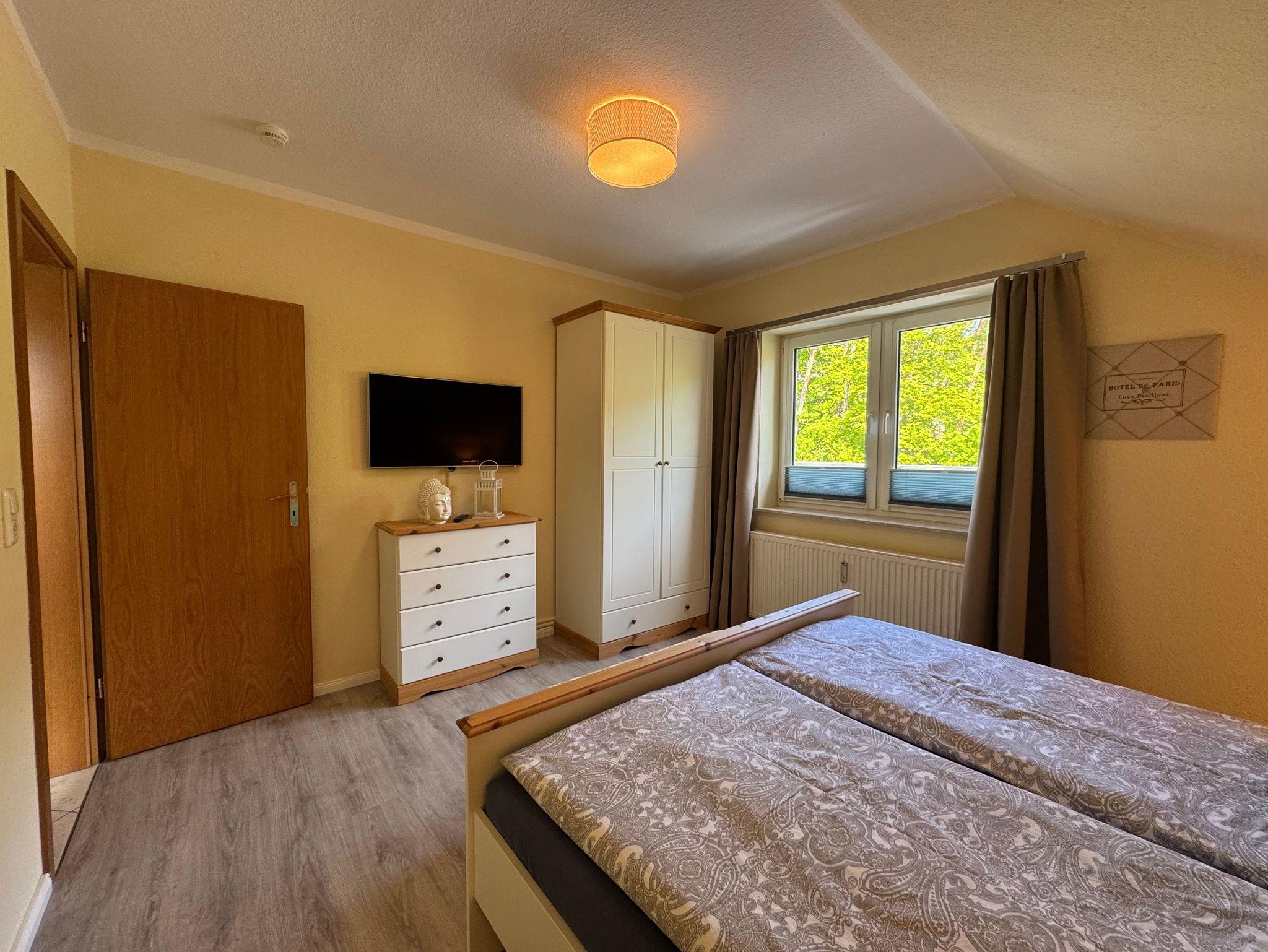 Im behaglichen Schlafzimmer erwartet Sie ein komfortables Doppelbett (180 x 200 cm), das bei Ihrer Anreise bereits frisch bezogen ist. Geräumige Schränke bieten ausreichend Platz für Ihre Urlaubsgarderobe - hier beginnt Entspannung mit dem ersten Moment.