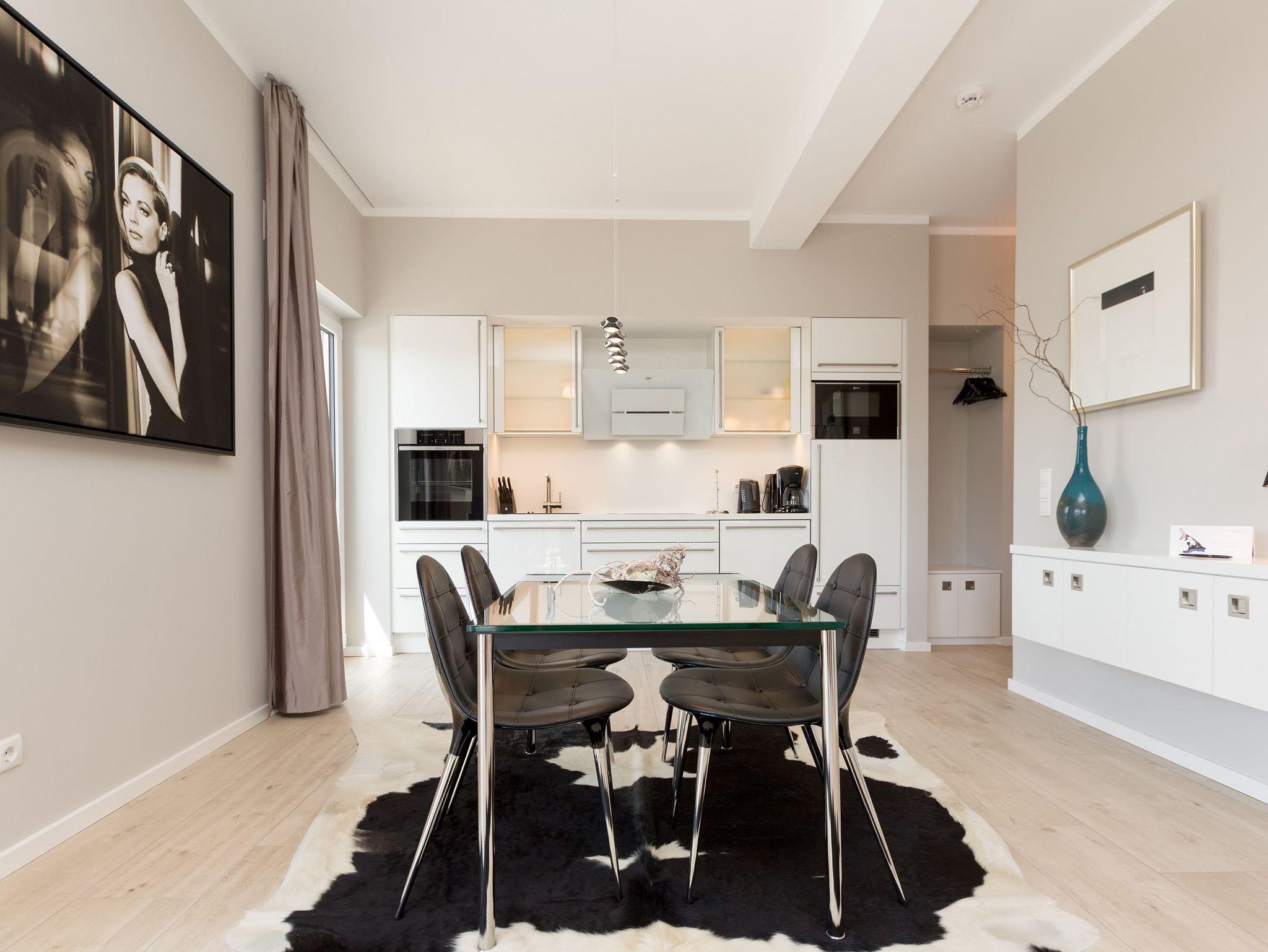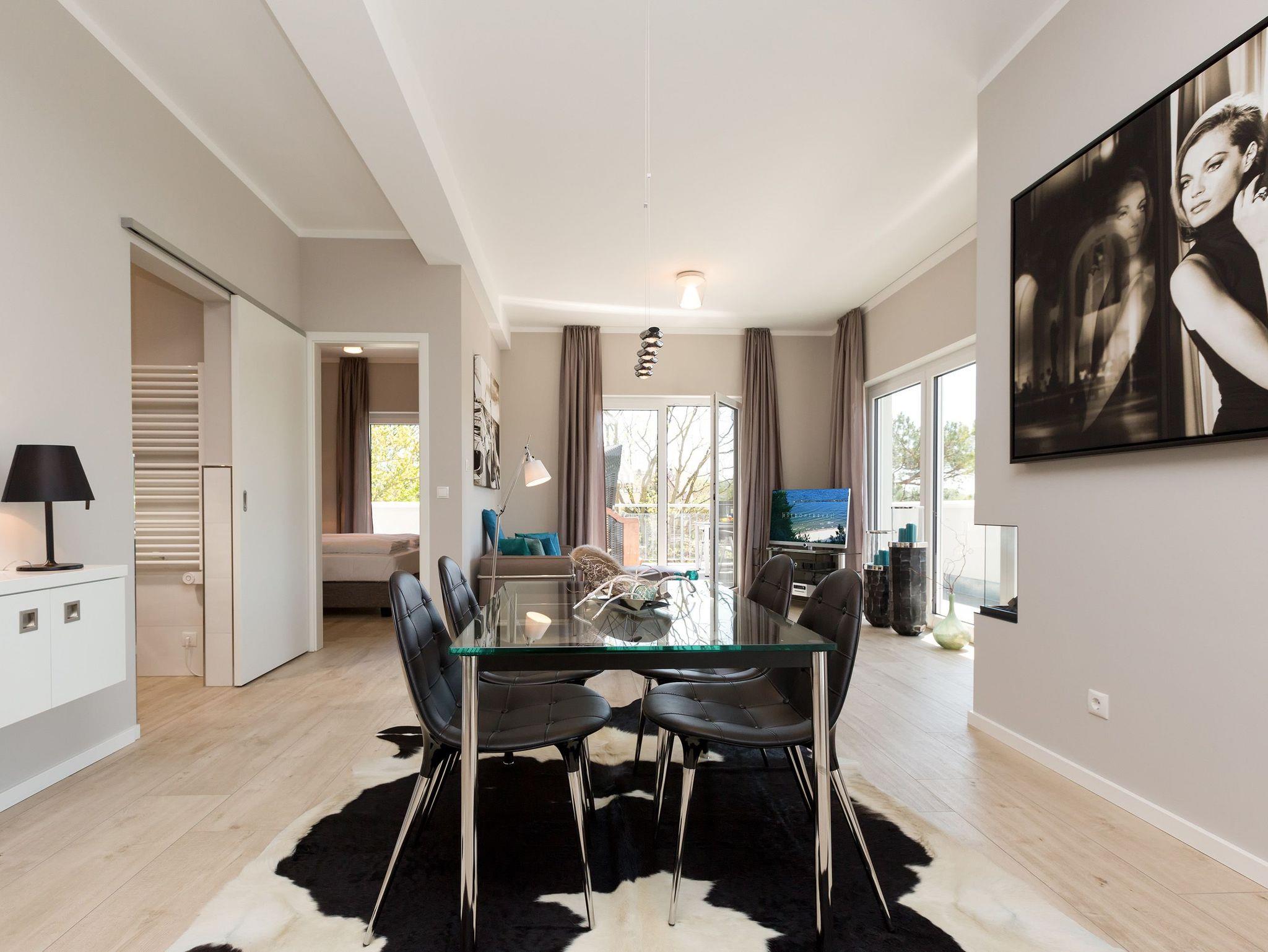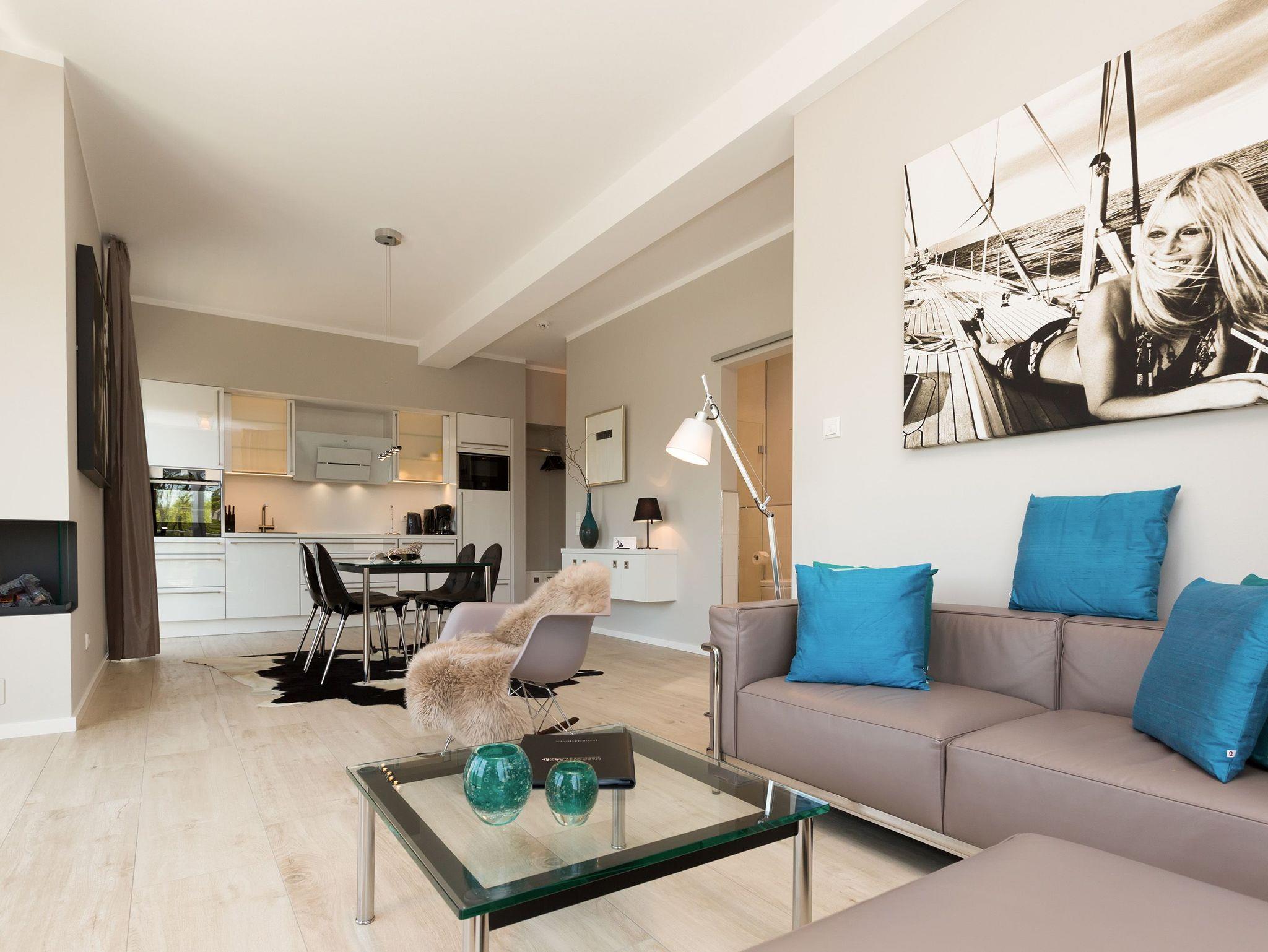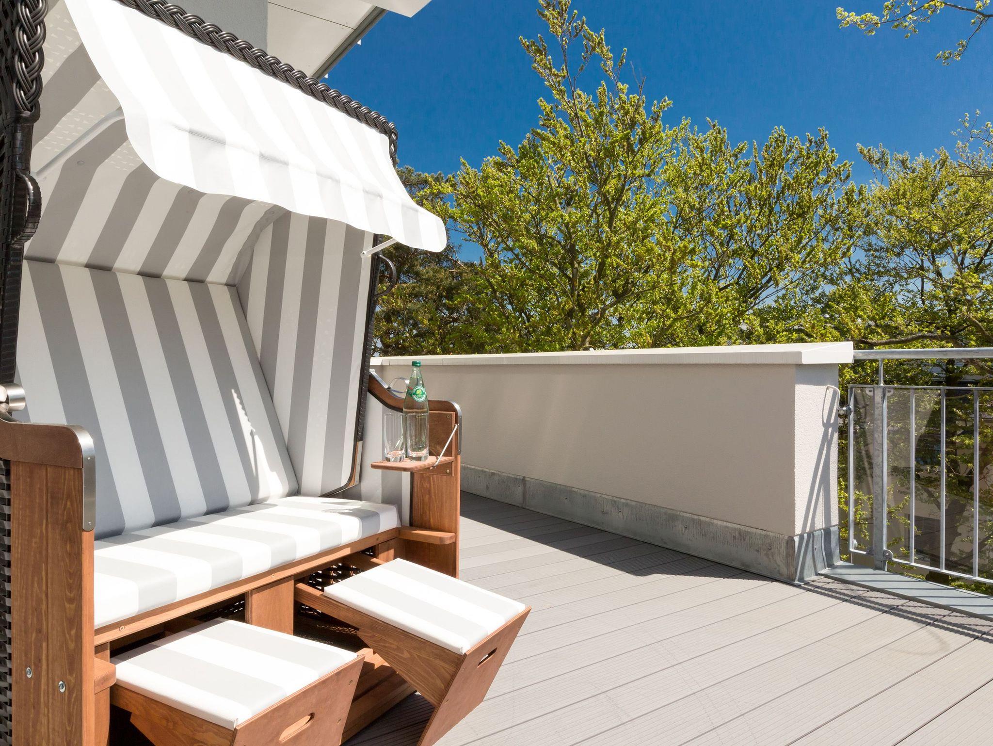 Design at it´s best! Im Appartement 21 genießen Sie Ihren Urlaub auf hohem Niveau. In dieser lichtdurchfluteten, luxuriösen 2-Raum-Ferienwohnung (64 qm) verstehen sich stylische Wohnelemente und wertiges Design von selbst. Abgestimmte Farben und Stoffe, ausgewählte Designermöbel von Cassina und die wunderschönen Fotocollagen sorgen für ein harmonisches Wohnerlebnis für 2 Personen und ein Kleinkind (im Babyreisebett). Der Eingangsbereich mit Garderobe öffnet sich und die offene, komplett ausgestattete Küche schließt sich an. Hier ist alles vorhanden, was ein Hobbykoch sich wünscht. Der schöne Essplatz ist der Mittelpunkt der Wohnung, hier lässt es sich besonders schön zusammen sitzen. Der Wohnbereich mit stylischer Couch und Flat-TV, Blue-Ray-Player und eine Hifi-Anlage mit ipod-Dock lädt zum Relaxen ein. Der moderne Elektrokamin schafft per Knopfdruck den perfekten Rahmen für einen kuschligen Abend. Das Schlafzimmer mit exklusivem Treca interiors Paris Doppelboxspringbett (1,80 x 2,00m), Flat-TV und wertigem Einbauschrank und ein Bad mit großer Dusche und WC ergänzt die Wohnung. Ein besonderes Highlight ihres Urlaubsdomizils ist die großzügige Ost-Süd-Dachterrasse. Mit Gartenmöbeln und gemütlichem Strandkorb ausgestattet, bietet sie schöne Ausblicke auf die Umgebung der Maxim-Gorki-Straße. Auch die Ostsee schimmert durch die Kiefern der Dünen. Erholung garantiert. Für Ihren Komfort sind die Betten bei der Anreise bezogen und Handtücher liegen bereit. Für kleine Gäste kann ein Kinderreisebett und ein Kinderhochstuhl (gegen Gebühr) bestellt werden. Ein Pkw-Stellplatz steht in der Tiefgarage zur Verfügung (max. Einfahrtshöhe 1,93 m).