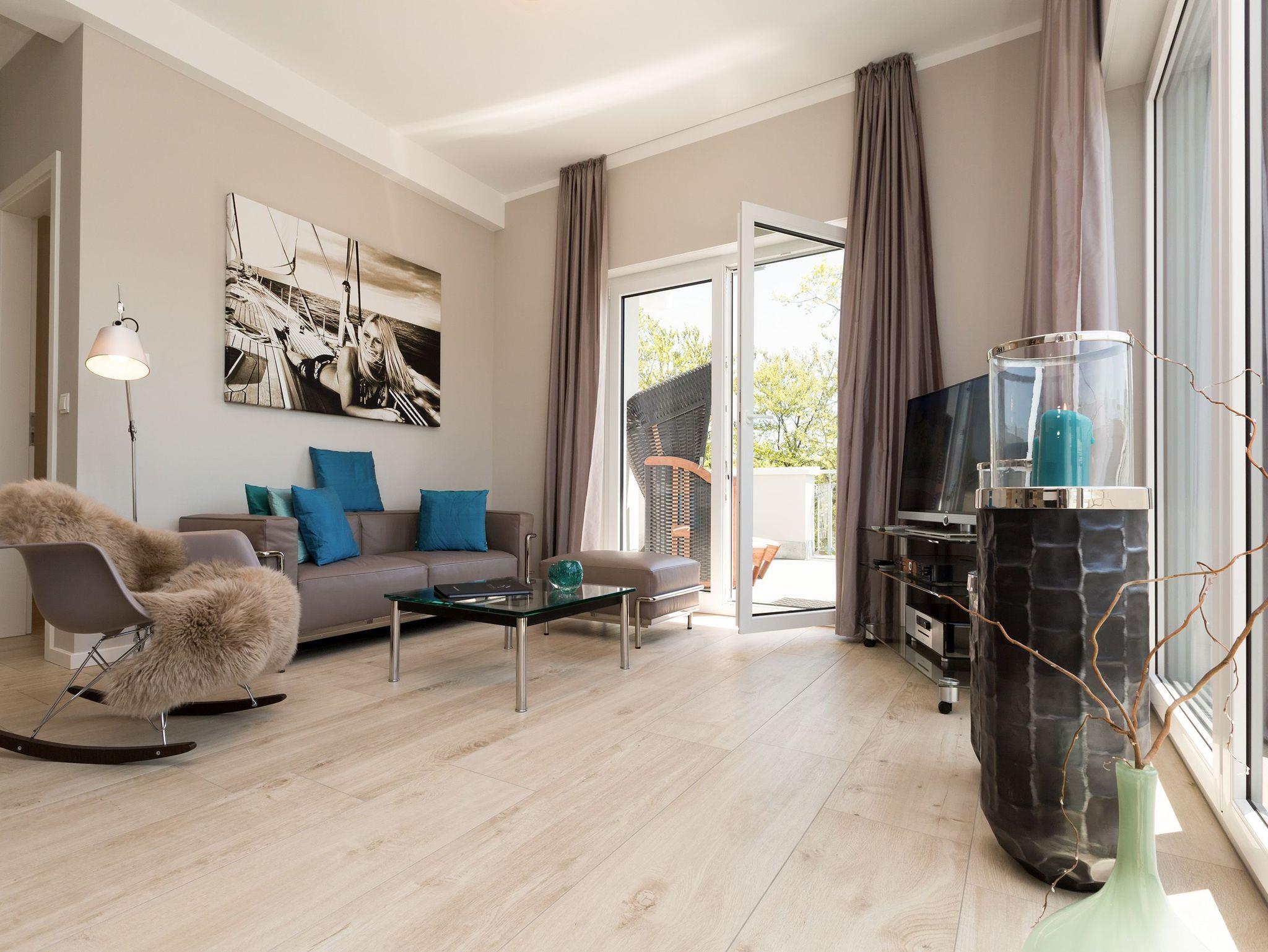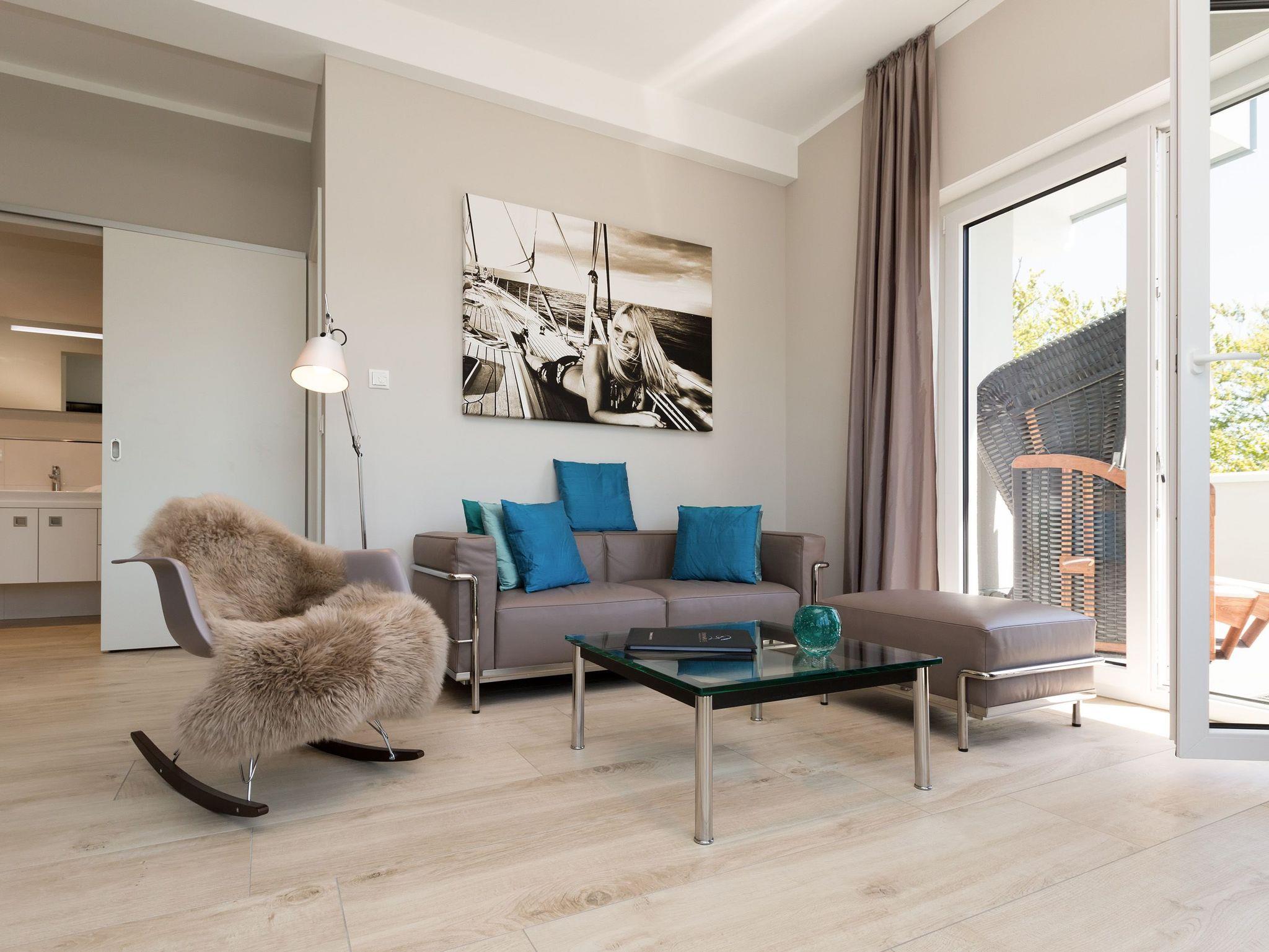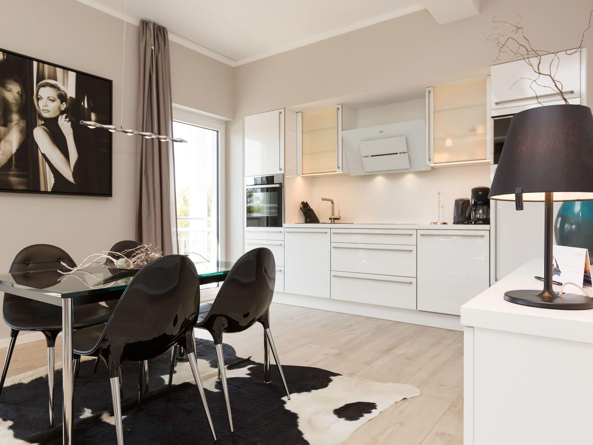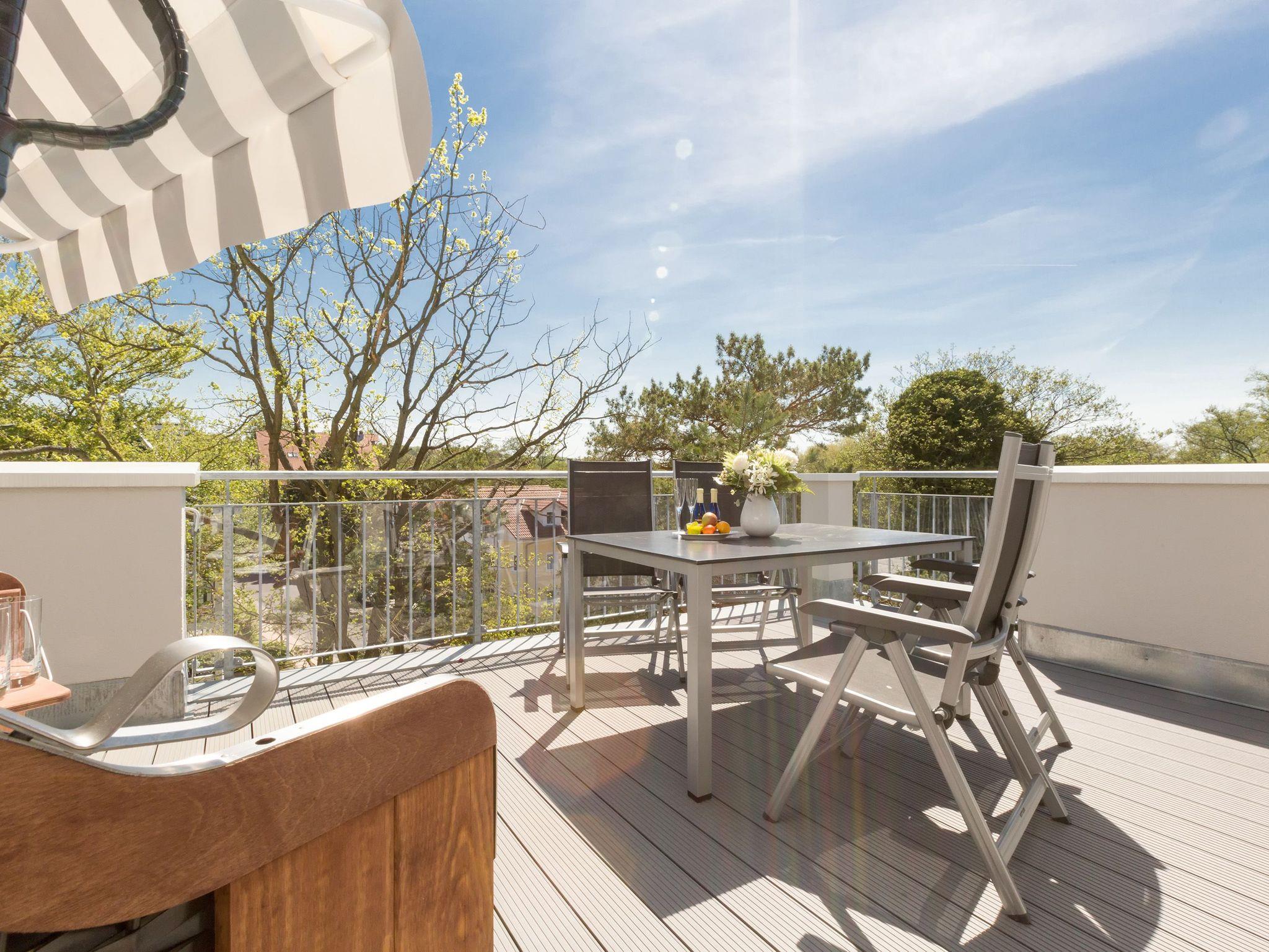 Design at it´s best! Im Appartement 21 genießen Sie Ihren Urlaub auf hohem Niveau. In dieser lichtdurchfluteten, luxuriösen 2-Raum-Ferienwohnung (64 qm) verstehen sich stylische Wohnelemente und wertiges Design von selbst. Abgestimmte Farben und Stoffe, ausgewählte Designermöbel von Cassina und die wunderschönen Fotocollagen sorgen für ein harmonisches Wohnerlebnis für 2 Personen und ein Kleinkind (im Babyreisebett). Der Eingangsbereich mit Garderobe öffnet sich und die offene, komplett ausgestattete Küche schließt sich an. Hier ist alles vorhanden, was ein Hobbykoch sich wünscht. Der schöne Essplatz ist der Mittelpunkt der Wohnung, hier lässt es sich besonders schön zusammen sitzen. Der Wohnbereich mit stylischer Couch und Flat-TV, Blue-Ray-Player und eine Hifi-Anlage mit ipod-Dock lädt zum Relaxen ein. Der moderne Elektrokamin schafft per Knopfdruck den perfekten Rahmen für einen kuschligen Abend. Das Schlafzimmer mit exklusivem Treca interiors Paris Doppelboxspringbett (1,80 x 2,00m), Flat-TV und wertigem Einbauschrank und ein Bad mit großer Dusche und WC ergänzt die Wohnung. Ein besonderes Highlight ihres Urlaubsdomizils ist die großzügige Ost-Süd-Dachterrasse. Mit Gartenmöbeln und gemütlichem Strandkorb ausgestattet, bietet sie schöne Ausblicke auf die Umgebung der Maxim-Gorki-Straße. Auch die Ostsee schimmert durch die Kiefern der Dünen. Erholung garantiert. Für Ihren Komfort sind die Betten bei der Anreise bezogen und Handtücher liegen bereit. Für kleine Gäste kann ein Kinderreisebett und ein Kinderhochstuhl (gegen Gebühr) bestellt werden. Ein Pkw-Stellplatz steht in der Tiefgarage zur Verfügung (max. Einfahrtshöhe 1,93 m).