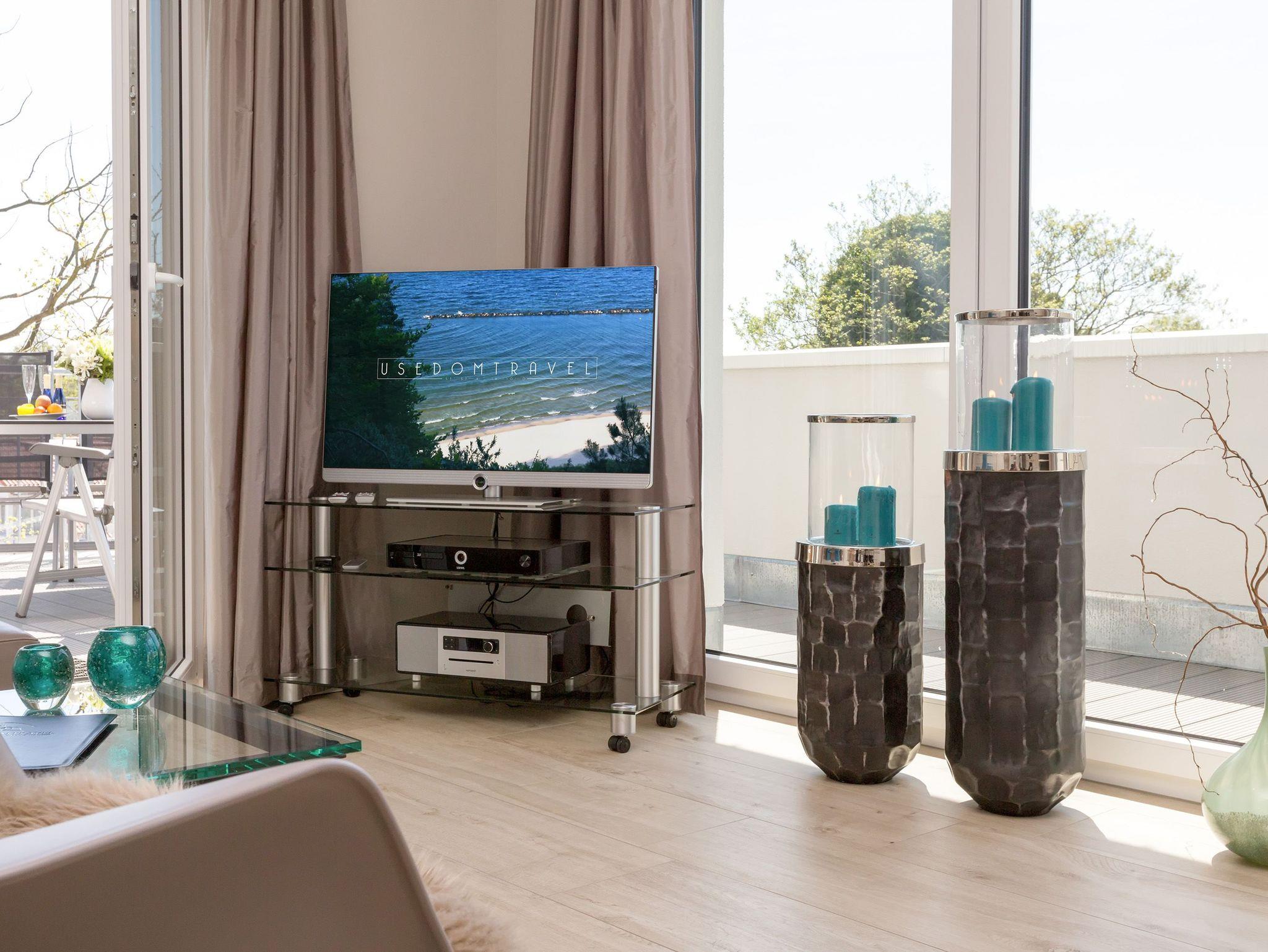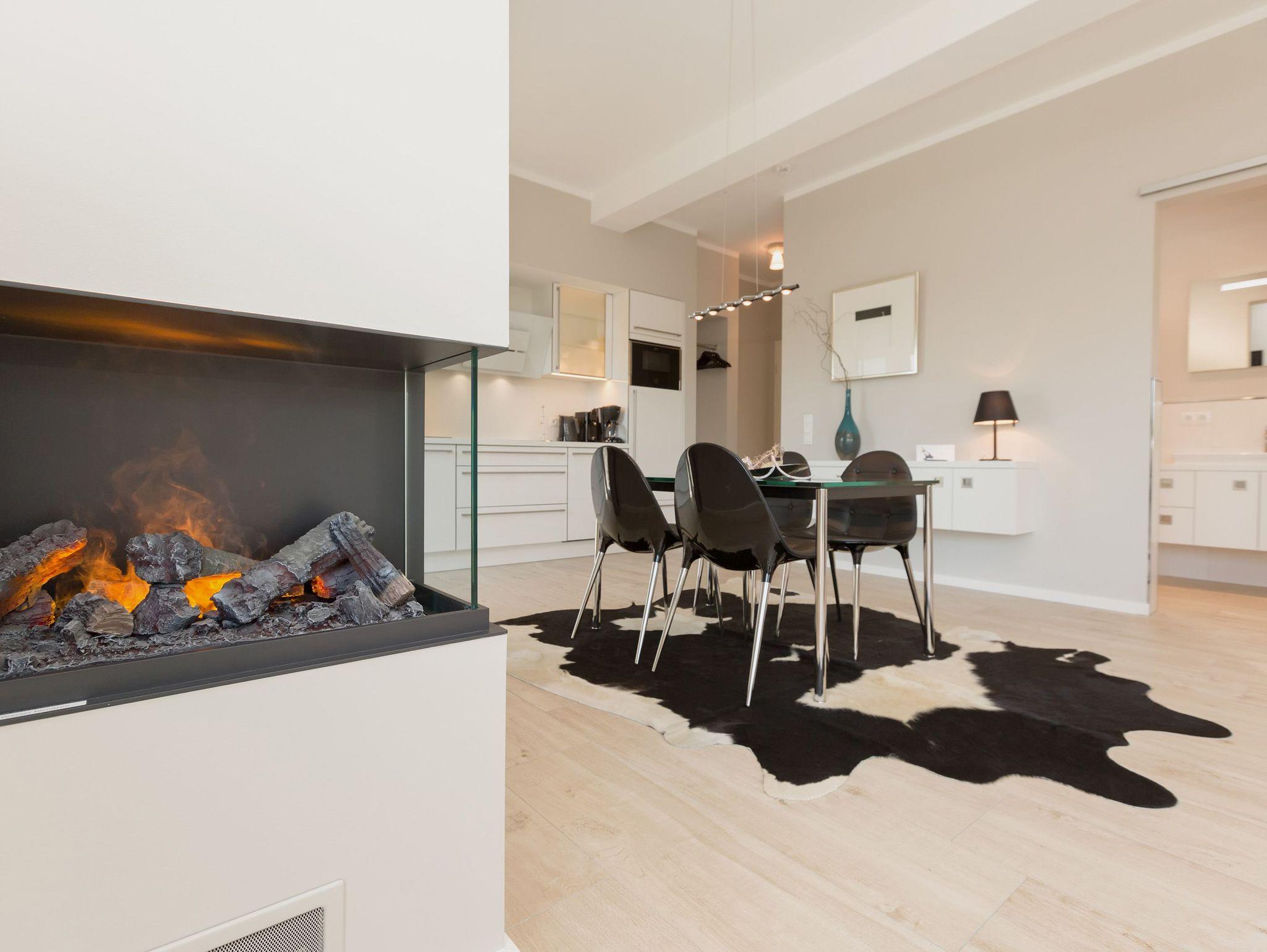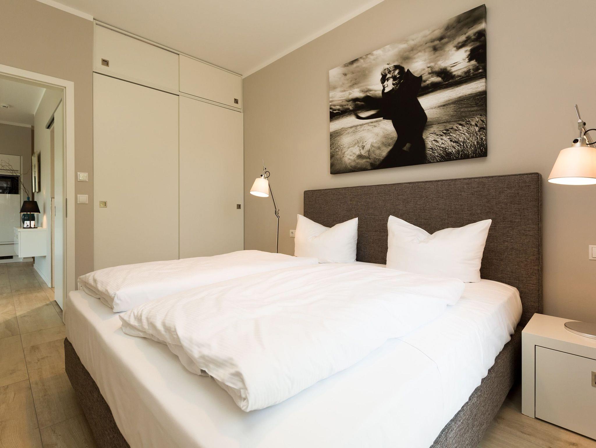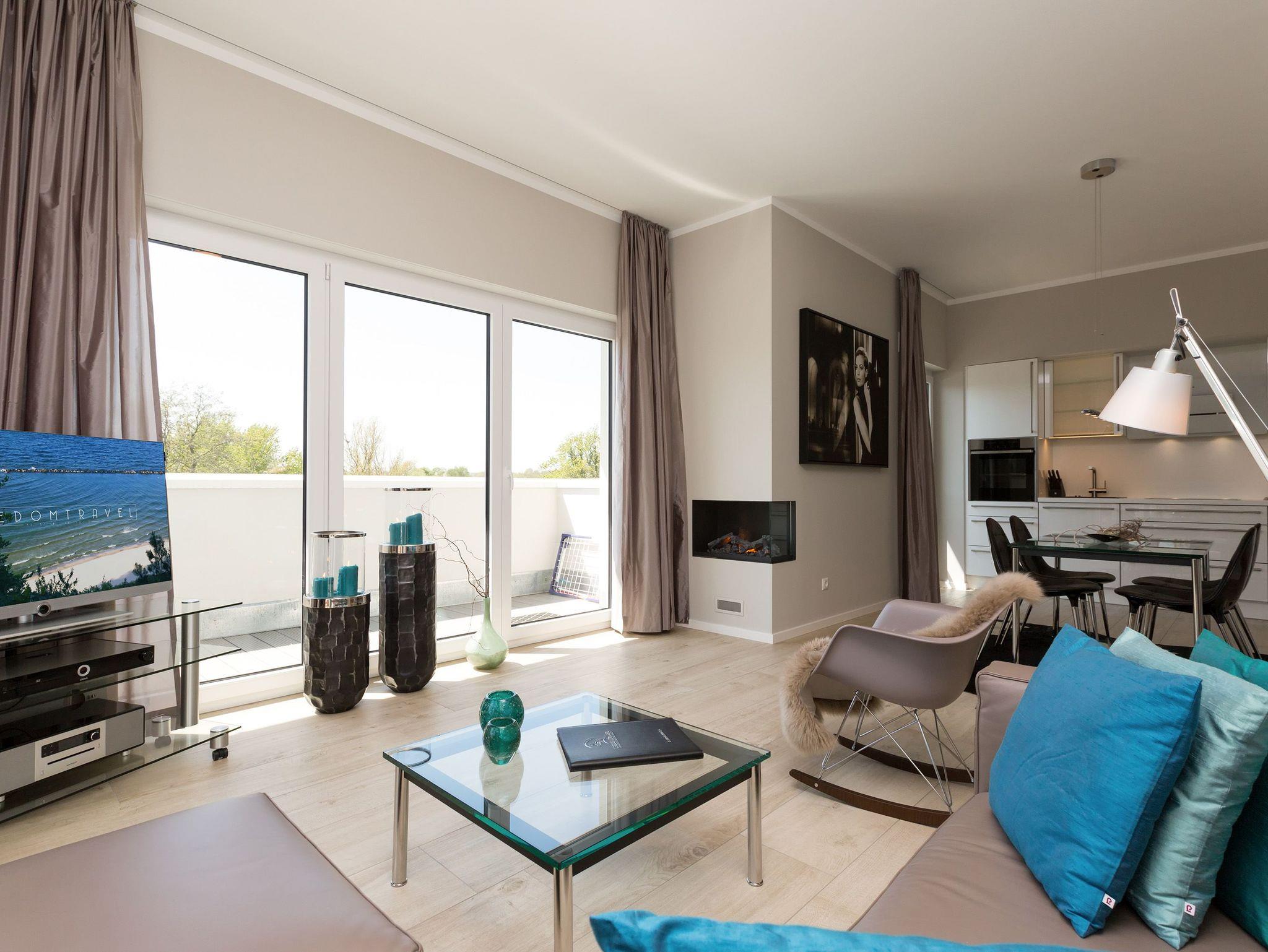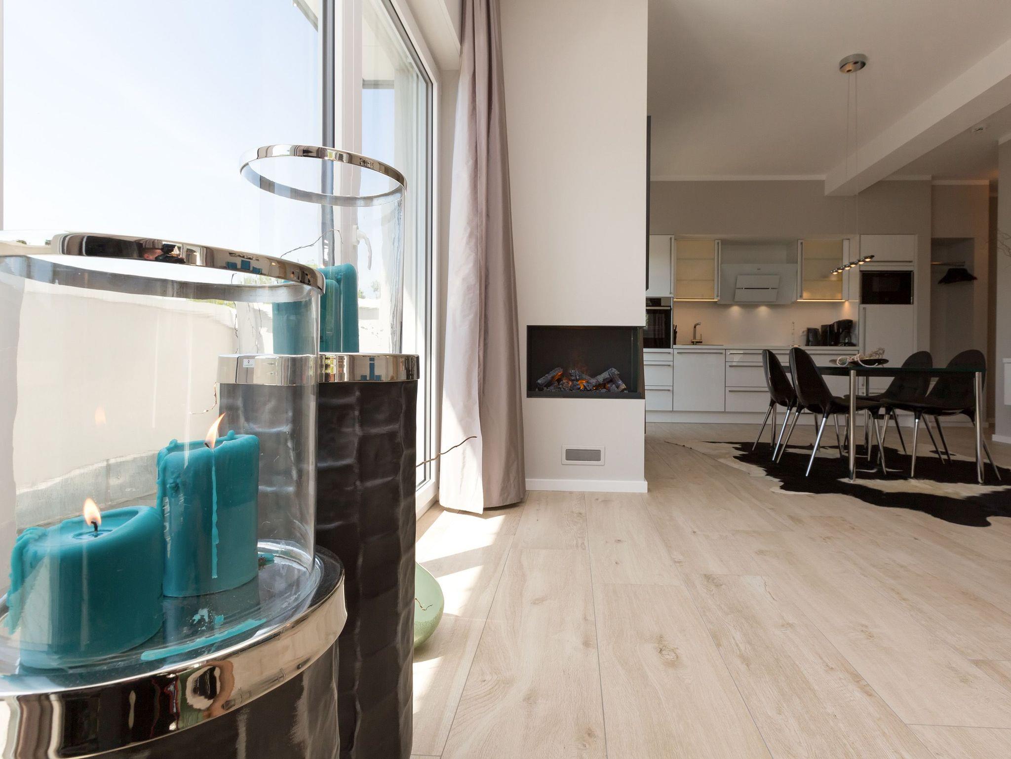 Design at it´s best! Im Appartement 21 genießen Sie Ihren Urlaub auf hohem Niveau. In dieser lichtdurchfluteten, luxuriösen 2-Raum-Ferienwohnung (64 qm) verstehen sich stylische Wohnelemente und wertiges Design von selbst. Abgestimmte Farben und Stoffe, ausgewählte Designermöbel von Cassina und die wunderschönen Fotocollagen sorgen für ein harmonisches Wohnerlebnis für 2 Personen und ein Kleinkind (im Babyreisebett). Der Eingangsbereich mit Garderobe öffnet sich und die offene, komplett ausgestattete Küche schließt sich an. Hier ist alles vorhanden, was ein Hobbykoch sich wünscht. Der schöne Essplatz ist der Mittelpunkt der Wohnung, hier lässt es sich besonders schön zusammen sitzen. Der Wohnbereich mit stylischer Couch und Flat-TV, Blue-Ray-Player und eine Hifi-Anlage mit ipod-Dock lädt zum Relaxen ein. Der moderne Elektrokamin schafft per Knopfdruck den perfekten Rahmen für einen kuschligen Abend. Das Schlafzimmer mit exklusivem Treca interiors Paris Doppelboxspringbett (1,80 x 2,00m), Flat-TV und wertigem Einbauschrank und ein Bad mit großer Dusche und WC ergänzt die Wohnung. Ein besonderes Highlight ihres Urlaubsdomizils ist die großzügige Ost-Süd-Dachterrasse. Mit Gartenmöbeln und gemütlichem Strandkorb ausgestattet, bietet sie schöne Ausblicke auf die Umgebung der Maxim-Gorki-Straße. Auch die Ostsee schimmert durch die Kiefern der Dünen. Erholung garantiert. Für Ihren Komfort sind die Betten bei der Anreise bezogen und Handtücher liegen bereit. Für kleine Gäste kann ein Kinderreisebett und ein Kinderhochstuhl (gegen Gebühr) bestellt werden. Ein Pkw-Stellplatz steht in der Tiefgarage zur Verfügung (max. Einfahrtshöhe 1,93 m).