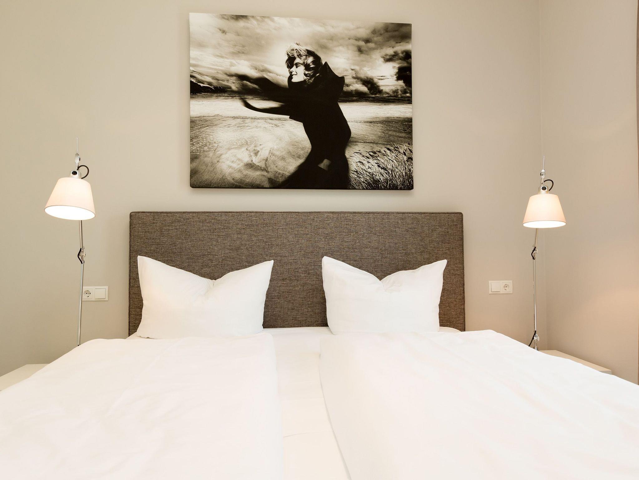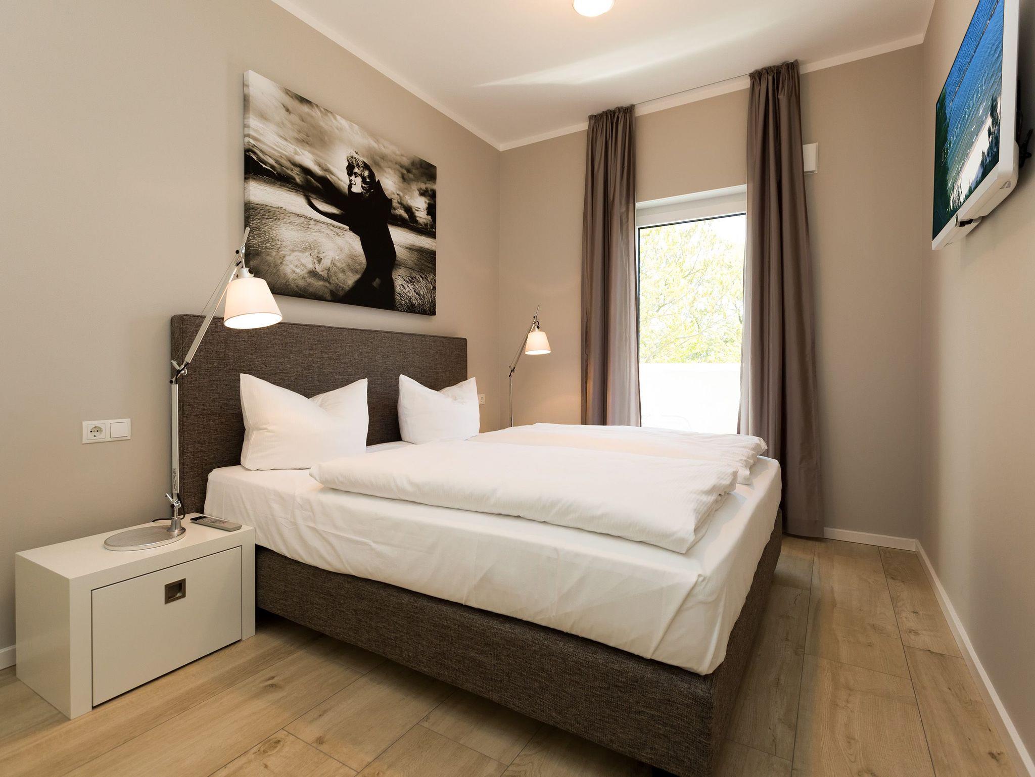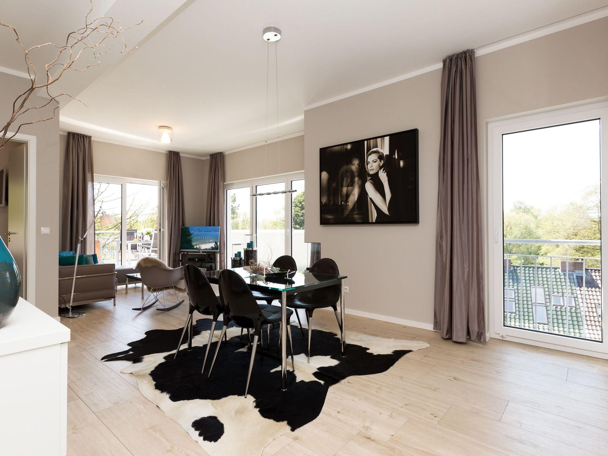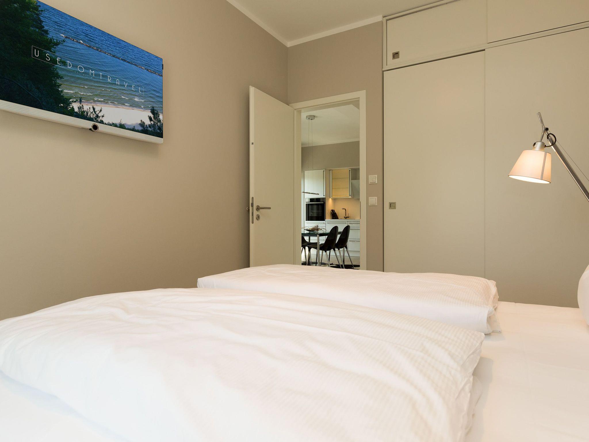Design at it´s best! Im Appartement 21 genießen Sie Ihren Urlaub auf hohem Niveau. In dieser lichtdurchfluteten, luxuriösen 2-Raum-Ferienwohnung (64 qm) verstehen sich stylische Wohnelemente und wertiges Design von selbst. Abgestimmte Farben und Stoffe, ausgewählte Designermöbel von Cassina und die wunderschönen Fotocollagen sorgen für ein harmonisches Wohnerlebnis für 2 Personen und ein Kleinkind (im Babyreisebett). Der Eingangsbereich mit Garderobe öffnet sich und die offene, komplett ausgestattete Küche schließt sich an. Hier ist alles vorhanden, was ein Hobbykoch sich wünscht. Der schöne Essplatz ist der Mittelpunkt der Wohnung, hier lässt es sich besonders schön zusammen sitzen. Der Wohnbereich mit stylischer Couch und Flat-TV, Blue-Ray-Player und eine Hifi-Anlage mit ipod-Dock lädt zum Relaxen ein. Der moderne Elektrokamin schafft per Knopfdruck den perfekten Rahmen für einen kuschligen Abend. Das Schlafzimmer mit exklusivem Treca interiors Paris Doppelboxspringbett (1,80 x 2,00m), Flat-TV und wertigem Einbauschrank und ein Bad mit großer Dusche und WC ergänzt die Wohnung. Ein besonderes Highlight ihres Urlaubsdomizils ist die großzügige Ost-Süd-Dachterrasse. Mit Gartenmöbeln und gemütlichem Strandkorb ausgestattet, bietet sie schöne Ausblicke auf die Umgebung der Maxim-Gorki-Straße. Auch die Ostsee schimmert durch die Kiefern der Dünen. Erholung garantiert. Für Ihren Komfort sind die Betten bei der Anreise bezogen und Handtücher liegen bereit. Für kleine Gäste kann ein Kinderreisebett und ein Kinderhochstuhl (gegen Gebühr) bestellt werden. Ein Pkw-Stellplatz steht in der Tiefgarage zur Verfügung (max. Einfahrtshöhe 1,93 m).
