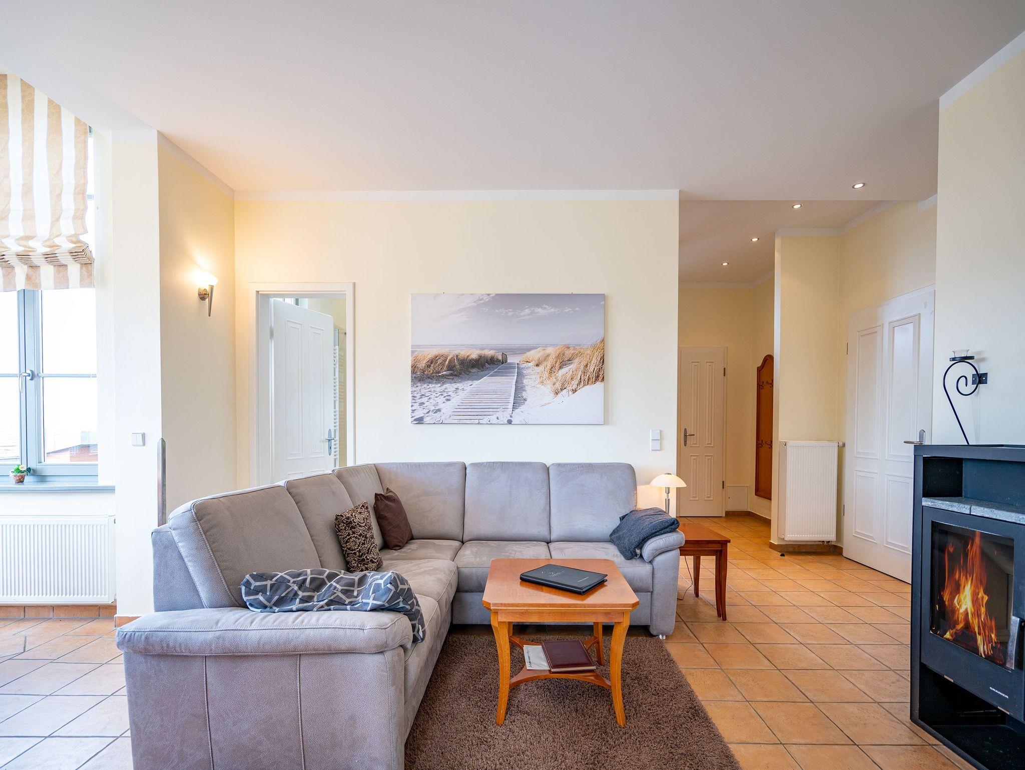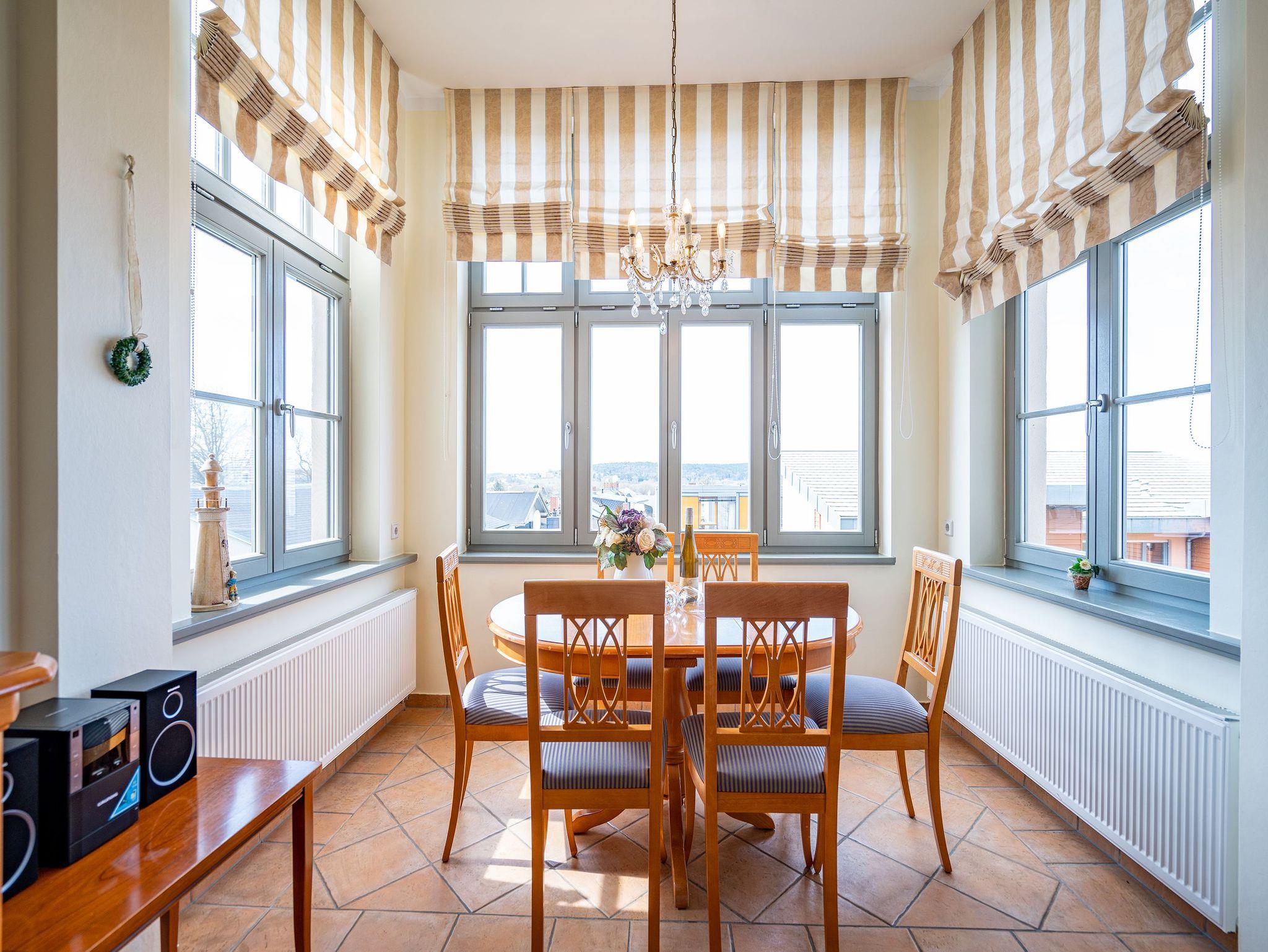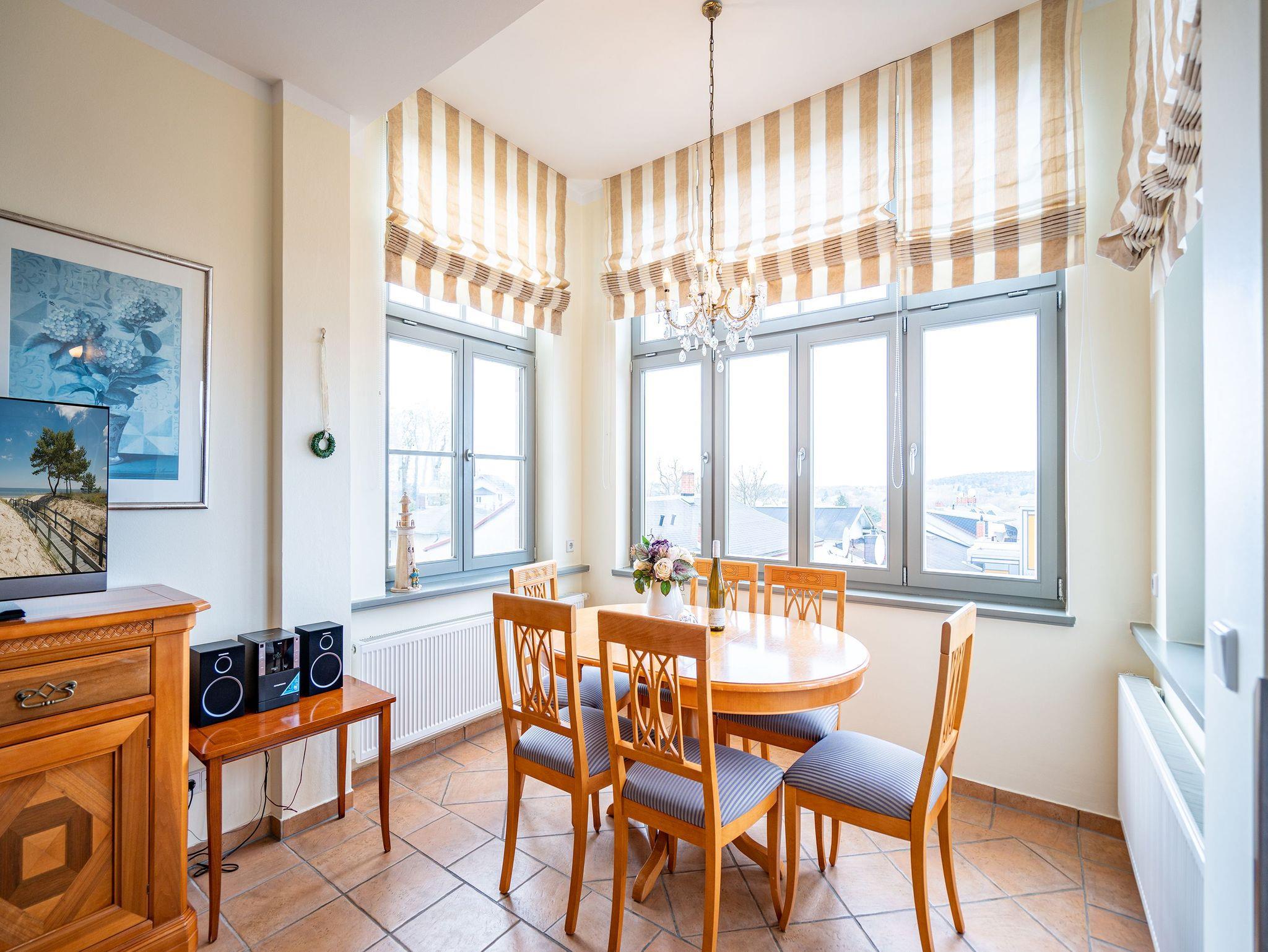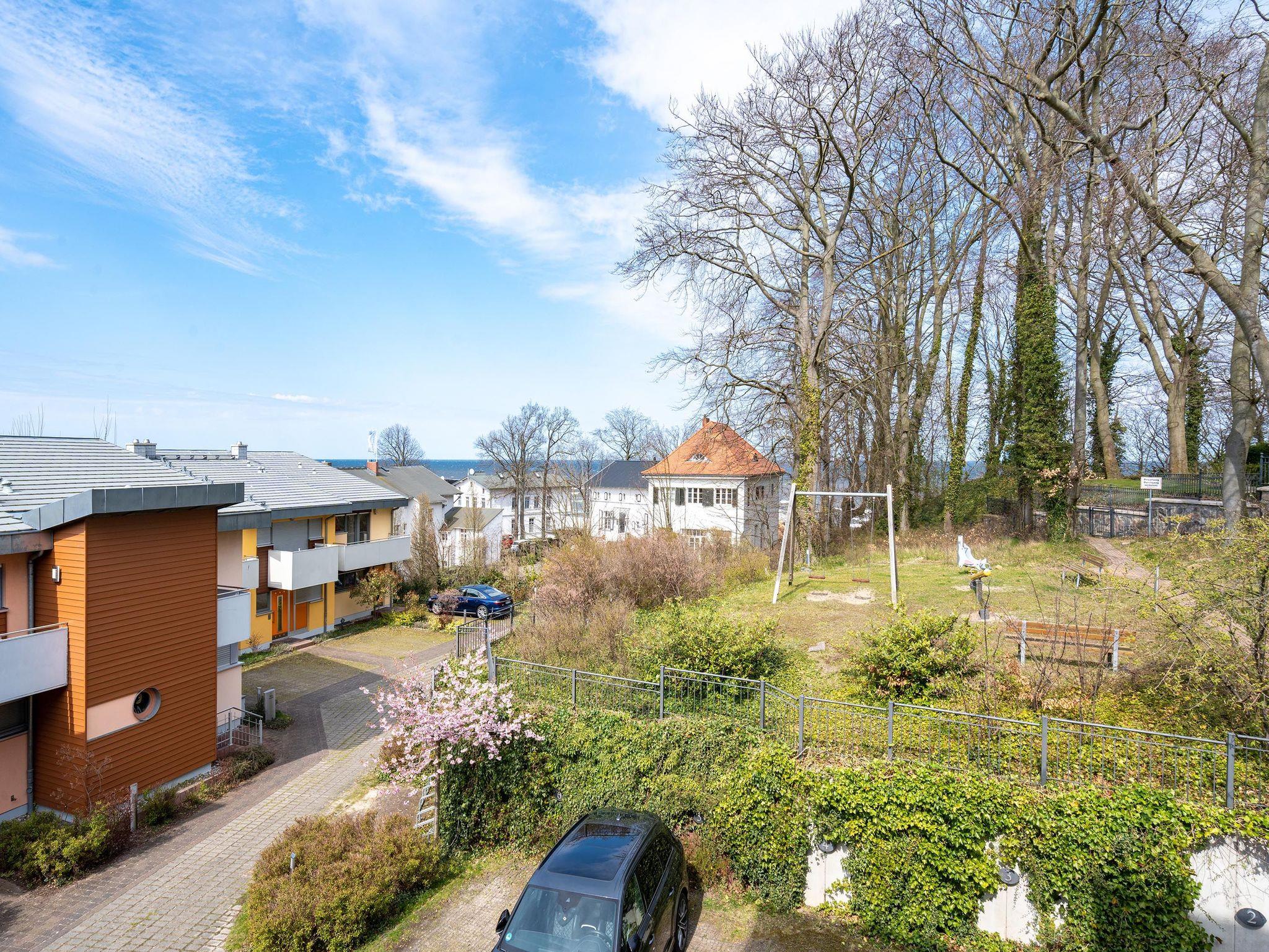 Inmitten einer parkähnlichen Anlage, umgeben von viel Grün und wunderschönen alten Bäumen können Sie in der Wohnung Nummer 5 im ersten Stock der liebevoll sanierten Bäderarchitekturvilla Villa San Marino Urlauben wie zu Kaisers Zeiten. Das 63 Quadratmeter große 3-Zimmer-Appartement bietet allen Komfort für bis zu vier auszeithungrige Erwachsene. Die grenzenlos blaue Weite der Ostsee legt sich Ihnen hier schon beim Frühstücken auf dem Balkon in den Blick. Die Küche, von der aus Sie auf den Balkon treten, ist mit hochwertigen Geräten und Geschirr voll ausgestattet. Mittelpunkt dieses exklusiven Feriendomizils ist das große Wohnzimmer mit gemütlicher Sitzgruppe und 32 Zoll Flat-TV. Ganz besonders behaglich wird es an kühlen Tagen oder Abenden, wenn im Kaminofen ein Feuer lodert. Zum Wohnbereich gehört eine offene Veranda mit einladendem Essplatz. Das Appartement verfügt über zwei Schlafzimmer. Die beiden Doppelbetten (einmal 1,80 m x 2,00 m und einmal 1,60 m x 2,00 m) sind bequem und sorgen für einen erholsamen Schlaf. Kleiderschränke bieten Platz zur Ablage. Eines der Schlafzimmer hat einen Flat-TV. Das Badezimmer mit Dusche, Waschtisch und Toilette ist sehr geräumig. In der Wohnung gibt es ein zusätzliches Gäste-WC. Damit Sie sich in Ihrem Urlaub wirklich um nichts kümmern müssen, liegen Handtücher für Sie bereit und die Betten sind bezogen (als Erstausstattung). Um auf das Grundstück zu gelangen, erhalten Sie bei Ihrer Anreise eine Fernbedienung. Auf dem Gelände ist dann ein Pkw-Stellplatz für Sie vorgehalten. Im Keller finden Sie eine Waschmaschine und einen Trockner (gegen Gebühr).