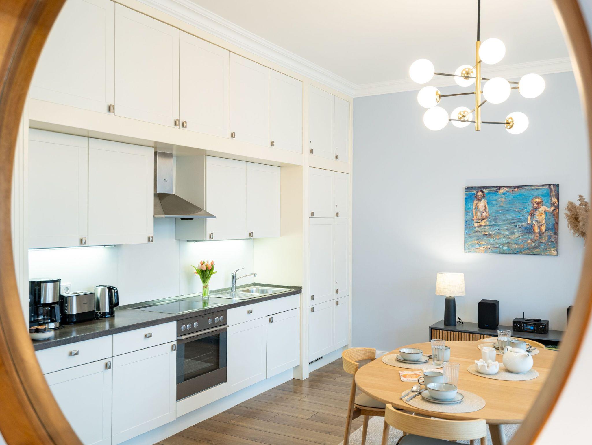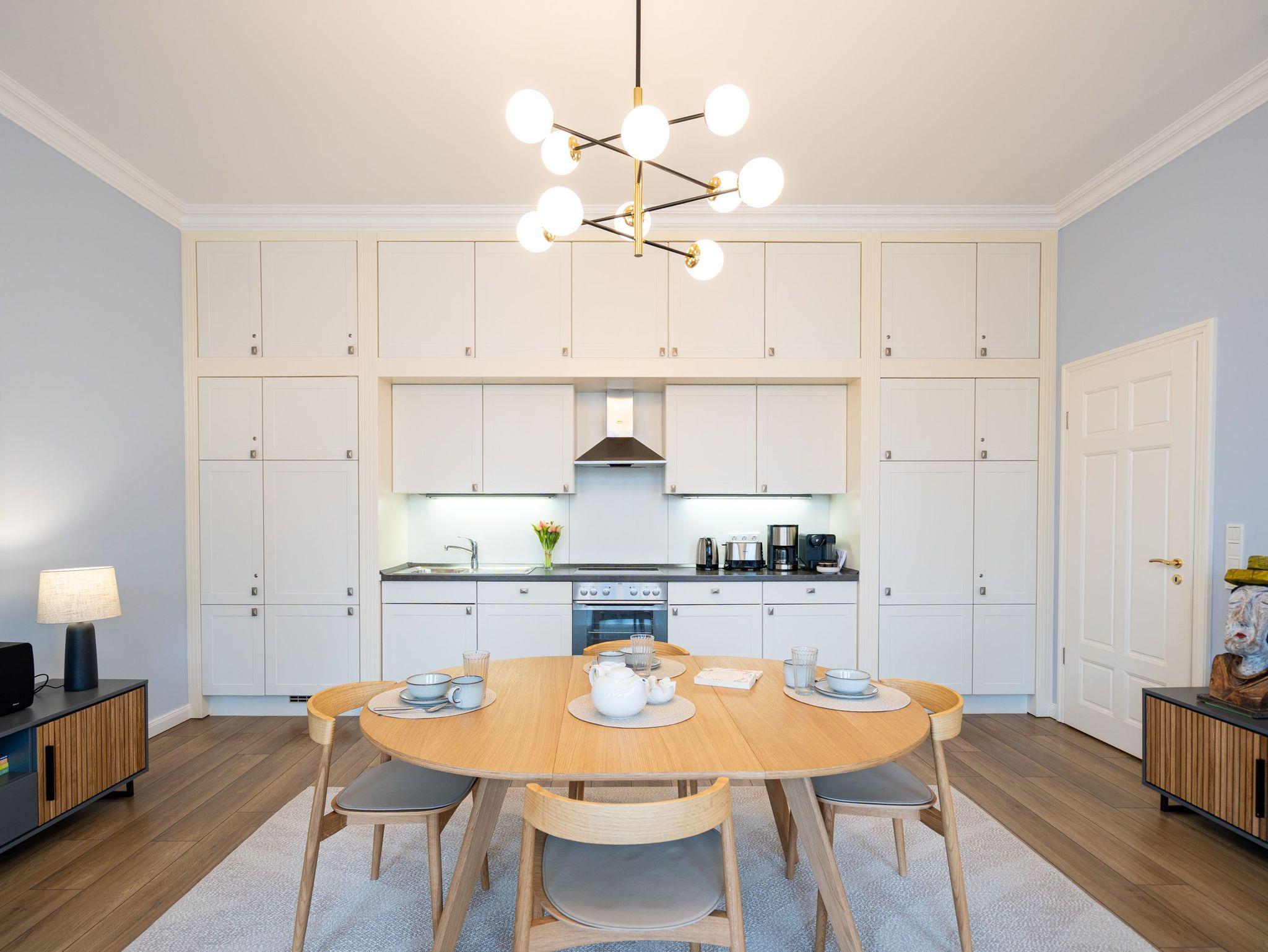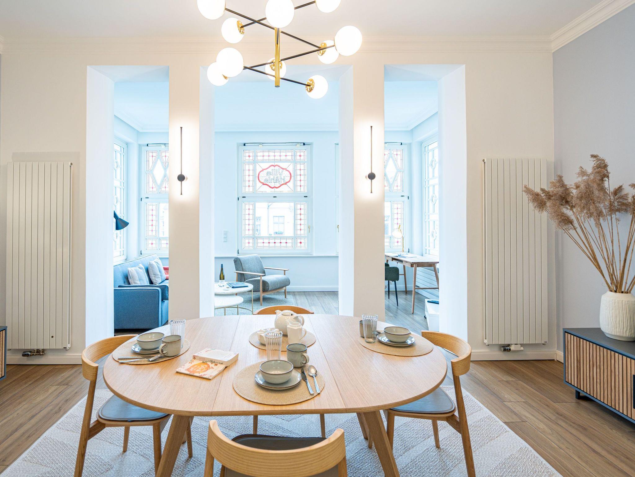 Die Ferienwohnung 5 in der Villa Hähle kombiniert stilvolles Ambiente mit historischem Charme und bietet auf 64 m² im 1. Obergeschoss höchsten Wohnkomfort ( Modernisierung im Frühjahr 2025). Der Wohnbereich lädt mit einer bequemen Sitzgruppe und einer ausziehbaren Schlafcouch (1,60 x 2,00 m) zum Entspannen ein. Direkt angeschlossen befindet sich der Essbereich, der ausreichend Platz für gemeinsame Mahlzeiten bietet. Die moderne, voll ausgestattete Küche verfügt über großzügigen Stauraum und lässt keine Wünsche offen. Das geräumige Schlafzimmer sorgt für erholsame Nächte. Für kleine Gäste stellen wir auf Wunsch ein Kinderreisebett (ohne zusätzliche Matratze und Bettzeug) sowie einen Hochstuhl gegen einen Aufpreis zur Verfügung. Damit Sie sich direkt wohlfühlen können, sind die Betten bei Ihrer Anreise bezogen, und eine Erstausstattung mit Handtüchern liegt bereit. Das Badezimmer ist großzügig gestaltet und mit Dusche und WC ausgestattet. Zusätzlich stehen Ihnen im Haus eine Münzwaschmaschine und ein Münztrockner gegen eine kleine Gebühr zur Verfügung. WLAN nutzen Sie kostenfrei, und ein privater Pkw-Stellplatz gehört selbstverständlich ebenfalls zum Angebot. Die Wohnung bietet Platz für bis zu zwei Erwachsene und ein Kind bis 12 Jahre und ist damit ideal für Familien. Freuen Sie sich auf eine Unterkunft, die historischen Charme und moderne Annehmlichkeiten perfekt verbindet ? wir heißen Sie herzlich willkommen in der Villa Hähle!