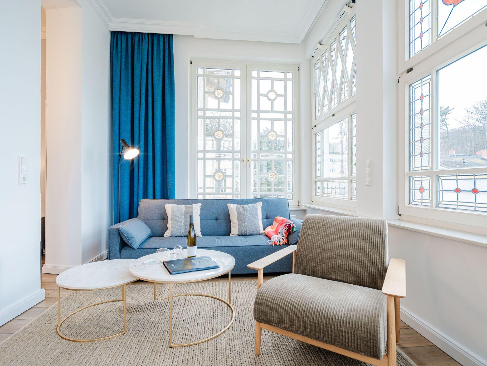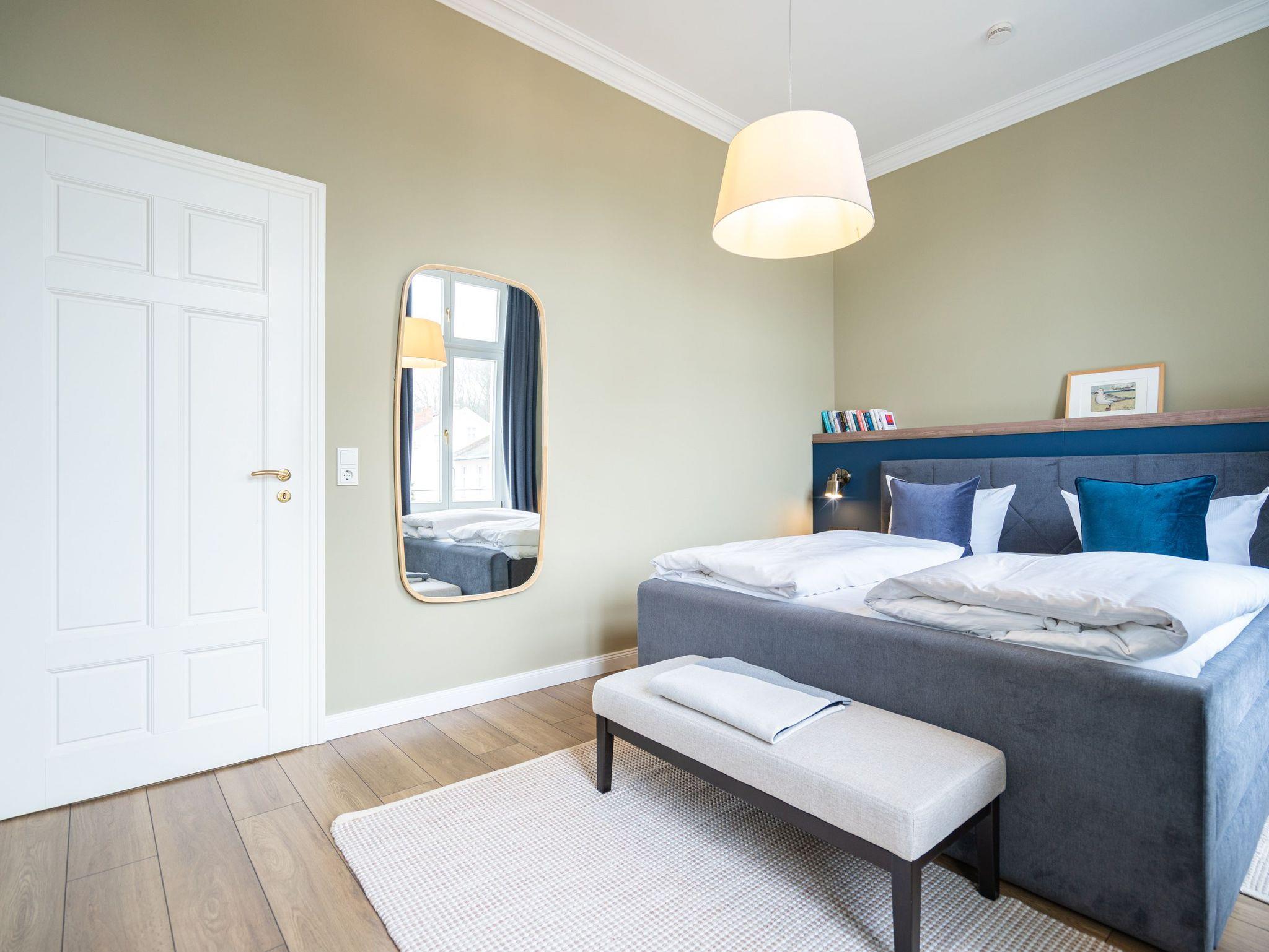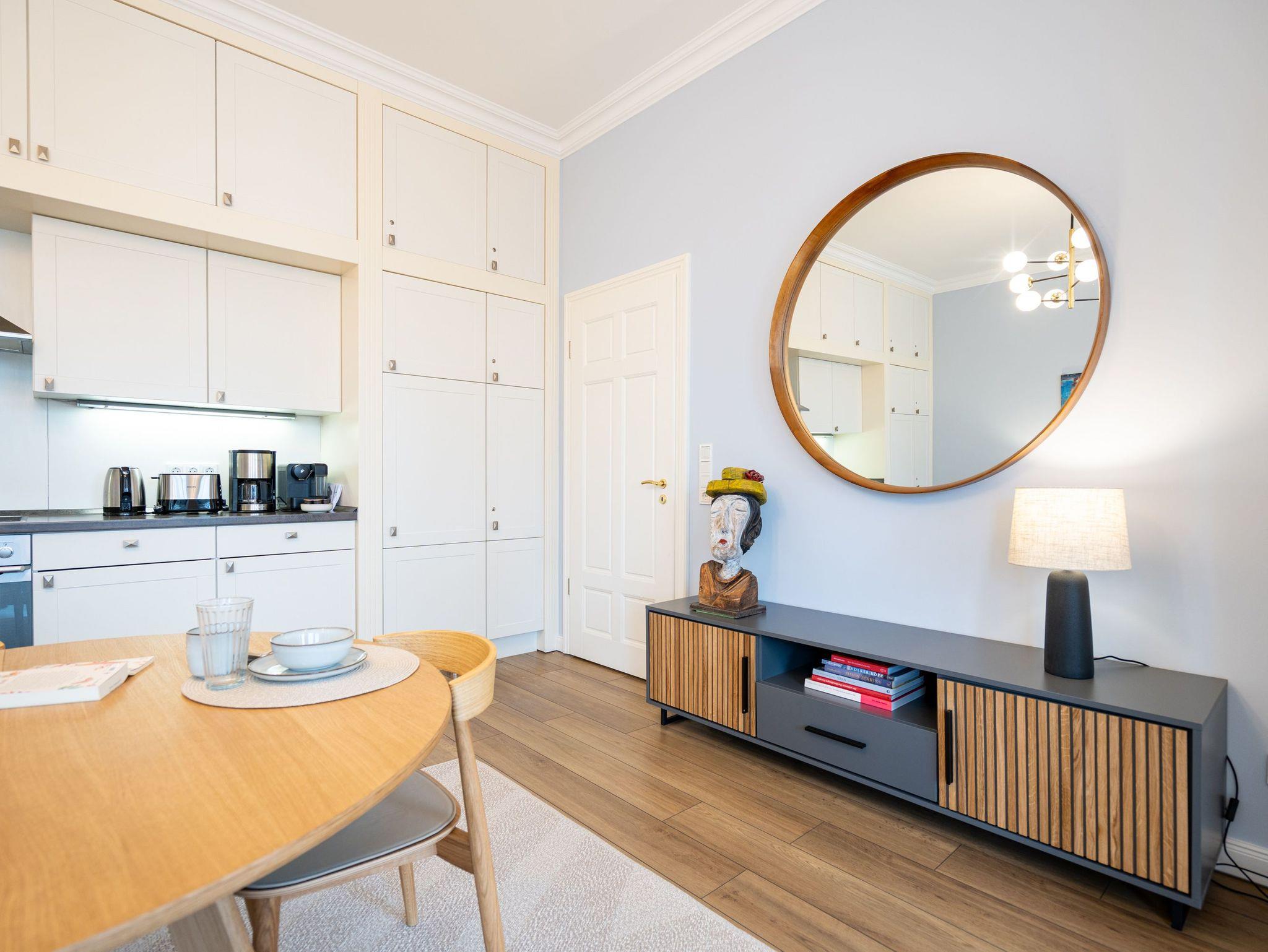 Die Ferienwohnung 5 in der Villa Hähle kombiniert stilvolles Ambiente mit historischem Charme und bietet auf 64 m² im 1. Obergeschoss höchsten Wohnkomfort ( Modernisierung im Frühjahr 2025). Der Wohnbereich lädt mit einer bequemen Sitzgruppe und einer ausziehbaren Schlafcouch (1,60 x 2,00 m) zum Entspannen ein. Direkt angeschlossen befindet sich der Essbereich, der ausreichend Platz für gemeinsame Mahlzeiten bietet. Die moderne, voll ausgestattete Küche verfügt über großzügigen Stauraum und lässt keine Wünsche offen. Das geräumige Schlafzimmer sorgt für erholsame Nächte. Für kleine Gäste stellen wir auf Wunsch ein Kinderreisebett (ohne zusätzliche Matratze und Bettzeug) sowie einen Hochstuhl gegen einen Aufpreis zur Verfügung. Damit Sie sich direkt wohlfühlen können, sind die Betten bei Ihrer Anreise bezogen, und eine Erstausstattung mit Handtüchern liegt bereit. Das Badezimmer ist großzügig gestaltet und mit Dusche und WC ausgestattet. Zusätzlich stehen Ihnen im Haus eine Münzwaschmaschine und ein Münztrockner gegen eine kleine Gebühr zur Verfügung. WLAN nutzen Sie kostenfrei, und ein privater Pkw-Stellplatz gehört selbstverständlich ebenfalls zum Angebot. Die Wohnung bietet Platz für bis zu zwei Erwachsene und ein Kind bis 12 Jahre und ist damit ideal für Familien. Freuen Sie sich auf eine Unterkunft, die historischen Charme und moderne Annehmlichkeiten perfekt verbindet ? wir heißen Sie herzlich willkommen in der Villa Hähle!