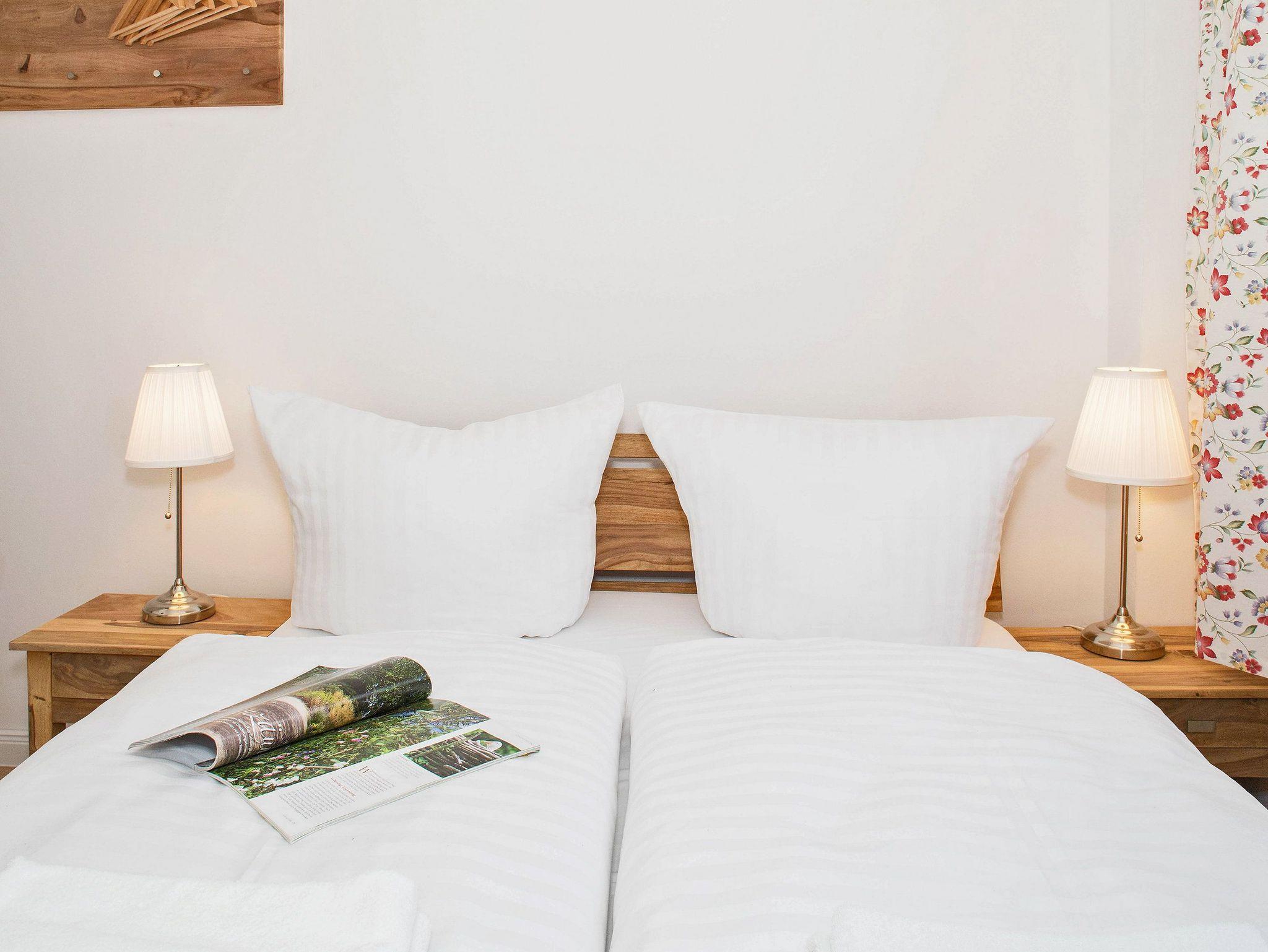 Das 3-Raum-Appartement Nr. 1 im Erdgeschoss der Villa Helene mit separatem Eingang begrüßt bis zu vier Personen zur wohlverdienten Urlaubszeit. Dank der Stufen im Eingangsbereich, vor dem Schlaf- und Badezimmer erlangt das Appartement einen sehr offenen Charakter und wirkt selbst mit seinen 50 Quadratmetern sehr großzügig. Der helle Wohnbereich mit bequemer Couch und zwei Sesseln lädt zum Entspannen vor dem Flat-TV ein. Genießen Sie die in der gut ausgestattete Küche (Backofen, Ceranfeld-2Felder, Geschirrspüler, Kühlschrank, Kaffeemaschine, Wasserkocher, Toaster) zubereiteten Speisen auf der angrenzenden Nordostterrasse bei einem Glas Wein im Grünen ? und am Abend mit Blick auf den Sternenhimmel. Anschließend erledigt der Geschirrspüler den Abwasch für Sie ? während Sie in Ruhe einen erlebnisreichen Urlaubstag bei einem gemütlichen Beisammensein am großzügigen Esstisch ausklingen lassen. Zur Nachtruhe laden zwei Schlafzimmer zum Träumen von einem bevorstehenden oder bereits vergangenen erlebnisreichen Urlaubstag ein. Beide Schlafzimmer verfügen über ein bequemes Doppelbett (140 x 200cm / 160 x 200cm / jeweils eine durchgehende Matratze).