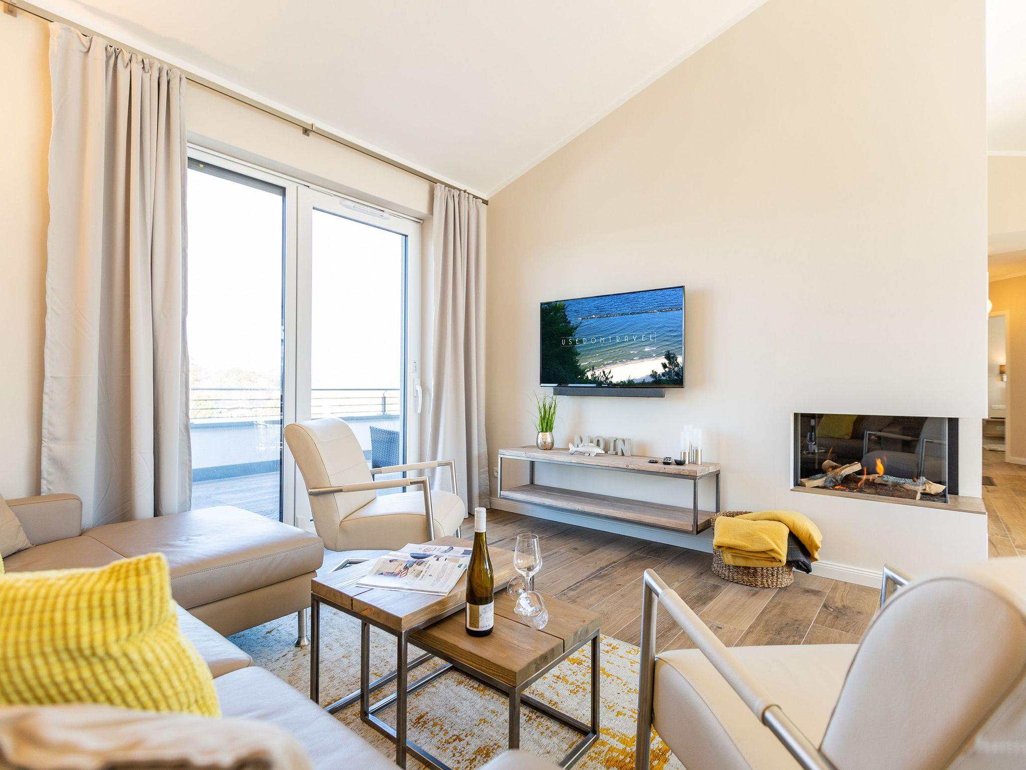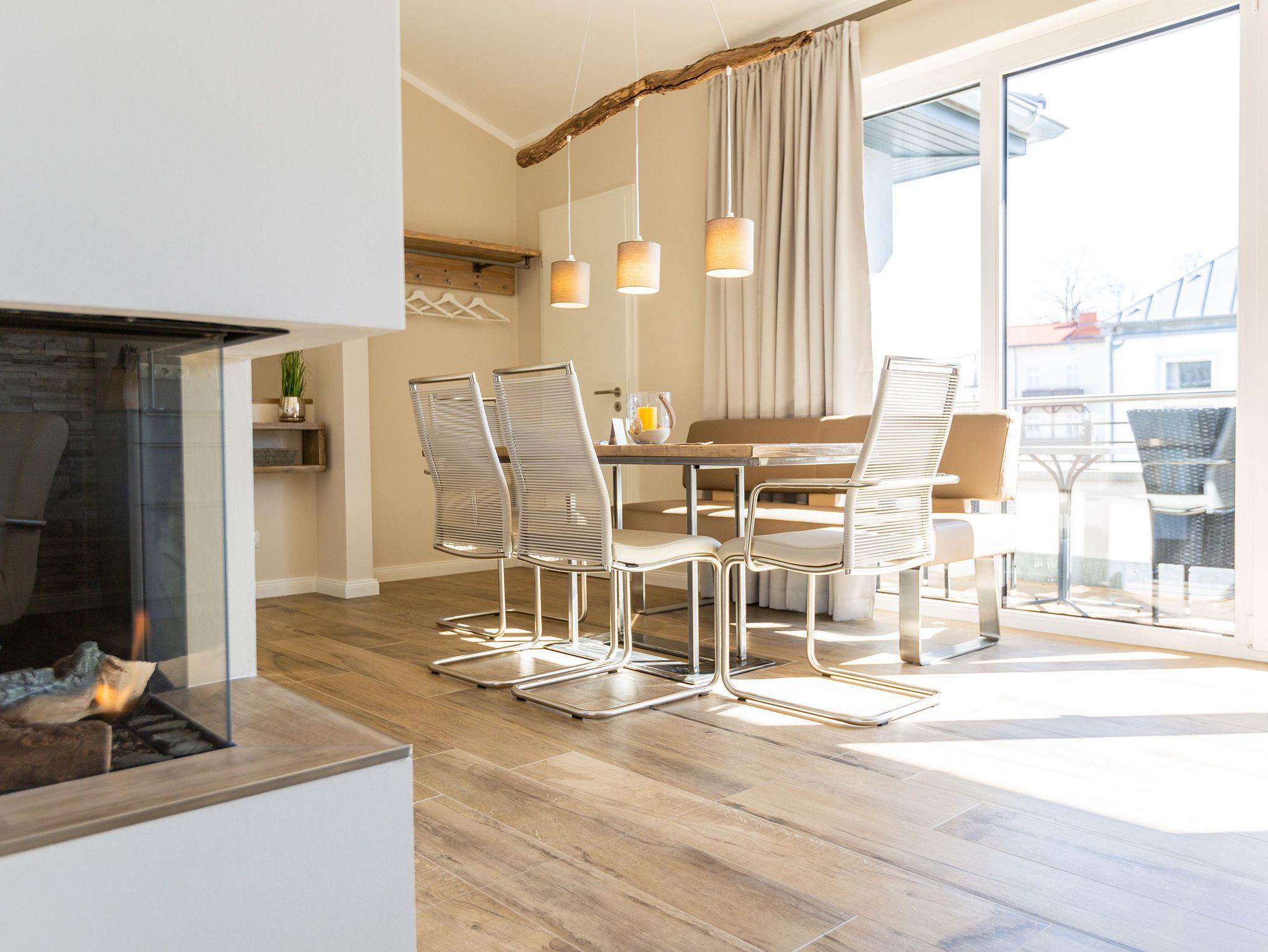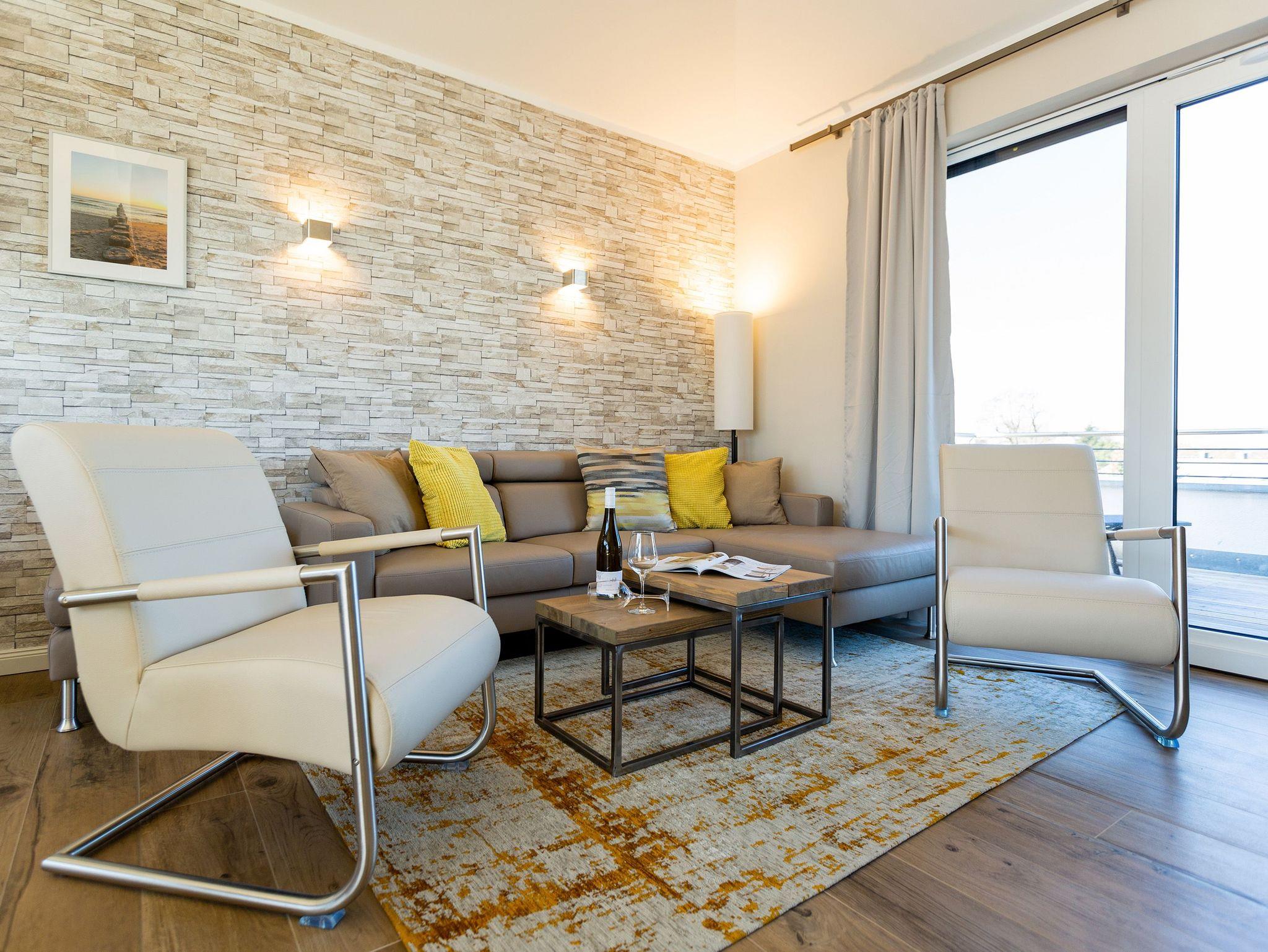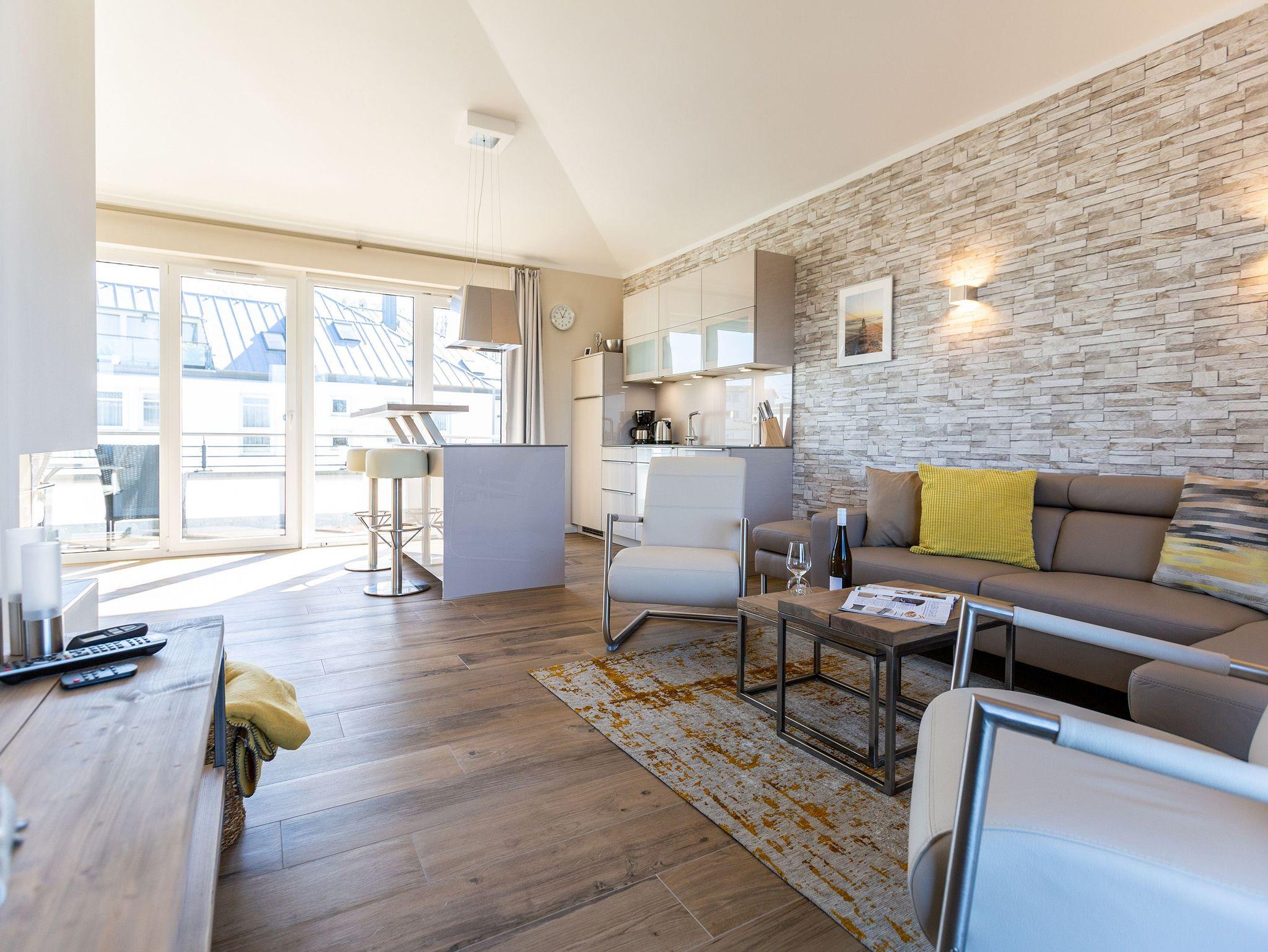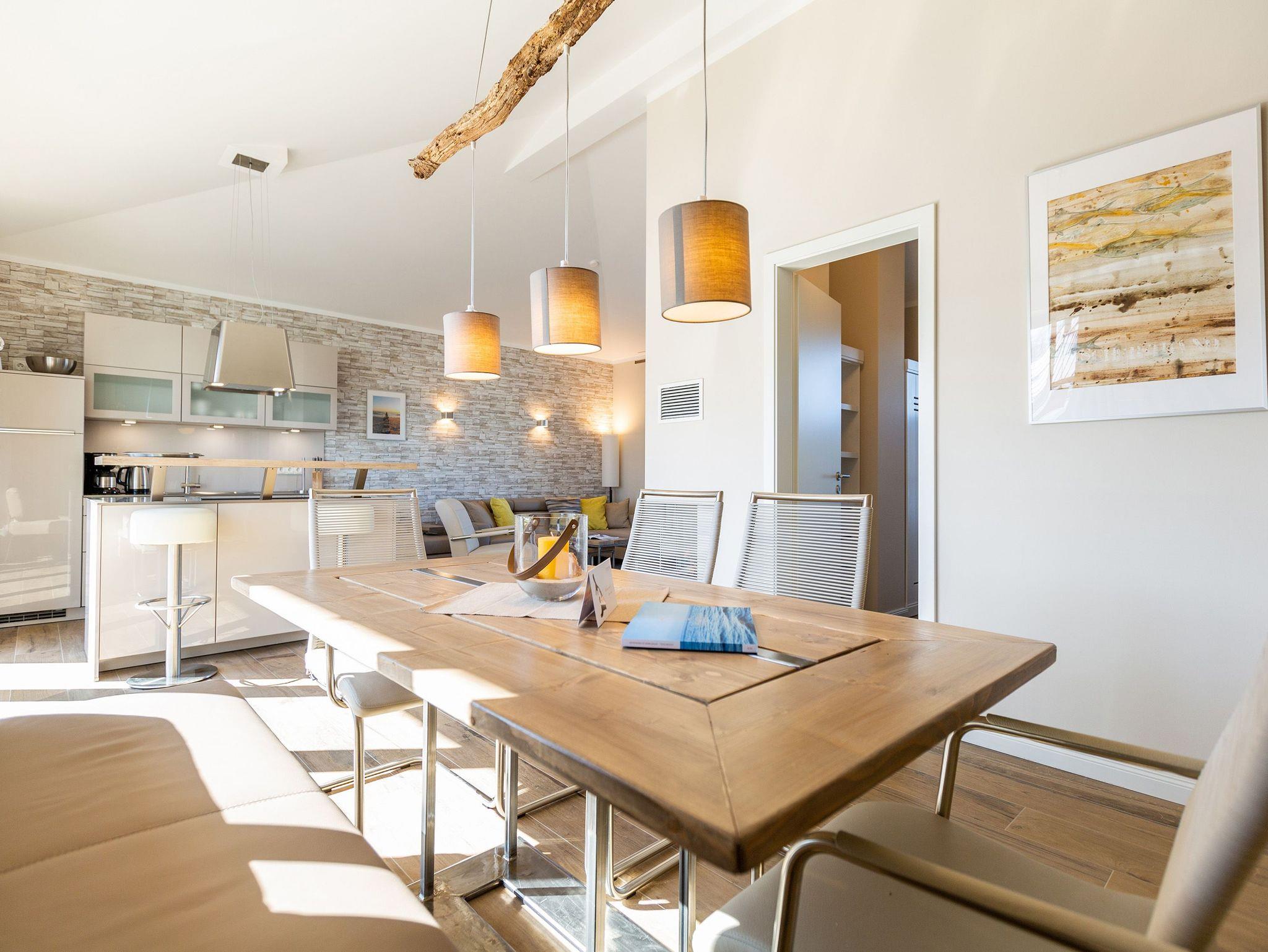 Viel Platz und ein modernes, stylisches Innendesign empfängt Ostseeliebhaber im Penthouse Nummer 5, direkt unter dem Dach des Quartiers am Fischerstrand. Der Fahrstuhl fährt Sie bis in die Wohnung. Hier können bis zu sechs Personen und zwei Kinder bis drei Jahre (im Kinderreisebett) einen schönen Urlaub verleben, denn das Appartement bietet auf seinen 105 Quadratmetern neben einem wunderschönen, offenen Wohn-Esszimmer gleich drei Schlafzimmer. Doch bevor Sie sich zur Ruhe betten, können Sie das helle und stilvoll eingerichtete Wohnzimmer mit Gas-Kamin und Flat-TV genießen. Das große Ledersofa und die Ledersessel sind komfortable Relaxlandschaften, die schnell wieder neue Energie geben. Naturmaterialien wie Holz und Leder geben dem Interieur ein rustikales und natürliches Flair. Die Nutzung des WLANs ist kostenfrei. Das Kochen wird in diesem Feriendomizil zu einem gemeinschaftlichen Event. Denn die frei stehende Kochinsel mit Tresen und Barhockern bietet sich geradezu an, daran gemeinsam zu schnippeln, zu köcheln und zu erzählen. Die offene Küche ist voll ausgestattet mit hochwertigen Markengeräten und feinem ASA-Geschirr. Zum Essen eignen sich der schöne Holztisch und die kultigen Freischwinger ideal. Ist das Wetter schön ? was auf Usedom oft der Fall ist -, kann das Dinner auch gern nach draußen auf den Balkon oder die wunderbar großzügige Sonnenterrasse verlegt werden. Knapp 21 Quadratmeter Wohlfühl-, Sonnentank- und Entspannungszone Richtung Süd-Westen lassen den Stress des Alltags schnell vergessen. Die beiden fast identischen, geräumigen Schlafzimmer verfügen über zwei komfortable Doppelbetten (1,80 m x 2,00 m), Flat-TVs und viel Ablagemöglichkeit. Im dritten Schlafzimmer steht ein Etagenbett (0,90 m x 2,00 m). Auch hier kann in den Schränken viel Urlaubsgepäck verstaut werden. Das schöne Tageslichtbad mit zwei Waschtischen, WC und Regendusche wird durch die Panoramasauna zu einem eigenen, kleinen Spa-Bereich. Entspannen Sie bei kuschelig warmen Temperaturen. In einem Hauswirtschaftraum stehen eine Waschmaschine und ein Trockner zur kostenfreien Nutzung zur Verfügung. Stress gibt es beim Frischmachen in diesem Penthouse nicht. Dafür sorgt ein zweites Badezimmer, in dem ebenfalls eine Regendusche, ein Waschtisch und ein WC vorhanden sind. Für das Rund-um-sorglos-Urlaubspaket sind die Betten bei der Anreise frisch bezogen und Handtücher liegen für Sie bereit. Zu der Wohnung gehören zwei hintereinander liegende Pkw-Stellplätze.