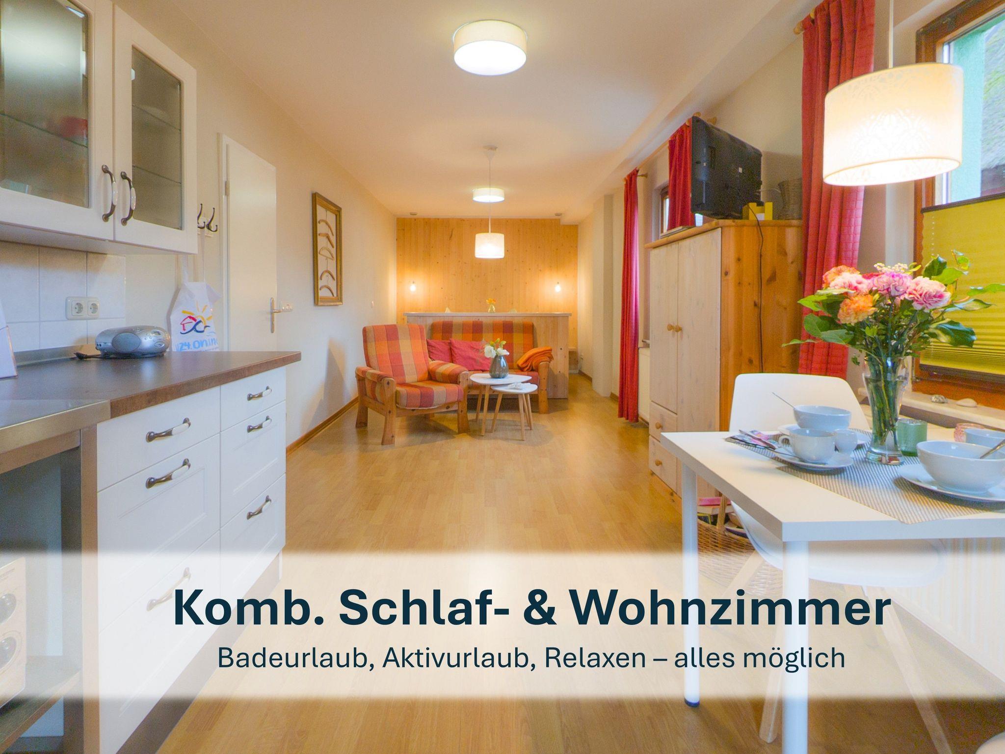 Die moderne 1-Raum-Wohnung bietet Ihnen eine durchdachte Kombination aus Schlaf-, Wohn- und Küchenbereich. Das bequeme Doppelbett, die gemütliche Couchsitzecke mit Flachbild-TV, Radio und kostenfreiem WLAN schaffen beste Voraussetzungen für entspannte Tage und Abende.