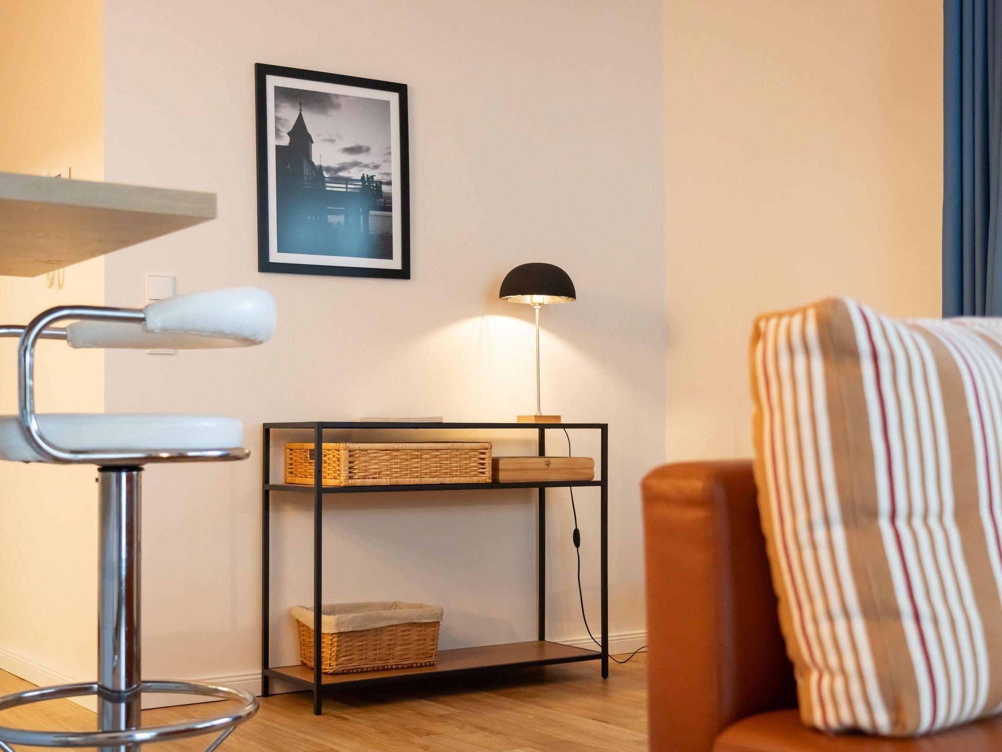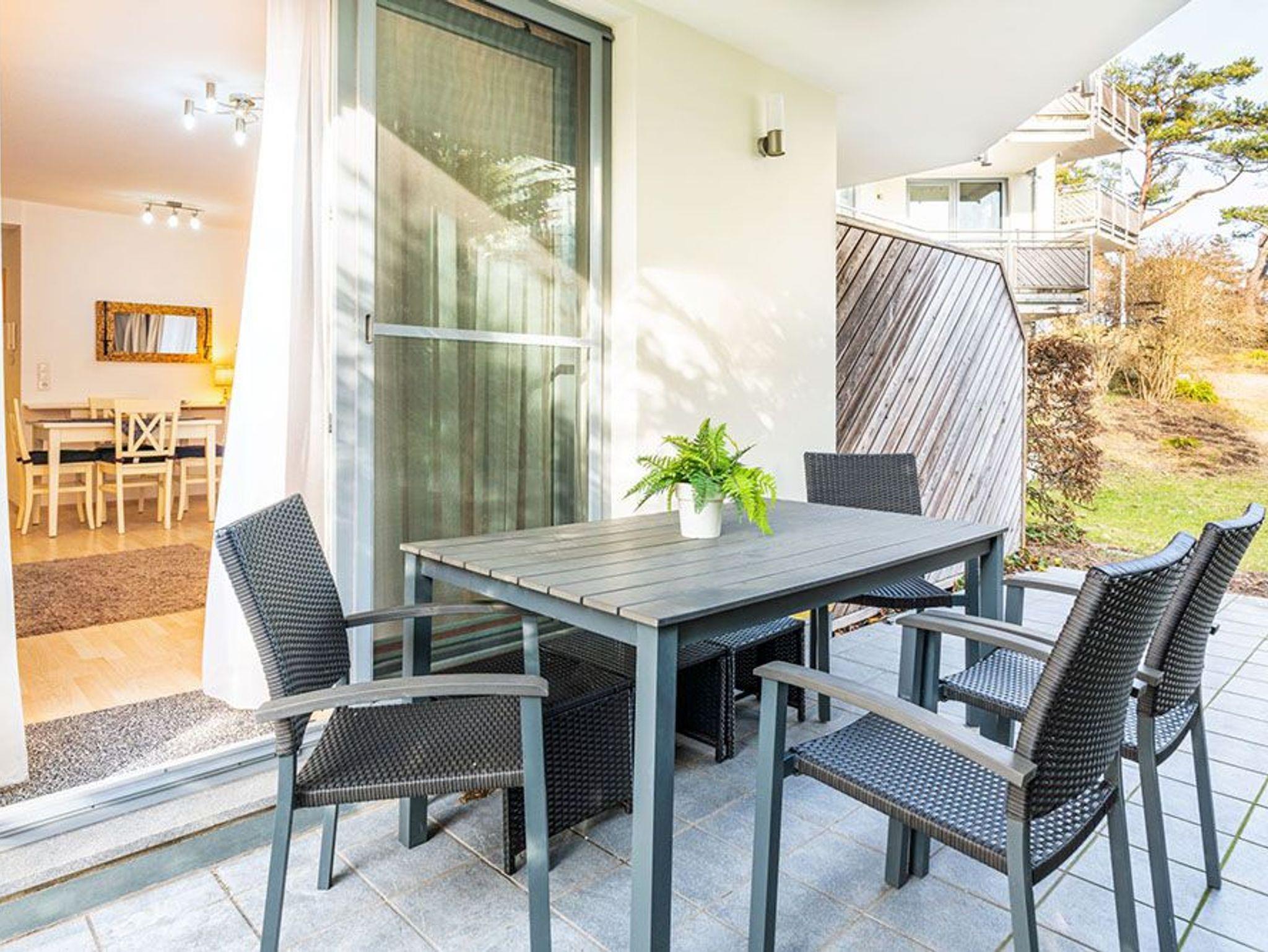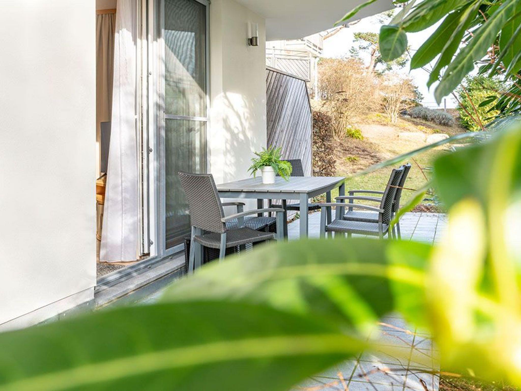 Modern und gemütlich zugleich: auf Ihrer Terrasse im Grünen können Sie bereits beim morgendlichen Kaffee den Wellen der Ostsee lauschen. Der stilvolle Wohnbereich verfügt über einen Flat-TV, ein komfortables Ecksofa und einen Couchtisch, der dank seiner höhenverstellbaren und ausziehbaren Funktionen leicht in einen zweiten Essbereich verwandelt werden kann. Die integrierte Küchenzeile ist für die Zubereitung Ihrer Lieblingsspeisen rundum ausgestattet (inkl. Ceranfeld, Backofen, Mikrowelle, Kühlschrank mit Gefrierfach, Geschirrspüler, Wasserkocher, Toaster und Kaffeemaschine). An dem großzügigem Essplatz kann die ganze Familie in geselliger Runde die zubereiteten Speisen genießen. Vom Wohnzimmer erreichen Sie Ihre private Terrasse, die zum Sonnenbaden oder zur abendlichen Spielrunde mit Blick ins Grüne einlädt. Das Schlafzimmer ist freundlich eingerichtet und mit einem bequemen Doppelbett (180x200cm) und verdunkelnden Gardinen ausgestattet. Für zwei weitere Urlaubsgäste kann die Schlafcouch im Wohnbereich für eine erholsame Nachtruhe und einen guten Start in den neuen Urlaubstag ausgezogen und als komfortable Schlafstätte genutzt werden.