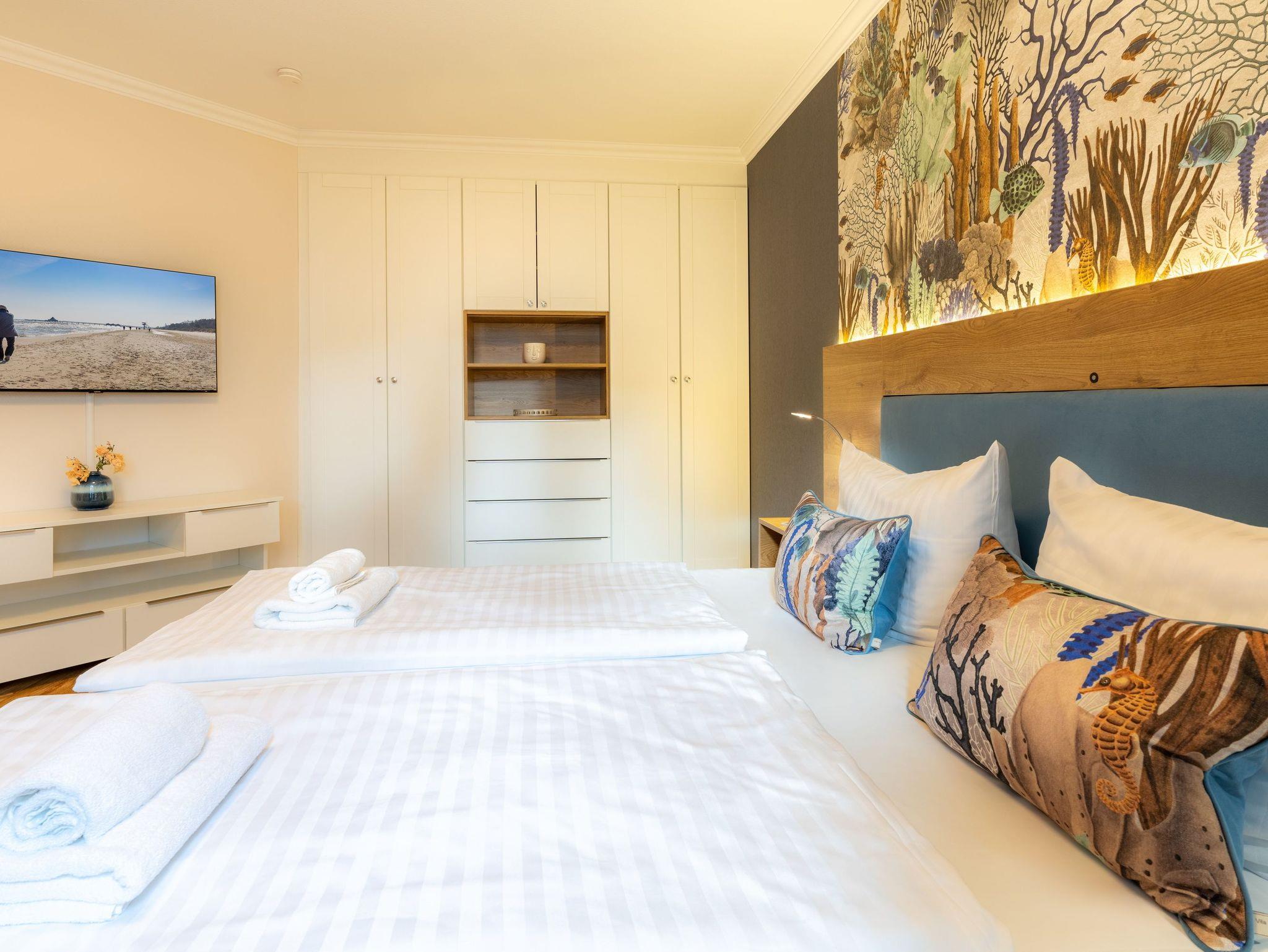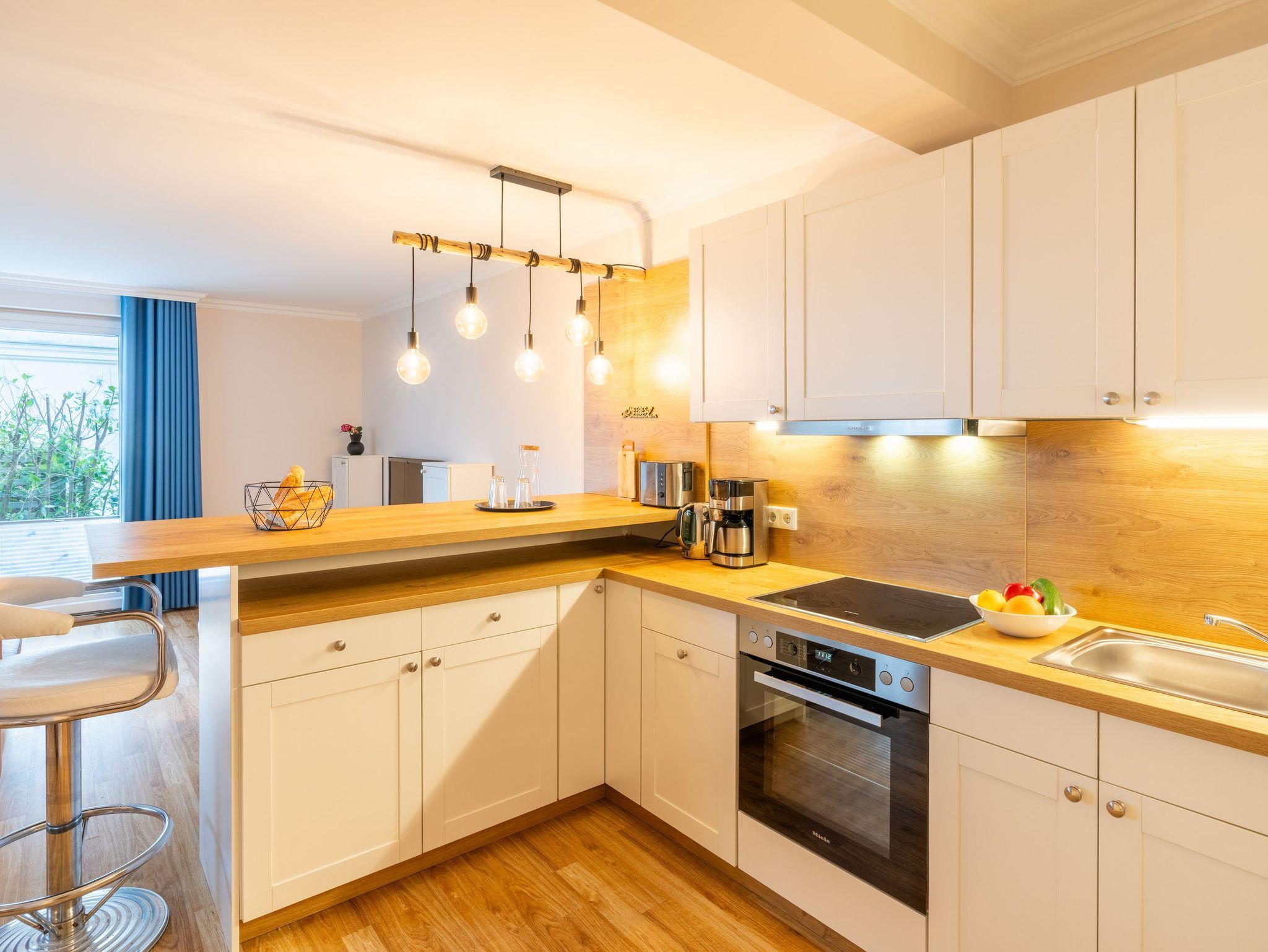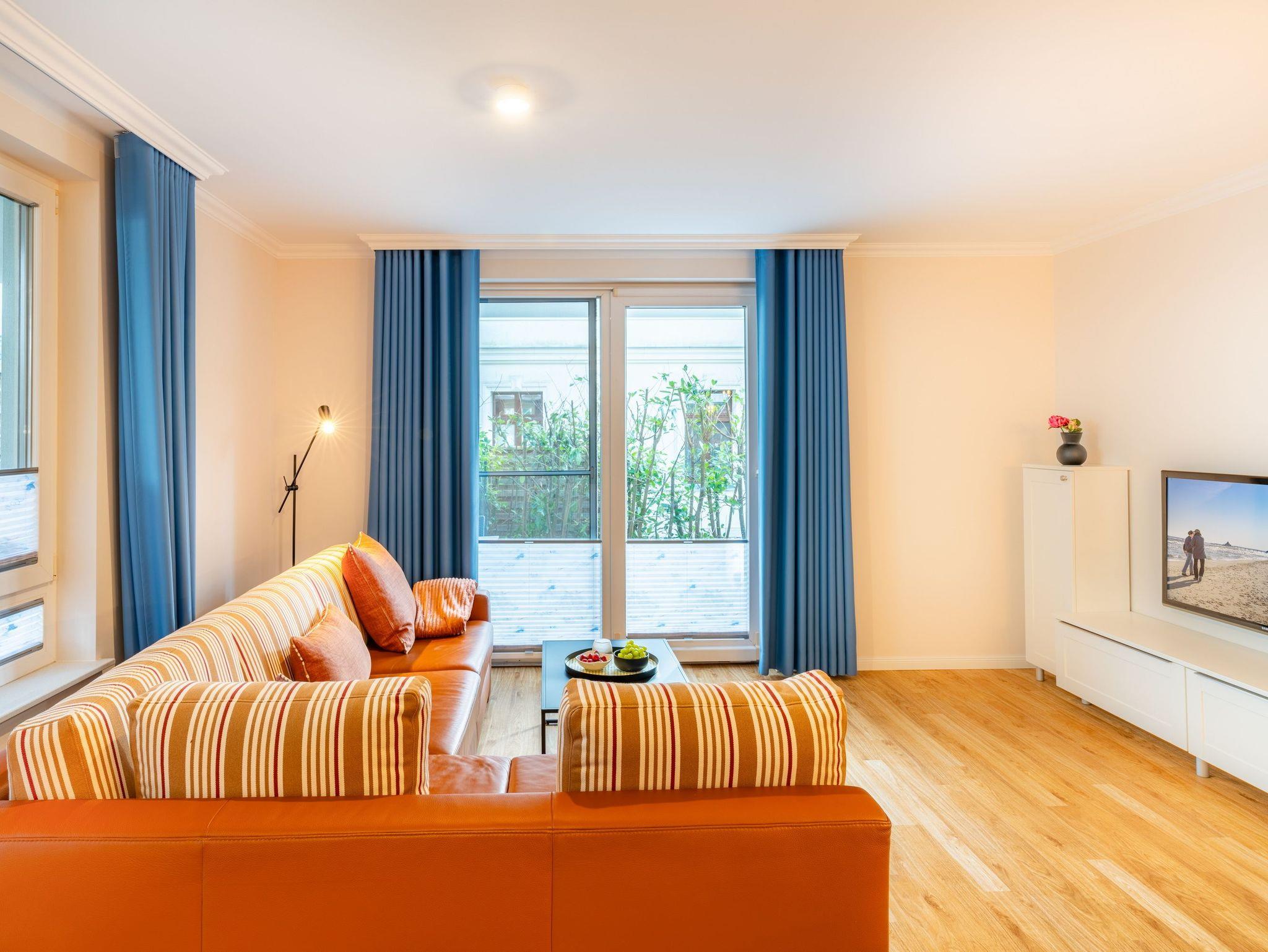 Modern und gemütlich zugleich: auf Ihrer Terrasse im Grünen können Sie bereits beim morgendlichen Kaffee den Wellen der Ostsee lauschen. Der stilvolle Wohnbereich verfügt über einen Flat-TV, ein komfortables Ecksofa und einen Couchtisch, der dank seiner höhenverstellbaren und ausziehbaren Funktionen leicht in einen zweiten Essbereich verwandelt werden kann. Die integrierte Küchenzeile ist für die Zubereitung Ihrer Lieblingsspeisen rundum ausgestattet (inkl. Ceranfeld, Backofen, Mikrowelle, Kühlschrank mit Gefrierfach, Geschirrspüler, Wasserkocher, Toaster und Kaffeemaschine). An dem großzügigem Essplatz kann die ganze Familie in geselliger Runde die zubereiteten Speisen genießen. Vom Wohnzimmer erreichen Sie Ihre private Terrasse, die zum Sonnenbaden oder zur abendlichen Spielrunde mit Blick ins Grüne einlädt. Das Schlafzimmer ist freundlich eingerichtet und mit einem bequemen Doppelbett (180x200cm) und verdunkelnden Gardinen ausgestattet. Für zwei weitere Urlaubsgäste kann die Schlafcouch im Wohnbereich für eine erholsame Nachtruhe und einen guten Start in den neuen Urlaubstag ausgezogen und als komfortable Schlafstätte genutzt werden.