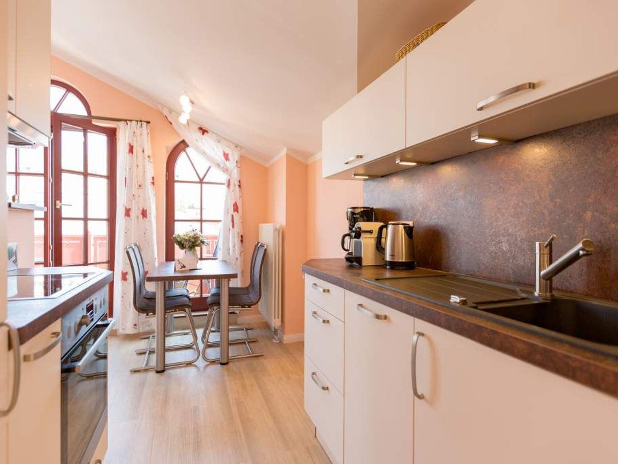 Diese stilvolle und elegante Ferienwohnung direkt unter dem Dach der Villa Damaris wartet gleich mit drei Balkonen auf. Und sie alle geben einen Blick auf die mit viel Grün und wunderschönen alten Bädervillen versehene Umgebung frei. Hier können Sie schon morgens Sonne tanken und die salzige Ostseeluft tief in sich einatmen. Das kleine, urgemütliche Urlaubsreich unter Dachschrägen bietet auf seinen 60 Quadratmetern Platz für bis zu vier Personen und ein Kleinkind (im Kinderreisebett). Das offene Wohn-Esszimmer ist großzügig geschnitten und durch die große Fensterfront, die hinaus auf einen der drei Balkone führt, wunderbar luftig und hell. Ein harmonisches Farbkonzept und eine stilvolle Einrichtung sorgen für eine entspannte Urlaubsatmosphäre. Auf der roten Sofalandschaft erhält der Begriff Behaglichkeit eine neue Bedeutung. Denn sie eignet sich ideal zum Runterkommen und Entspannen. Das Zimmer verfügt über einen großen Flat-TV. Am schönen Essplatz lässt es sich ausgiebig schlemmen, spielen oder plaudern. Für die Zubereitung der Speisen findet sich alles Notwendige in der offenen und voll ausgestatteten Küche. Jedes der beiden Schlafzimmer verfügt über ein bequemes Doppelbett, einen geräumigen Kleiderschrank und einen eigenen kleinen Balkon. Eines der beiden Zimmer hat auch einen Flat-TV. Im Bad stehen Ihnen ein Waschtisch und ein WC zur Verfügung. Die ebenerdige Regendusche ist so groß, dass Sie darin bequem zu Zweit Duschspaß haben können. In der Wohnung gibt es WLAN, das Sie kostenfrei nutzen dürfen. Damit der Urlaub rundum sorgenfrei ist, haben wir die Betten bei Ihrer Ankunft schon bezogen und Handtücher liegen bereit. Am haus befindet sich zudem ein Pkw-Stellplatz.