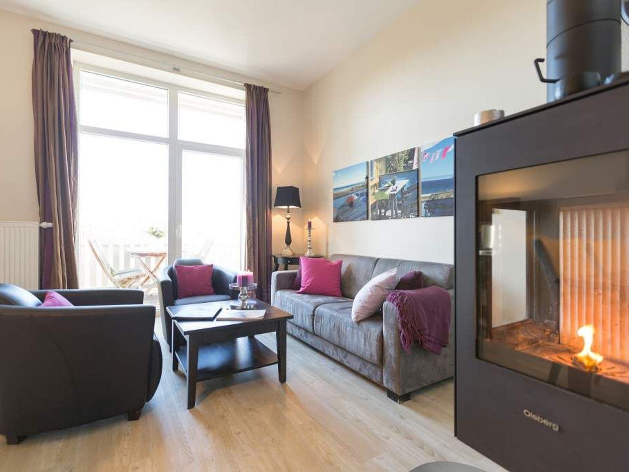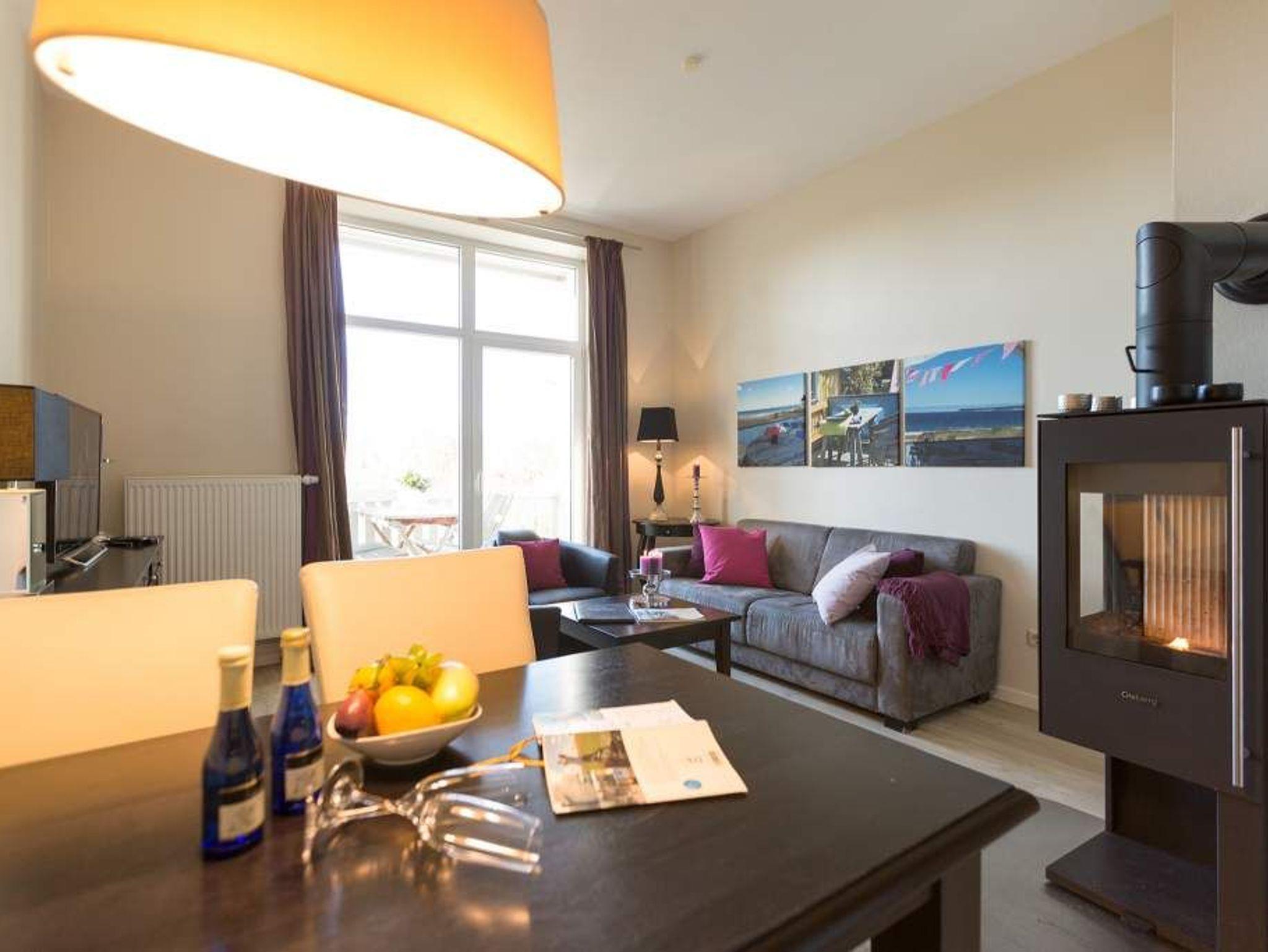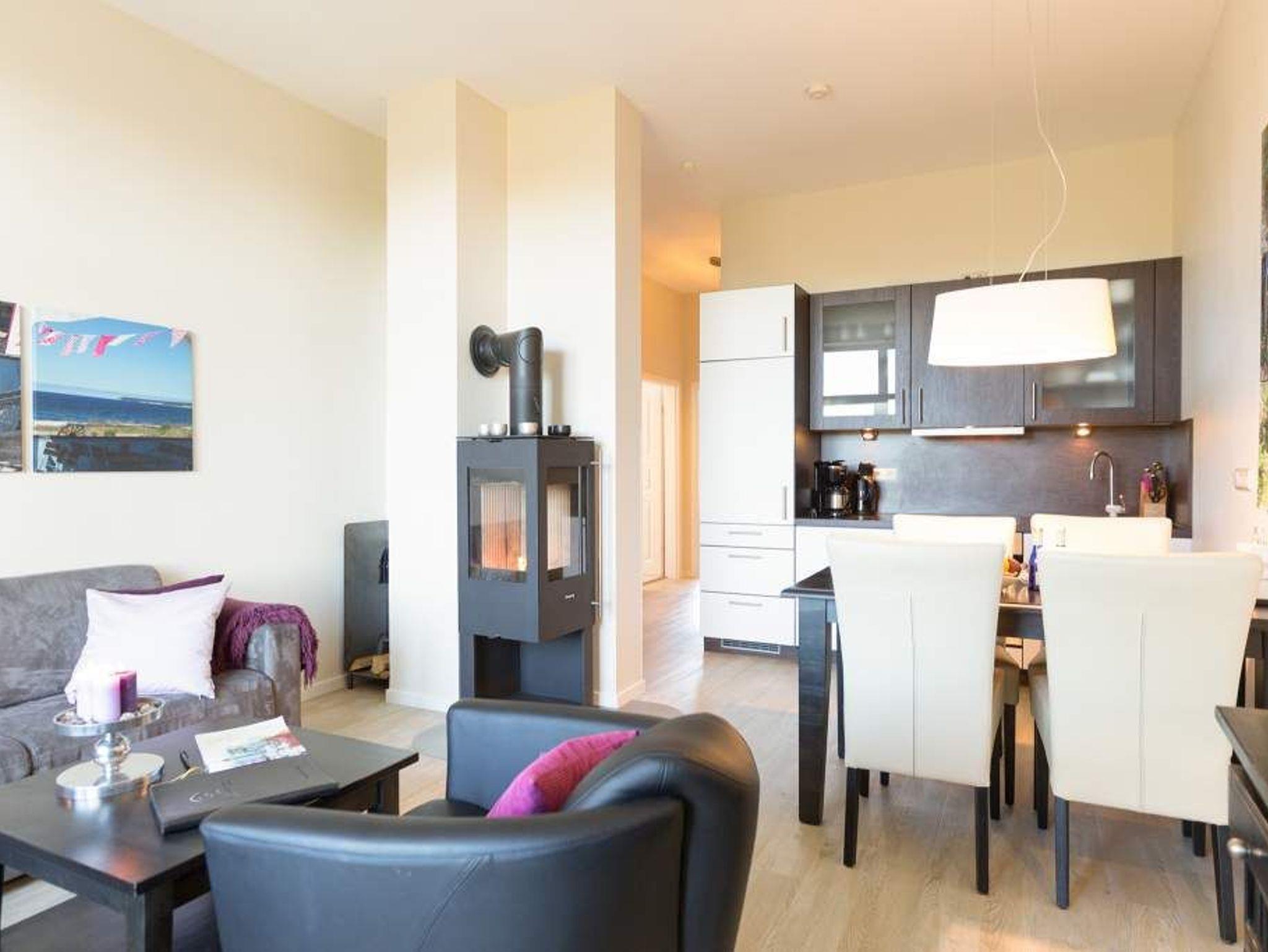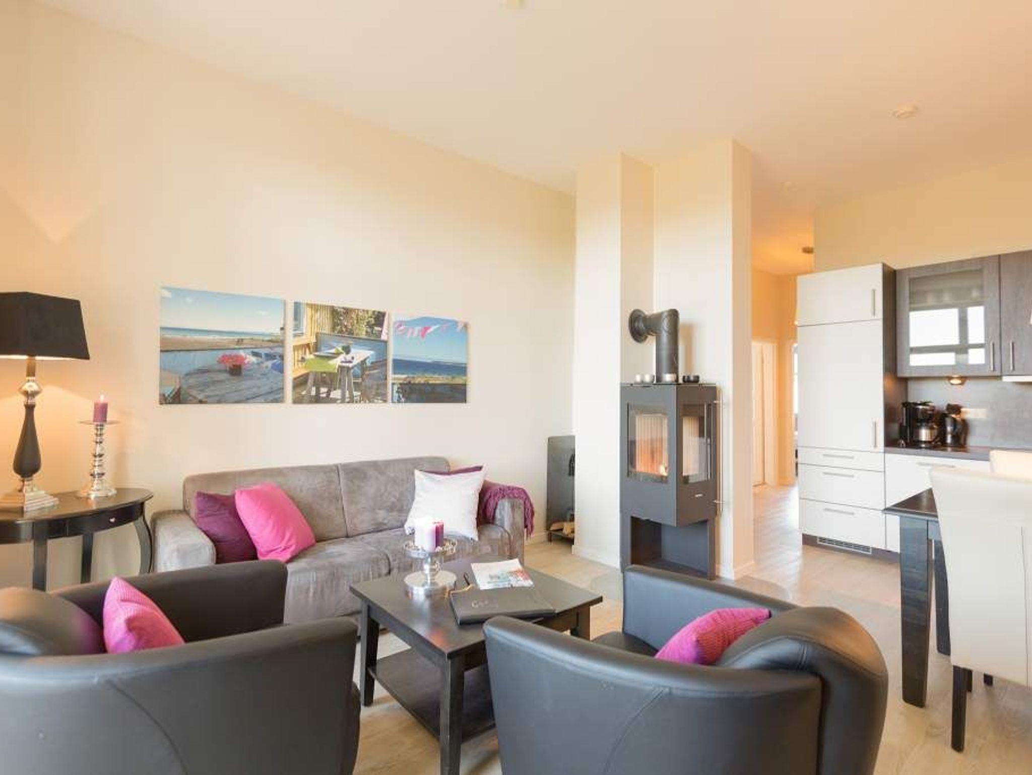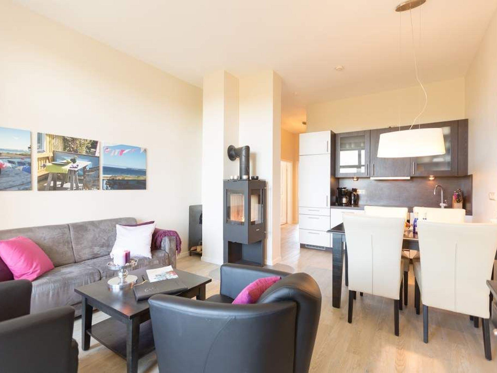 Stylische Farben und ein moderner Look versprühen sofort das passende Urlaubsfeeling. Die schöne 3-Raum-Ferienwohnung (75 qm) befindet sich im 1. Obergeschoss des Hauses und bietet Platz für 4 Erwachsene und ein Kleinkind bis 3 Jahre. An den Wohnbereich mit bequemer Sitzgruppe und schönen Kaminofen schließt sich die offene Küche mit Essplatz an. Auf dem Südbalkon lässt es sich besonders gut relaxen und man genießt den Blick ins Grüne. Die beiden Schlafzimmer mit Doppelbetten und TV, ein Bad mit Dusche und WC und ein Gäste-WC ergänzen die Wohnung. Für die Wohnung steht ein PKW-Stellplatz zur Verfügung. Ein WLAN-Netz im Haus kann kostenfrei genutzt werden. Auf Wunsch stellen wir für unsere kleinen Gäste ein Kinderreisebett (ohne zusätzliche Matratze [&] Bettzeug) und einen Kinderhochstuhl ( gegen einen Aufpreis) zur Verfügung. Für Ihren Komfort sind die Betten bei der Anreise bezogen und Handtücher liegen bereit (Erstausstattung). Für den Tag am Meer steht Ihnen als besonderes Bonbon von Mitte Mai bis Ende September (je nach Witterung) ein Strandkorb am Strand kostenlos zur Verfügung.