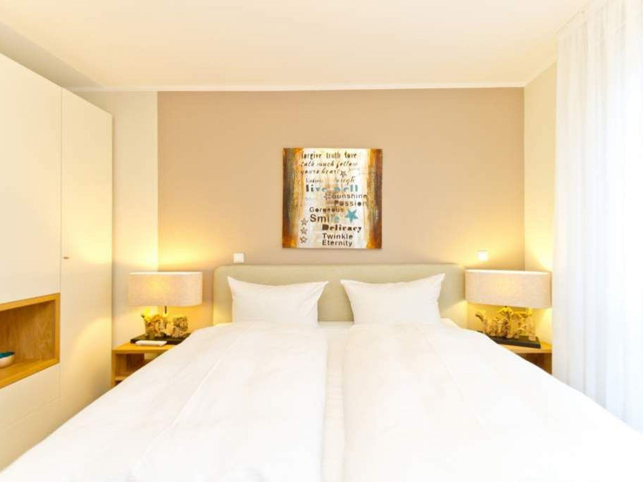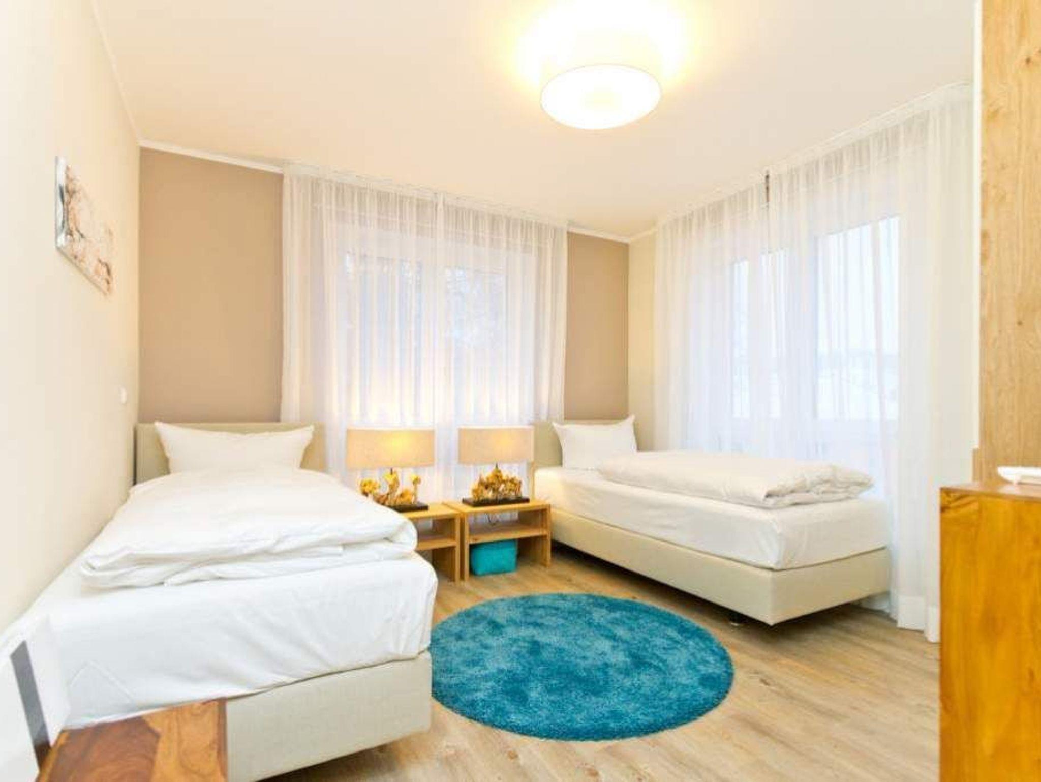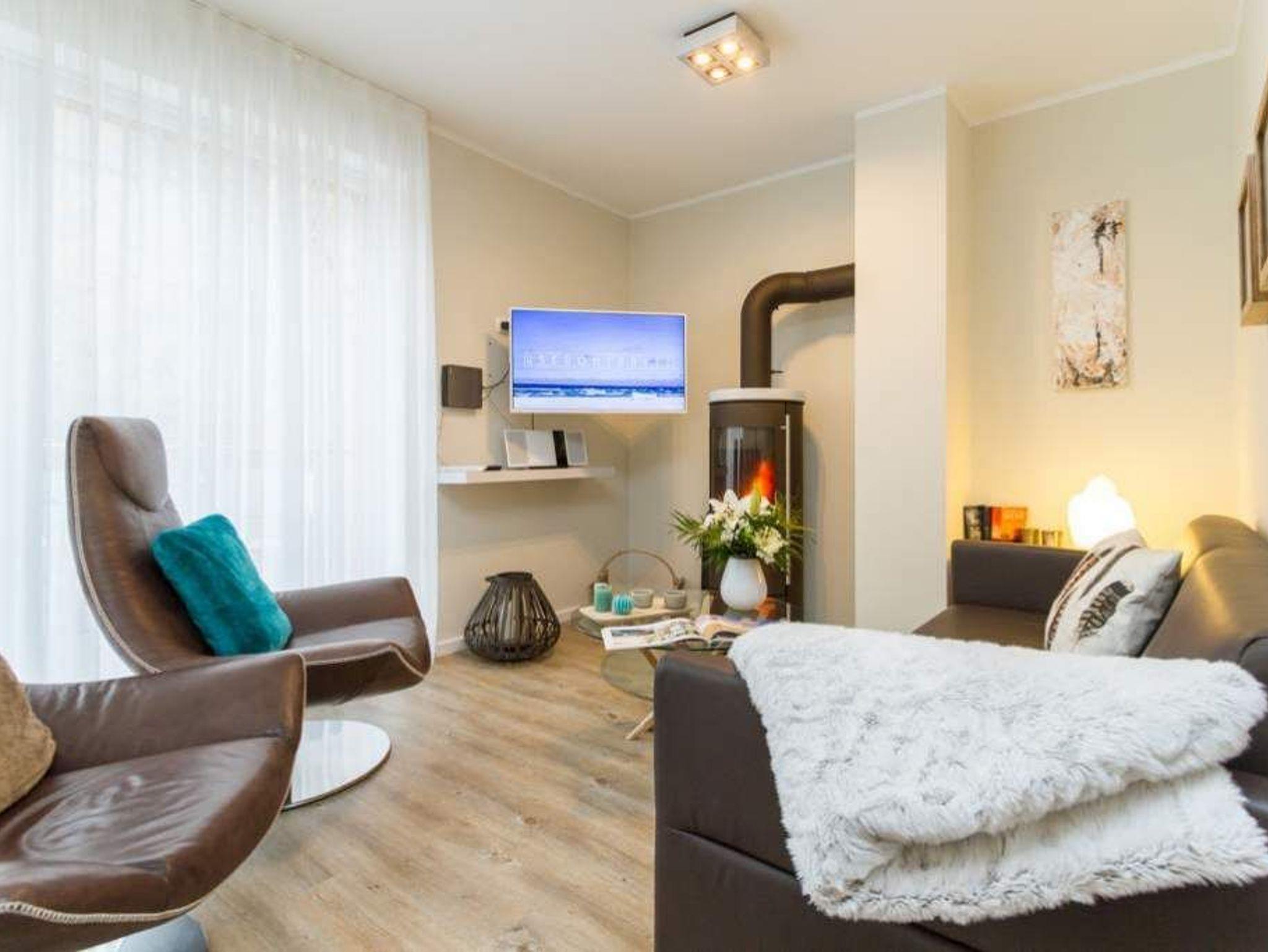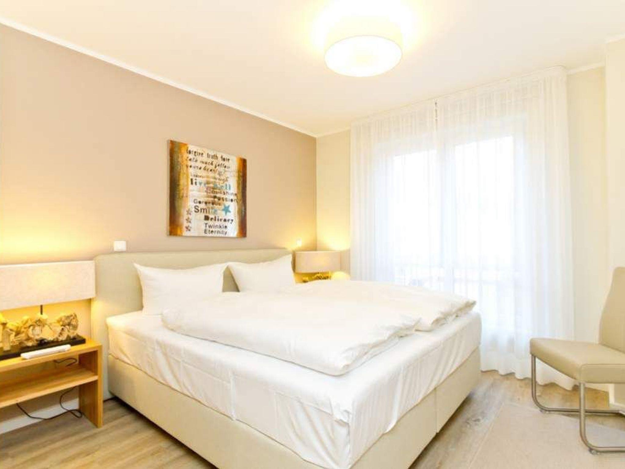 Im ersten Obergeschoss der neuen Villa Limora erwartet Sie eine wunderschön gestaltete 3-Raum-Ferienwohnung (65 qm) für bis zu 4 Personen (inkl. Kleinkind). Harmonisch abgestimmte Farben und Stoffe und hochwertige Möblierung gepaart mit stilvollen Details lassen hier die Arbeit der Innenarchitektin erkennen. Der Wohnbereich mit bequemer Sitzgruppe, Flat-TV und Kaminofen schließt sich an die komplett ausgestattete Küchenzeile mit Essplatz an. Zwei Schlafzimmer mit Boxspringbetten (1.SZ: Doppelbett 1,80x 2,00m/ 2. SZ: zwei Einzelbetten je 0,9x2,00m, hier passt auch ein Babyreisebett) und jeweils Flat-TV sorgen für erholsame Nächte. Das schöne Bad mit Glasdusche und WC wird durch ein zusätzliches Gäste-WC ergänzt. Auch der schöne, großzügige Süd- Balkon mit Gartenmöbel lädt zum Relaxen ein. In der Tiefgarage (Stellplatz 3) steht ein Pkw-Stellplatz zur Verfügung. Das WLAN- Netz in der Wohnung ist kostenfrei nutzbar.