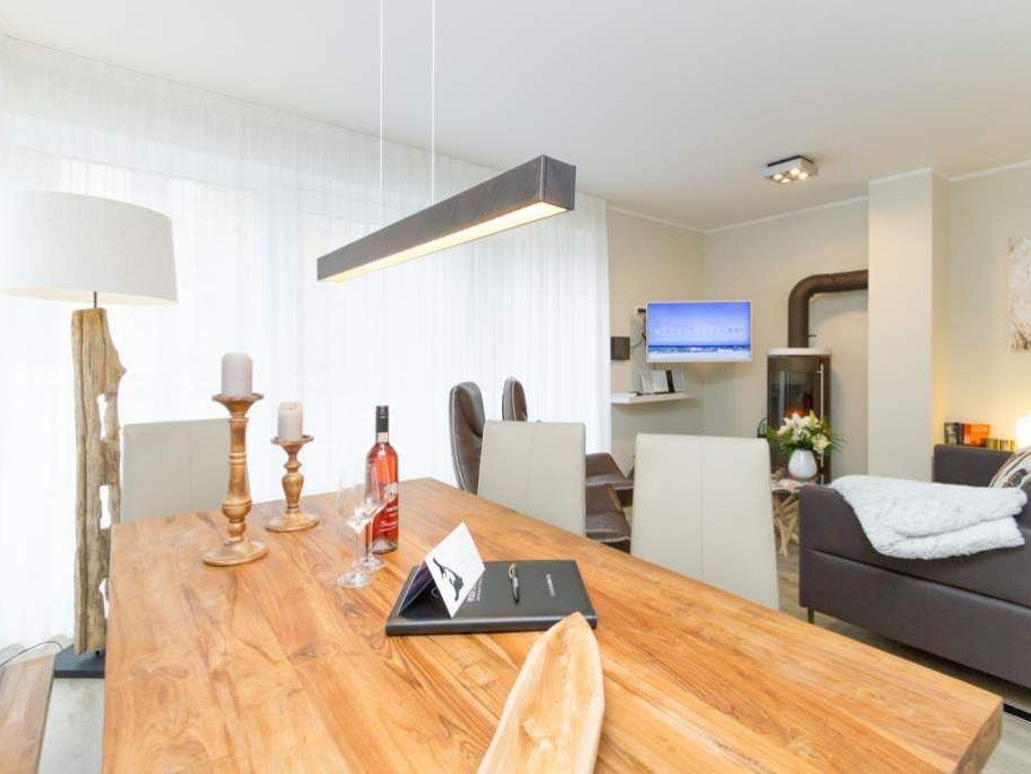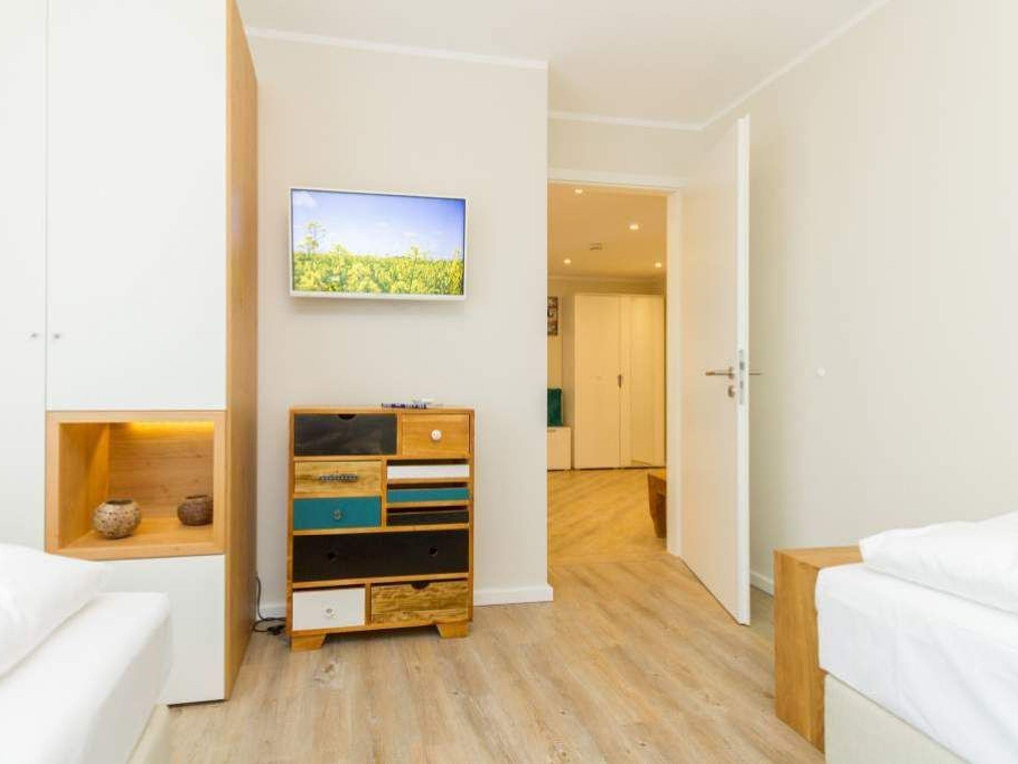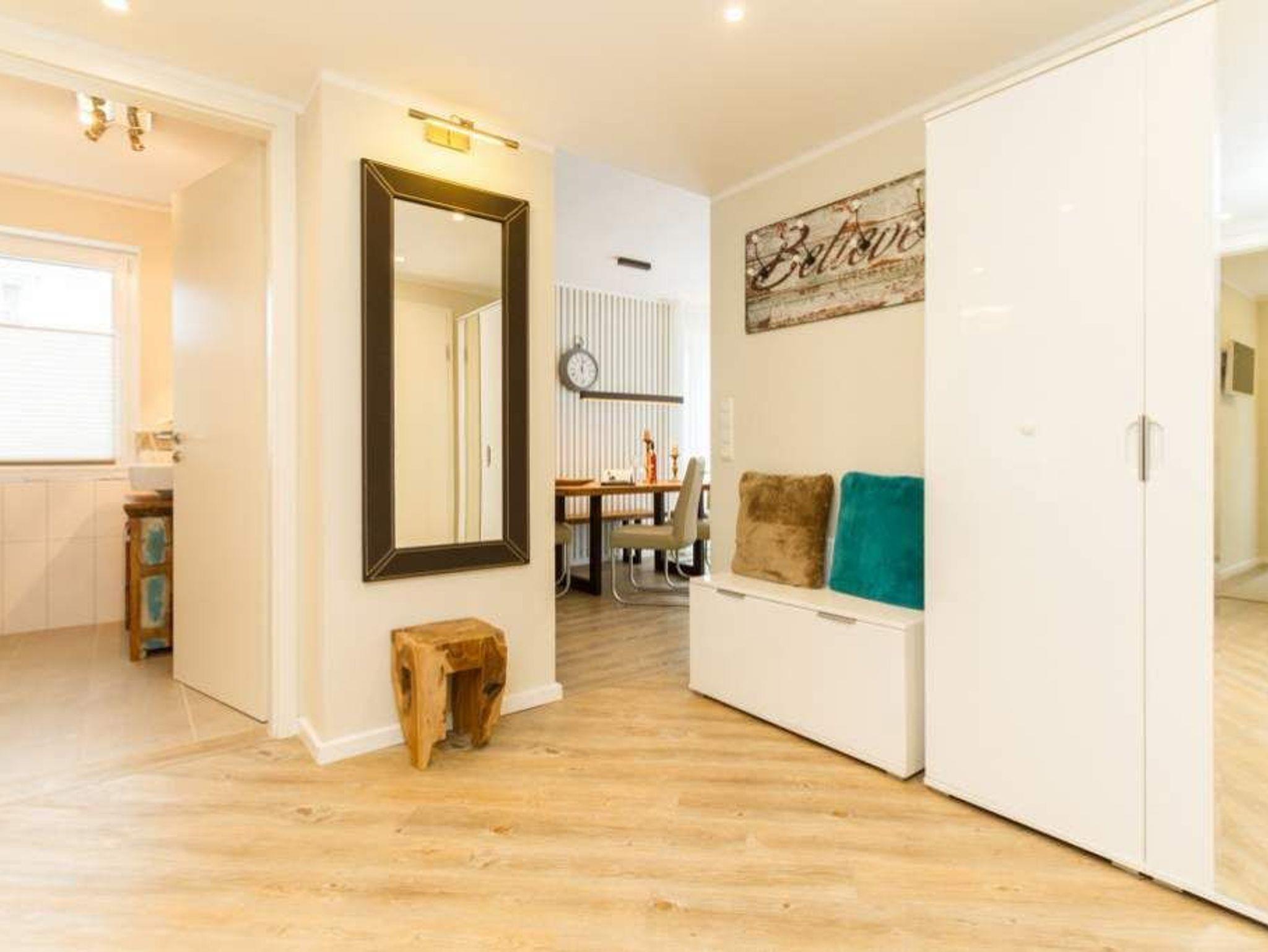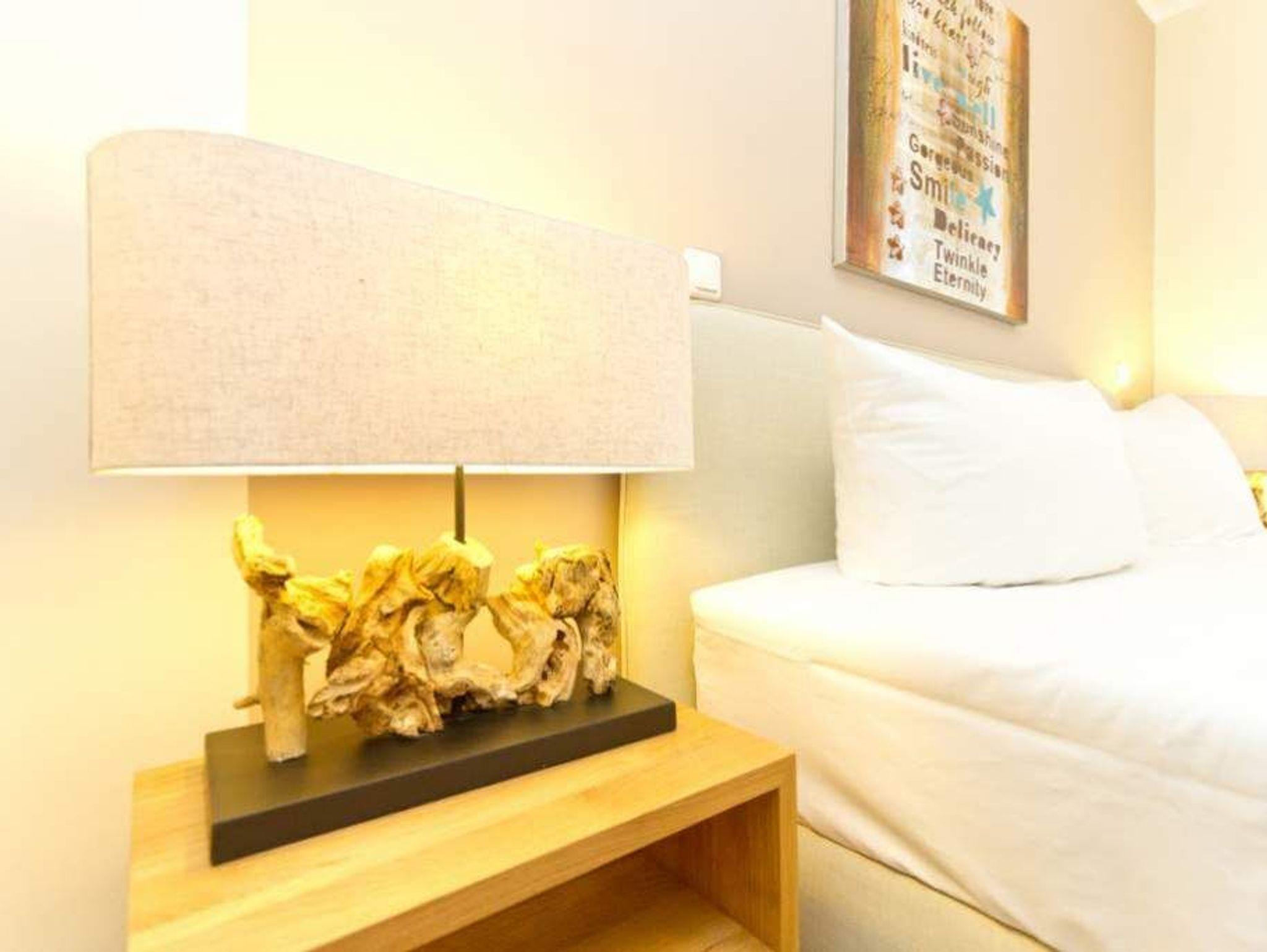 Im ersten Obergeschoss der neuen Villa Limora erwartet Sie eine wunderschön gestaltete 3-Raum-Ferienwohnung (65 qm) für bis zu 4 Personen (inkl. Kleinkind). Harmonisch abgestimmte Farben und Stoffe und hochwertige Möblierung gepaart mit stilvollen Details lassen hier die Arbeit der Innenarchitektin erkennen. Der Wohnbereich mit bequemer Sitzgruppe, Flat-TV und Kaminofen schließt sich an die komplett ausgestattete Küchenzeile mit Essplatz an. Zwei Schlafzimmer mit Boxspringbetten (1.SZ: Doppelbett 1,80x 2,00m/ 2. SZ: zwei Einzelbetten je 0,9x2,00m, hier passt auch ein Babyreisebett) und jeweils Flat-TV sorgen für erholsame Nächte. Das schöne Bad mit Glasdusche und WC wird durch ein zusätzliches Gäste-WC ergänzt. Auch der schöne, großzügige Süd- Balkon mit Gartenmöbel lädt zum Relaxen ein. In der Tiefgarage (Stellplatz 3) steht ein Pkw-Stellplatz zur Verfügung. Das WLAN- Netz in der Wohnung ist kostenfrei nutzbar.