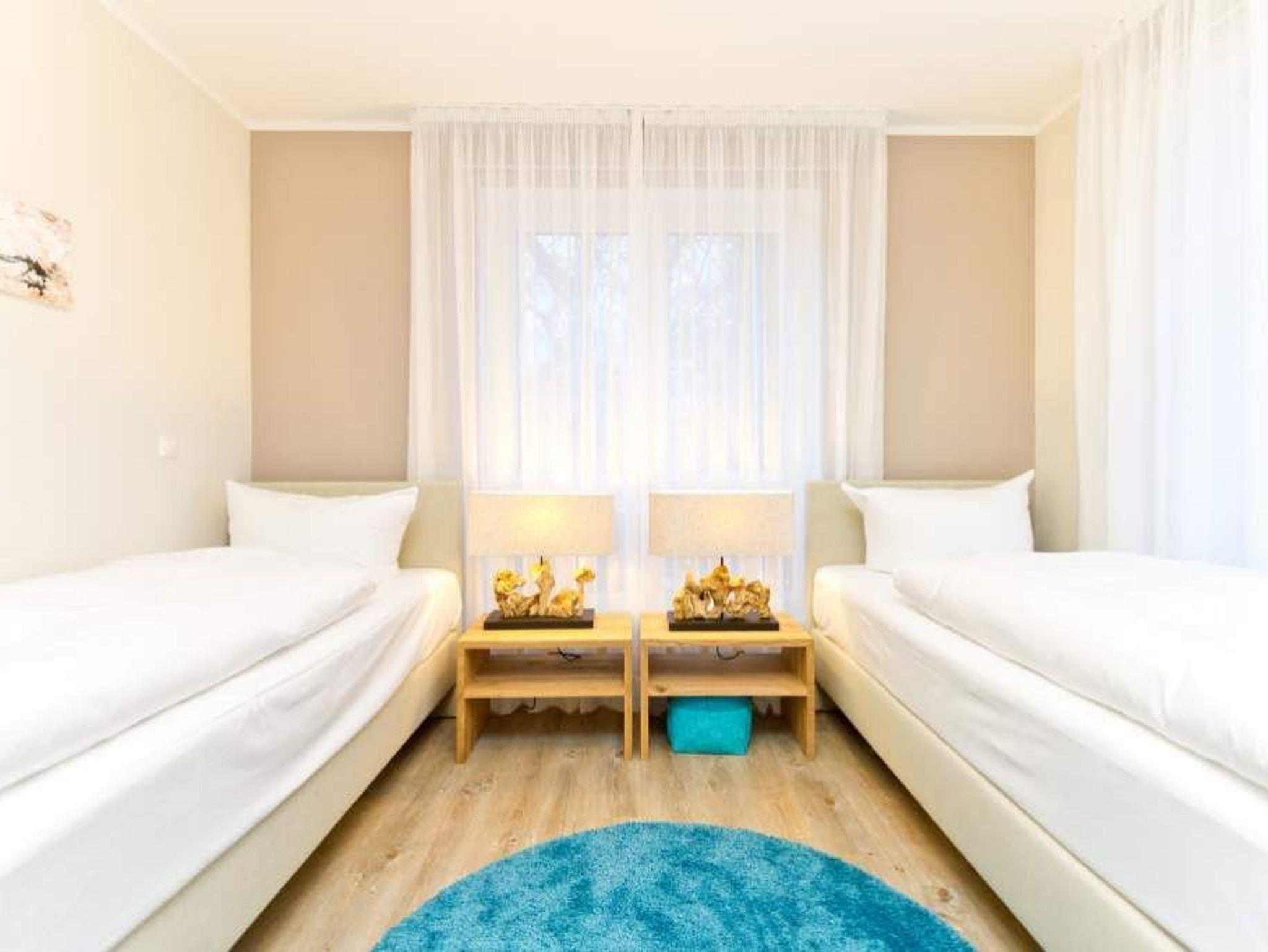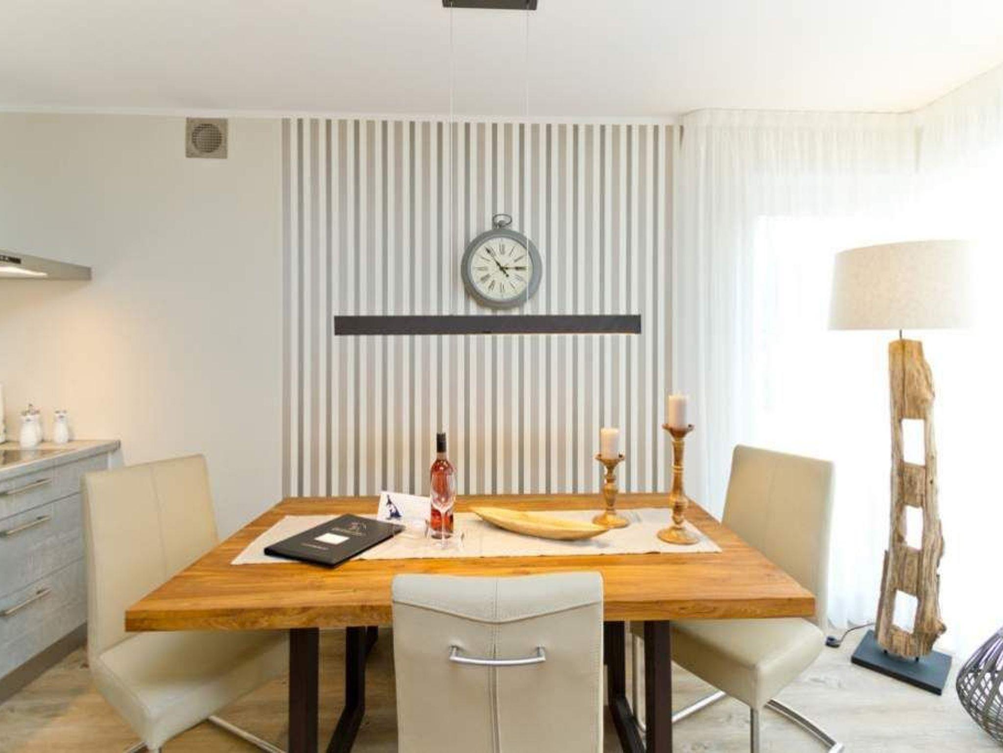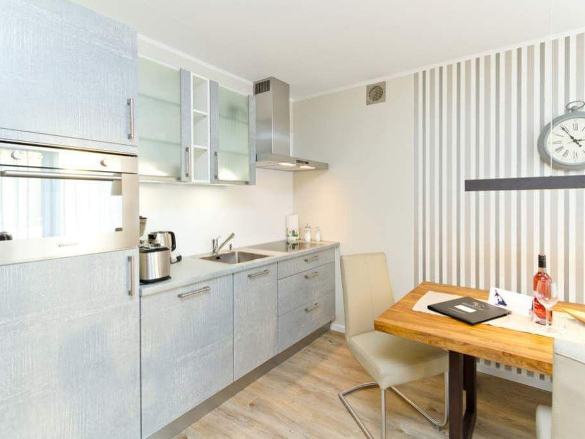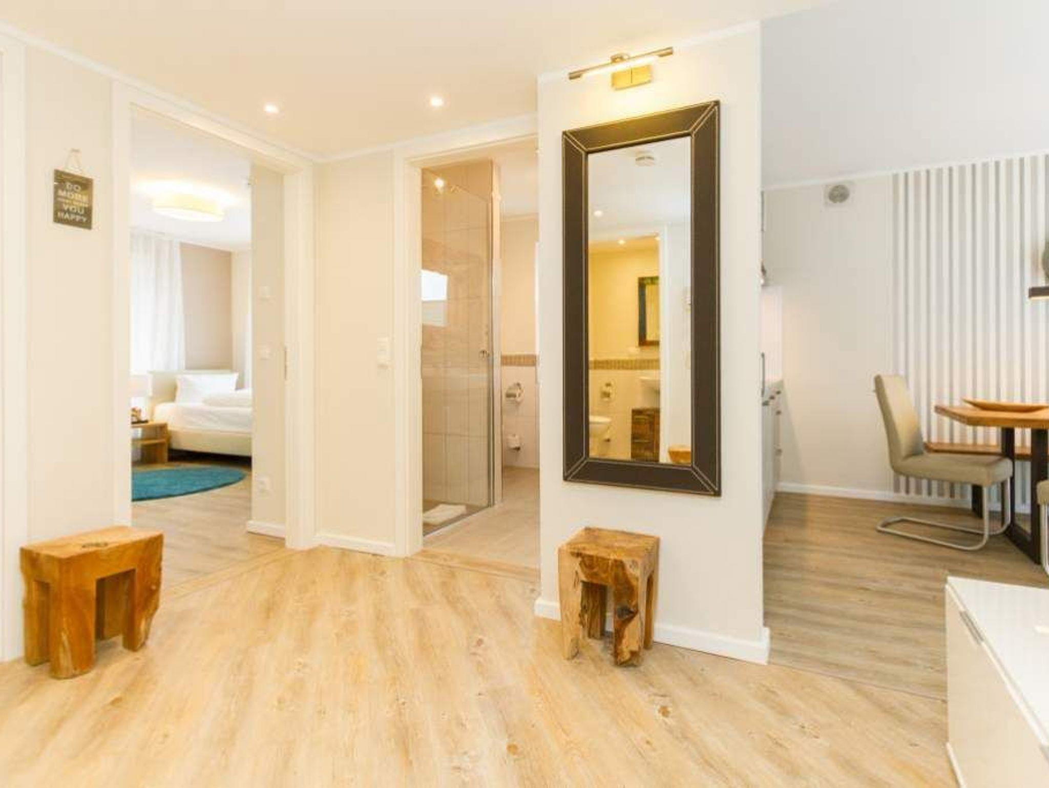 Im ersten Obergeschoss der neuen Villa Limora erwartet Sie eine wunderschön gestaltete 3-Raum-Ferienwohnung (65 qm) für bis zu 4 Personen (inkl. Kleinkind). Harmonisch abgestimmte Farben und Stoffe und hochwertige Möblierung gepaart mit stilvollen Details lassen hier die Arbeit der Innenarchitektin erkennen. Der Wohnbereich mit bequemer Sitzgruppe, Flat-TV und Kaminofen schließt sich an die komplett ausgestattete Küchenzeile mit Essplatz an. Zwei Schlafzimmer mit Boxspringbetten (1.SZ: Doppelbett 1,80x 2,00m/ 2. SZ: zwei Einzelbetten je 0,9x2,00m, hier passt auch ein Babyreisebett) und jeweils Flat-TV sorgen für erholsame Nächte. Das schöne Bad mit Glasdusche und WC wird durch ein zusätzliches Gäste-WC ergänzt. Auch der schöne, großzügige Süd- Balkon mit Gartenmöbel lädt zum Relaxen ein. In der Tiefgarage (Stellplatz 3) steht ein Pkw-Stellplatz zur Verfügung. Das WLAN- Netz in der Wohnung ist kostenfrei nutzbar.