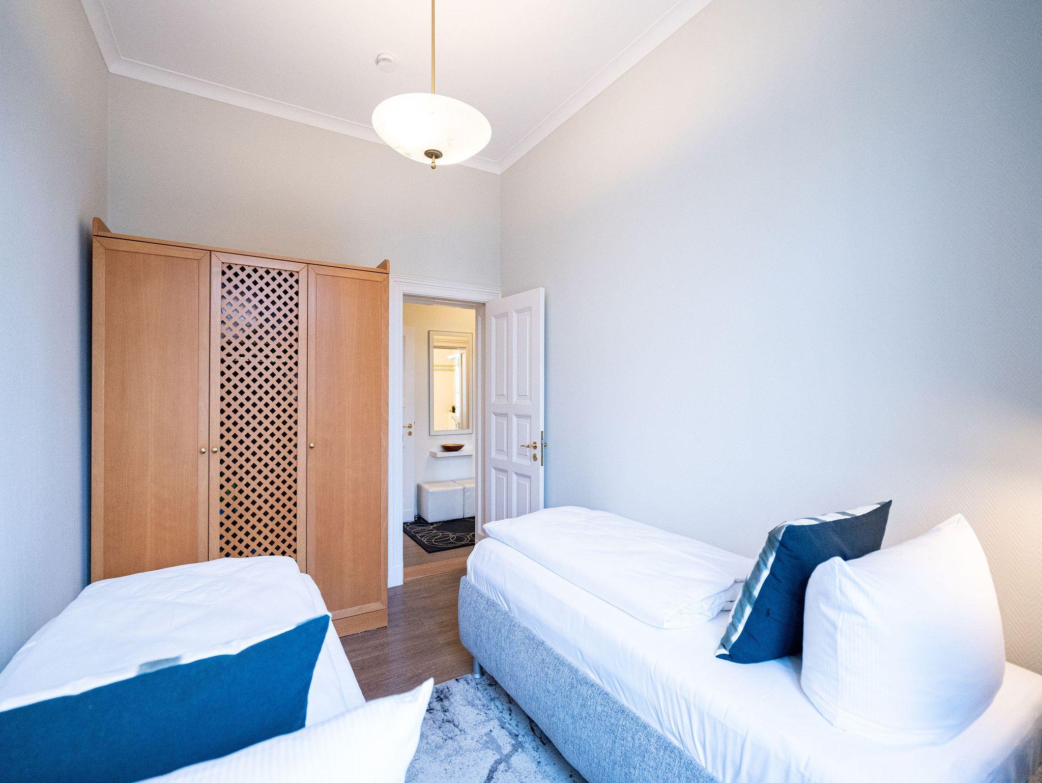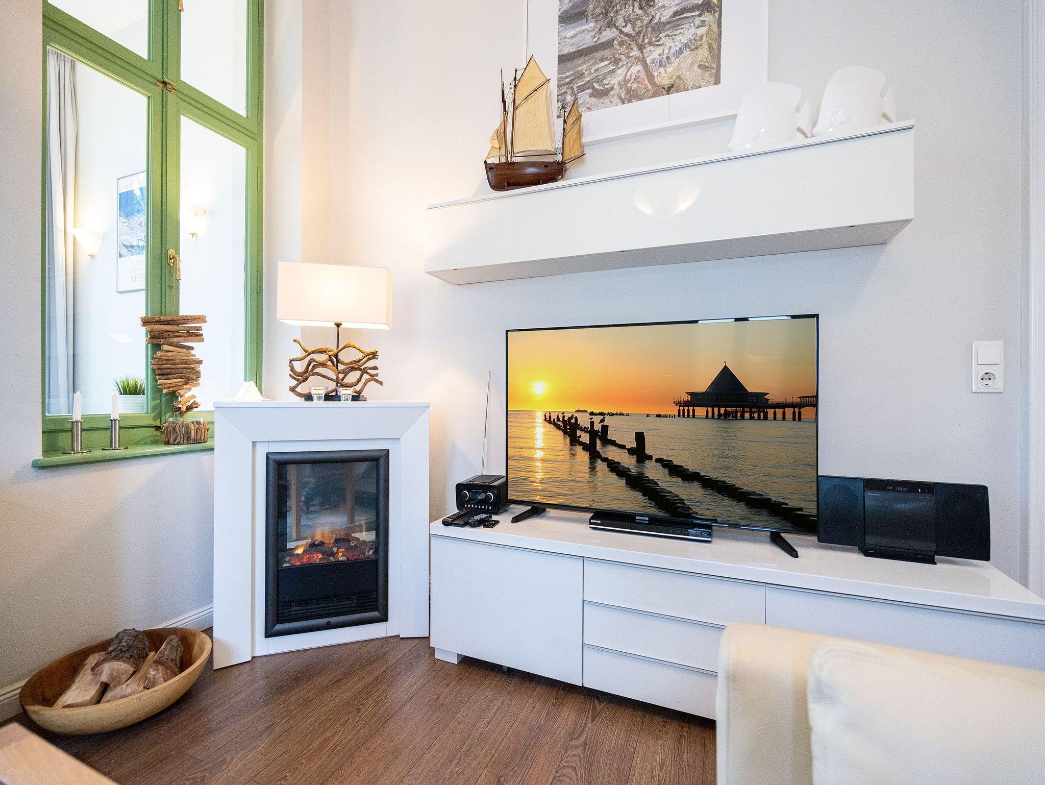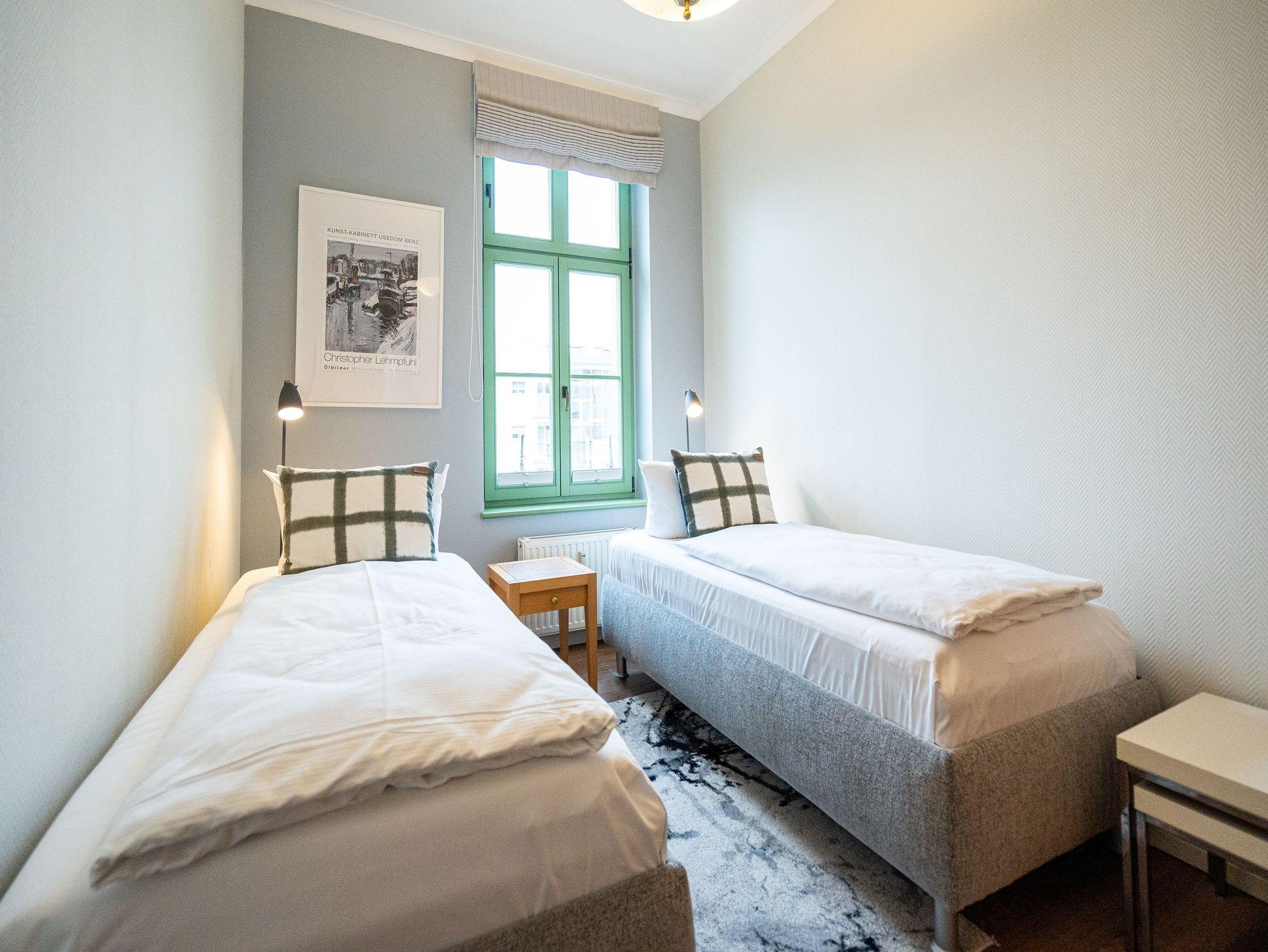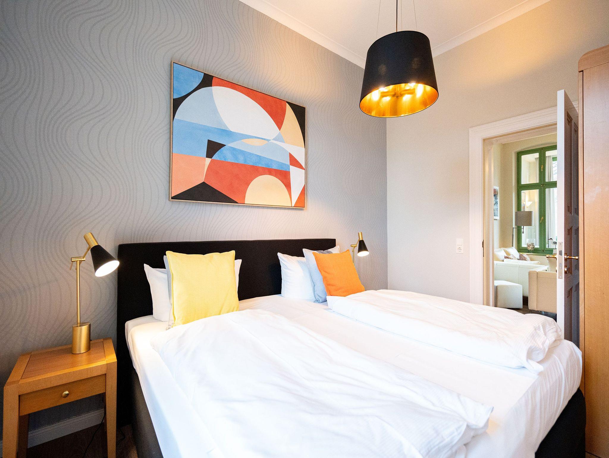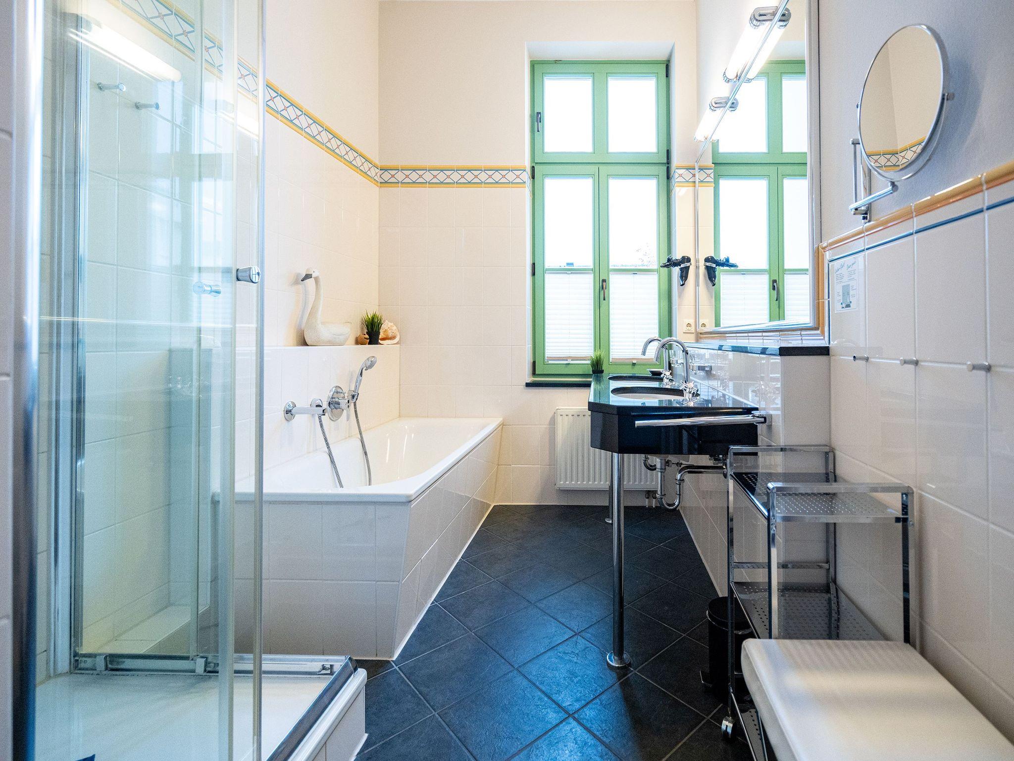 Die 3-Raum-Ferienwohnung im 1. Obergeschoss empfängt Sie mit Stil, Charme und einer Atmosphäre zum Wohlfühlen. Der helle Wohnbereich mit gemütlicher Sitzgruppe geht fließend in die komplett ausgestattete Küchenzeile über. In der verglasten Veranda genießen Sie Ihre Mahlzeiten in angenehmem Licht. Zwei geschmackvolle Schlafzimmer mit hochwertigen Boxspringbetten ( 1x Doppel- [&] 1x zwei Einzelbetten) versprechen erholsame Nächte. Das großzügige Bad mit Badewanne, Dusche und Doppelwaschbecken rundet den Komfort ab. Bettwäsche und Handtücher sind bei Anreise bereits bezogen. WLAN und ein Pkw-Stellplatz stehen kostenfrei zur Verfügung. Kinderbett und Hochstuhl sind auf Wunsch gegen Aufpreis erhältlich.