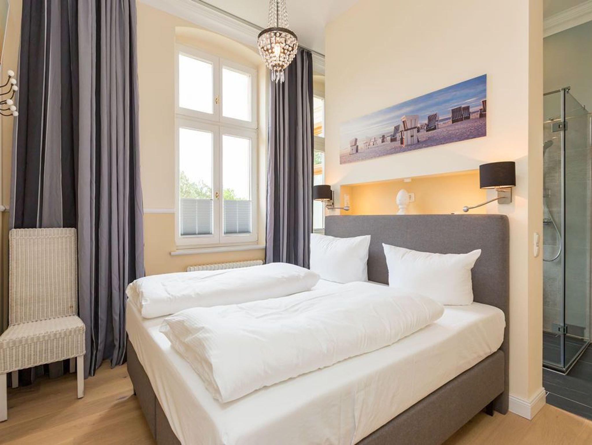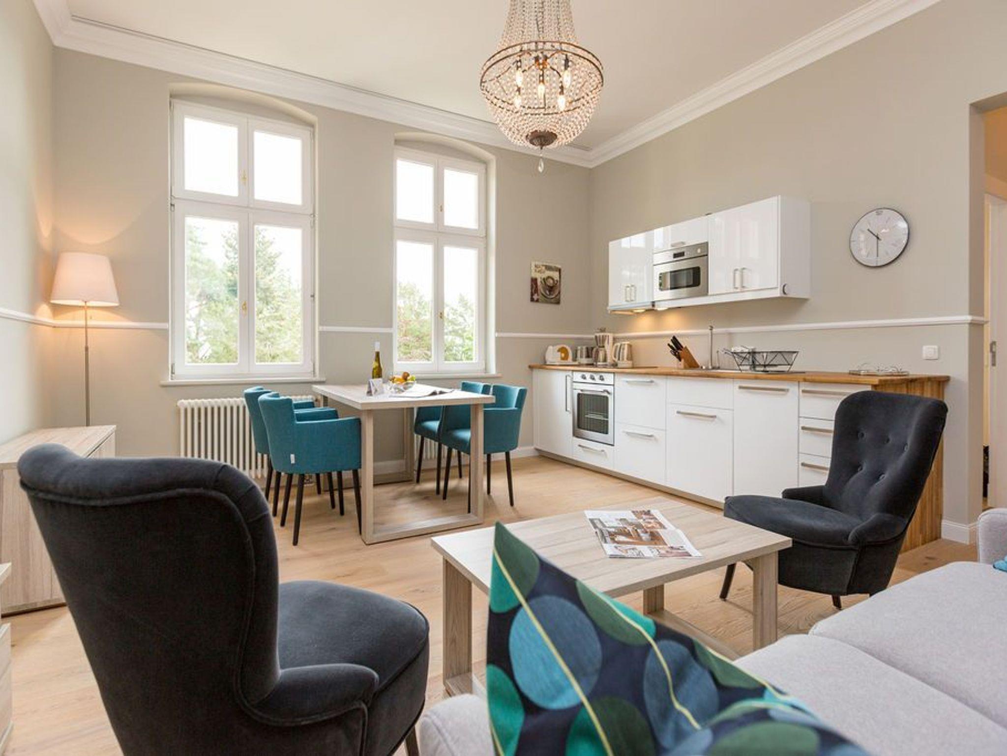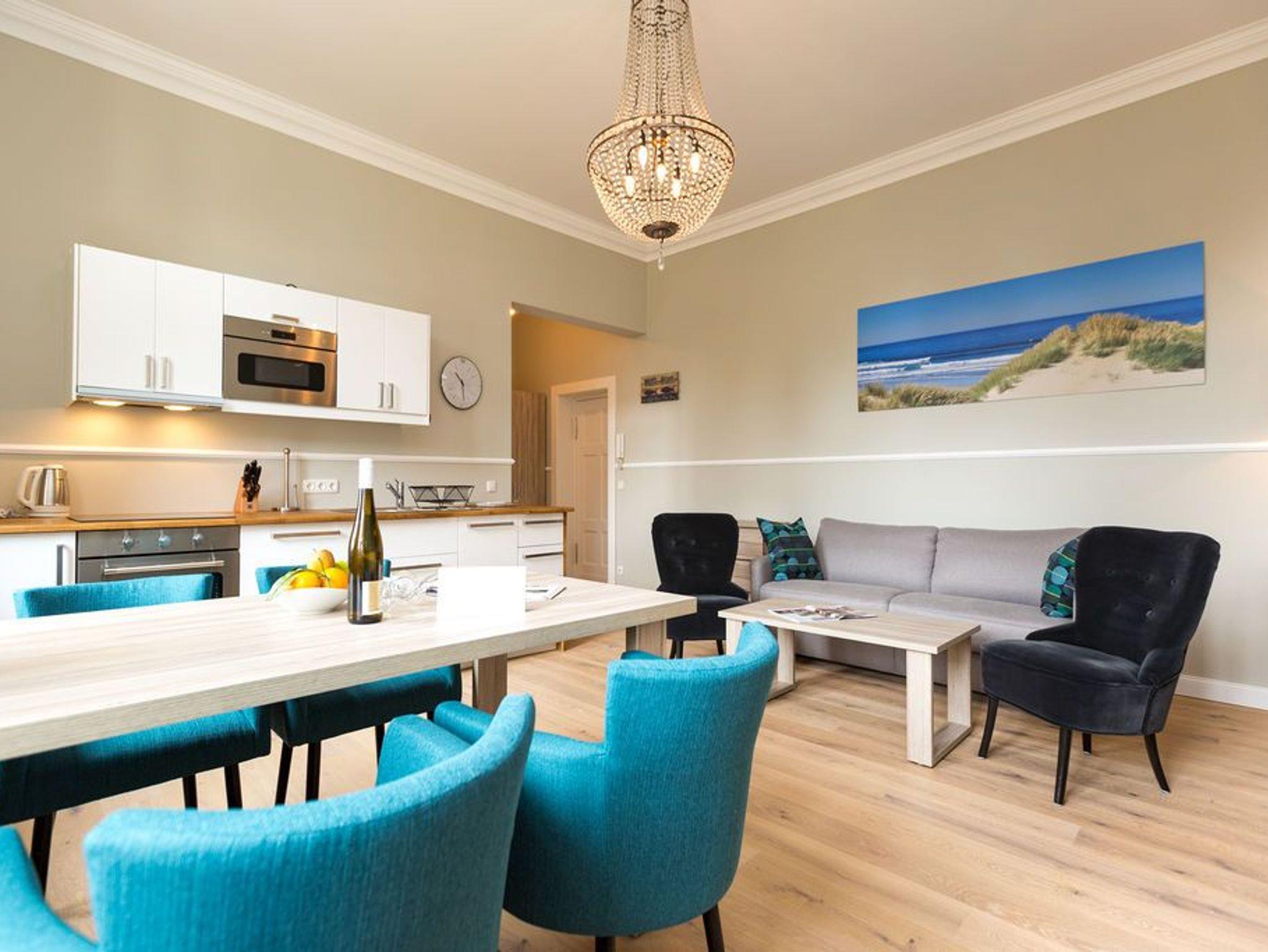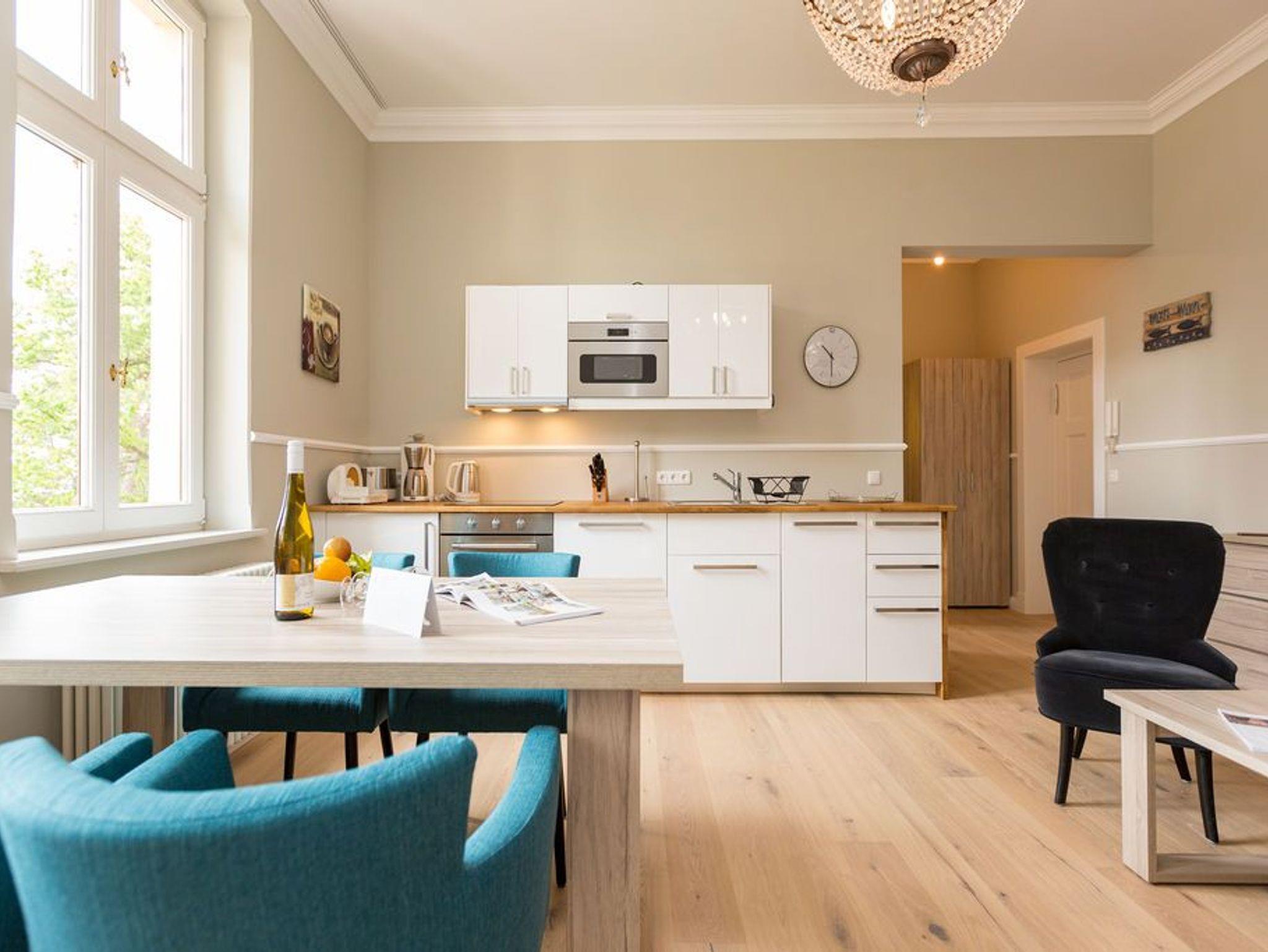 Ein absoluter Wohntraum wartet im 1. Obergeschoss der Villa Saphira darauf, unvergessliche Urlaubsmomente zu schenken. Bis zu vier Personen haben in dem wunderschönen, 50 Quadratmeter großen Appartement Platz. In den zwei Zimmern werden Sie die Zeit vergessen. Denn in dem eleganten und stilvollen Ambiente kann die Welt warten. Hier zählen nur Ruhe und Entspannung. Die gesamte Wohnung hat einen wunderbaren Blick auf die Promenade und im Winter, wenn die Bäume und Büsche auf der Düne ihr Laub verlieren, können Sie bis auf die Ostsee hinaussehen. Im geräumigen Wohn-Esszimmer können Sie es sich auf der Couch oder den bequemen Sesseln vor dem großen Flat-TV gemütlich machen. Das Sofa lässt sich zu einer Schlafcouch (1,60 m x 2,00 m) umfunktionieren und dient so dem dritten und vierten Gast als Aufbettungsmöglichkeit. Für Kleinkinder bis zwei Jahre kann ein Kinderreisebett dazu gebucht werden. Dies kann jedoch nur im Wohnzimmer aufgestellt werden. Ein schöner Esstisch lädt zu gemeinsamen Mahlzeiten ein. Die zum Tisch gehörenden Sessel sind so bequem, dass man sich lange und gerne am Tisch aufhält. In der offenen Wohnküche finden Sie alles, was Sie zur Zubereitung der Mahlzeiten vom Frühstück bis zum Mehr-Gänge-Menü benötigen. Mit Hilfe der hochwertigen Markengeräte (Mikrowelle, Herd, Kochfeld, Brotmaschine…) wird das Kochen zu einem Kinderspiel. Und dank des Geschirrspülers auch das Aufräumen nach der Küchenschlacht. Das kleine, aber urgemütliche Schlafzimmer verfügt über ein Boxspringdoppelbett (1,80 m x 2,00 m) und einen weiteren Flat-TV. Durch das ausgefeilte Raumkonzept geht das Schlafzimmer türlos in das Badezimmer über, das sich hinter dem Bett befindet. Das Tageslichtbad mit Meerblick verfügt über einen Waschtisch, eine gläserne Dusche und eine Sauna ? Ihre ganz private Wellnessoase. Das WC befindet sich in einem separaten Raum. Viel Ablagefläche bietet der große Kleiderschrank auf dem Flur. Das WLAN in der Wohnung ist kostenfrei. Handtücher liegen bereit und das Bett ist bei Ihrer Anreise bereits bezogen. Ihr Auto können Sie auf dem Stellplatz Nummer 10 parken..