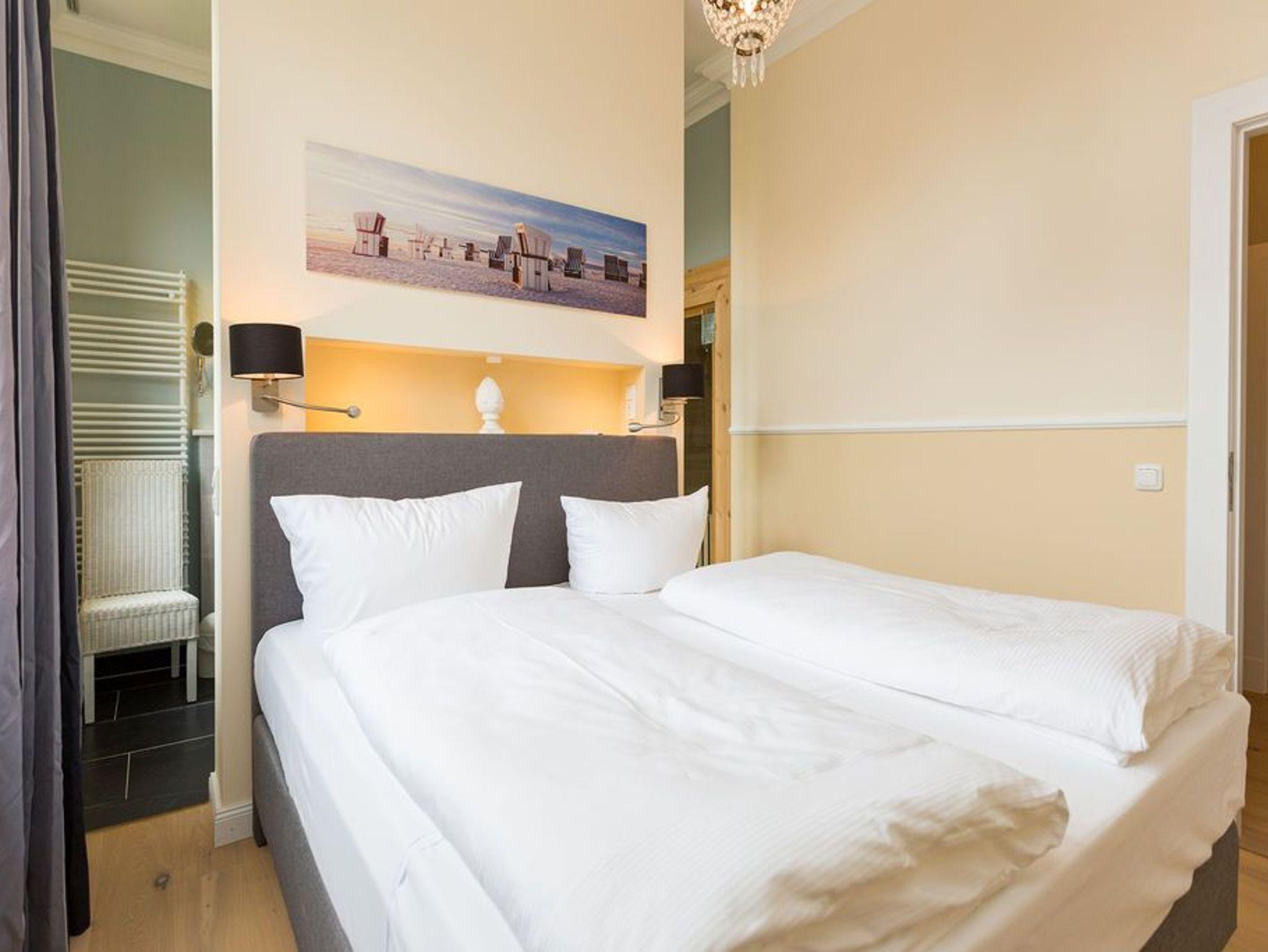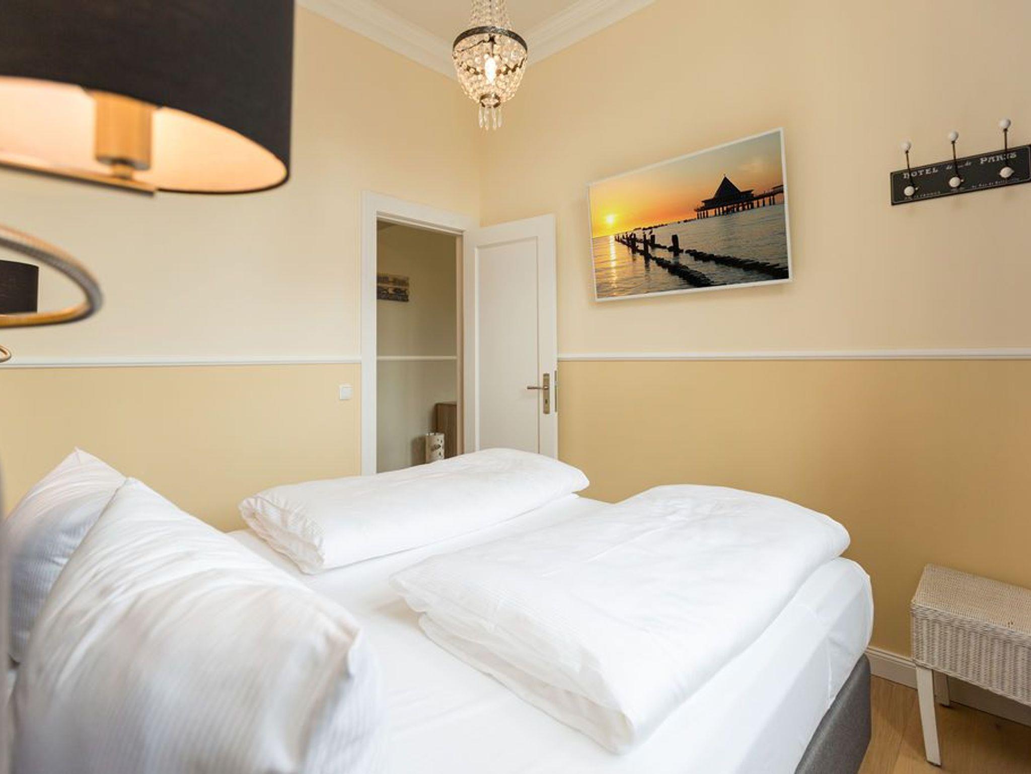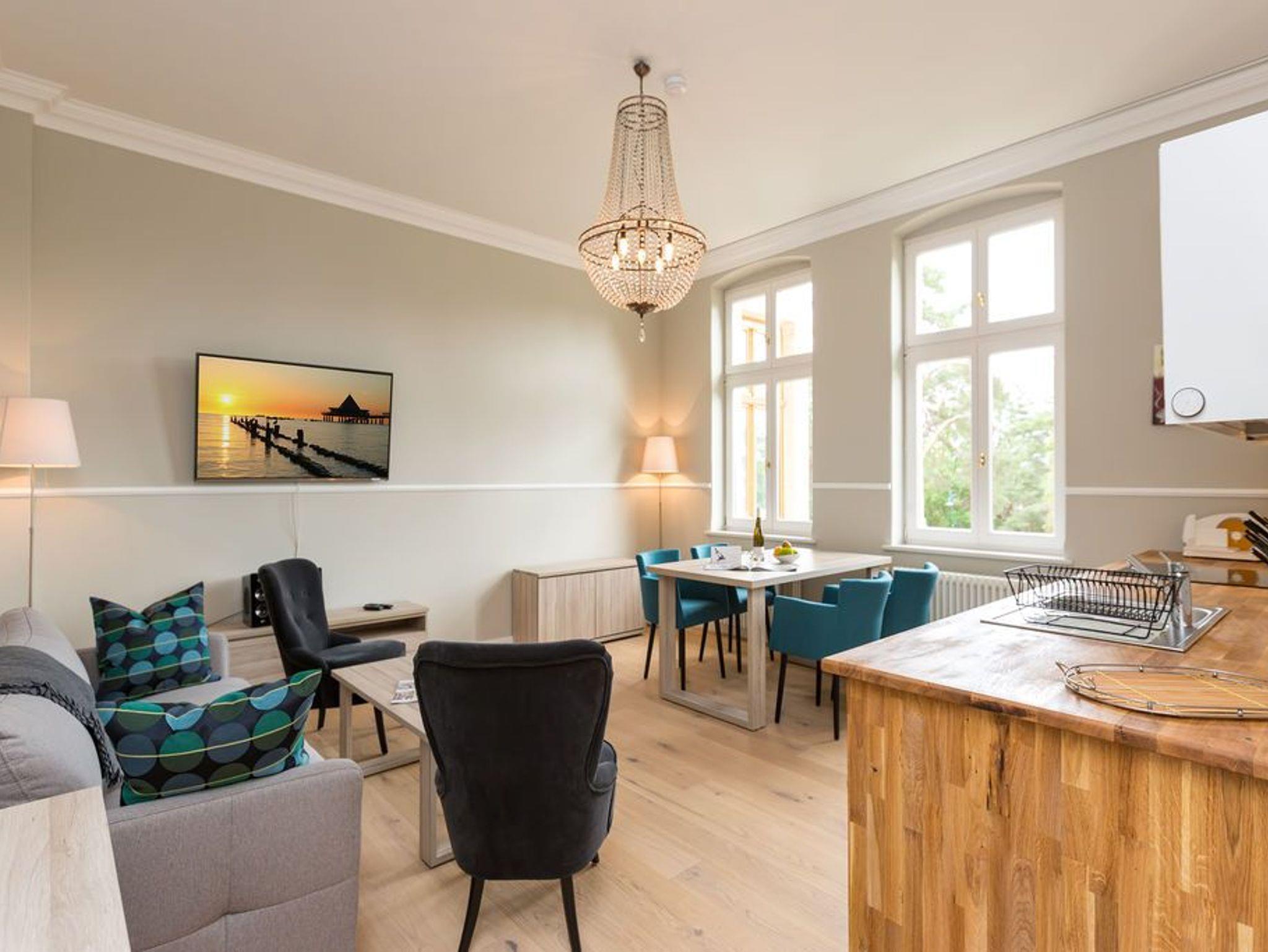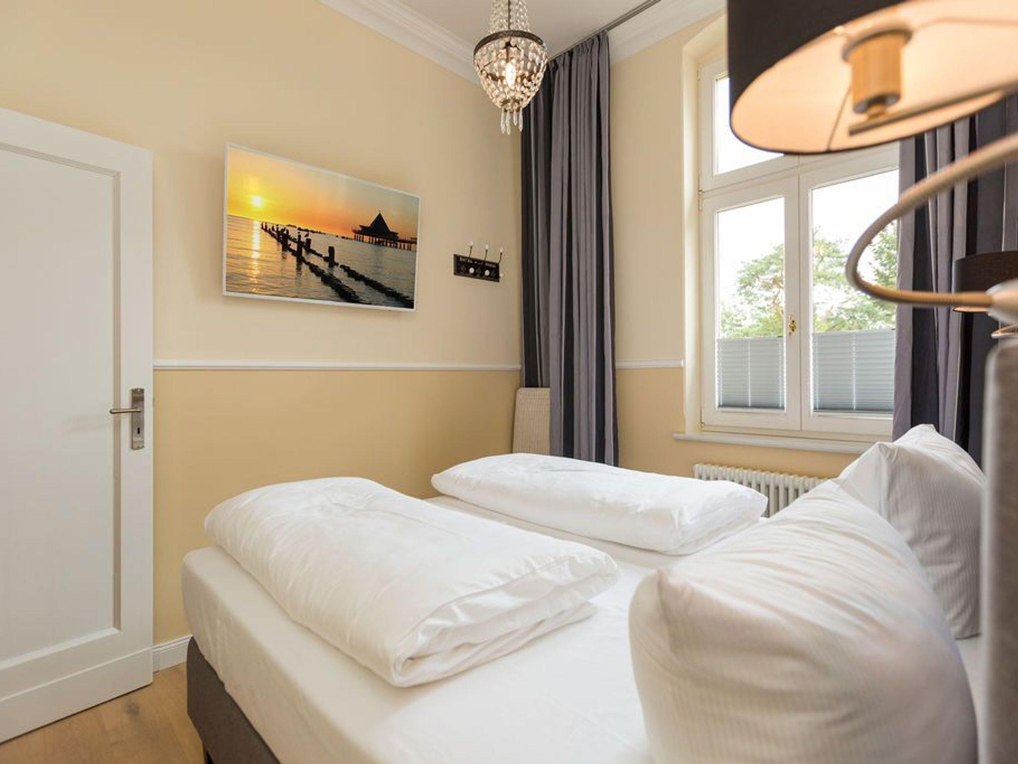Ein absoluter Wohntraum wartet im 1. Obergeschoss der Villa Saphira darauf, unvergessliche Urlaubsmomente zu schenken. Bis zu vier Personen haben in dem wunderschönen, 50 Quadratmeter großen Appartement Platz. In den zwei Zimmern werden Sie die Zeit vergessen. Denn in dem eleganten und stilvollen Ambiente kann die Welt warten. Hier zählen nur Ruhe und Entspannung. Die gesamte Wohnung hat einen wunderbaren Blick auf die Promenade und im Winter, wenn die Bäume und Büsche auf der Düne ihr Laub verlieren, können Sie bis auf die Ostsee hinaussehen. Im geräumigen Wohn-Esszimmer können Sie es sich auf der Couch oder den bequemen Sesseln vor dem großen Flat-TV gemütlich machen. Das Sofa lässt sich zu einer Schlafcouch (1,60 m x 2,00 m) umfunktionieren und dient so dem dritten und vierten Gast als Aufbettungsmöglichkeit. Für Kleinkinder bis zwei Jahre kann ein Kinderreisebett dazu gebucht werden. Dies kann jedoch nur im Wohnzimmer aufgestellt werden. Ein schöner Esstisch lädt zu gemeinsamen Mahlzeiten ein. Die zum Tisch gehörenden Sessel sind so bequem, dass man sich lange und gerne am Tisch aufhält. In der offenen Wohnküche finden Sie alles, was Sie zur Zubereitung der Mahlzeiten vom Frühstück bis zum Mehr-Gänge-Menü benötigen. Mit Hilfe der hochwertigen Markengeräte (Mikrowelle, Herd, Kochfeld, Brotmaschine…) wird das Kochen zu einem Kinderspiel. Und dank des Geschirrspülers auch das Aufräumen nach der Küchenschlacht. Das kleine, aber urgemütliche Schlafzimmer verfügt über ein Boxspringdoppelbett (1,80 m x 2,00 m) und einen weiteren Flat-TV. Durch das ausgefeilte Raumkonzept geht das Schlafzimmer türlos in das Badezimmer über, das sich hinter dem Bett befindet. Das Tageslichtbad mit Meerblick verfügt über einen Waschtisch, eine gläserne Dusche und eine Sauna ? Ihre ganz private Wellnessoase. Das WC befindet sich in einem separaten Raum. Viel Ablagefläche bietet der große Kleiderschrank auf dem Flur. Das WLAN in der Wohnung ist kostenfrei. Handtücher liegen bereit und das Bett ist bei Ihrer Anreise bereits bezogen. Ihr Auto können Sie auf dem Stellplatz Nummer 10 parken..
