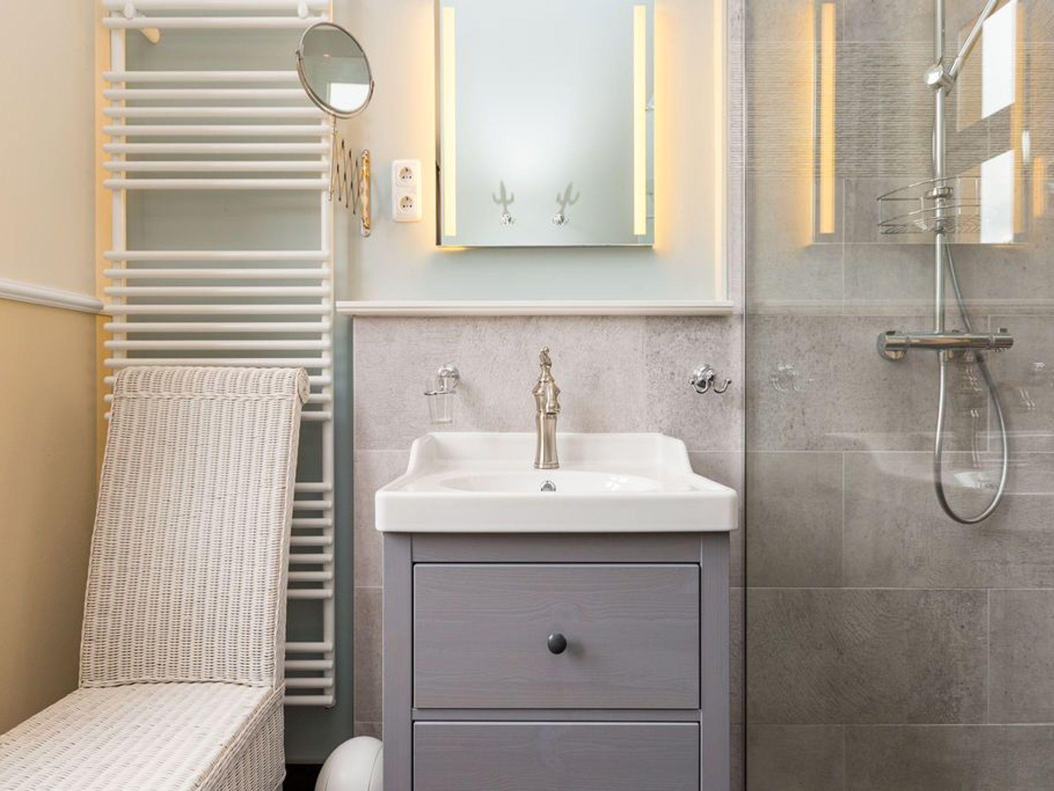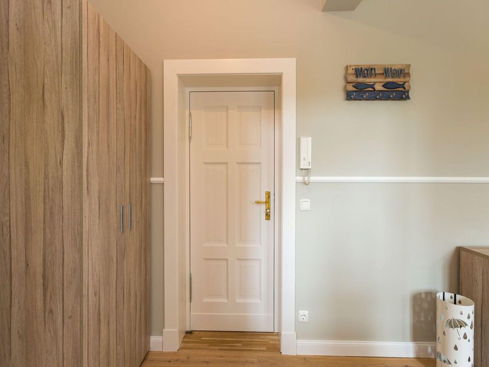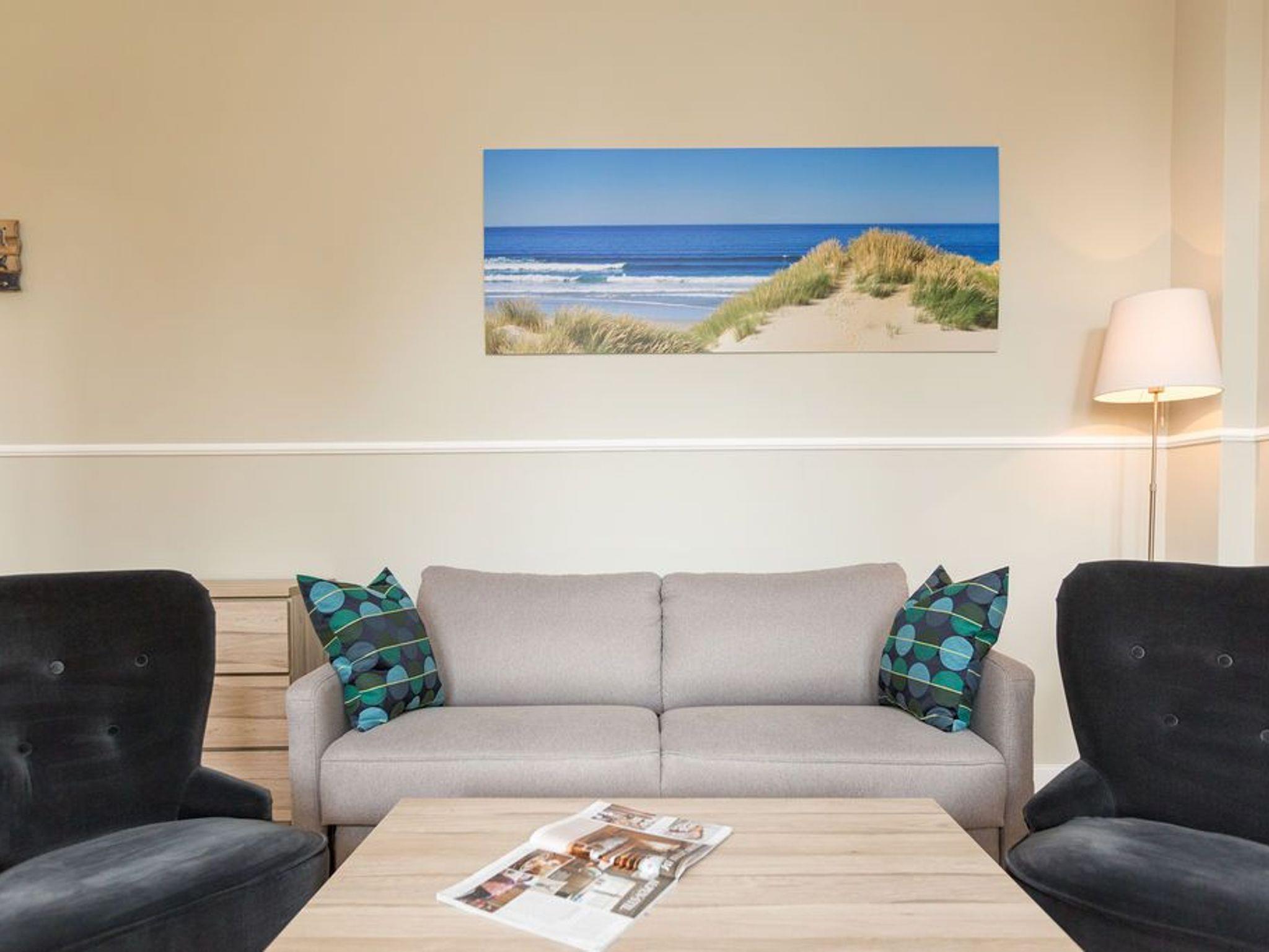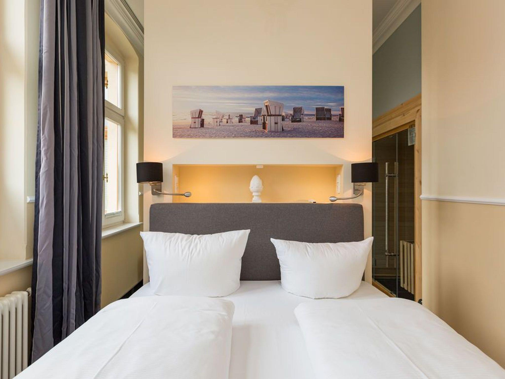 Ein absoluter Wohntraum wartet im 1. Obergeschoss der Villa Saphira darauf, unvergessliche Urlaubsmomente zu schenken. Bis zu vier Personen haben in dem wunderschönen, 50 Quadratmeter großen Appartement Platz. In den zwei Zimmern werden Sie die Zeit vergessen. Denn in dem eleganten und stilvollen Ambiente kann die Welt warten. Hier zählen nur Ruhe und Entspannung. Die gesamte Wohnung hat einen wunderbaren Blick auf die Promenade und im Winter, wenn die Bäume und Büsche auf der Düne ihr Laub verlieren, können Sie bis auf die Ostsee hinaussehen. Im geräumigen Wohn-Esszimmer können Sie es sich auf der Couch oder den bequemen Sesseln vor dem großen Flat-TV gemütlich machen. Das Sofa lässt sich zu einer Schlafcouch (1,60 m x 2,00 m) umfunktionieren und dient so dem dritten und vierten Gast als Aufbettungsmöglichkeit. Für Kleinkinder bis zwei Jahre kann ein Kinderreisebett dazu gebucht werden. Dies kann jedoch nur im Wohnzimmer aufgestellt werden. Ein schöner Esstisch lädt zu gemeinsamen Mahlzeiten ein. Die zum Tisch gehörenden Sessel sind so bequem, dass man sich lange und gerne am Tisch aufhält. In der offenen Wohnküche finden Sie alles, was Sie zur Zubereitung der Mahlzeiten vom Frühstück bis zum Mehr-Gänge-Menü benötigen. Mit Hilfe der hochwertigen Markengeräte (Mikrowelle, Herd, Kochfeld, Brotmaschine…) wird das Kochen zu einem Kinderspiel. Und dank des Geschirrspülers auch das Aufräumen nach der Küchenschlacht. Das kleine, aber urgemütliche Schlafzimmer verfügt über ein Boxspringdoppelbett (1,80 m x 2,00 m) und einen weiteren Flat-TV. Durch das ausgefeilte Raumkonzept geht das Schlafzimmer türlos in das Badezimmer über, das sich hinter dem Bett befindet. Das Tageslichtbad mit Meerblick verfügt über einen Waschtisch, eine gläserne Dusche und eine Sauna ? Ihre ganz private Wellnessoase. Das WC befindet sich in einem separaten Raum. Viel Ablagefläche bietet der große Kleiderschrank auf dem Flur. Das WLAN in der Wohnung ist kostenfrei. Handtücher liegen bereit und das Bett ist bei Ihrer Anreise bereits bezogen. Ihr Auto können Sie auf dem Stellplatz Nummer 10 parken..