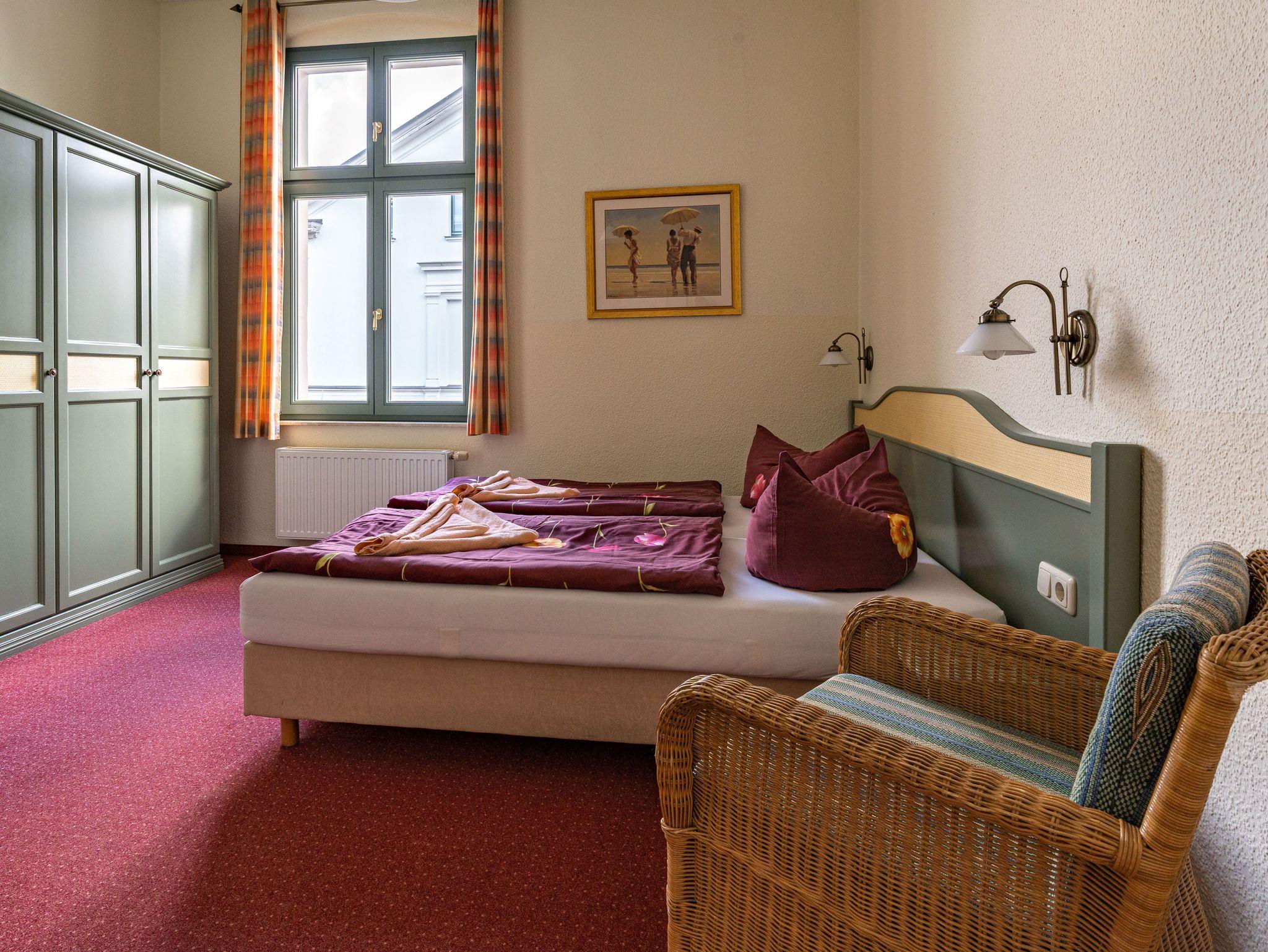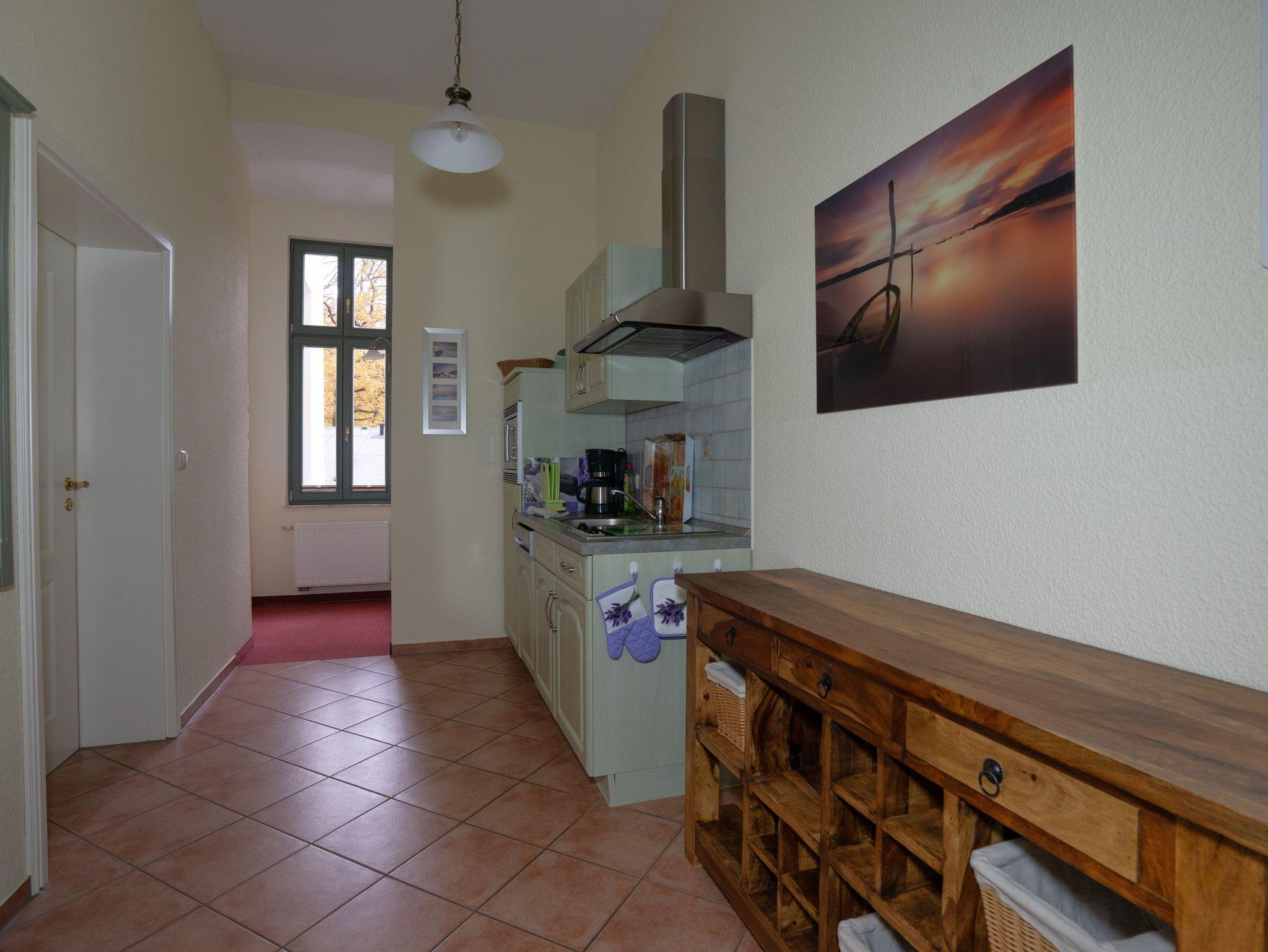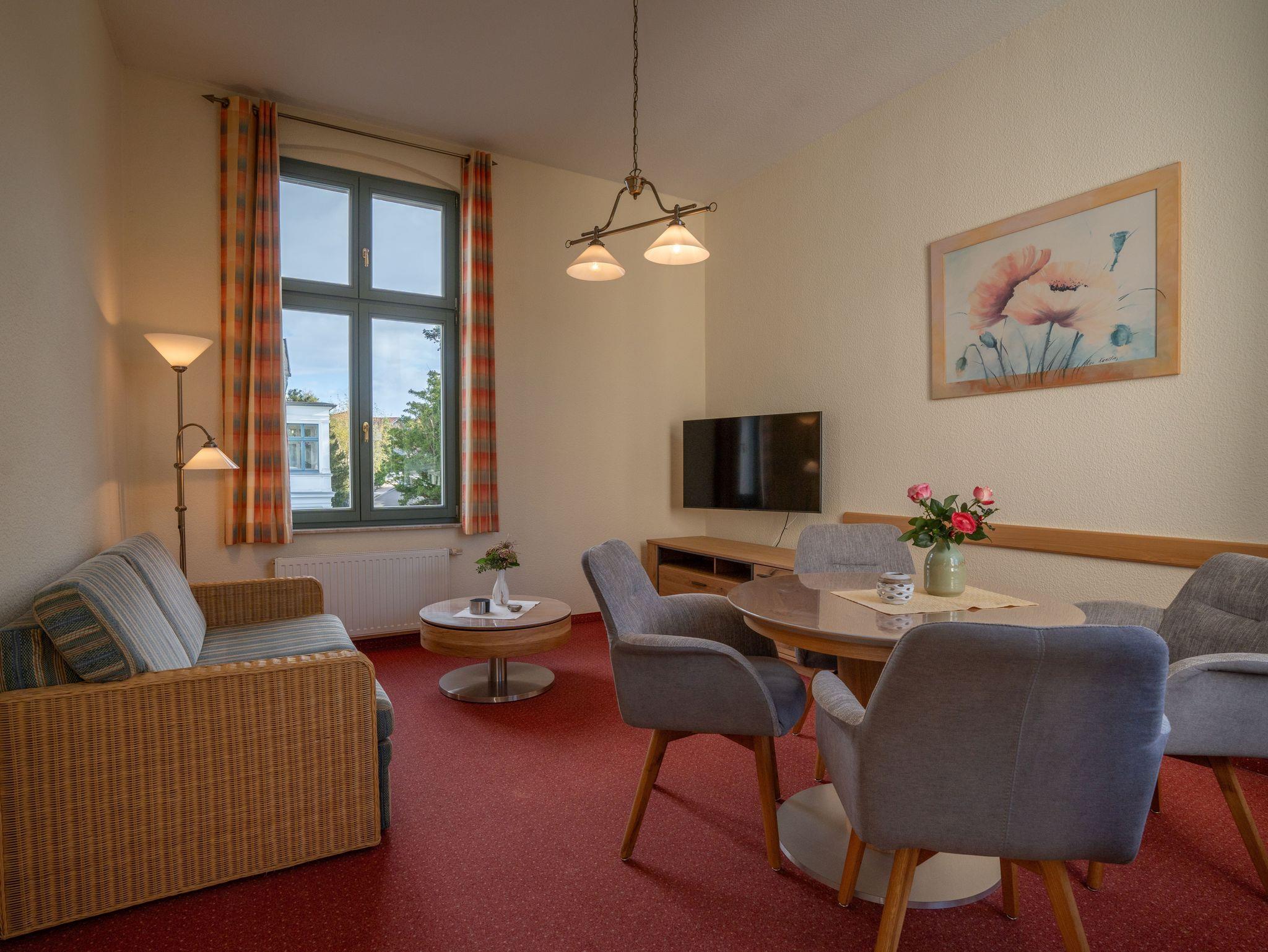 Das 44 qm große Zweiraumappartement im Obergeschoss verfügt über separates Schlafzimmer und einen Wohnzimmer mit Sitzgelegenheit und Schlafcouch (Aufbettung für 2 Personen), TV und Radio und Küchenzeile mit Geschirrspüler,