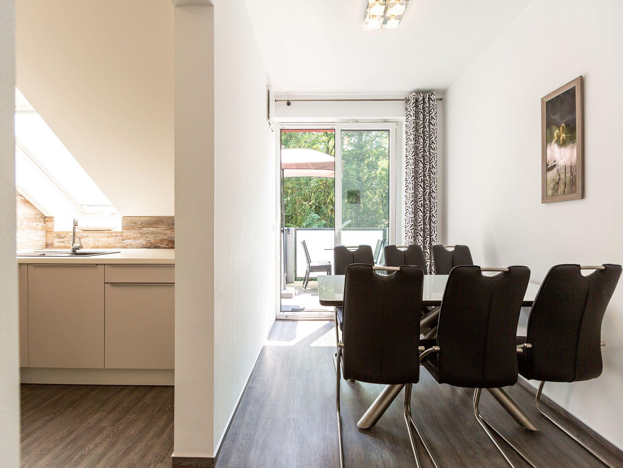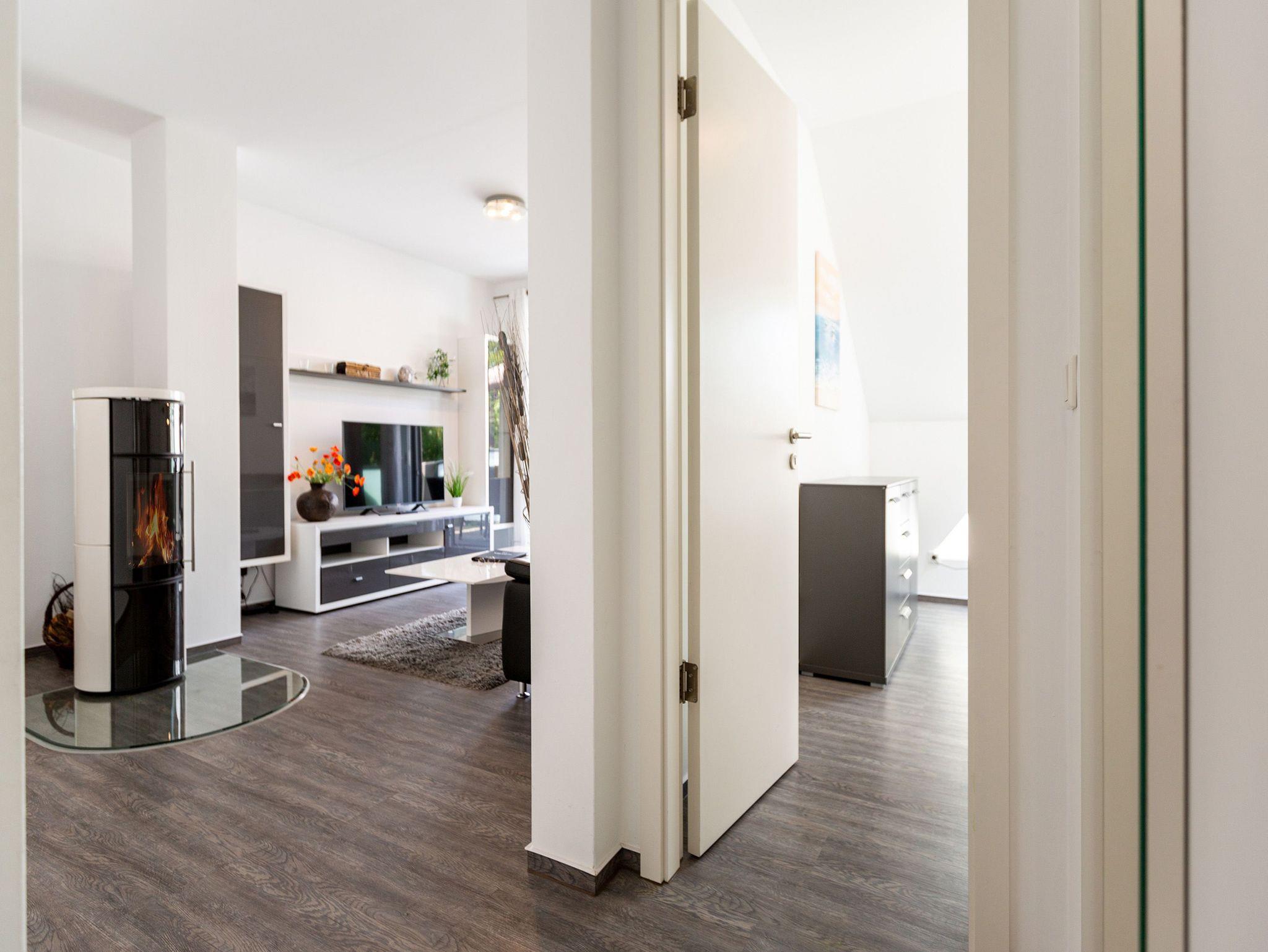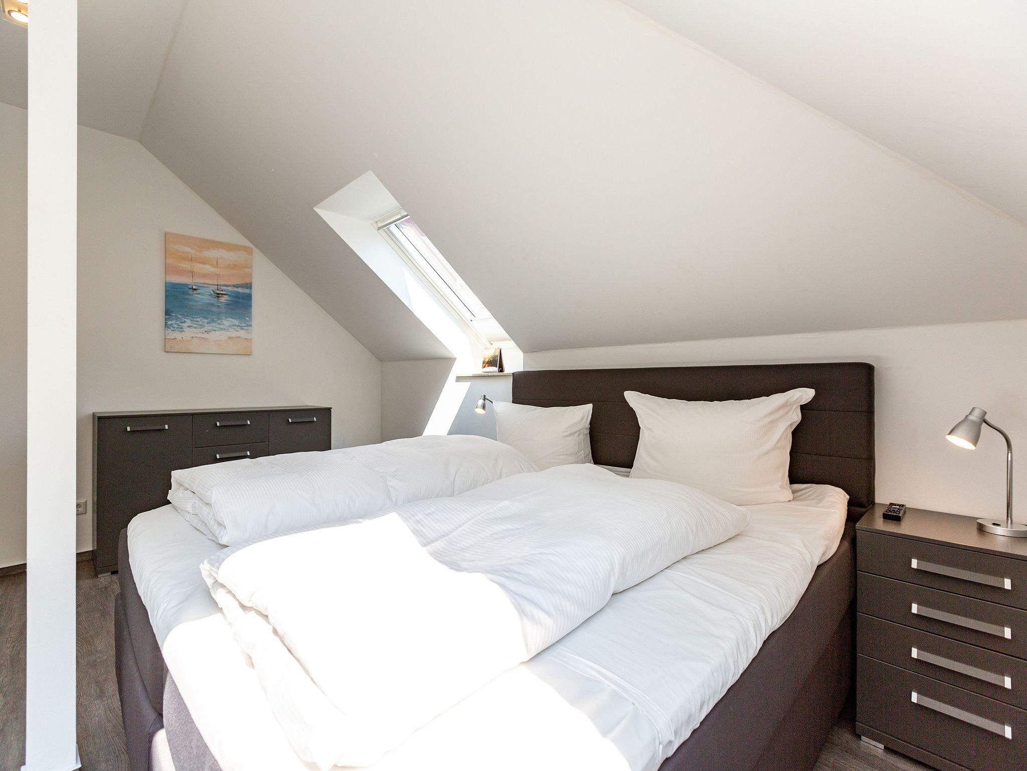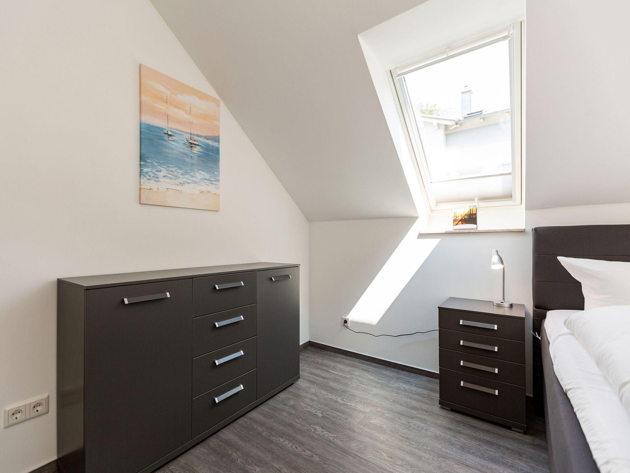 Diese 3-Raum-Dachgeschosswohnung bietet auf 82 Quadratmetern viel Raum für entspannte Urlaubstage. Vier Erwachsene und ein Kleinkind finden hier komfortable Bedingungen, dazu eine klare, moderne Gestaltung. Der Wohnbereich ist großzügig geschnitten, ausgestattet mit einer bequemen Sitzgruppe, Flat-TV und einem Kamin, der an kühleren Tagen schnell für Wärme sorgt. Von hier aus gelangen Sie auf den Balkon zur Südostseite, ideal für das Frühstück in der Morgensonne. Die separate Küche ist vollständig ausgestattet und bietet am Essplatz genügend Raum für gemeinsame Mahlzeiten. Auch von hier führt eine Tür auf den zweiten Balkon, der zur Südseite ausgerichtet ist und am Nachmittag viel Licht bietet. Beide Schlafzimmer sind mit hochwertigen Boxspringdoppelbetten in Übergröße (1,85m x 2,20m) sowie einem eigenen Flat-TV eingerichtet. Das Bad überzeugt mit Badewanne, Dusche, WC und einer kostenfreien Infrarotsauna. Ein separates Gäste-WC ergänzt den Komfort. Bezogene Betten und Handtücher stehen als Erstausstattung bereit. WLAN ist kostenfrei verfügbar. Ein PKW-Stellplatz gehört zur Wohnung, ebenso ein eigener Briefkasten. Für kleine Gäste können ein Kinderreisebett und ein Hochstuhl gegen Aufpreis bereitgestellt werden.