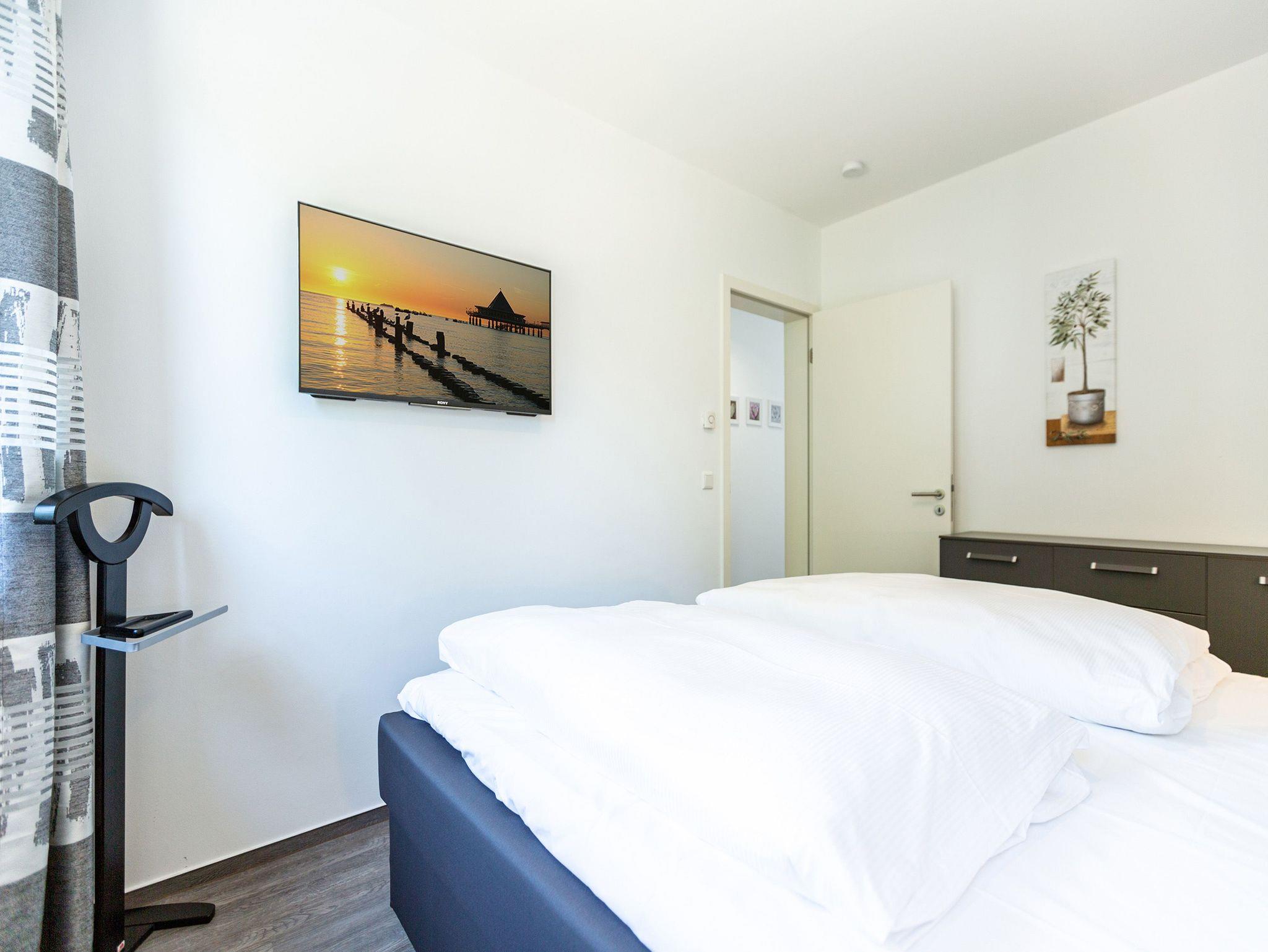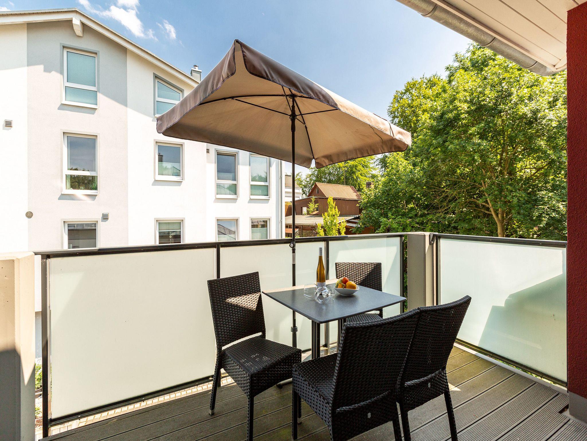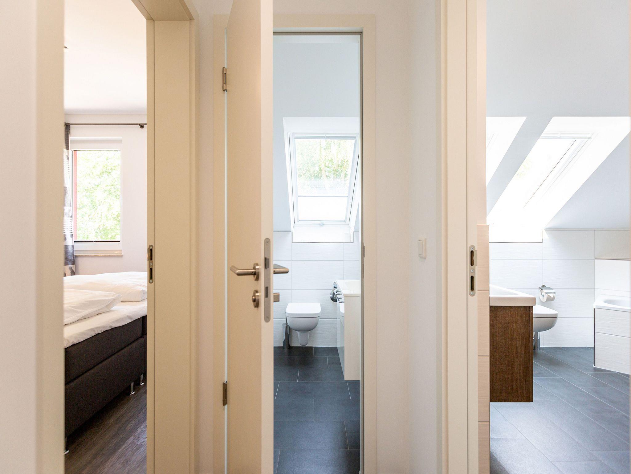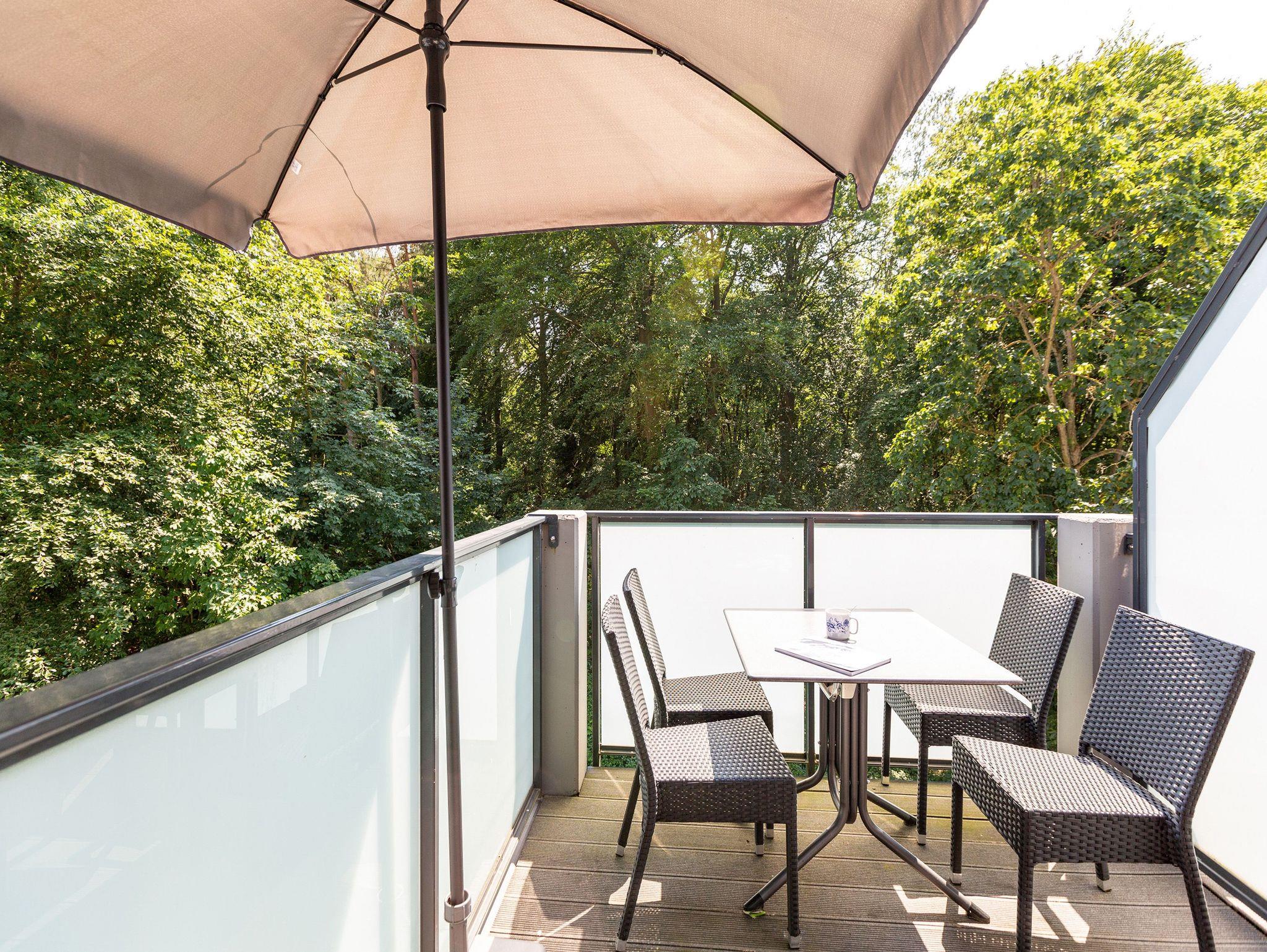Diese 3-Raum-Dachgeschosswohnung bietet auf 82 Quadratmetern viel Raum für entspannte Urlaubstage. Vier Erwachsene und ein Kleinkind finden hier komfortable Bedingungen, dazu eine klare, moderne Gestaltung. Der Wohnbereich ist großzügig geschnitten, ausgestattet mit einer bequemen Sitzgruppe, Flat-TV und einem Kamin, der an kühleren Tagen schnell für Wärme sorgt. Von hier aus gelangen Sie auf den Balkon zur Südostseite, ideal für das Frühstück in der Morgensonne. Die separate Küche ist vollständig ausgestattet und bietet am Essplatz genügend Raum für gemeinsame Mahlzeiten. Auch von hier führt eine Tür auf den zweiten Balkon, der zur Südseite ausgerichtet ist und am Nachmittag viel Licht bietet. Beide Schlafzimmer sind mit hochwertigen Boxspringdoppelbetten in Übergröße (1,85m x 2,20m) sowie einem eigenen Flat-TV eingerichtet. Das Bad überzeugt mit Badewanne, Dusche, WC und einer kostenfreien Infrarotsauna. Ein separates Gäste-WC ergänzt den Komfort. Bezogene Betten und Handtücher stehen als Erstausstattung bereit. WLAN ist kostenfrei verfügbar. Ein PKW-Stellplatz gehört zur Wohnung, ebenso ein eigener Briefkasten. Für kleine Gäste können ein Kinderreisebett und ein Hochstuhl gegen Aufpreis bereitgestellt werden.