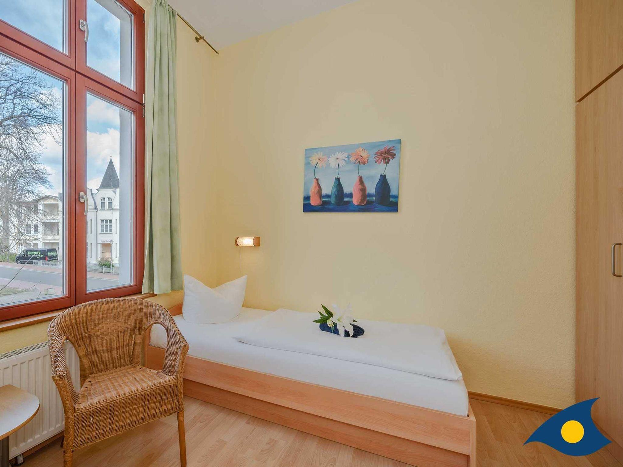 Das zweite Schlafzimmer kann als Kinder- oder Gästezimmer genutzt werden. Hier stehen zwei komfortable Einzelbetten und ein großzügiger Einbauschrank zur Verfügung. Durch die gemütlichen Korbsessel wird dieser Raum gerne als zusätzlich Rückzugsmöglichkeit genutzt. Hier lesen Sie ein gutes Buch oder verfassen die Urlaubsgrüße an die Lieben zu Hause.