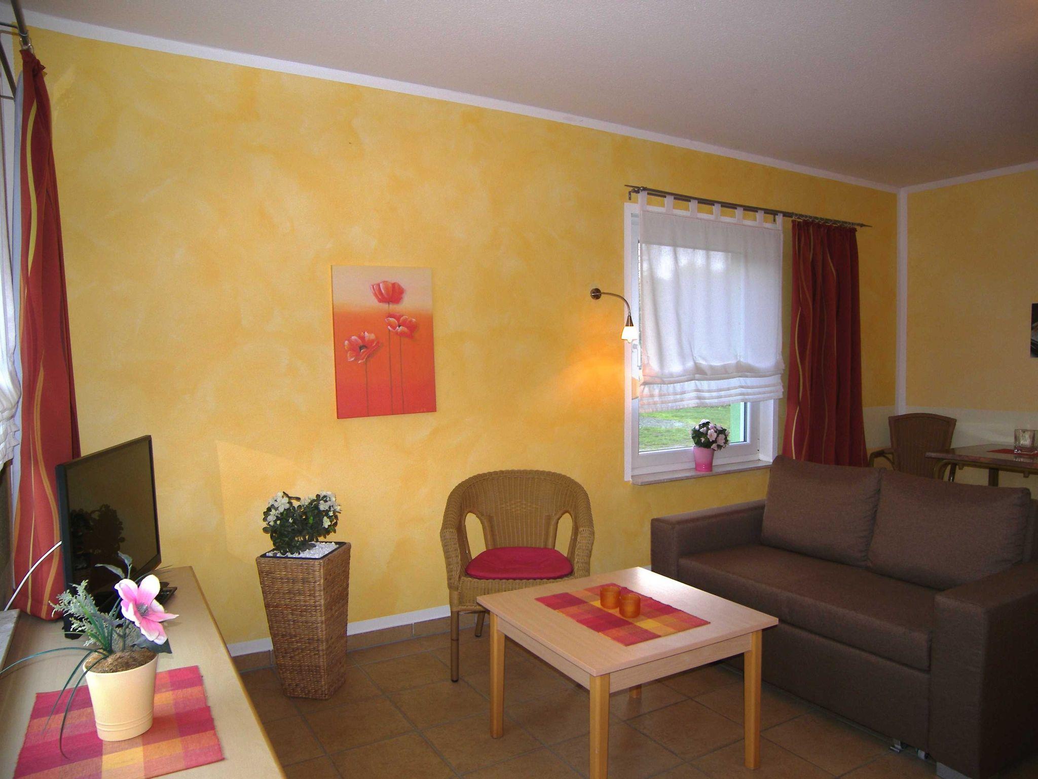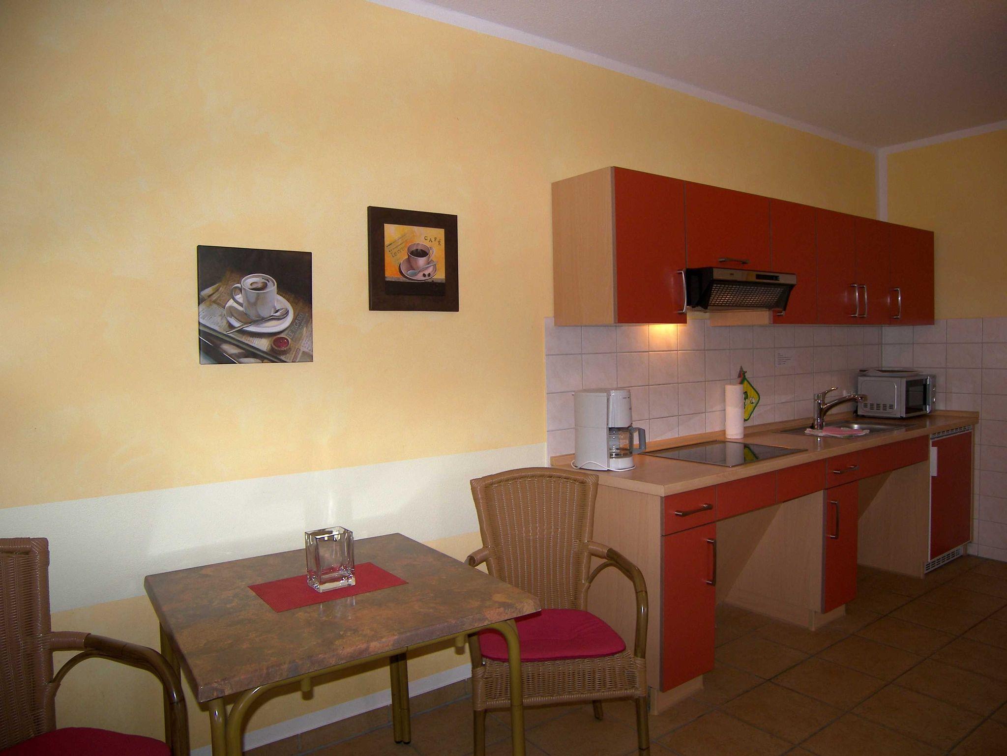 Die moderne, komfortable und barrierefreie Nichtraucher- Ferienwohnung ist für Rollstuhlfahrer geeignet. Sie liegt in parterre und ist stufenlos zu erreichen. Der kombinierte Wohnraum verfügt über eine Schlafcouch (Aufbettung für eine 3. Person), TV und Radio. Die integrierte Küchenzeile ist mit einer Mikrowelle, 4 Platten Cerankochfeld, Kühlschrank mit Gefriermöglichkeit, Geschirr, Wasserkocher, Toaster und Kaffeemaschine ausgestattet.