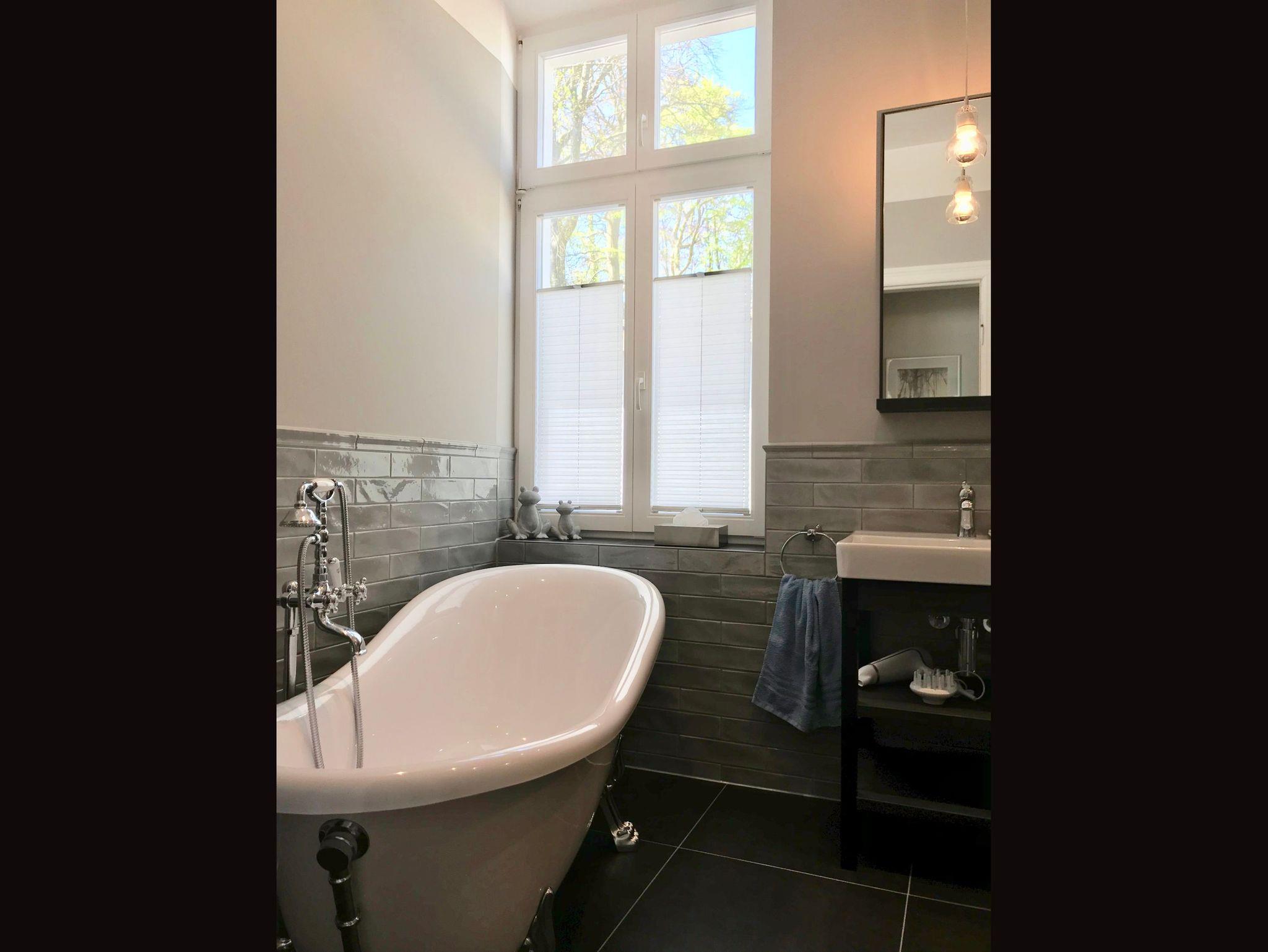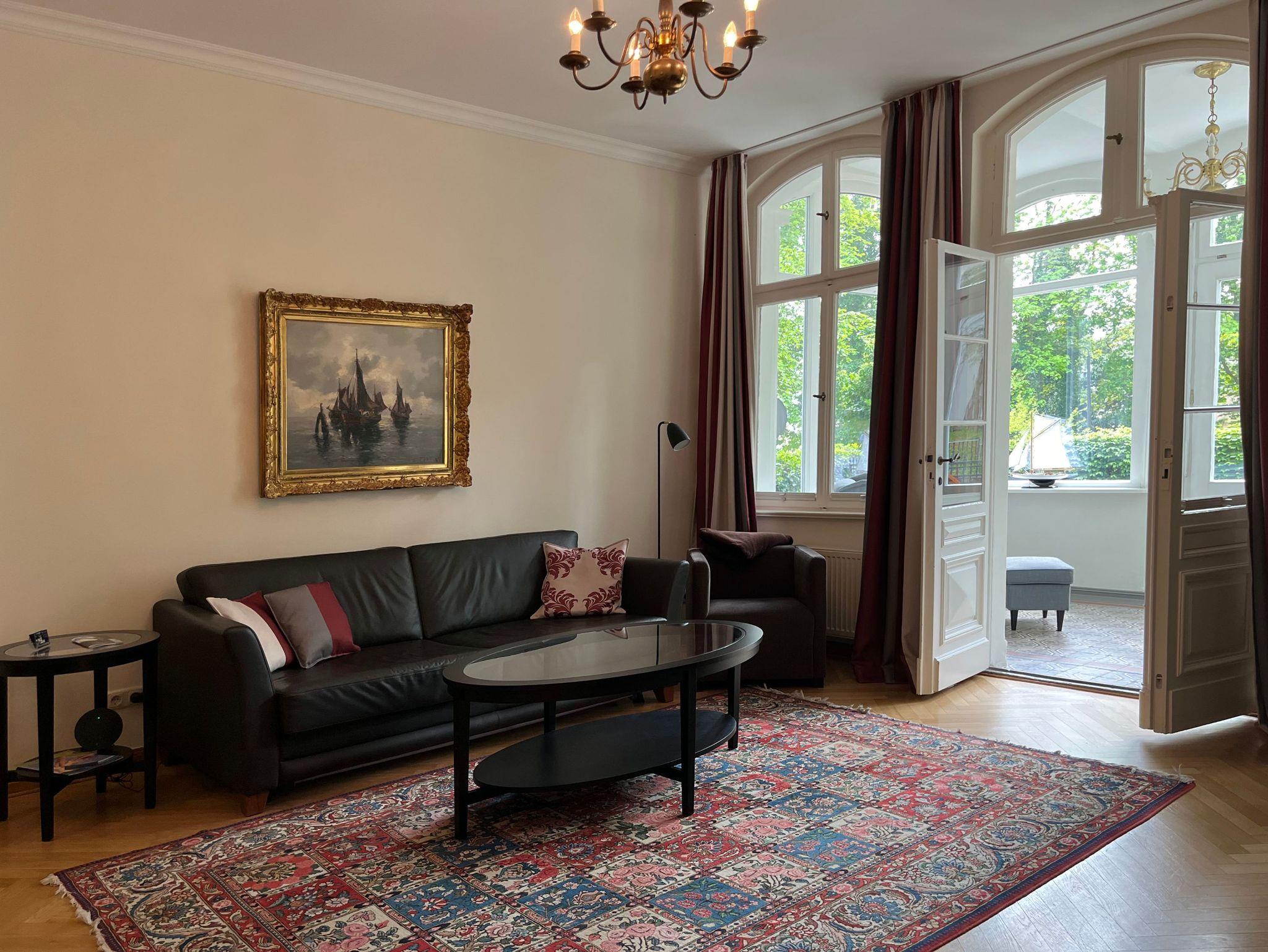 Die ca. 88 qm große Nichtraucher-Wohnung verfügt über einen separaten Eingang mit Diele. Daher ist diese Wohnung - nach vorheriger Absprache und bei Rücksicht auf andere Gäste - auch für Urlaub mit Hund geeignet. Das Wohnzimmer ist abschließbar und kann als zweites Schlafzimmer genutzt werden. Im wintergartenähnlichen Verandenvorbau mit Säulen u. historischem Fliesenboden befindet sich der Essplatz für 4 Personen sowie ein gemütlicher Ohrensessel zum Lesen und Entspannen. Von hier aus gelangen Sie auch in den sonnigen Vorgarten mit Liegestühlen. Das Badezimmer ist mit einer freistehenden Wanne und bodengleichen Dusche ausgestattet.