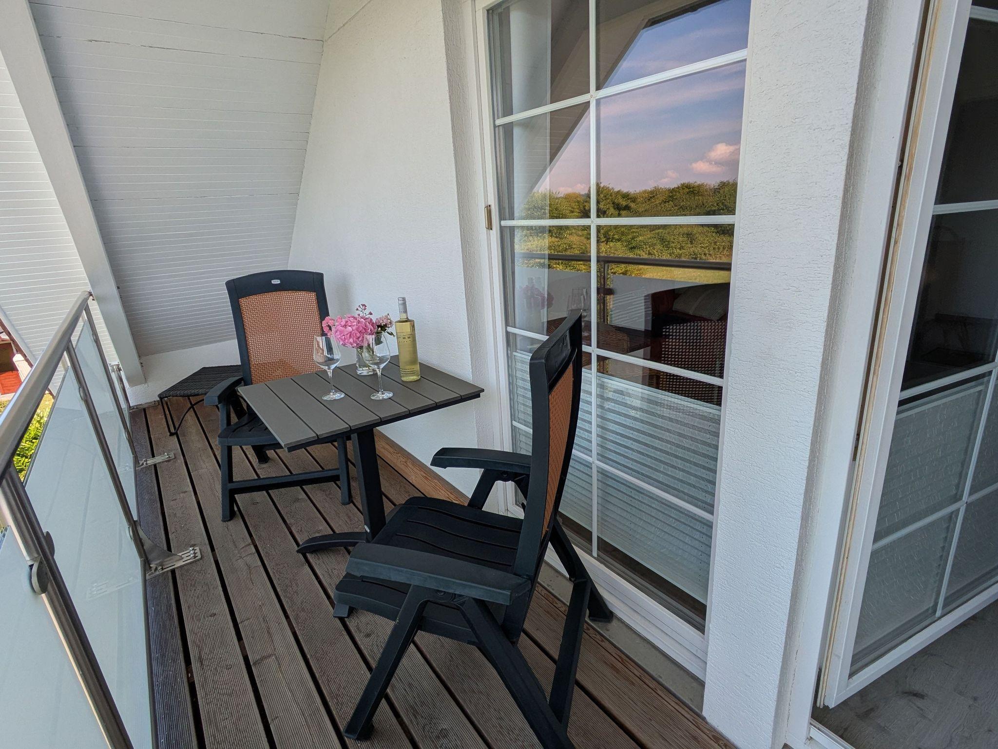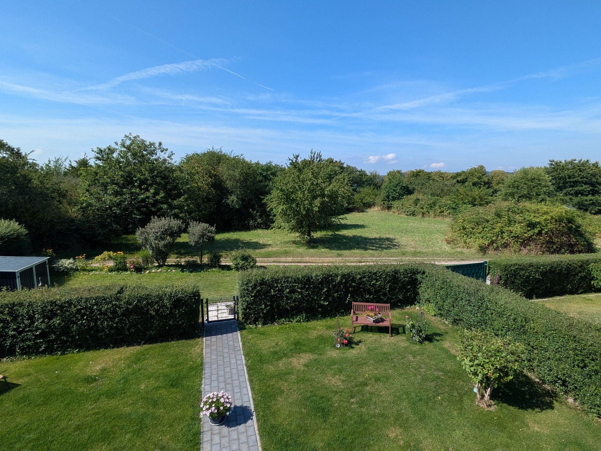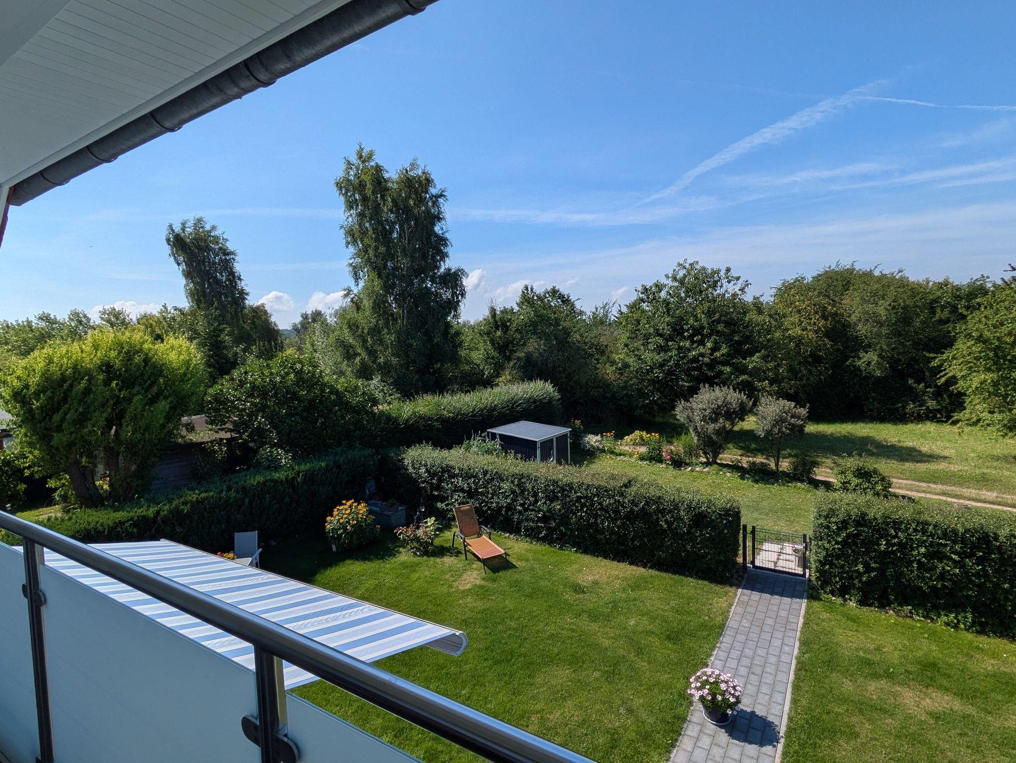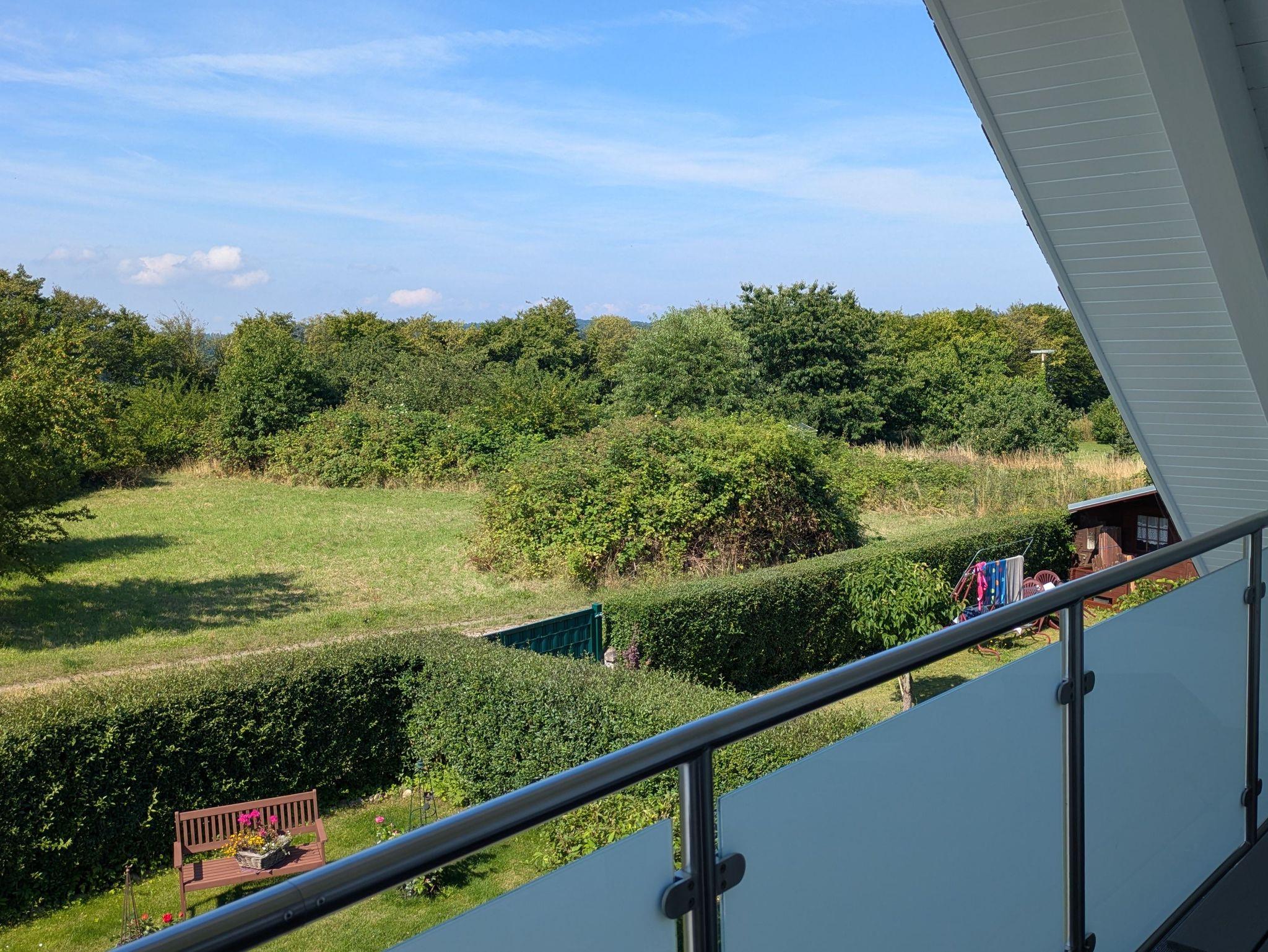 Vom Balkon aus hat man einen freien Blick in den Garten und in das landschaftliche Naturschutzgebiet Gothensee.