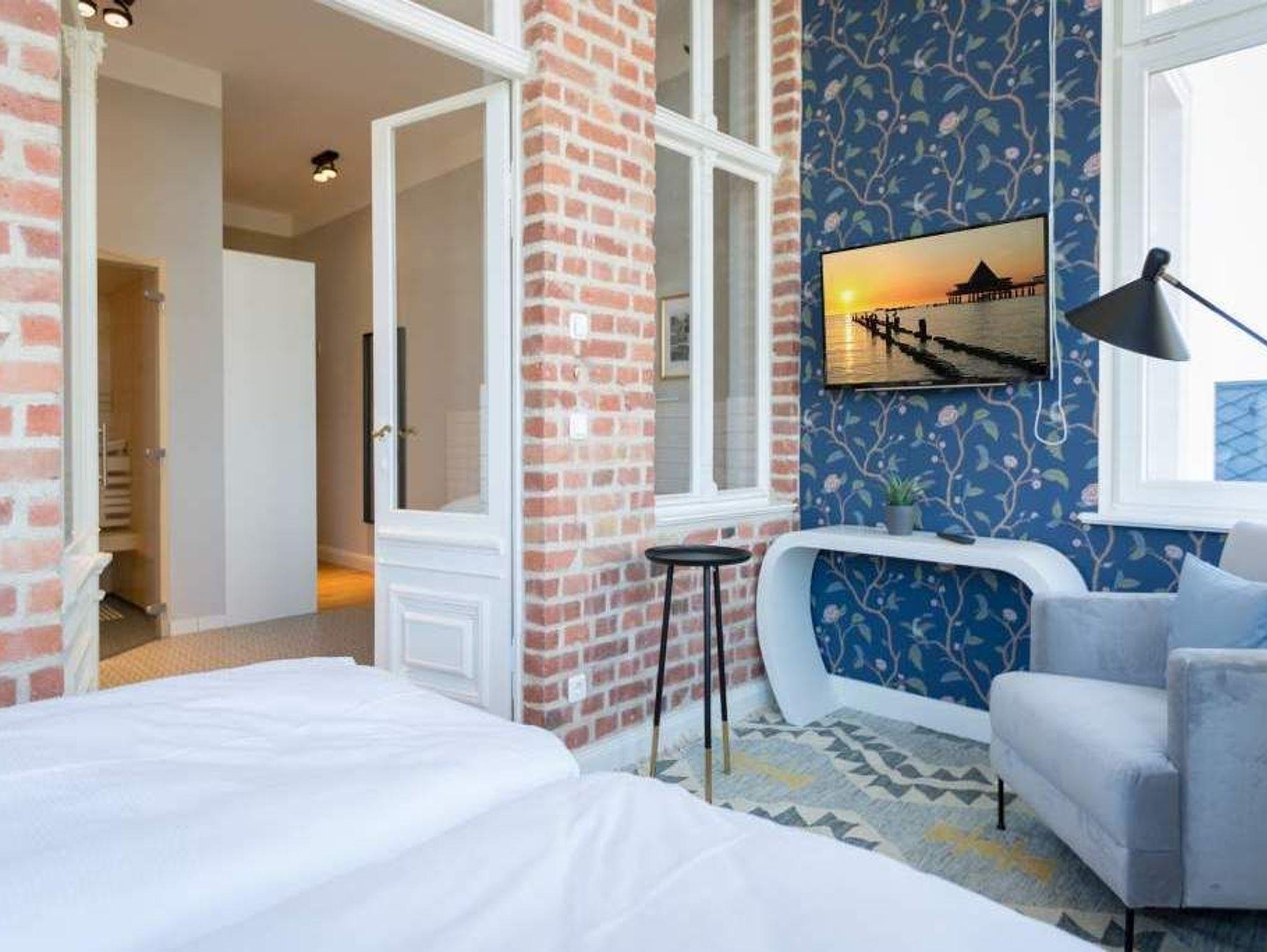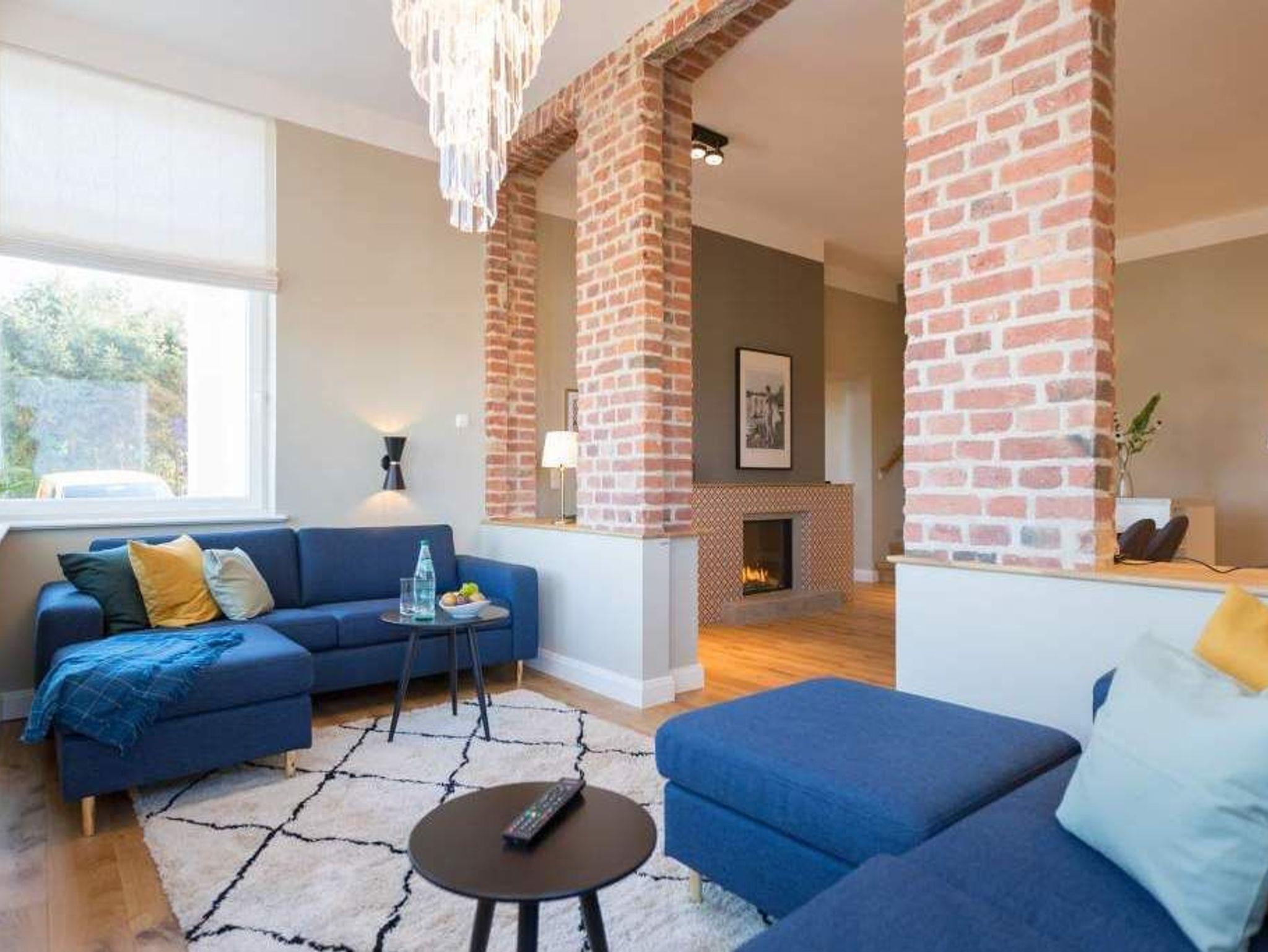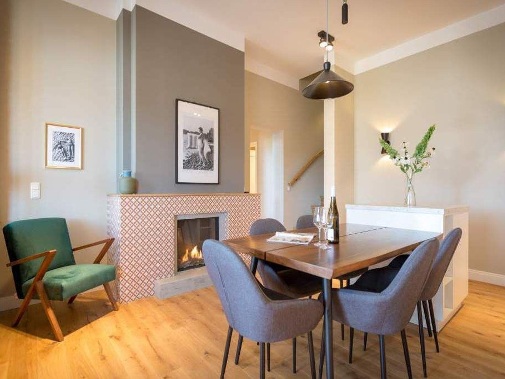 Exklusiv, außergewöhnlich, luxuriös und alles andere als 0815 ? sucht man nach Beschreibungen für diesen Urlaubswohntraum, wären diese wohl die angemessensten. Urlaub der Extra-Klasse auf zwei Etagen erwartet Sie im Appartement Nummer 1 der Villa Bellevue. Im Erdgeschoss und in der Belle Etage der wunderschön sanierten Bädervilla atmen Sie das Flair der mondänen Kaiserzeit und die Leichtigkeit und Noblesse modernen Innendesigns gleichermaßen. Auf den großzügigen 100 Quadratmetern können vier Erwachsene und zwei Kinder bis drei Jahre (im Kinderreisebett) gemeinsam eine unvergesslich schöne Zeit verbringen. Das geräumige Wohn-Esszimmer, dessen Bereiche durch die freigelegte Backsteinwand der ehemaligen Veranda voneinander getrennt sind, lädt zum Entspannen, Beisammensein und Dinieren ein. Auf zwei großen Wohnlandschaften können Sie zur Ruhe kommen. Der 42-Zoll-Flat TV ist der ideale Entertainer. Von der Veranda aus haben Sie zudem Zugang zum Garten und zur Terrasse mit Tisch und sechs Stühlen. Das Interieur der Wohnung ist vom Feinsten. Edle skandinavische Design-Klassiker verleihen diesem Urlaubsdomizil Extravaganz und einen stylischen Charakter. Der mit wunderschönen Fliesen gerahmte Gas-Kamin im Esszimmer ist ein echter Hingucker und sorgt an stürmischen Abenden für viel Gemütlichkeit. Da bleibt man gern länger am großen Echtholztisch sitzen, plaudert und genießt die Zeit. Die offene Küche mit hochwertigen Geräten und einem kleinen Kühlschrank ist mit ausgesuchtem ASA-Geschirr ausgestattet. Auf dieser Etage gibt es mit wunderschöner Designtapete dekoriert bereits das erste Schlafzimmer. Ausgestattet mit einem komfortablen Boxspringdoppelbett (1,80 m x 2,00 m) verspricht es auch nachts jede Menge Vergnügen. Das dazu gehörige Badezimmer bietet viel Platz zum Duschen und Frischmachen. Der Clou des Urlaubsparadieses empfängt den Auszeithungrigen jedoch in der 1. Etage. Hier avanciert das ballsaalgroße Badezimmer zum Highlight der Belle Etage. Die freistehende Badewanne verführt geradezu zum Loslassen und Weggleiten in duftende Schaumträume. Eine Panorama-Sauna bringt Wellness-Fans ordentlich ins Schwitzen. Und das alles ist nebst Waschtisch, Dusche und geräumigem Kleiderschrank eingebettet in edles Fliesendesign. Dem Badezimmer angeschlossen ist eine Schlafveranda. Ein wunderbarer Kontrast bildet die edle Tapete, die hier auf die unverputzte Brickwall der alten Bädervilla trifft. Wer sich hier bettet, fühlt sich in eine andere Welt versetzt. Auch auf dieser Etage empfängt den Gast ein Boxspringdoppelbett (1,60 m x 2,00 m). Wohlfühlen steht in diesem Appartement an erster Stelle. Dafür sind die Betten bei Ihrer Anreise bereits bezogen und Handtücher liegen bereit. Ihr Auto können Sie auf dem zum Haus gehörenden Stellplatz parken.