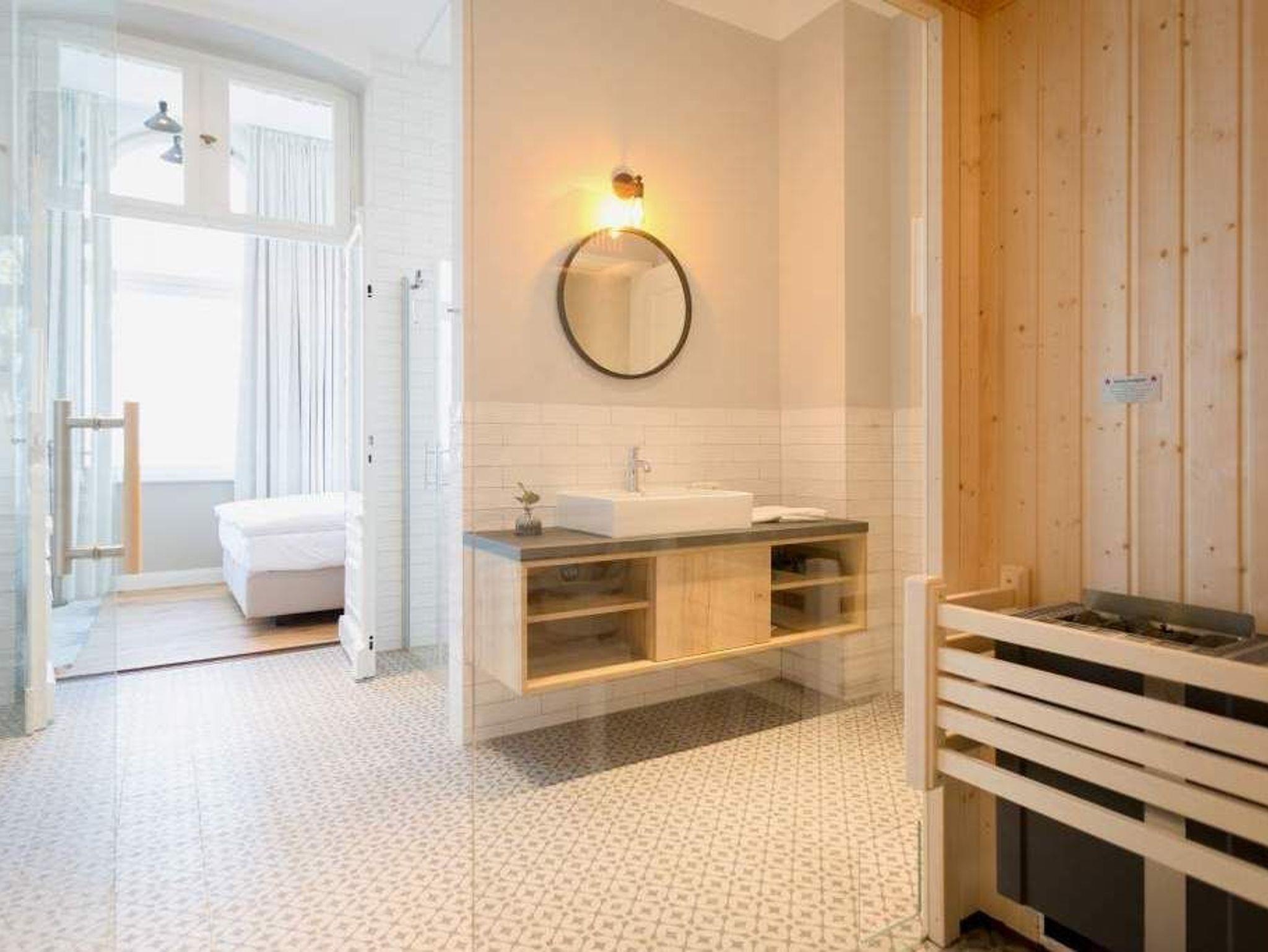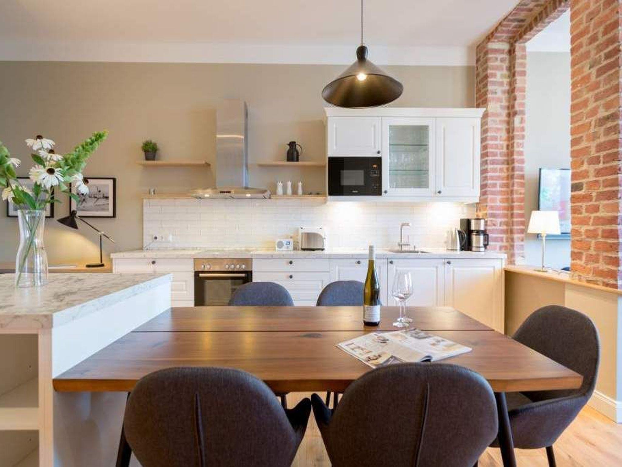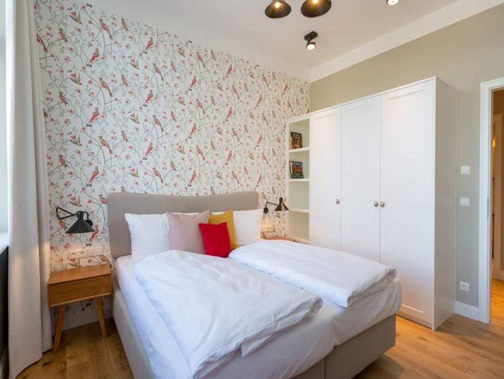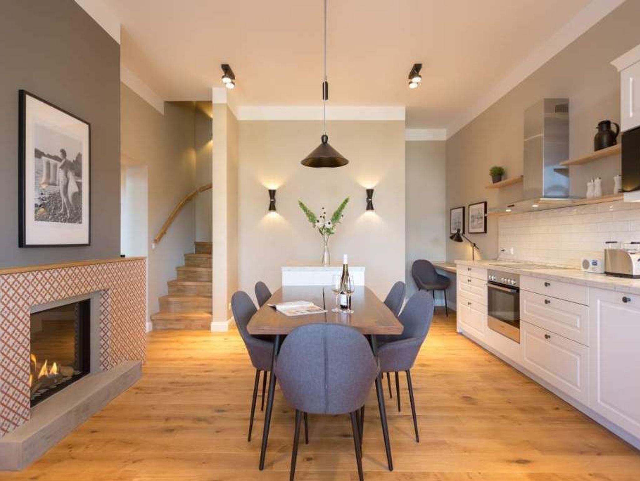 Exklusiv, außergewöhnlich, luxuriös und alles andere als 0815 ? sucht man nach Beschreibungen für diesen Urlaubswohntraum, wären diese wohl die angemessensten. Urlaub der Extra-Klasse auf zwei Etagen erwartet Sie im Appartement Nummer 1 der Villa Bellevue. Im Erdgeschoss und in der Belle Etage der wunderschön sanierten Bädervilla atmen Sie das Flair der mondänen Kaiserzeit und die Leichtigkeit und Noblesse modernen Innendesigns gleichermaßen. Auf den großzügigen 100 Quadratmetern können vier Erwachsene und zwei Kinder bis drei Jahre (im Kinderreisebett) gemeinsam eine unvergesslich schöne Zeit verbringen. Das geräumige Wohn-Esszimmer, dessen Bereiche durch die freigelegte Backsteinwand der ehemaligen Veranda voneinander getrennt sind, lädt zum Entspannen, Beisammensein und Dinieren ein. Auf zwei großen Wohnlandschaften können Sie zur Ruhe kommen. Der 42-Zoll-Flat TV ist der ideale Entertainer. Von der Veranda aus haben Sie zudem Zugang zum Garten und zur Terrasse mit Tisch und sechs Stühlen. Das Interieur der Wohnung ist vom Feinsten. Edle skandinavische Design-Klassiker verleihen diesem Urlaubsdomizil Extravaganz und einen stylischen Charakter. Der mit wunderschönen Fliesen gerahmte Gas-Kamin im Esszimmer ist ein echter Hingucker und sorgt an stürmischen Abenden für viel Gemütlichkeit. Da bleibt man gern länger am großen Echtholztisch sitzen, plaudert und genießt die Zeit. Die offene Küche mit hochwertigen Geräten und einem kleinen Kühlschrank ist mit ausgesuchtem ASA-Geschirr ausgestattet. Auf dieser Etage gibt es mit wunderschöner Designtapete dekoriert bereits das erste Schlafzimmer. Ausgestattet mit einem komfortablen Boxspringdoppelbett (1,80 m x 2,00 m) verspricht es auch nachts jede Menge Vergnügen. Das dazu gehörige Badezimmer bietet viel Platz zum Duschen und Frischmachen. Der Clou des Urlaubsparadieses empfängt den Auszeithungrigen jedoch in der 1. Etage. Hier avanciert das ballsaalgroße Badezimmer zum Highlight der Belle Etage. Die freistehende Badewanne verführt geradezu zum Loslassen und Weggleiten in duftende Schaumträume. Eine Panorama-Sauna bringt Wellness-Fans ordentlich ins Schwitzen. Und das alles ist nebst Waschtisch, Dusche und geräumigem Kleiderschrank eingebettet in edles Fliesendesign. Dem Badezimmer angeschlossen ist eine Schlafveranda. Ein wunderbarer Kontrast bildet die edle Tapete, die hier auf die unverputzte Brickwall der alten Bädervilla trifft. Wer sich hier bettet, fühlt sich in eine andere Welt versetzt. Auch auf dieser Etage empfängt den Gast ein Boxspringdoppelbett (1,60 m x 2,00 m). Wohlfühlen steht in diesem Appartement an erster Stelle. Dafür sind die Betten bei Ihrer Anreise bereits bezogen und Handtücher liegen bereit. Ihr Auto können Sie auf dem zum Haus gehörenden Stellplatz parken.