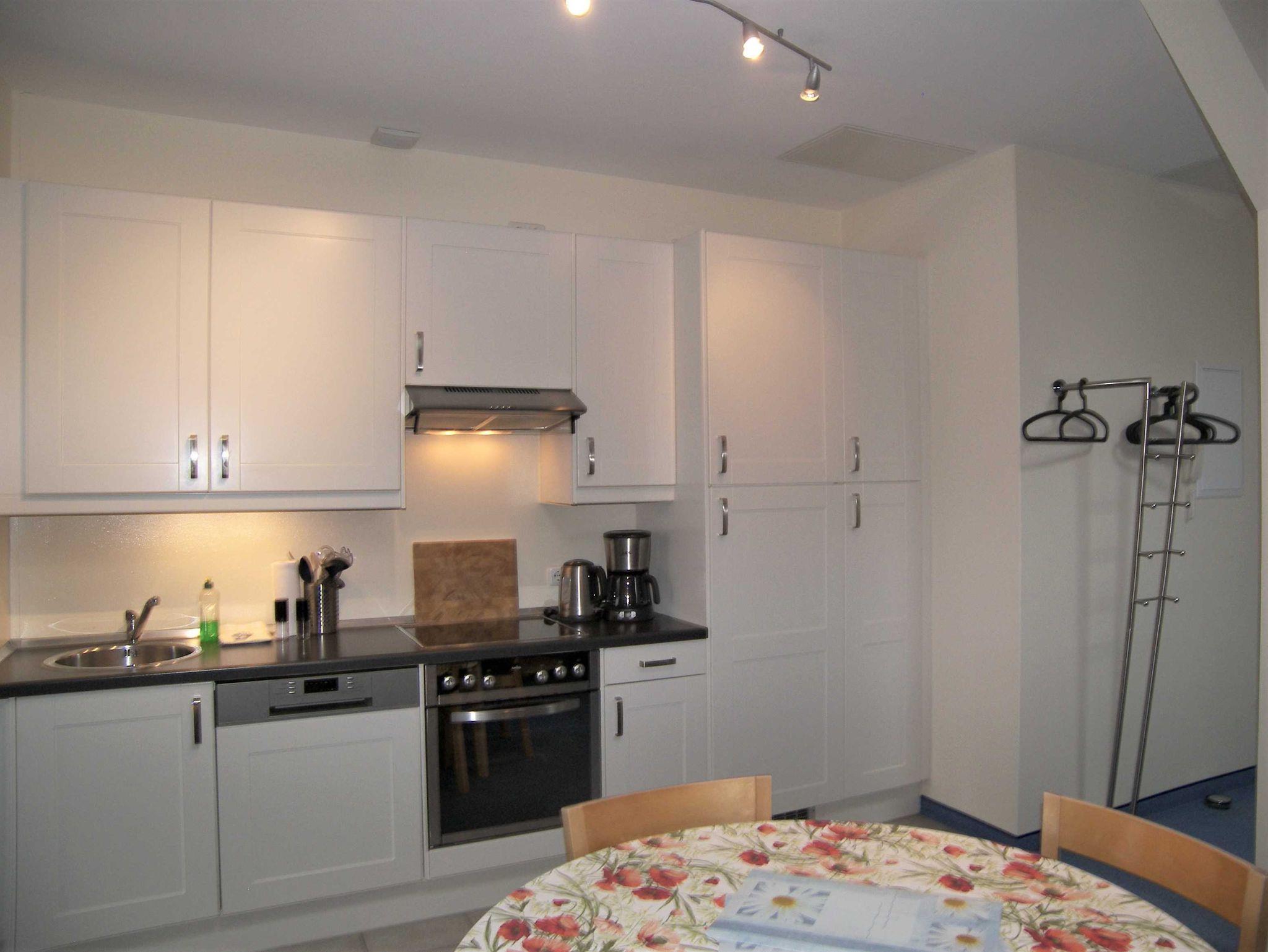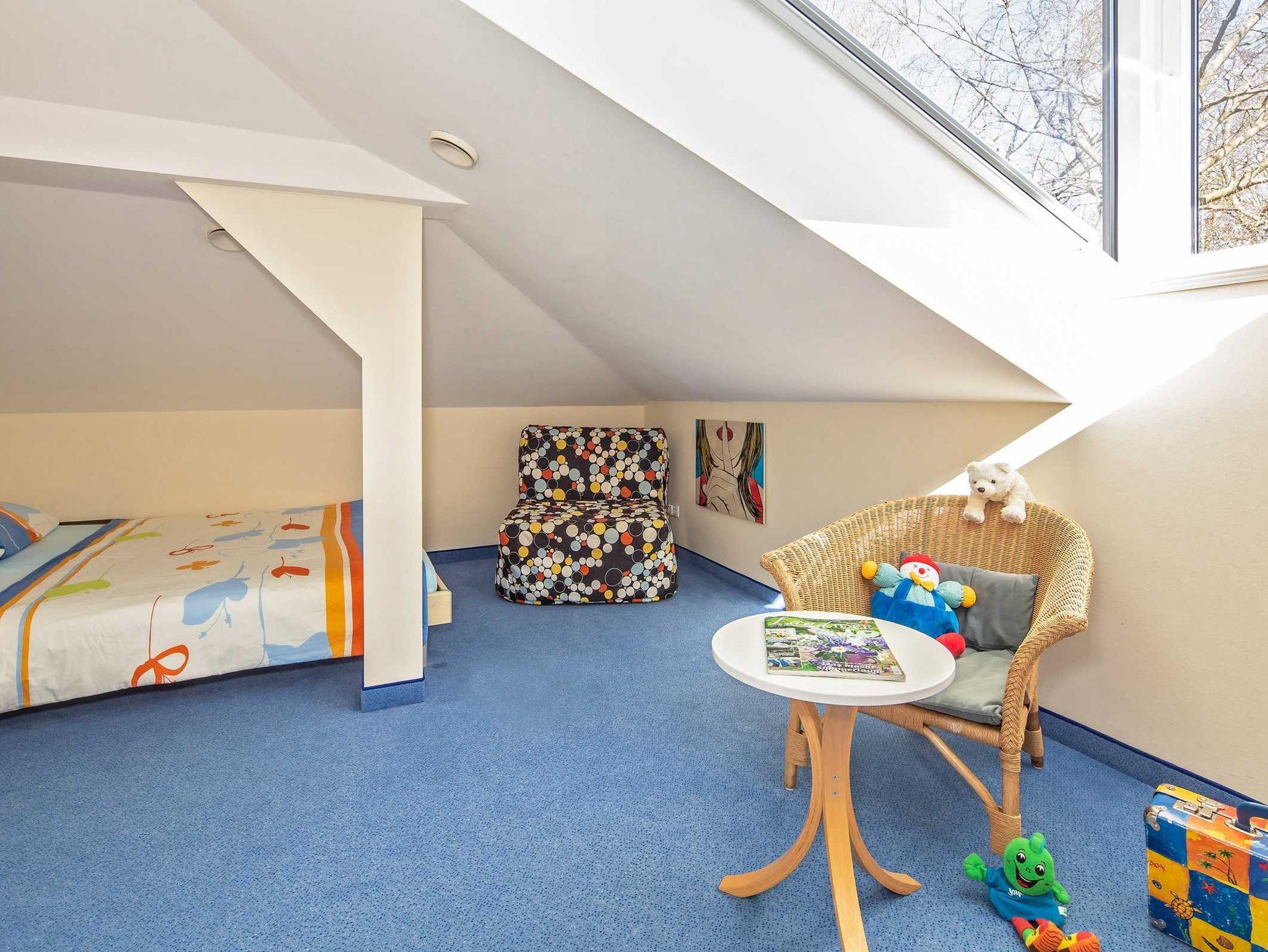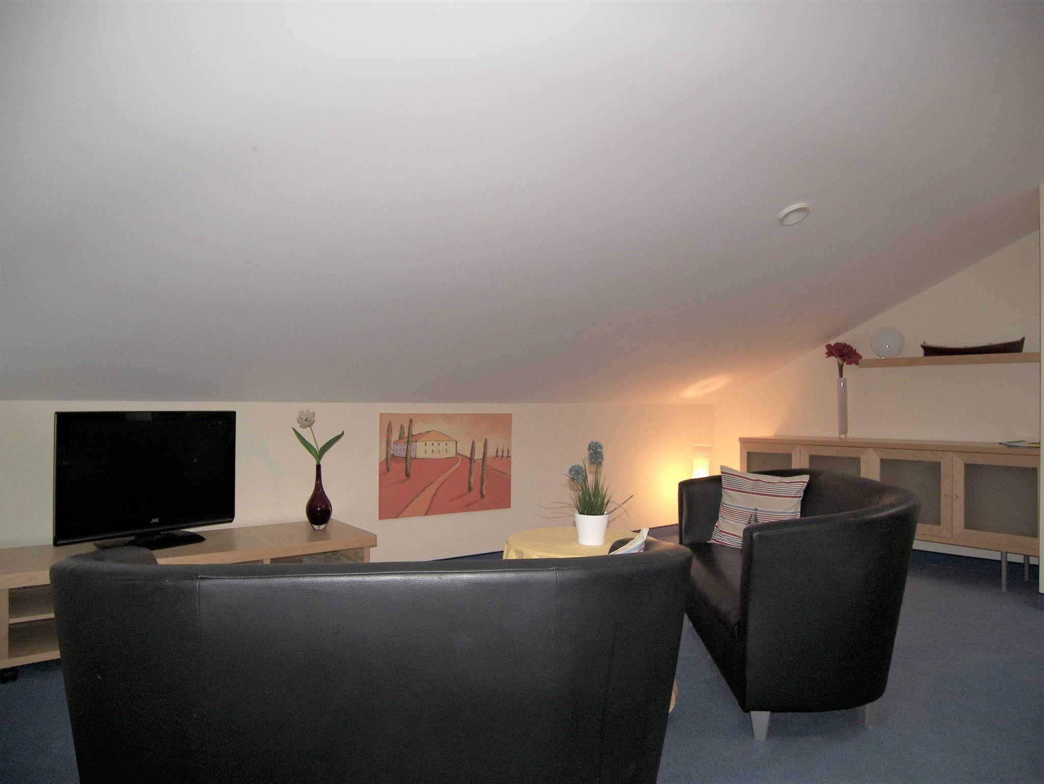 Die geräumige, moderne 3-Raum-Nichtraucher-Ferienwohnung (60 qm Wohnfläche nach Abzug der vorhandenen Dachschrägen), befindet sich im 1. OG. der Villa Seeblick (Dachgeschoß, in der gesamten Wohnung befinden sich Dachschrägen). Das kombinierte Wohn-/Esszimmer ist mit einem Esstisch mit 4 Stühlen, Kommode, Sat-TV, sowie einer Küchenzeile mit 4-Pl. Ceranherd, Backofen, Kaffeemaschine, Wasserkocher, Geschirr, Besteck, Spülmaschine und Kühlschrank mit Gefrierfach ausgestattet. Die Wohnung verfügt über zwei Schlafräume (jeweils mit Doppelbetten 160 x 200 m, nur von einer Seite Einstieg möglich), Nachtschrank und Kommode. In einem der beiden Schlafzimmer befindet sich ein Schlafsessel, der als Aufbettung für die 5. Person dient. Der Sessel ist auch für eine erwachsene Person geeignet. Bad (mit Badewanne/WC, Spiegelschrank) und das separate Gäste-WC sind vom Wohnzimmer zu erreichen. Die Ferienwohnung ist für max. 4 Personen geeignet. Die Erstausstattung Bettwäsche kann gegen Gebühr dazugebucht werden. Die Erstausstattung Handtücher und Geschirrtücher sind inklusive. Ein Kinderbett und Hochstuhl auf Anfrage.